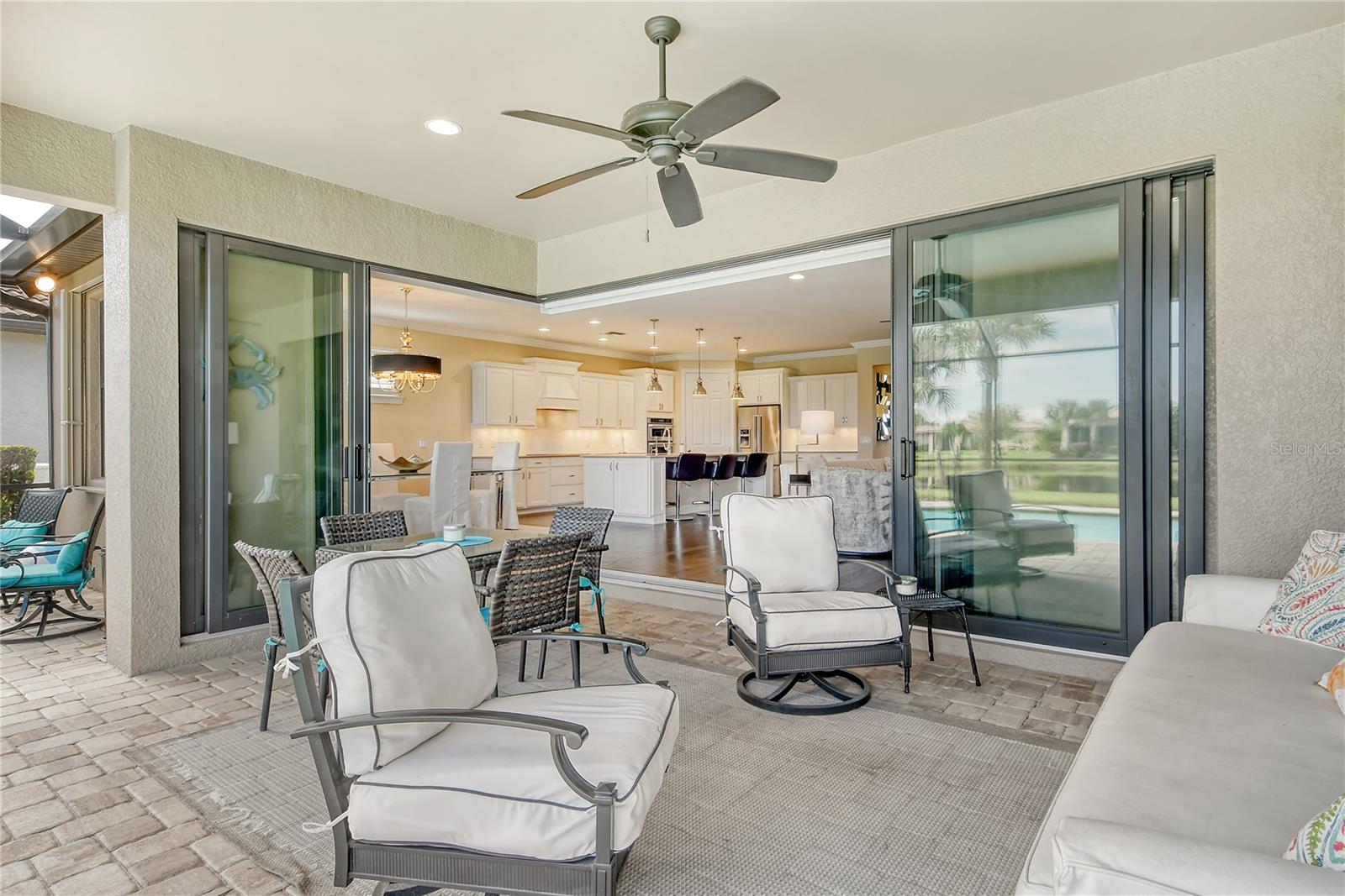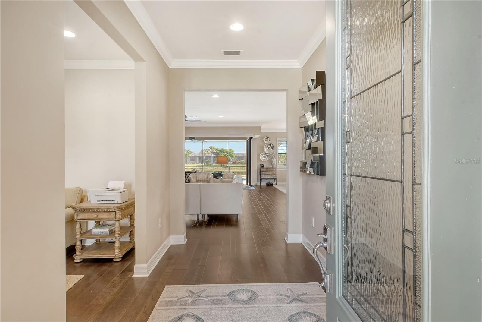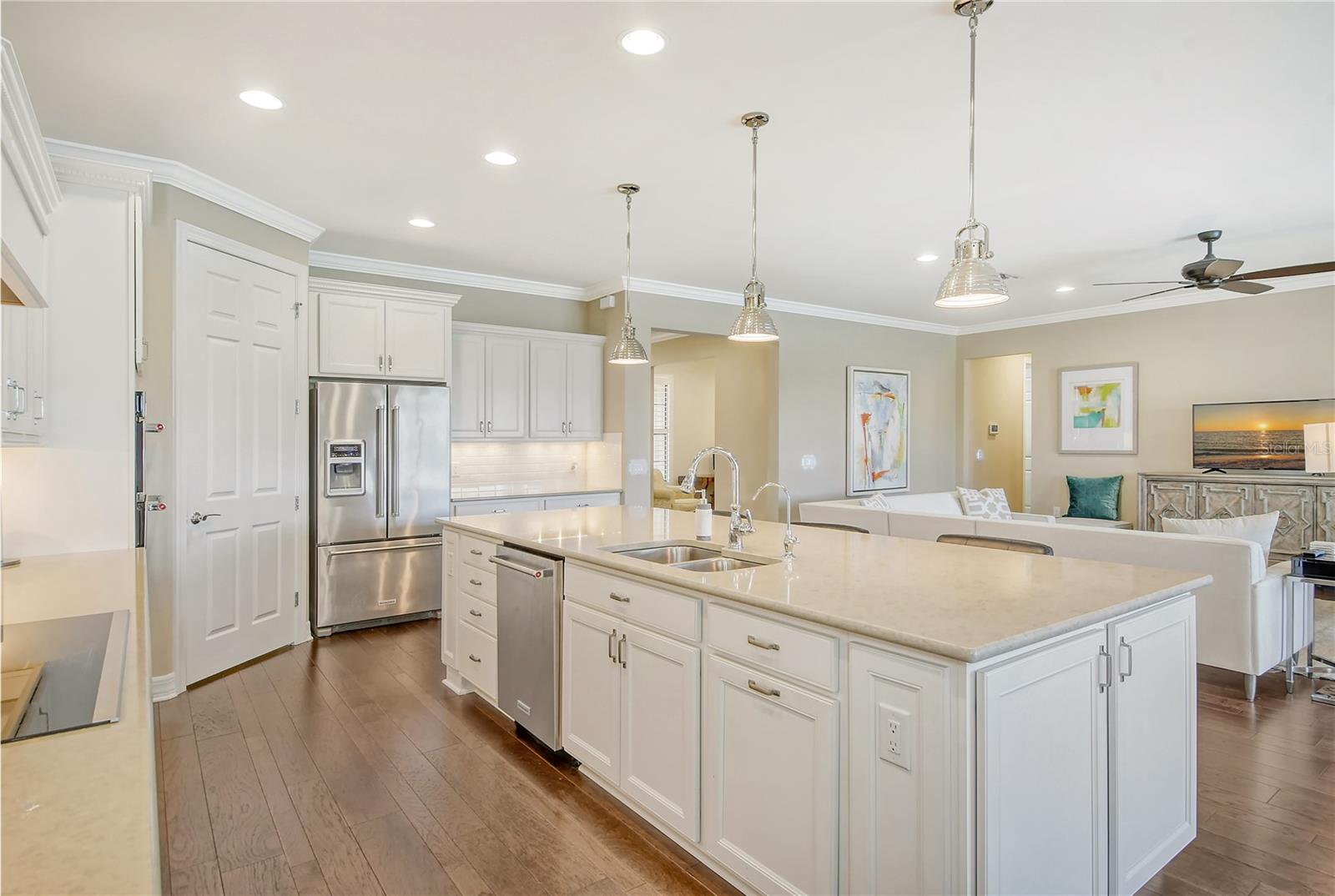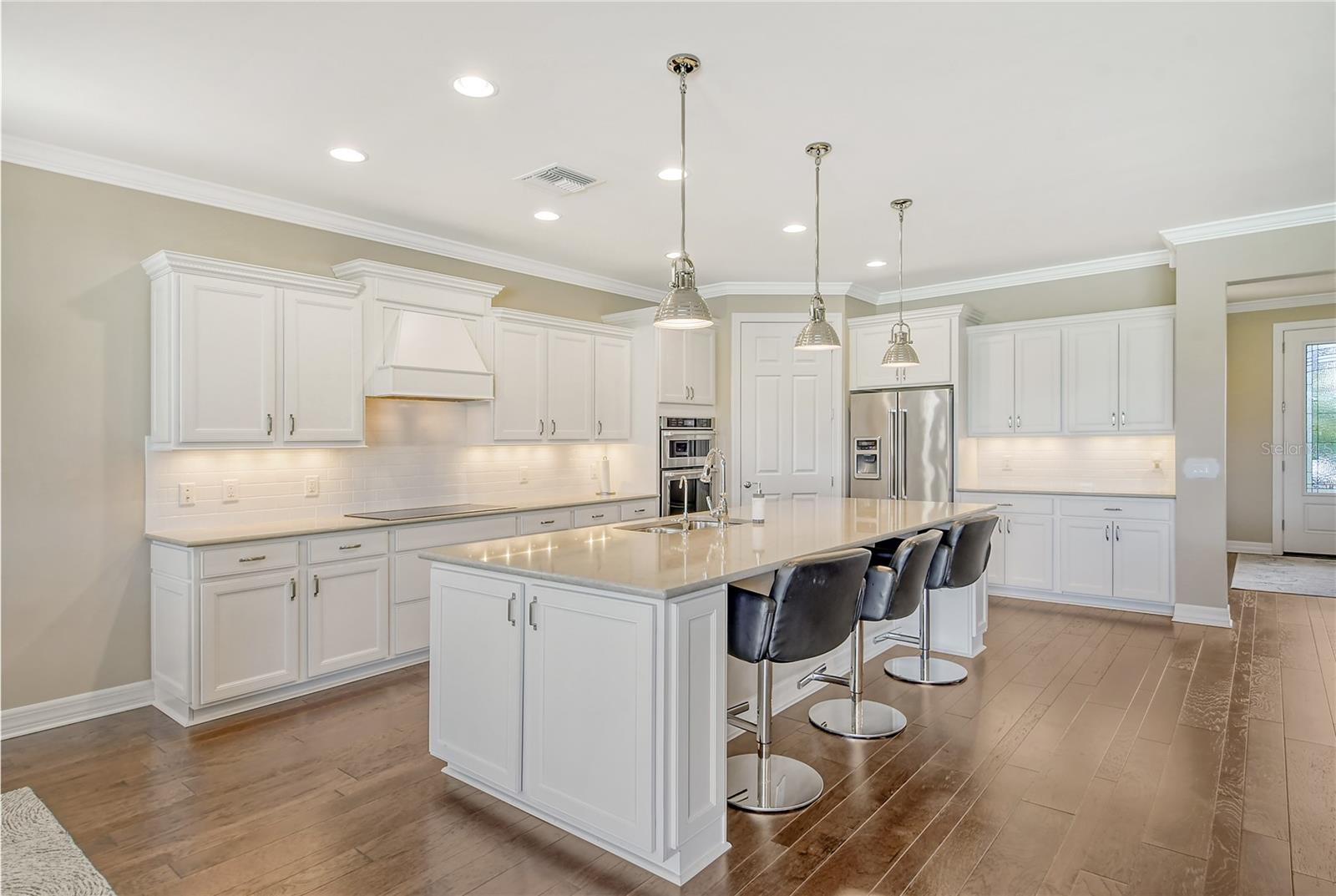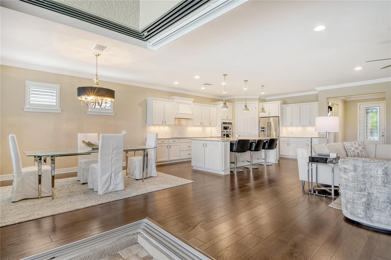Nestled in the heart of Venice, Florida, this exquisite residence beckons those with a penchant for refined living. A harmonious blend of sophistication and comfort awaits within this three-bedroom, three-bathroom haven, where every detail has been meticulously crafted to elevate your lifestyle. Step into a world of open elegance, where the floor plan flows seamlessly, inviting both intimate gatherings and grand soirées. The kitchen is a culinary artist's dream with lustrous quartz countertops, upgraded cabinetry, and Stainless-steel appliances. The subway tile backsplash adds a touch of timeless charm. Pendant lights cast a warm glow, complemented by strategically placed illumination throughout, ensuring your culinary masterpieces are always in the spotlight. Additional bonuses include a whole-home water filtration system, complete with reverse osmosis, providing crystal-clear refreshment at every tap. Hardwood floors grace the living areas and bedrooms with rich tones a testament to quality underfoot. The pièce de résistance? A zero-corner pocket door that slides away, blurring the lines between indoor refinement and outdoor splendor. The primary bedroom suite is a sanctuary unto itself, with beautiful water views featuring a generous sized bathroom with dual sinks, granite counters, and a walk-in shower adorned with listello accents and a sitting bench - perfect for post-soak contemplation. Two additional bedrooms, each with private bath access, offer similar high-end finishes, strategically positioned for optimal privacy. Outside, a private, heated saltwater pool beckons, its shimmering surface reflecting the beauty of the water views beyond. Mature tropical landscaping creates a lush oasis, while hurricane shutters stand guard, ready to protect your paradise. The lanai is spacious and protected with a motorized retractable screen rated for the most tropical winds. With a three-car garage and pavered driveway, this residence isn't just a home; it's a statement of discerning taste and uncompromising quality.