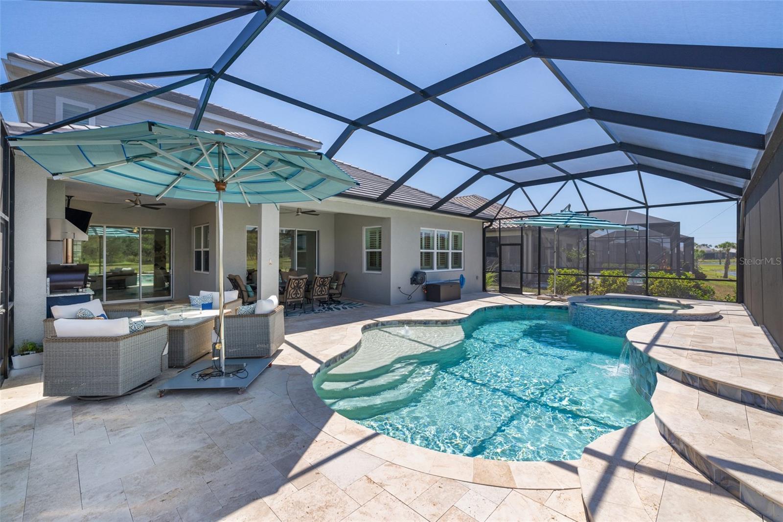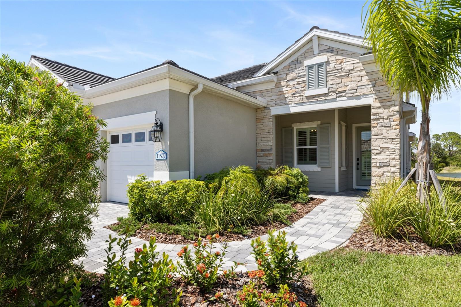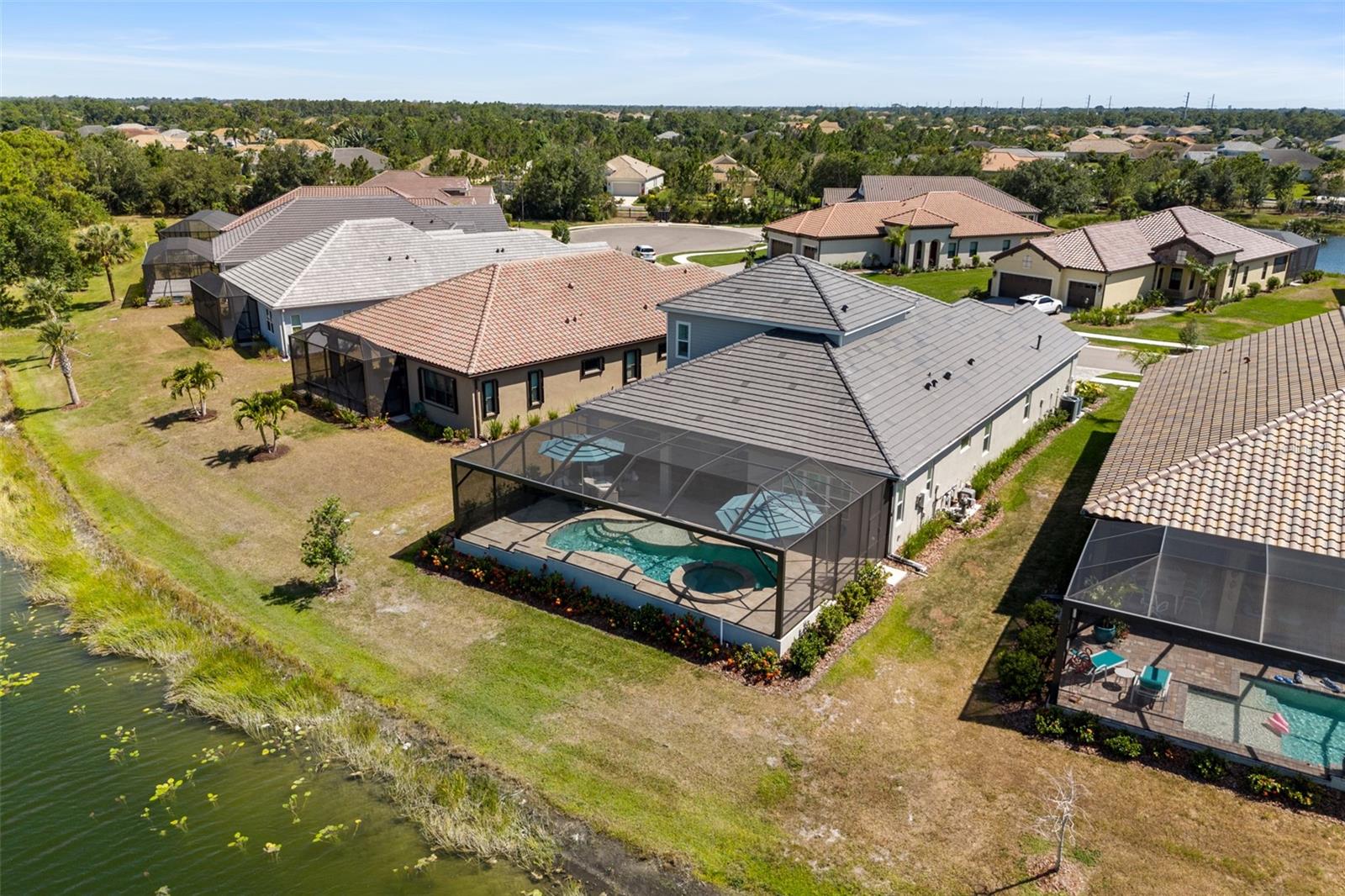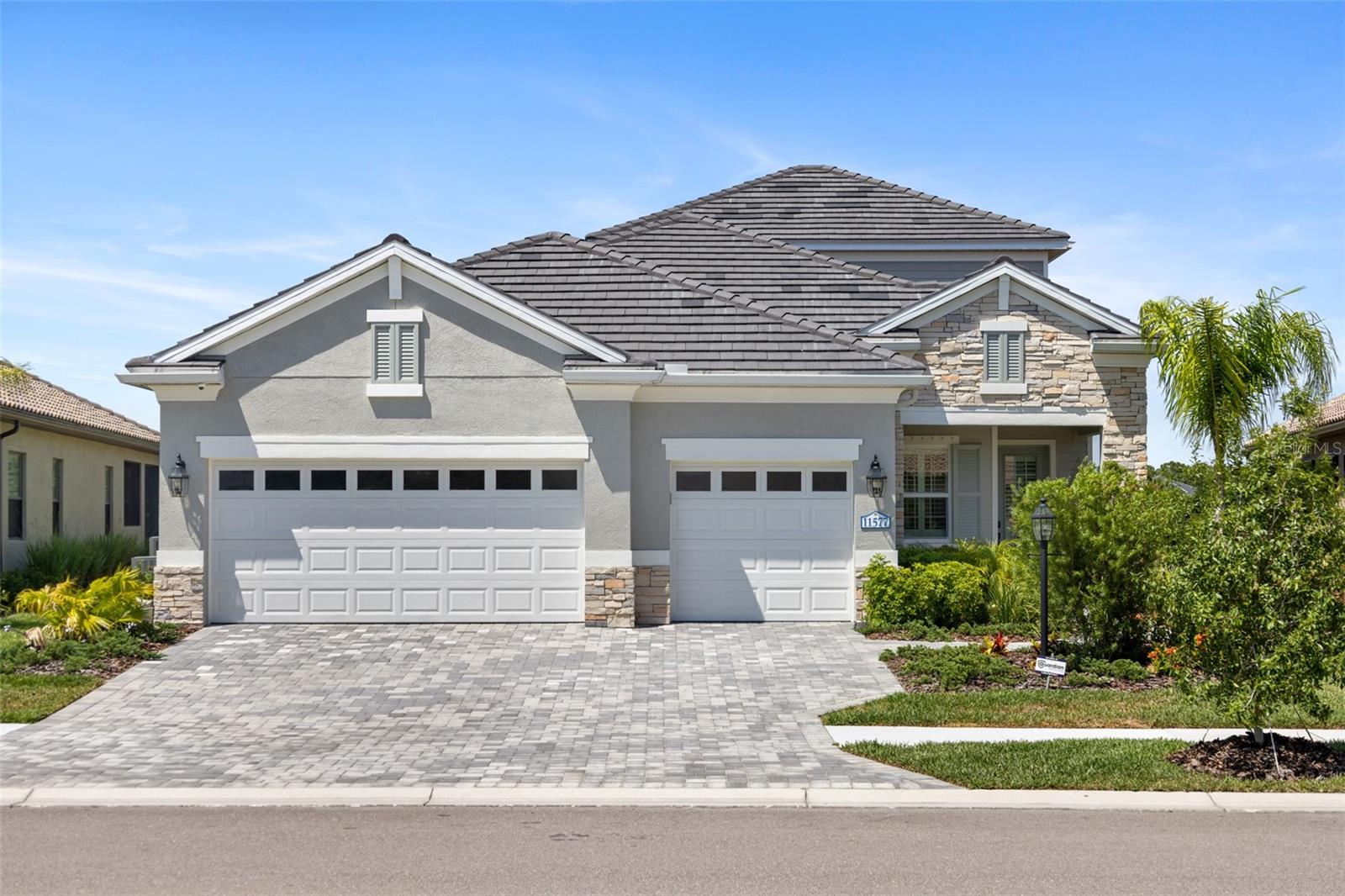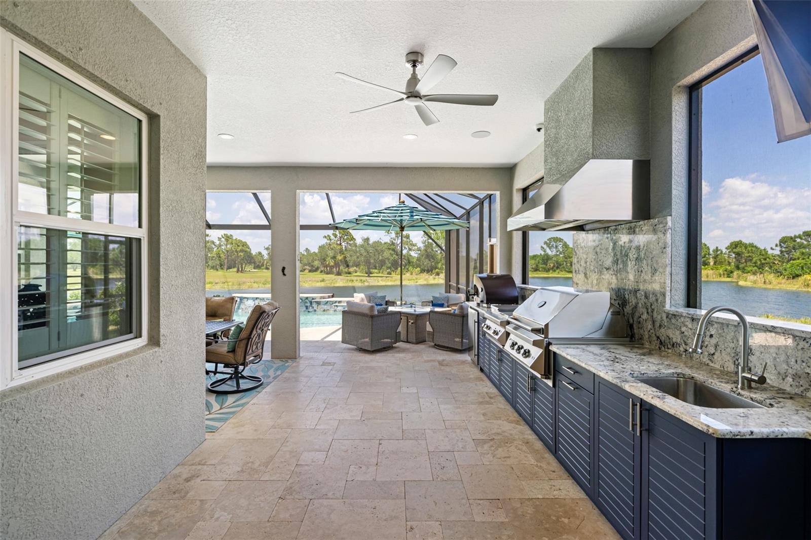 Stunning 4-bedroom, 3.5-bath luxury home with exquisite features on premium waterfront lot, IMPACT HURRICANE WINDOWS upstairs, and scenic lake views in Venice, Florida. Built in 2023, this 3,156 sqft residence in the amenity-filled GRAND PALM neighborhood combines comfort and modern luxury. Featuring 10-FOOT CEILINGS and 8-FOOT TALL INTERIOR DOORS throughout. The GOURMET CHEF’S KITCHEN boasts ceiling-high cabinets with integrated lighting, quartz countertops, an apron front basin sink, vacuum dust pan, and high-end white GE CAFE appliances. The spacious living room is pre-wired for a ceiling fan, has floor outlets, and a SURROUND SOUND system integrated into the ceiling. All windows feature PLANTATION SHUTTERS, while sliding doors to the lanai have electric roll-down blinds. Step outside to your private lanai with a luxury OUTDOOR KITCHEN featuring a Twin Eagles Gas Grill with Infrared Rotisserie, Smoker Box, Beverage fridge, Italian Alfa Pizza Oven, Twin Eagle Breakfast Cooktop, and granite countertops/backsplash, all overlooking a HEATED SALTWATER POOL & SPA, sun shelf, and waterfall, framed by a CLEARVIEW PANORAMIC SCREEN for unobstructed LAKE VIEWS. The Primary Suite on the main floor offers plantation shutters, USB outlets, and an ensuite bath with quartz countertops, square sinks, and a whisper-quiet exhaust fan. Additional bedrooms have luxury vinyl flooring, walk-in closets, and share a Jack and Jill bath. A dedicated OFFICE/DEN features CAT 6 internet plugs and USB outlets. The SECONDARY ENSUITE upstairs includes IMPACT WINDOWS (no shutters needed), a walk-in closet, and a bonus room with a dry bar and space for a beverage fridge. The 3-CAR GARAGE has outlets for a fridge, golf cart, and electric car charging, plus ULTRA-QUIET smart door openers. This home is equipped with a WHOLE-HOME VACUUM system, CAT6 throughout, quiet exhaust fans in all bathrooms, external in-wall PEST CONTROL TUBES, media air cleaner, UV AIR PURIFIER, indoor/outdoor SPEAKERS, and a security system with cameras. GRAND PALM offers luxurious amenities, including pools, fitness center, pickleball, tennis courts, and scenic trails. Conveniently located near Wellen Park and beaches. Sports fans will love the proximity to the Atlanta Braves spring training stadium. (Washer/Dryer and Living/Kitchen/Dining/Guest Bedroom pendants/chandeliers not included in sale.)