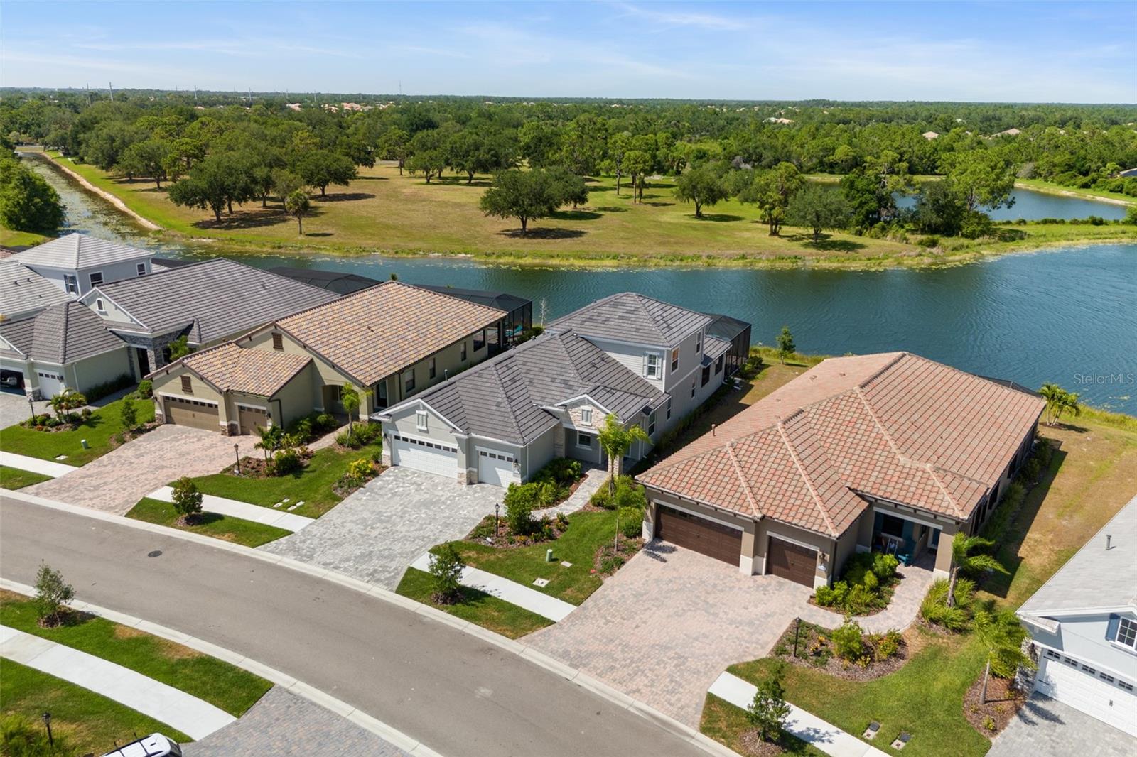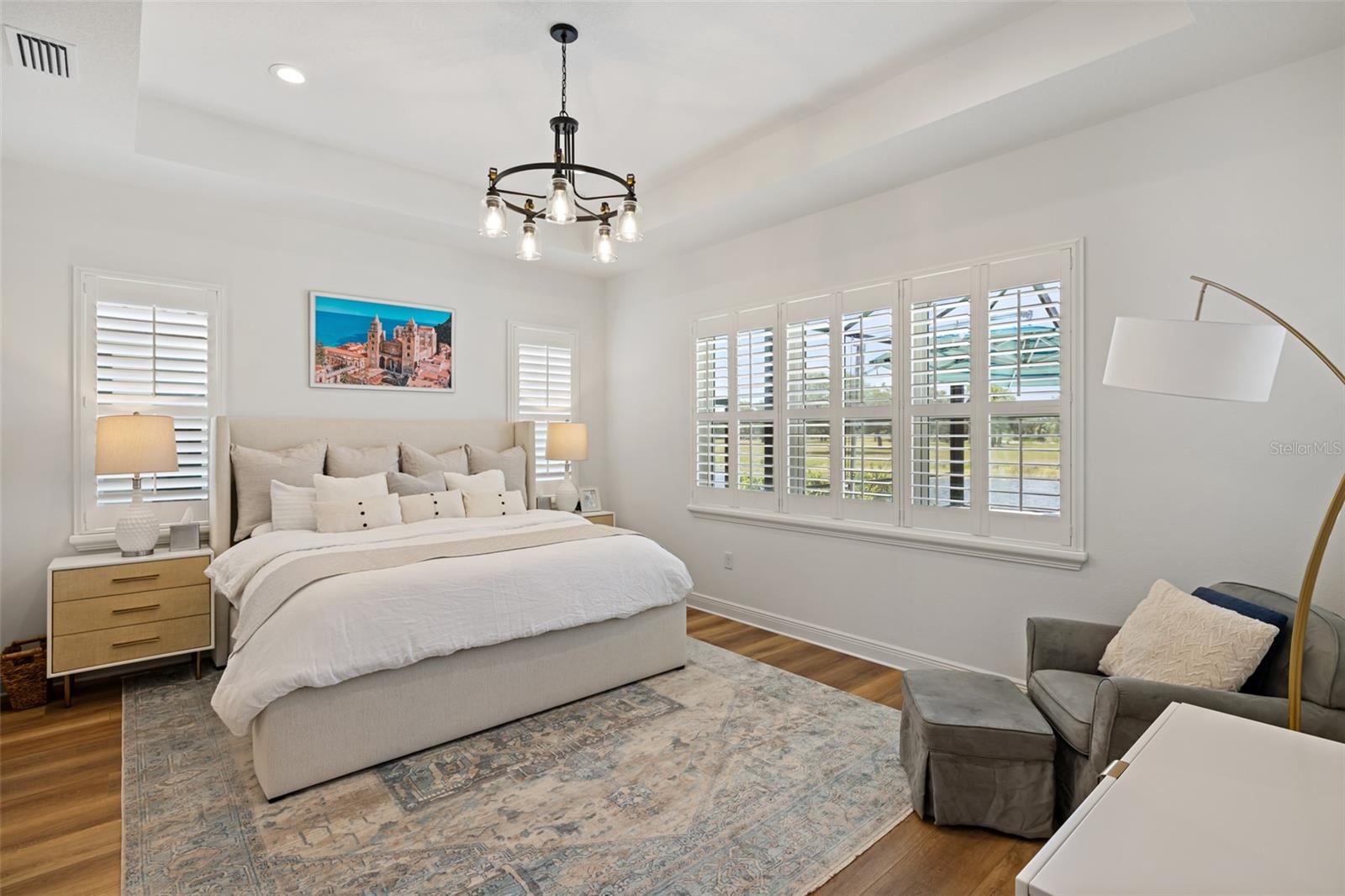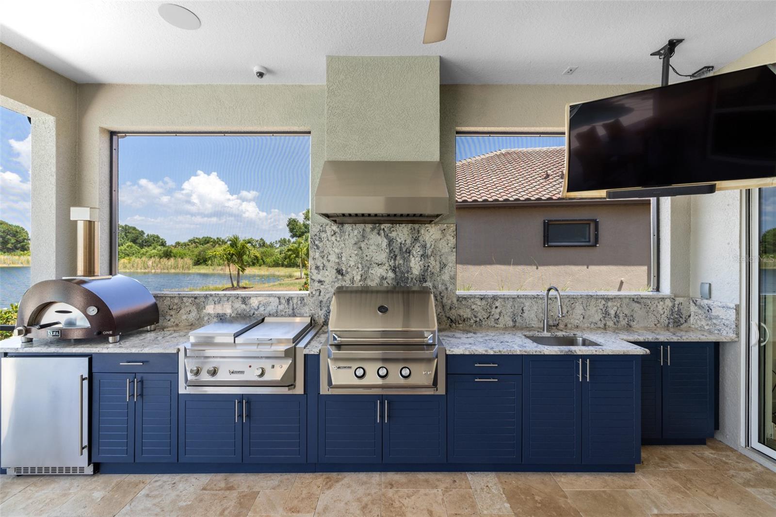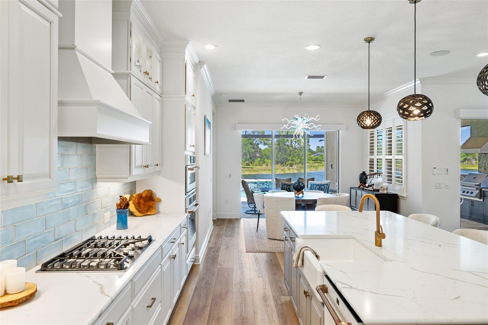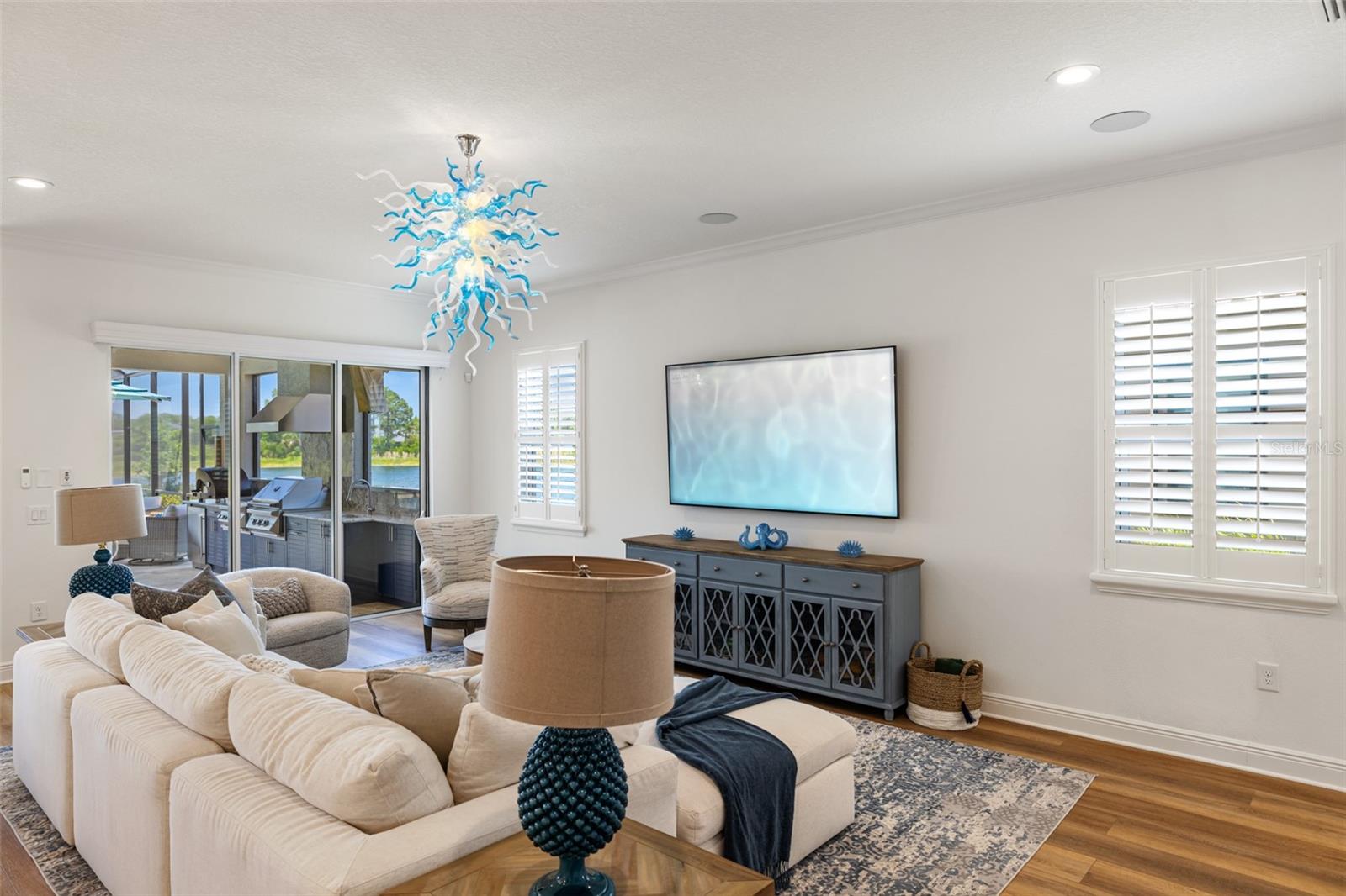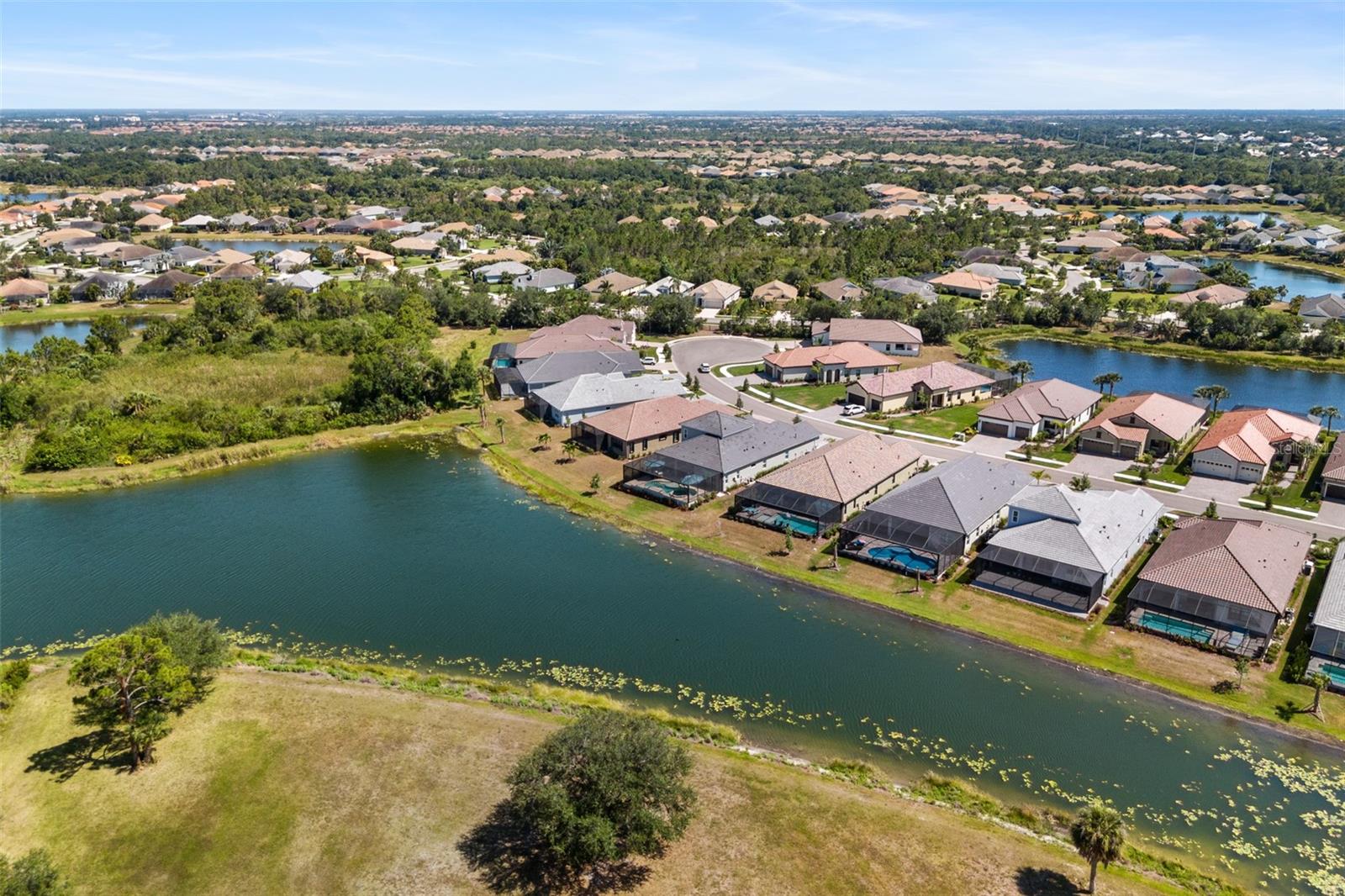 Stunning 4-bedroom, 3.5-bath luxury home with exquisite features on premium waterfront lot, IMPACT HURRICANE WINDOWS upstairs, and scenic lake views in Venice, Florida. Built in 2023, this 3,156 sqft residence in the amenity-filled GRAND PALM neighborhood combines comfort and modern luxury. Featuring 10-FOOT CEILINGS and 8-FOOT TALL INTERIOR DOORS throughout. The GOURMET CHEF’S KITCHEN boasts ceiling-high cabinets with integrated lighting, quartz countertops, an apron front basin sink, vacuum dust pan, and high-end white GE CAFE appliances. The spacious living room is pre-wired for a ceiling fan, has floor outlets, and a SURROUND SOUND system integrated into the ceiling. All windows feature PLANTATION SHUTTERS, while sliding doors to the lanai have electric roll-down blinds. Step outside to your private lanai with a luxury OUTDOOR KITCHEN featuring a Twin Eagles Gas Grill with Infrared Rotisserie, Smoker Box, Beverage fridge, Italian Alfa Pizza Oven, Twin Eagle Breakfast Cooktop, and granite countertops/backsplash, all overlooking a HEATED SALTWATER POOL & SPA, sun shelf, and waterfall, framed by a CLEARVIEW PANORAMIC SCREEN for unobstructed LAKE VIEWS. The Primary Suite on the main floor offers plantation shutters, USB outlets, and an ensuite bath with quartz countertops, square sinks, and a whisper-quiet exhaust fan. Additional bedrooms have luxury vinyl flooring, walk-in closets, and share a Jack and Jill bath. A dedicated OFFICE/DEN features CAT 6 internet plugs and USB outlets. The SECONDARY ENSUITE upstairs includes IMPACT WINDOWS (no shutters needed), a walk-in closet, and a bonus room with a dry bar and space for a beverage fridge. The 3-CAR GARAGE has outlets for a fridge, golf cart, and electric car charging, plus ULTRA-QUIET smart door openers. This home is equipped with a WHOLE-HOME VACUUM system, CAT6 throughout, quiet exhaust fans in all bathrooms, external in-wall PEST CONTROL TUBES, media air cleaner, UV AIR PURIFIER, indoor/outdoor SPEAKERS, and a security system with cameras. GRAND PALM offers luxurious amenities, including pools, fitness center, pickleball, tennis courts, and scenic trails. Conveniently located near Wellen Park and beaches. Sports fans will love the proximity to the Atlanta Braves spring training stadium. (Washer/Dryer and Living/Kitchen/Dining/Guest Bedroom pendants/chandeliers not included in sale.)