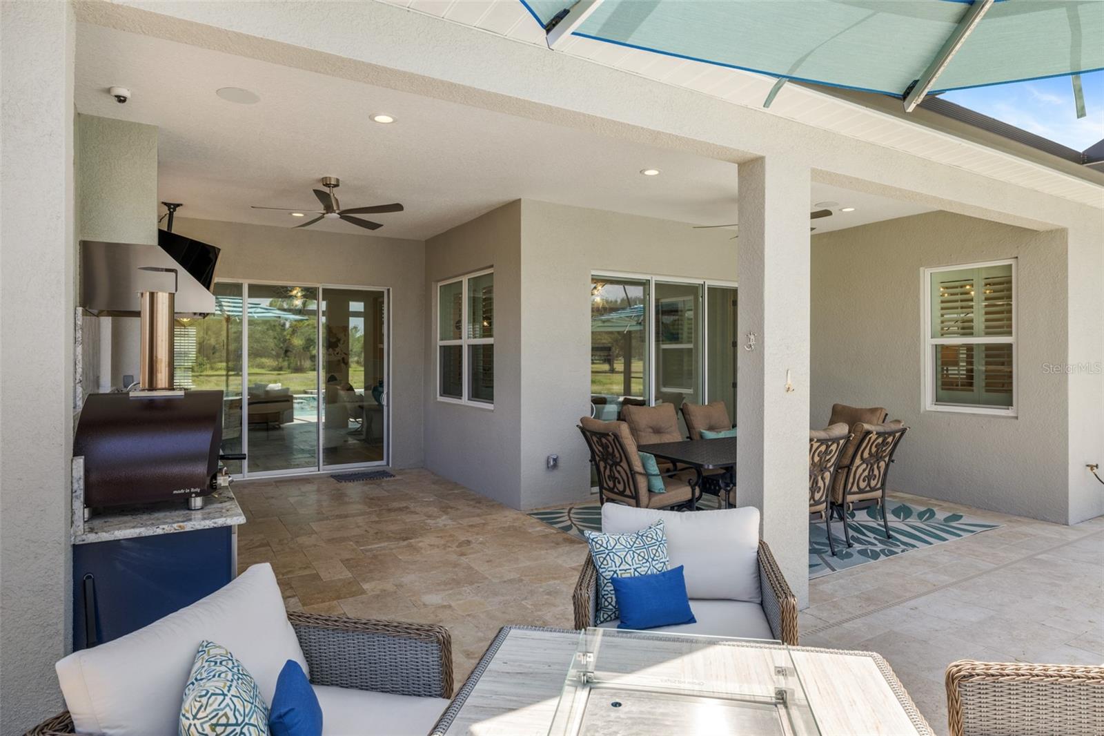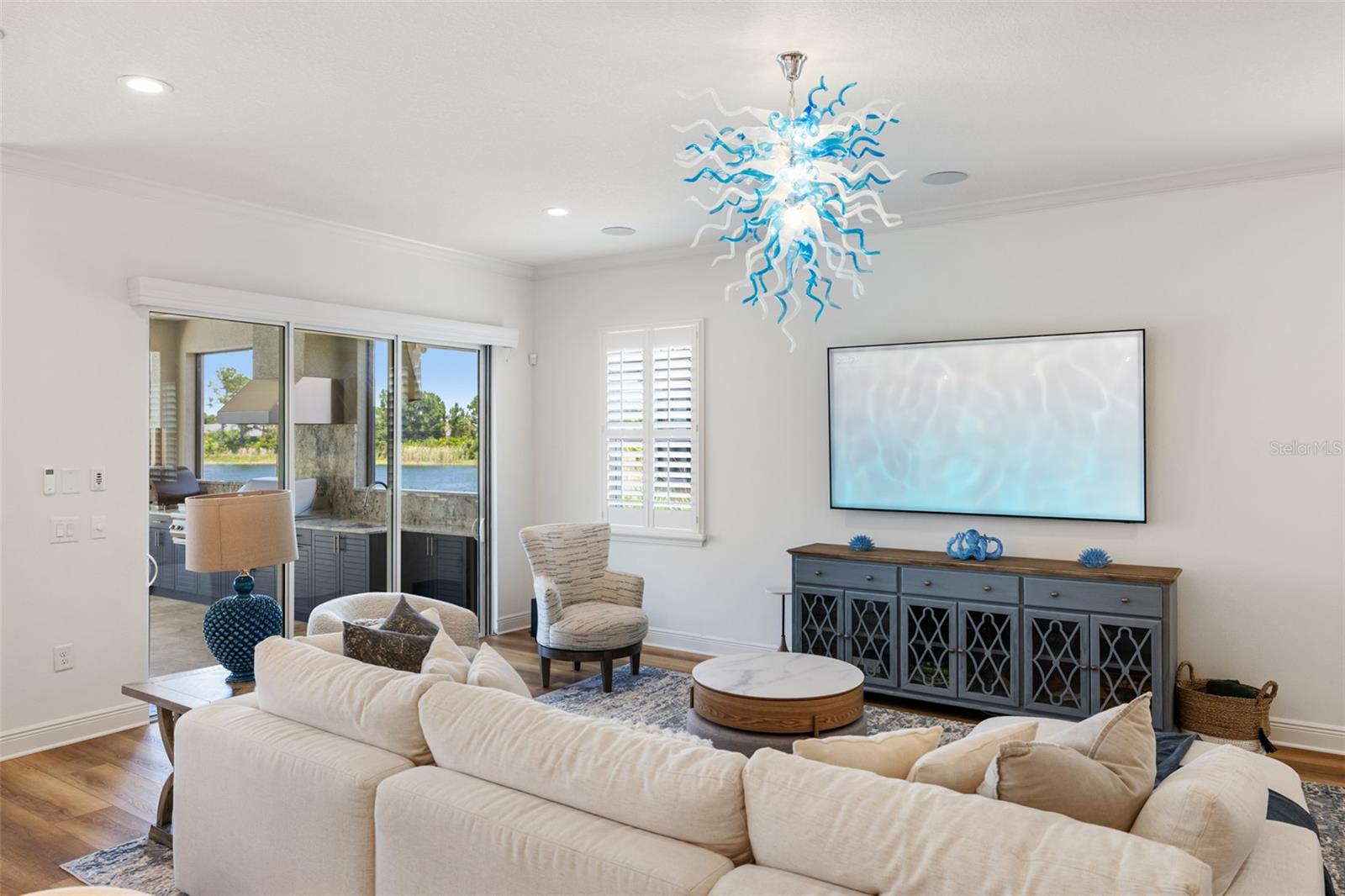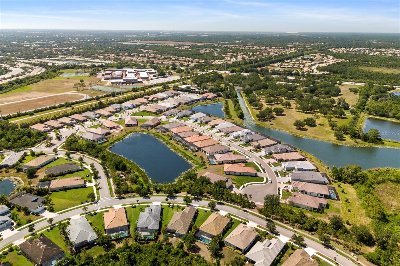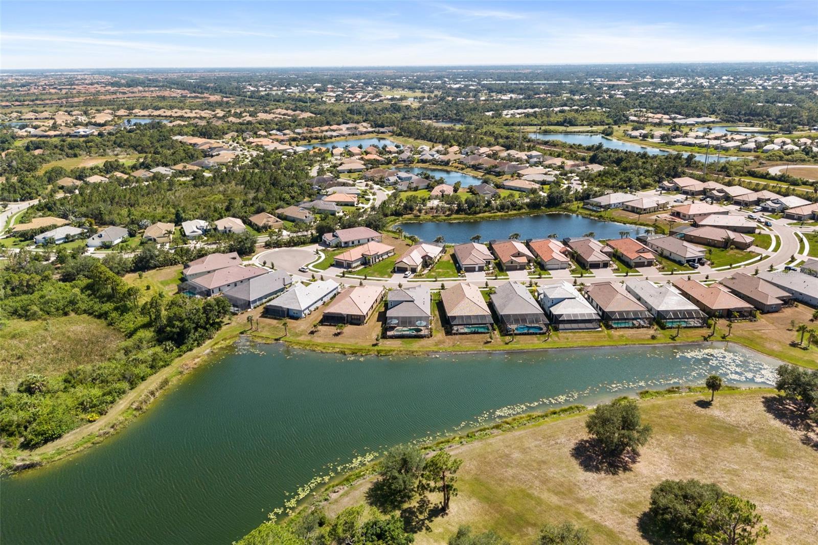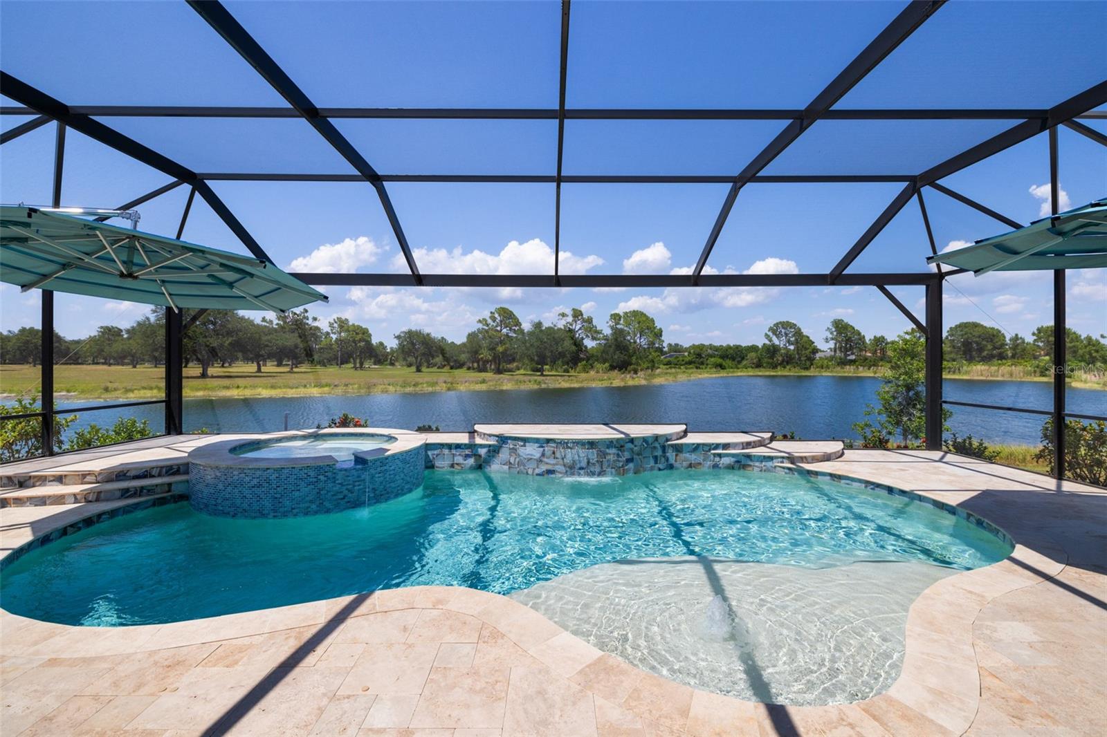 Stunning 4-bedroom, 3.5-bath luxury home with exquisite features on premium waterfront lot, IMPACT HURRICANE WINDOWS upstairs, and scenic lake views in Venice, Florida. Built in 2023, this 3,156 sqft residence in the amenity-filled GRAND PALM neighborhood combines comfort and modern luxury. Featuring 10-FOOT CEILINGS and 8-FOOT TALL INTERIOR DOORS throughout. The GOURMET CHEF’S KITCHEN boasts ceiling-high cabinets with integrated lighting, quartz countertops, an apron front basin sink, vacuum dust pan, and high-end white GE CAFE appliances. The spacious living room is pre-wired for a ceiling fan, has floor outlets, and a SURROUND SOUND system integrated into the ceiling. All windows feature PLANTATION SHUTTERS, while sliding doors to the lanai have electric roll-down blinds. Step outside to your private lanai with a luxury OUTDOOR KITCHEN featuring a Twin Eagles Gas Grill with Infrared Rotisserie, Smoker Box, Beverage fridge, Italian Alfa Pizza Oven, Twin Eagle Breakfast Cooktop, and granite countertops/backsplash, all overlooking a HEATED SALTWATER POOL & SPA, sun shelf, and waterfall, framed by a CLEARVIEW PANORAMIC SCREEN for unobstructed LAKE VIEWS. The Primary Suite on the main floor offers plantation shutters, USB outlets, and an ensuite bath with quartz countertops, square sinks, and a whisper-quiet exhaust fan. Additional bedrooms have luxury vinyl flooring, walk-in closets, and share a Jack and Jill bath. A dedicated OFFICE/DEN features CAT 6 internet plugs and USB outlets. The SECONDARY ENSUITE upstairs includes IMPACT WINDOWS (no shutters needed), a walk-in closet, and a bonus room with a dry bar and space for a beverage fridge. The 3-CAR GARAGE has outlets for a fridge, golf cart, and electric car charging, plus ULTRA-QUIET smart door openers. This home is equipped with a WHOLE-HOME VACUUM system, CAT6 throughout, quiet exhaust fans in all bathrooms, external in-wall PEST CONTROL TUBES, media air cleaner, UV AIR PURIFIER, indoor/outdoor SPEAKERS, and a security system with cameras. GRAND PALM offers luxurious amenities, including pools, fitness center, pickleball, tennis courts, and scenic trails. Conveniently located near Wellen Park and beaches. Sports fans will love the proximity to the Atlanta Braves spring training stadium. (Washer/Dryer and Living/Kitchen/Dining/Guest Bedroom pendants/chandeliers not included in sale.)