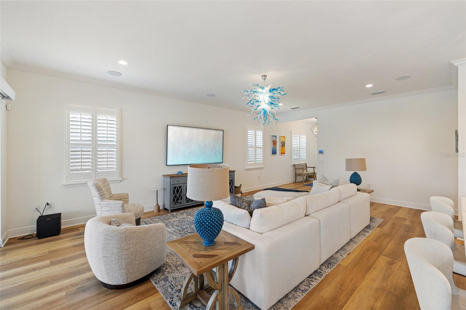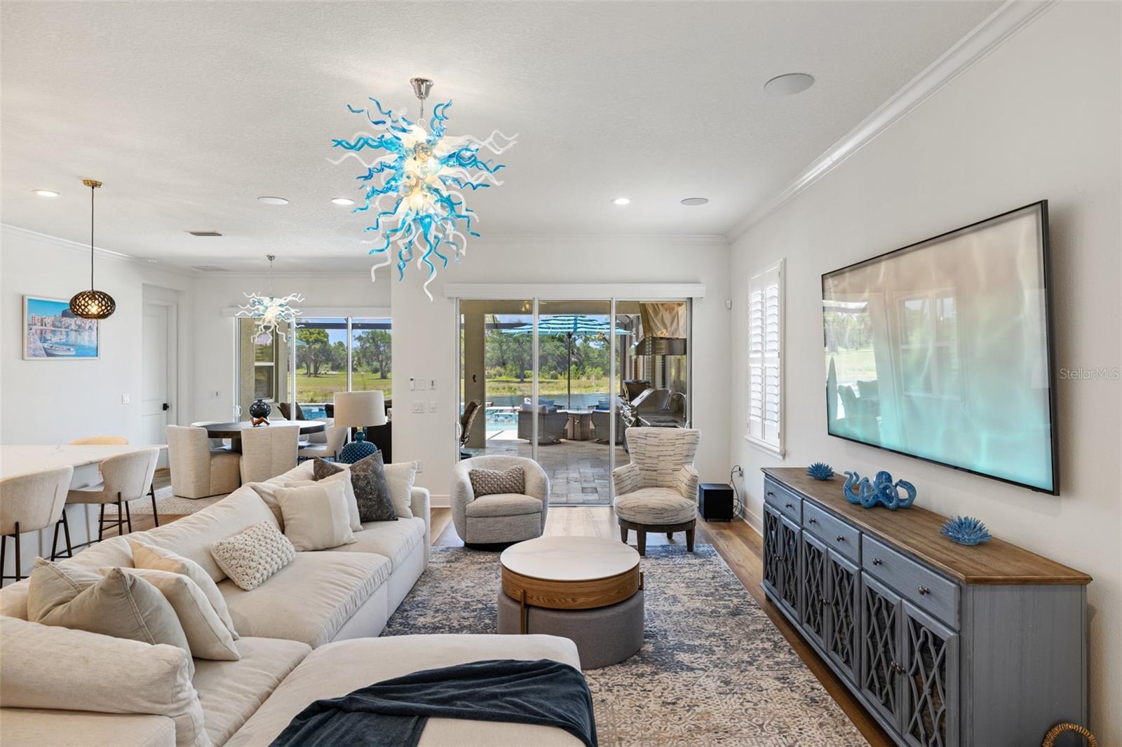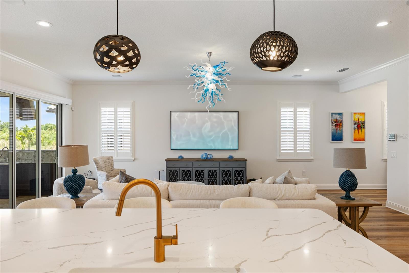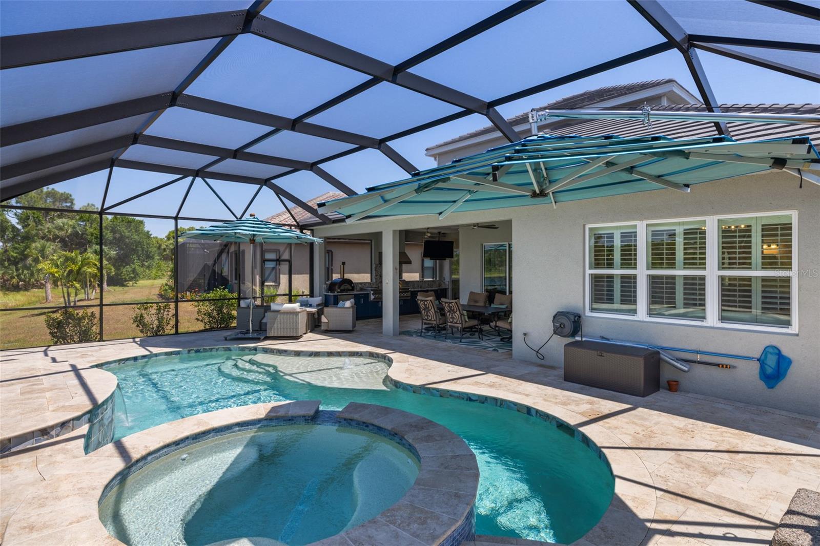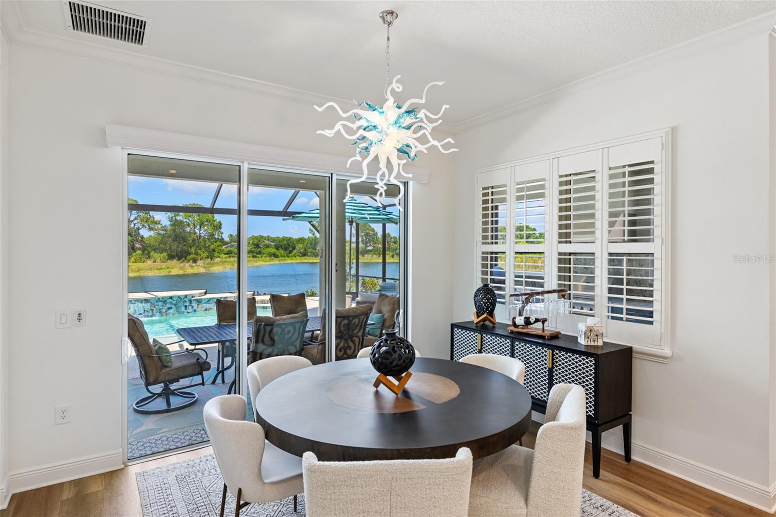 Stunning 4-bedroom, 3.5-bath luxury home with exquisite features on premium waterfront lot, IMPACT HURRICANE WINDOWS upstairs, and scenic lake views in Venice, Florida. Built in 2023, this 3,156 sqft residence in the amenity-filled GRAND PALM neighborhood combines comfort and modern luxury. Featuring 10-FOOT CEILINGS and 8-FOOT TALL INTERIOR DOORS throughout. The GOURMET CHEF’S KITCHEN boasts ceiling-high cabinets with integrated lighting, quartz countertops, an apron front basin sink, vacuum dust pan, and high-end white GE CAFE appliances. The spacious living room is pre-wired for a ceiling fan, has floor outlets, and a SURROUND SOUND system integrated into the ceiling. All windows feature PLANTATION SHUTTERS, while sliding doors to the lanai have electric roll-down blinds. Step outside to your private lanai with a luxury OUTDOOR KITCHEN featuring a Twin Eagles Gas Grill with Infrared Rotisserie, Smoker Box, Beverage fridge, Italian Alfa Pizza Oven, Twin Eagle Breakfast Cooktop, and granite countertops/backsplash, all overlooking a HEATED SALTWATER POOL & SPA, sun shelf, and waterfall, framed by a CLEARVIEW PANORAMIC SCREEN for unobstructed LAKE VIEWS. The Primary Suite on the main floor offers plantation shutters, USB outlets, and an ensuite bath with quartz countertops, square sinks, and a whisper-quiet exhaust fan. Additional bedrooms have luxury vinyl flooring, walk-in closets, and share a Jack and Jill bath. A dedicated OFFICE/DEN features CAT 6 internet plugs and USB outlets. The SECONDARY ENSUITE upstairs includes IMPACT WINDOWS (no shutters needed), a walk-in closet, and a bonus room with a dry bar and space for a beverage fridge. The 3-CAR GARAGE has outlets for a fridge, golf cart, and electric car charging, plus ULTRA-QUIET smart door openers. This home is equipped with a WHOLE-HOME VACUUM system, CAT6 throughout, quiet exhaust fans in all bathrooms, external in-wall PEST CONTROL TUBES, media air cleaner, UV AIR PURIFIER, indoor/outdoor SPEAKERS, and a security system with cameras. GRAND PALM offers luxurious amenities, including pools, fitness center, pickleball, tennis courts, and scenic trails. Conveniently located near Wellen Park and beaches. Sports fans will love the proximity to the Atlanta Braves spring training stadium. (Washer/Dryer and Living/Kitchen/Dining/Guest Bedroom pendants/chandeliers not included in sale.)
