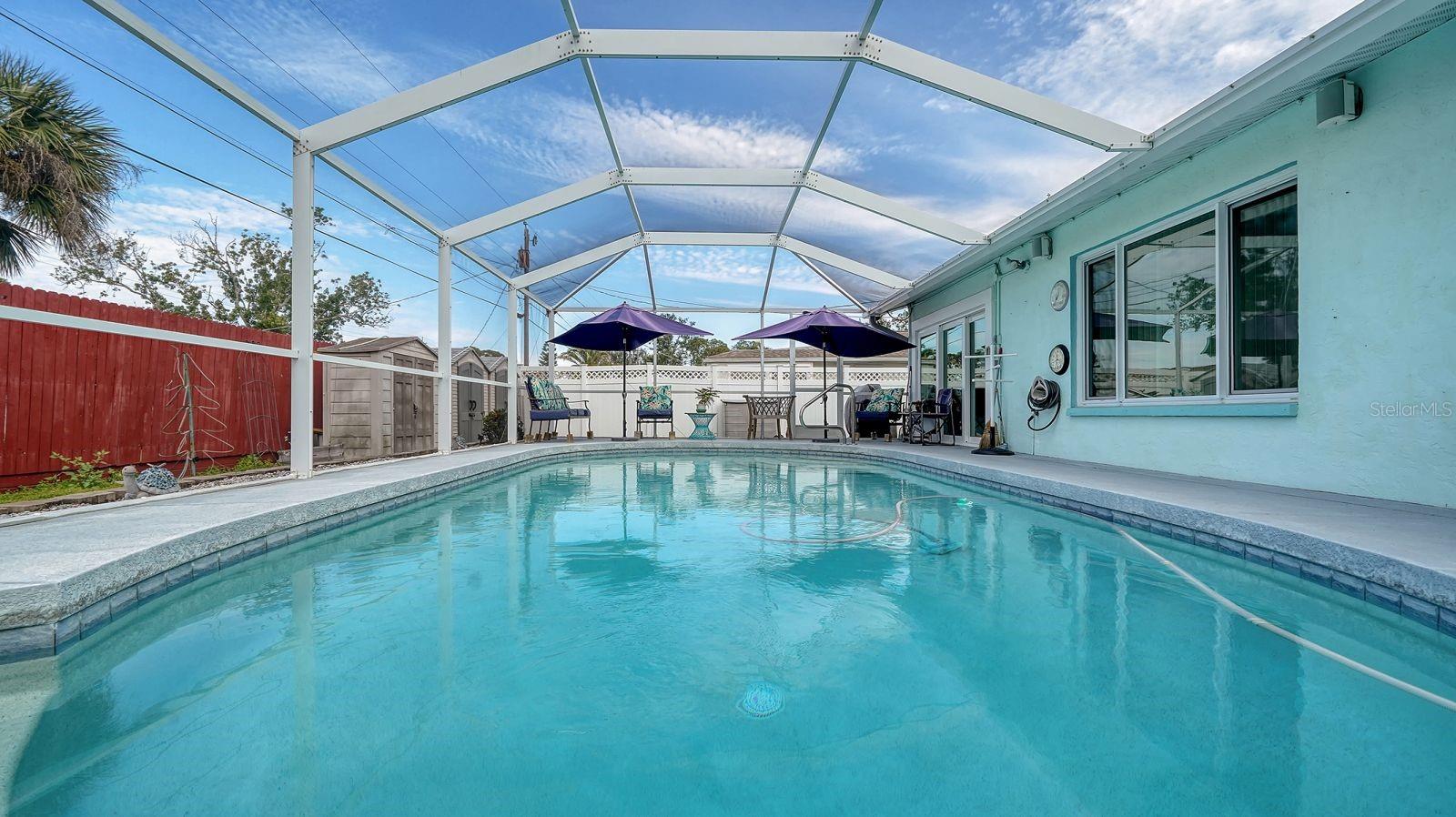 Welcome to this lovely solar home offering hurricane windows, new roof, newer appliances, no HOA and is nestled on a double lot in a central part of Venice. This not in a flood zone. This home is located on a quiet street near the beach, shopping and Downtown Venice! The newer water heater, AC, roof (2021) electric pump, solar heated pool was refinished, deck redone, and includes new screens and cement flooring in the lanai. Sky-light allows the Florida sunshine to lighten up the dining and living area. The 100 ft well offers a new bladder tank. It offers a submerged pump and with a large water softener with charcoal filter. This garage offers a high impact garage door, AC, LED lights, and pet bath. This double lot has room and offers an outlet and pump out for an RV! With gutters in the front and back and fencing surrounding the back yard, this well maintained home has privacy and space. The large refinished pool offers new aluminum and screws on the peeked pool cage. The gorgeous manicured lawn includes tangerine and mandarin trees, a koi pond, pergola, sheds, and a double drive way. The Senior Center is located close by with access to social activities such as Bingo, Bridge, and Dances. This beautiful property offers the perfect blend of comfort and relaxation, featuring a spacious layout, a private pool, a serene back yard oasis. Just minutes from beaches, parks, and local amenities, it’s ideal for anyone looking to enjoy Florida living at its best. Don’t miss out in this amazing opportunity!