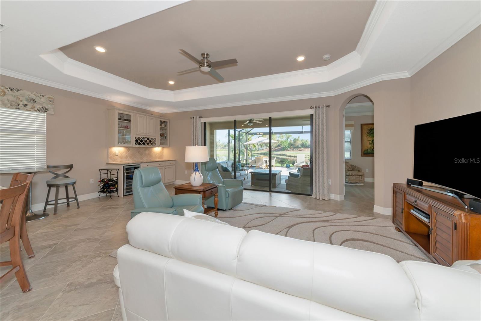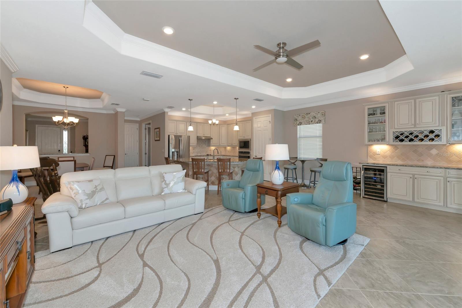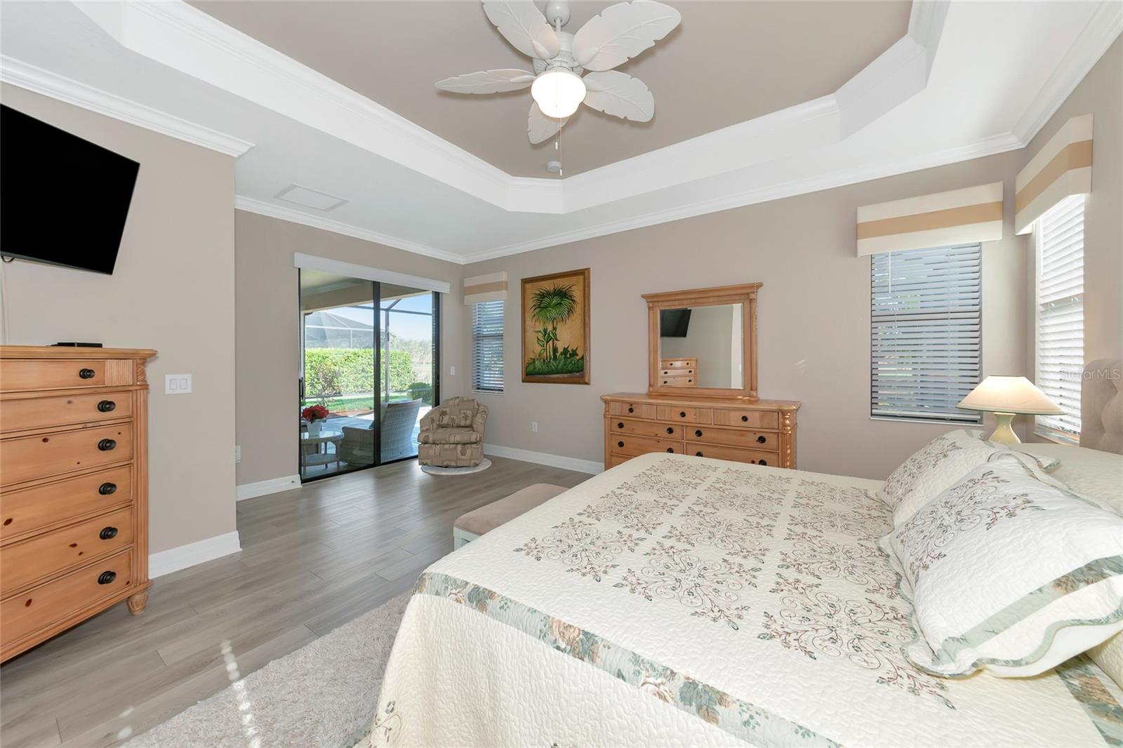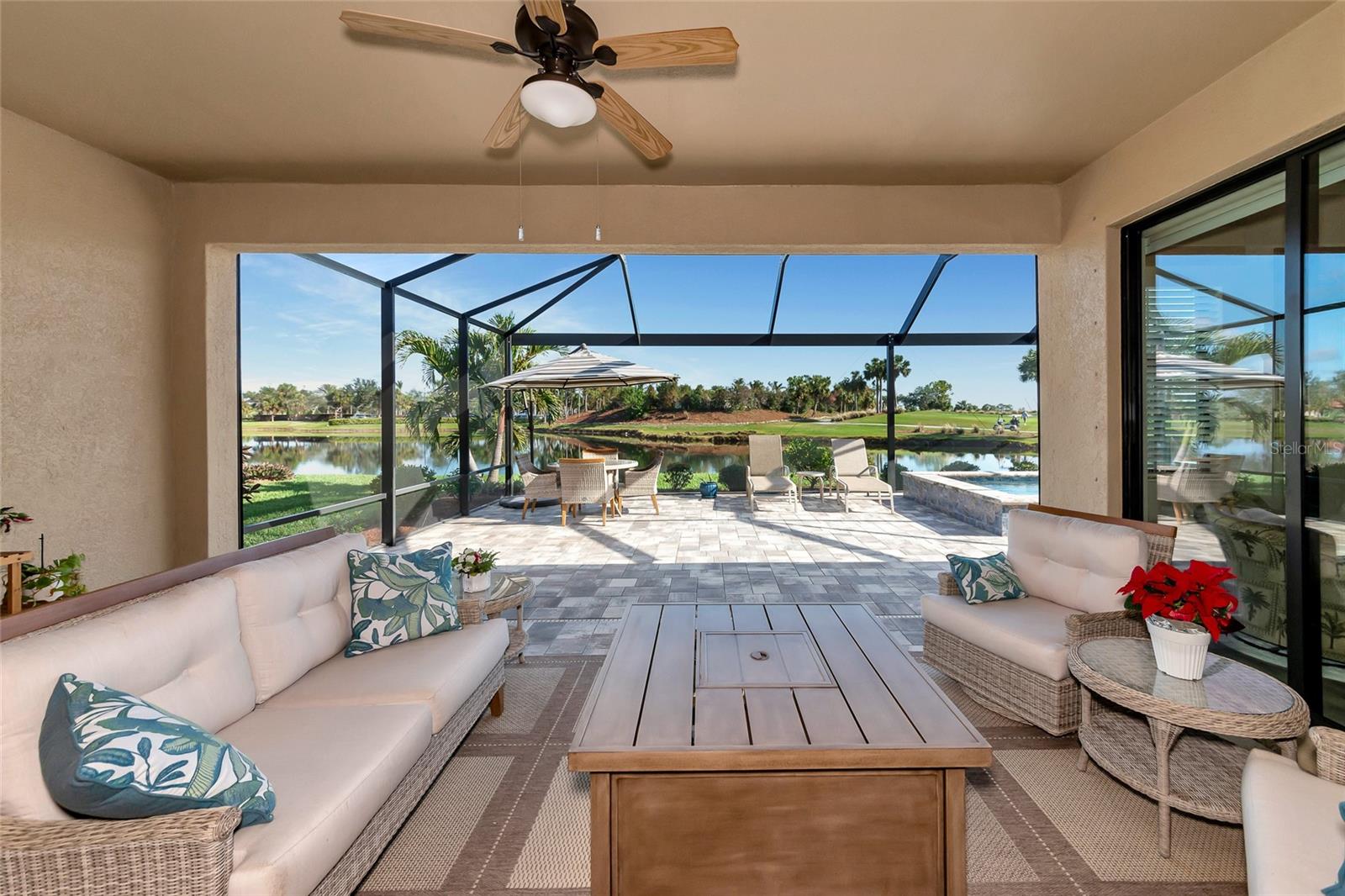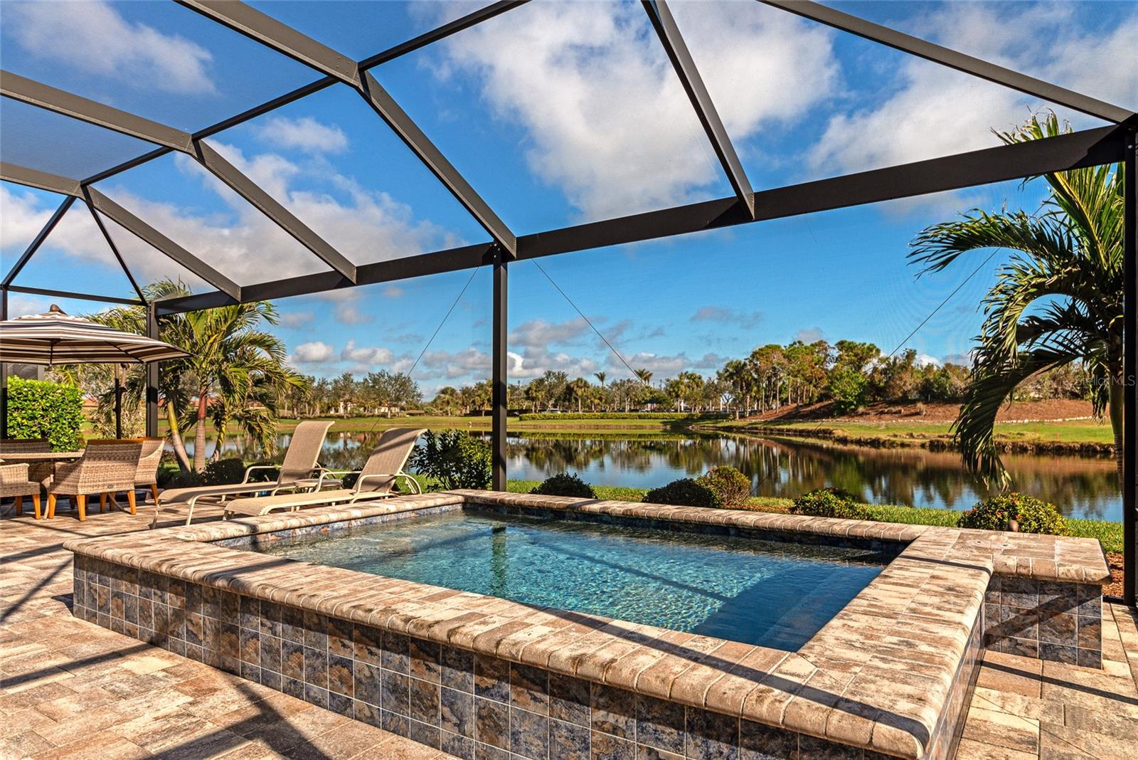 Don't miss this exceptional 4 bedroom, 2 bathroom residence, situated in the highly desired golf community of Sarasota National complete with 2 Golf Memberships included. This distinguished home offers luxurious living space and exclusive access to an extensive array of amenities, ensuring a vibrant and fulfilling community experience. Step into the beautifully designed foyer, where tasteful tile flooring, tray ceilings, and an abundance of large windows greet you with the perfect blend of comfort and sophistication. Just ahead, you'll find the formal dining space, ideal for gathering during holidays and enjoying meals in style. The open concept floor plan seamlessly guides you into the expansive living room, featuring more tray ceilings, elegant pendant lighting, a built-in dry bar, a wine refrigerator, and wall-to-wall sliders that offers serene views of the patio and pool/spa. The stunning gourmet kitchen is a chef's dream, high-end tile finishes, modern stainless steel appliances, and a massive center island perfect for morning coffee and conversation. Here, you can effortlessly create all of your culinary masterpieces while enjoying the luxurious ambiance. At the front of the home, you'll find two inviting guest bedrooms and a well-appointed bathroom, offering comfort and convenience for family and visitors alike. Additionally, a spacious 4th bedroom currently used as a den provides remarkable flexibility, a home office, a library, or a serene retreat for quiet moments. All bedrooms feature pristine luxury vinyl plank flooring, combining elegance with easy maintenance. The primary bedroom is a secluded retreat, designed as its own private suite for ultimate relaxation. Two spacious walk-in closets, providing ample storage, and a spa-like en-suite bathroom. This luxurious space features dual vanities, a grand walk-in shower, and a garden tub perfect for soaking away the day’s stresses. Enhancing the allure of this home is a custom rear patio that seamlessly connects indoor and outdoor living. This outdoor oasis is perfect for al fresco dining, relaxing by the heated spool, and entertaining guests, all while being surrounded by the lush beauty of the community. With picturesque views of the pond and golf course, the spool adds a touch of luxury to daily living. The outdoor space is also equipped with sleek overhead LED lighting to secure the mood you want. This home is designed with both comfort and safety in mind, featuring hurricane-rated windows for added protection. Additional highlights include custom wooden closets in the master bedroom and wooden shelving in all other closets throughout the home. The Sarasota National community offers a wealth of amenities, including the Palm Dining Room and Clubhouse, Tiki Bar, Coffee Lounge, Library, and more. You'll enjoy convenient proximity to exciting attractions, sandy beaches, diverse restaurants, grocery stores, major commuting routes, and top-rated schools. Call today to schedule a private tour before this rare opportunity is gone!