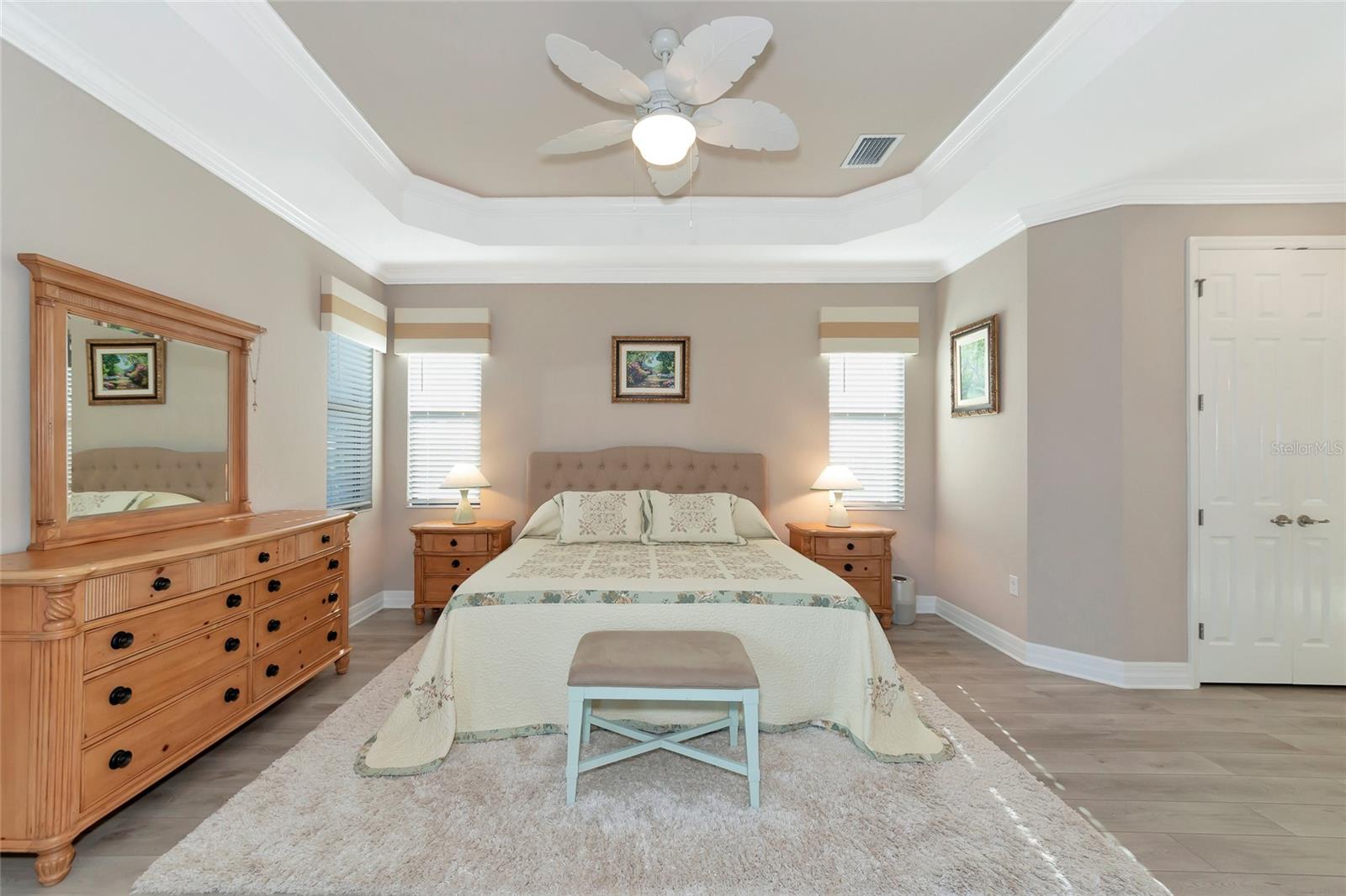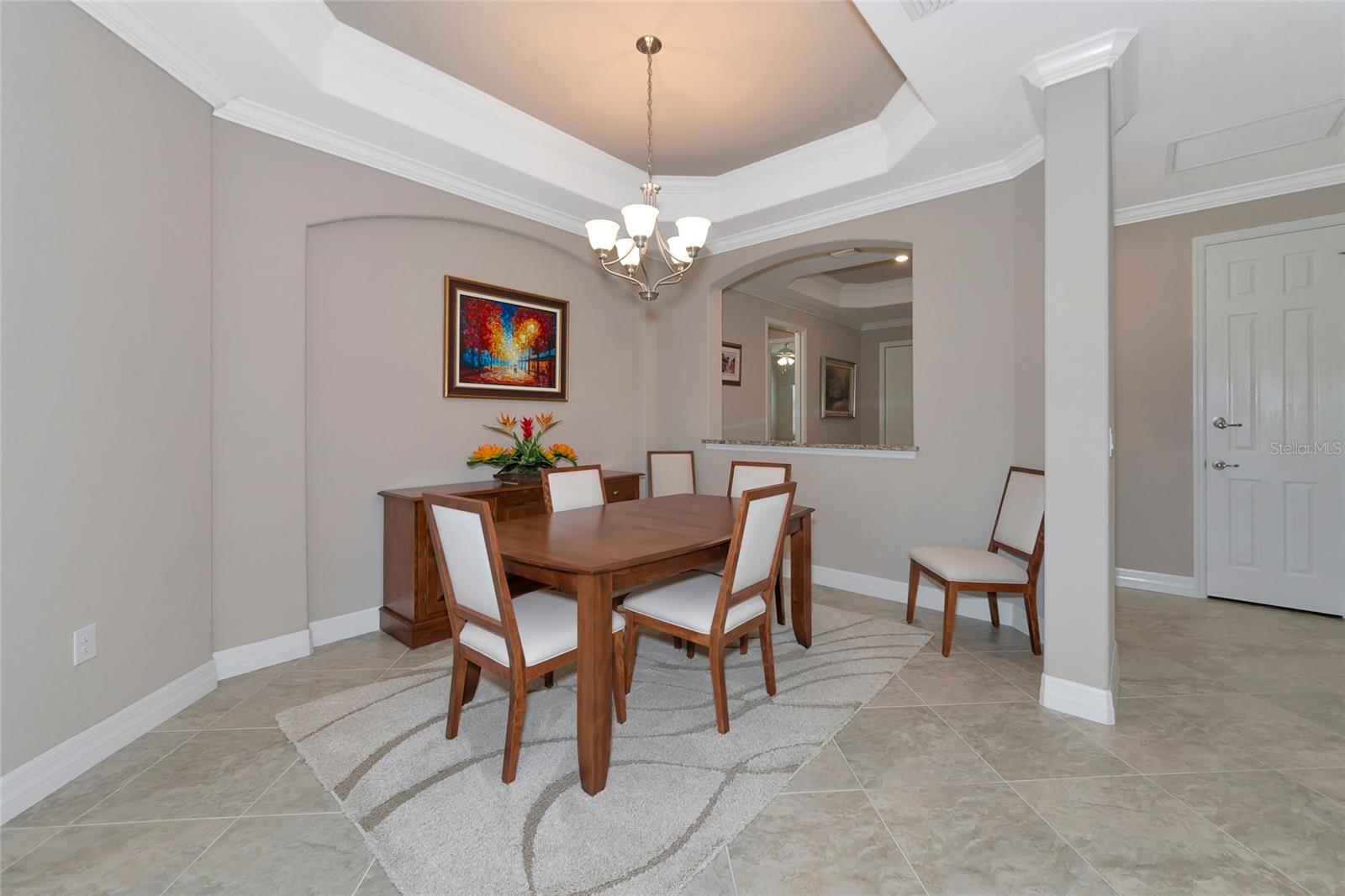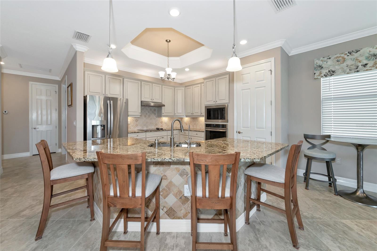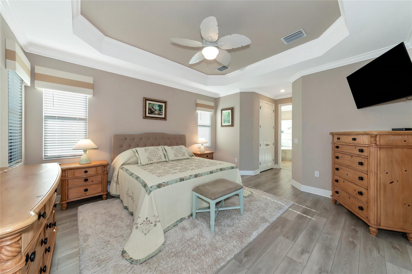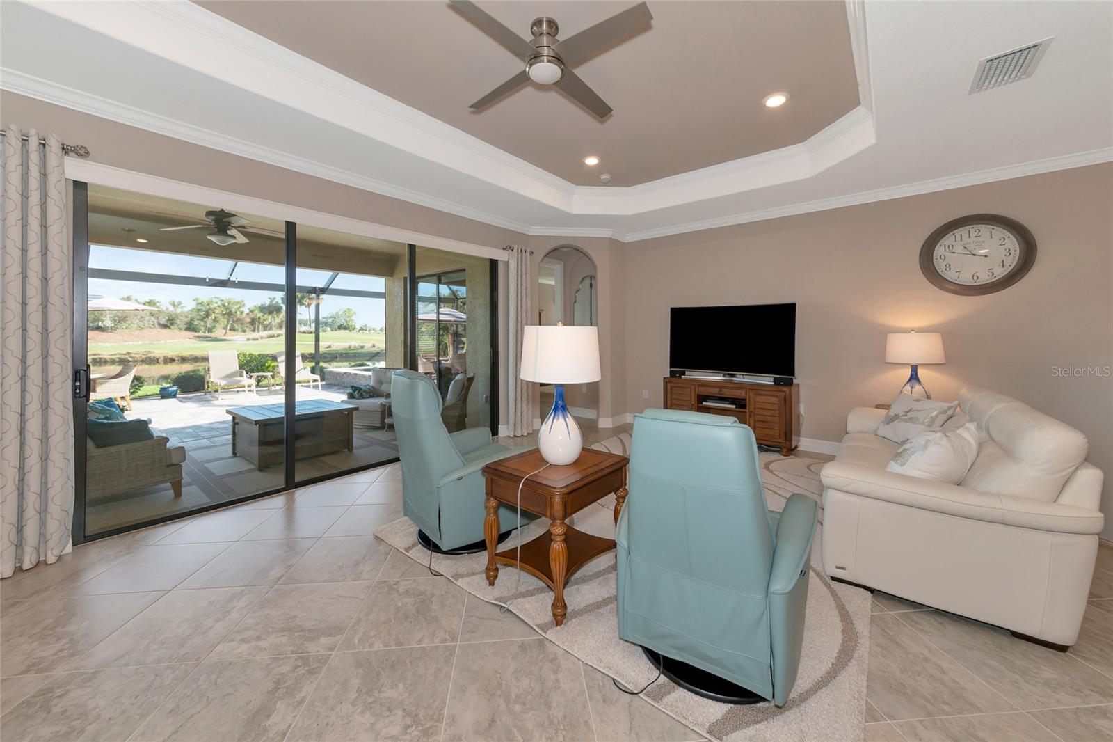 Don't miss this exceptional 4 bedroom, 2 bathroom residence, situated in the highly desired golf community of Sarasota National complete with 2 Golf Memberships included. This distinguished home offers luxurious living space and exclusive access to an extensive array of amenities, ensuring a vibrant and fulfilling community experience. Step into the beautifully designed foyer, where tasteful tile flooring, tray ceilings, and an abundance of large windows greet you with the perfect blend of comfort and sophistication. Just ahead, you'll find the formal dining space, ideal for gathering during holidays and enjoying meals in style. The open concept floor plan seamlessly guides you into the expansive living room, featuring more tray ceilings, elegant pendant lighting, a built-in dry bar, a wine refrigerator, and wall-to-wall sliders that offers serene views of the patio and pool/spa. The stunning gourmet kitchen is a chef's dream, high-end tile finishes, modern stainless steel appliances, and a massive center island perfect for morning coffee and conversation. Here, you can effortlessly create all of your culinary masterpieces while enjoying the luxurious ambiance. At the front of the home, you'll find two inviting guest bedrooms and a well-appointed bathroom, offering comfort and convenience for family and visitors alike. Additionally, a spacious 4th bedroom currently used as a den provides remarkable flexibility, a home office, a library, or a serene retreat for quiet moments. All bedrooms feature pristine luxury vinyl plank flooring, combining elegance with easy maintenance. The primary bedroom is a secluded retreat, designed as its own private suite for ultimate relaxation. Two spacious walk-in closets, providing ample storage, and a spa-like en-suite bathroom. This luxurious space features dual vanities, a grand walk-in shower, and a garden tub perfect for soaking away the day’s stresses. Enhancing the allure of this home is a custom rear patio that seamlessly connects indoor and outdoor living. This outdoor oasis is perfect for al fresco dining, relaxing by the heated spool, and entertaining guests, all while being surrounded by the lush beauty of the community. With picturesque views of the pond and golf course, the spool adds a touch of luxury to daily living. The outdoor space is also equipped with sleek overhead LED lighting to secure the mood you want. This home is designed with both comfort and safety in mind, featuring hurricane-rated windows for added protection. Additional highlights include custom wooden closets in the master bedroom and wooden shelving in all other closets throughout the home. The Sarasota National community offers a wealth of amenities, including the Palm Dining Room and Clubhouse, Tiki Bar, Coffee Lounge, Library, and more. You'll enjoy convenient proximity to exciting attractions, sandy beaches, diverse restaurants, grocery stores, major commuting routes, and top-rated schools. Call today to schedule a private tour before this rare opportunity is gone!