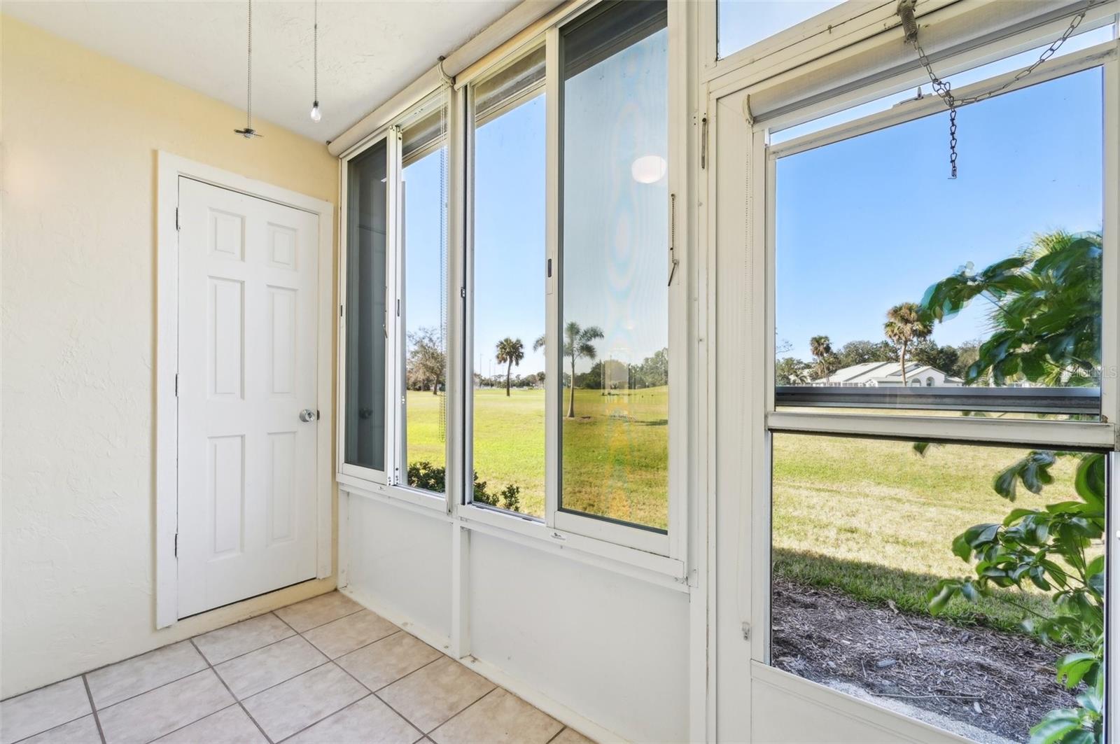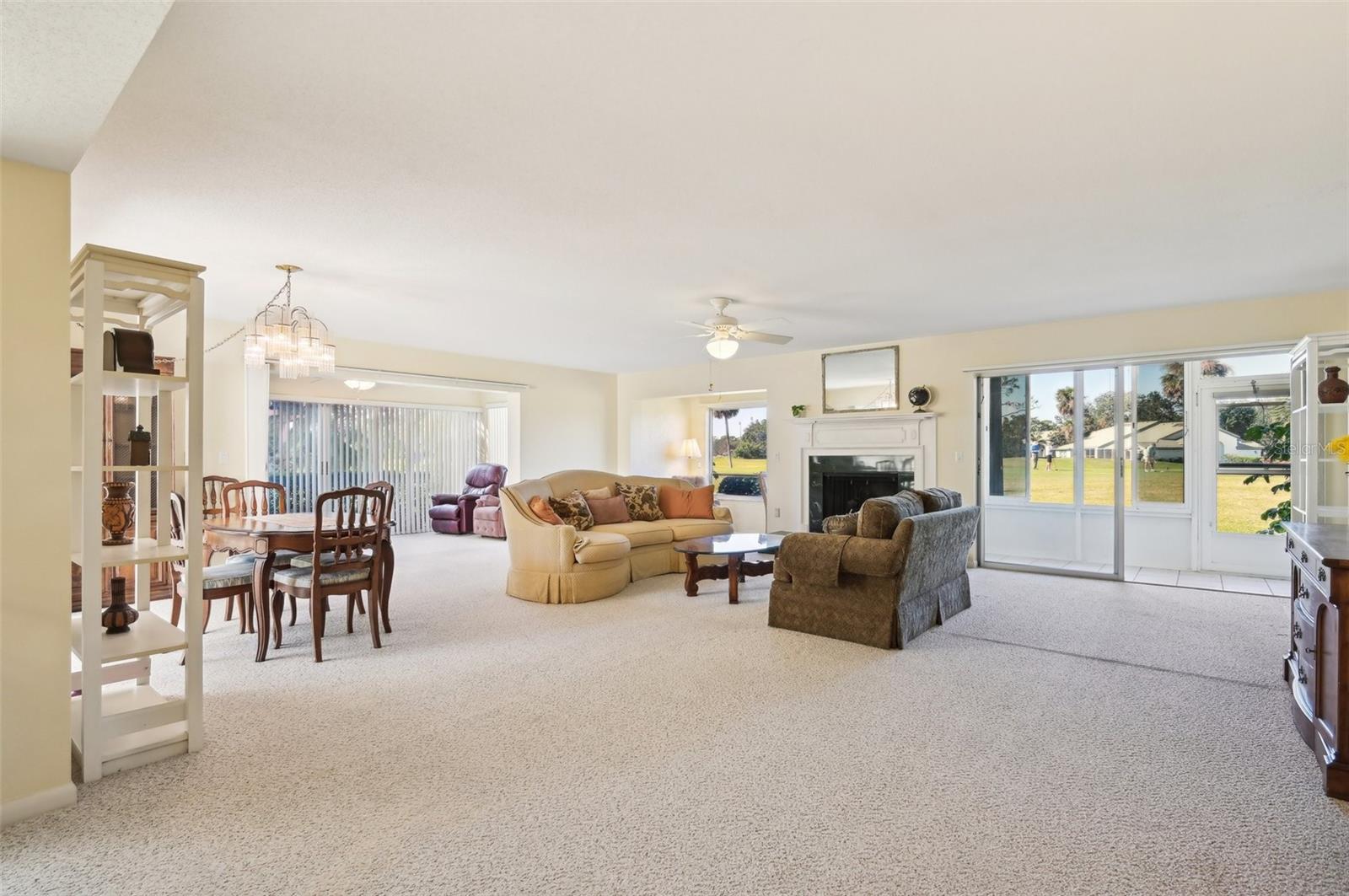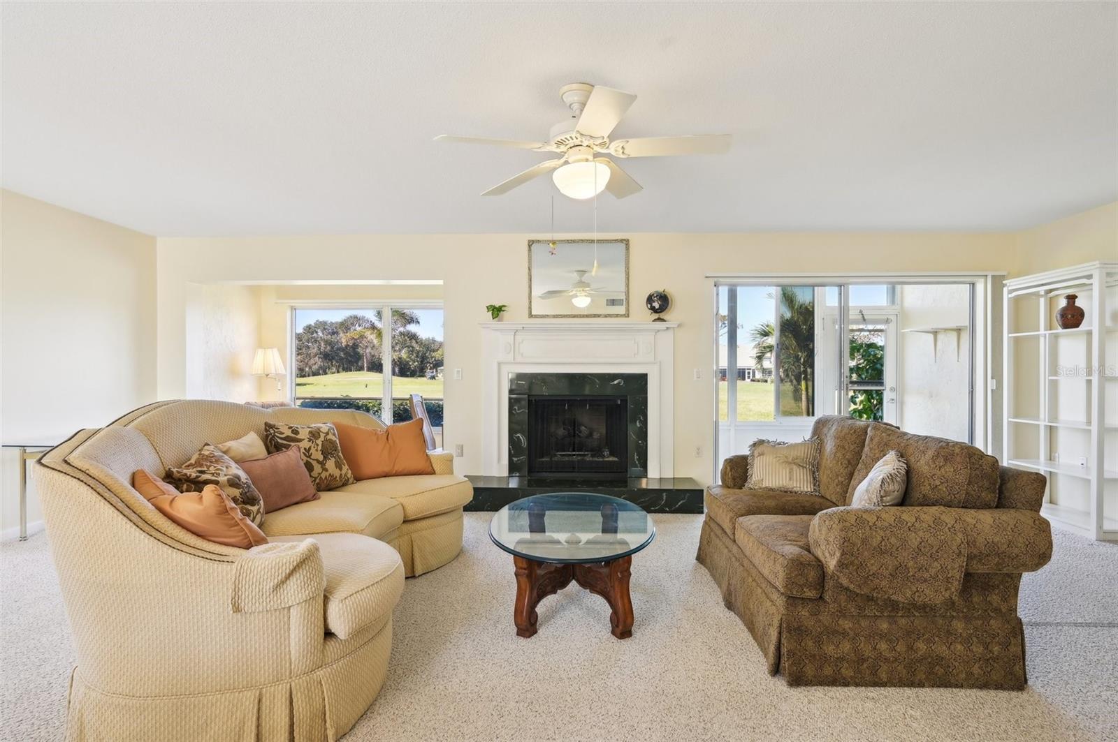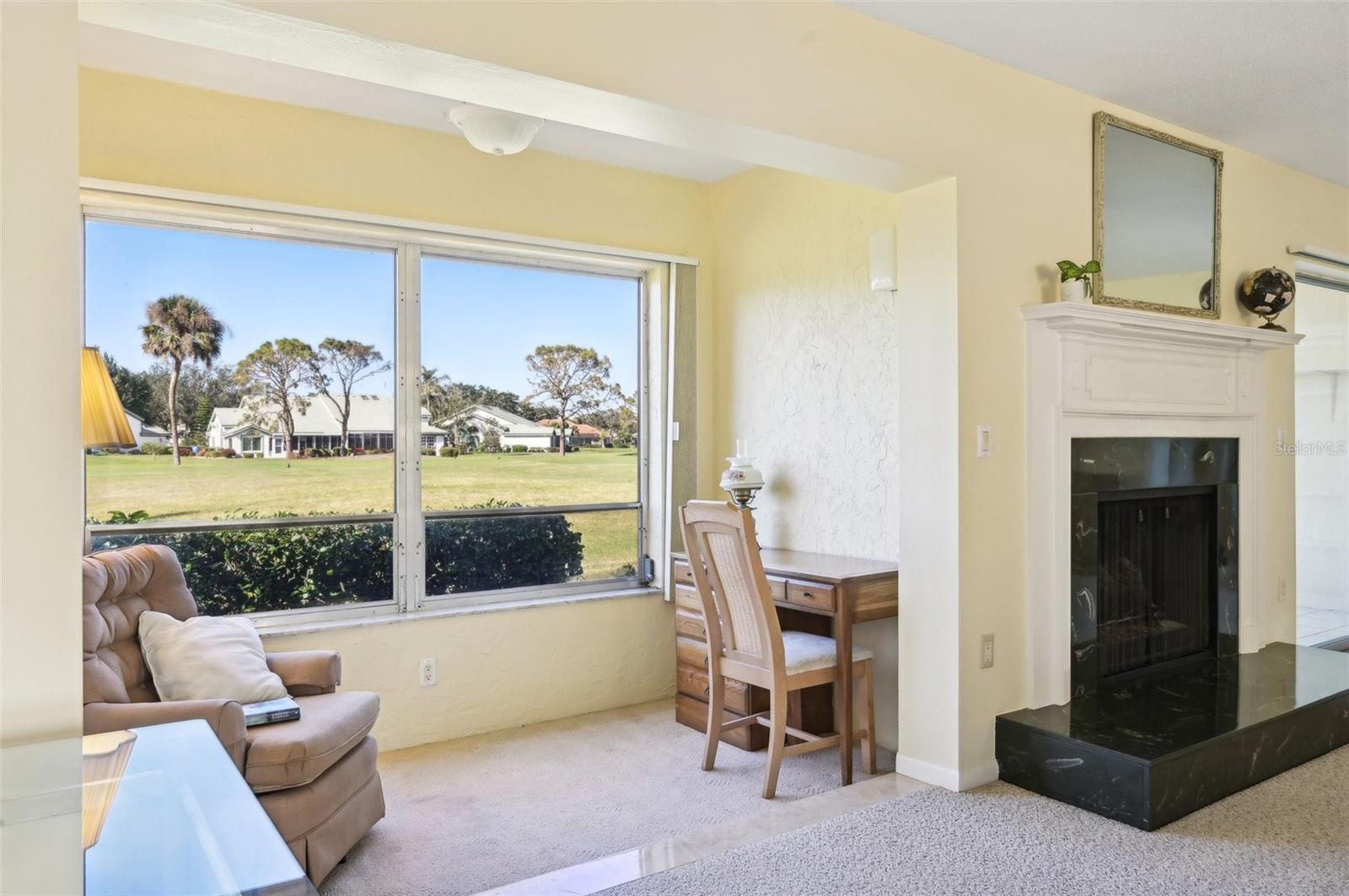 Corner units like this rarely become available! This spacious 2-bedroom, 2-bathroom condo is one of the largest floor plans in Capri West, offering incredible views of the 9th hole of Capri Isles Golf Club. Step into the large kitchen, featuring custom cabinets for extra storage and newer appliances. Both bedrooms have walk-in closets, with the primary suite boasting an ensuite bathroom with walk-in shower for added privacy. The expansive living room, complete with a cozy fireplace, flows seamlessly into a versatile sitting area with accordion doors—perfect for hosting extra guests or creating a quiet reading nook. Another additional space off of the living room offers a perfect spot for an office or den. Enjoy breathtaking sunsets and wildlife from the enclosed lanai overlooking the golf course or relax on the outdoor terrace just off the dining area. There’s no shortage of storage options, with a spacious closet on the lanai and another conveniently located just outside the front door. With hurricane-impact windows, shutters, a newer A/C, and water heater, this home is as practical as it is charming. Capri West offers great amenities, including two pools (one heated), a clubhouse with a vibrant social scene, and golf-cart-friendly streets. The Capri Isles Golf Course, complete with a pro shop and restaurant, is just a short stroll away. Located minutes from downtown Venice, stunning beaches, Wellen Park, and I-75, this condo combines the best of convenience and leisure. Don't miss your chance to call this one-of-a-kind condo home—schedule your private showing today!