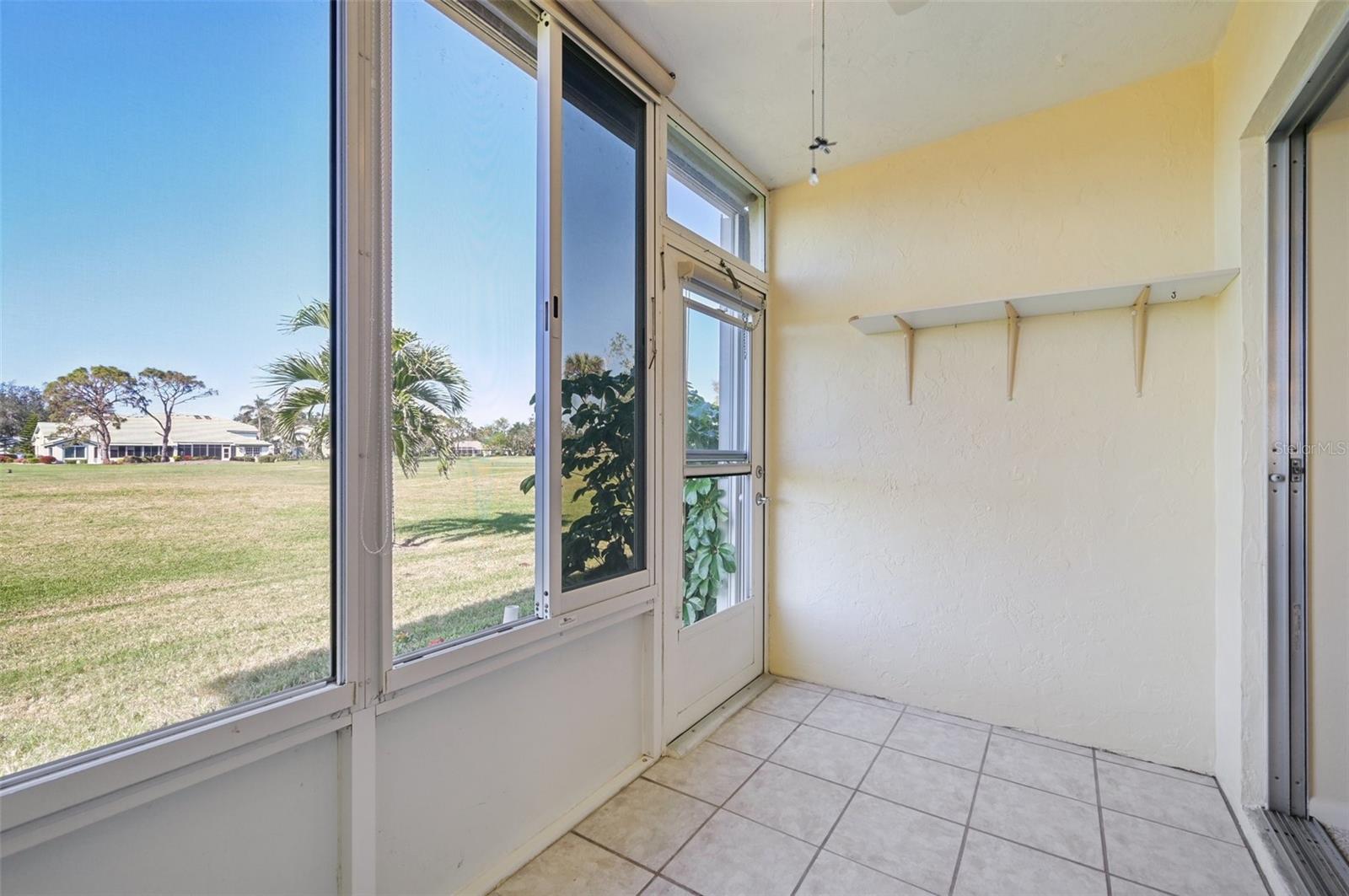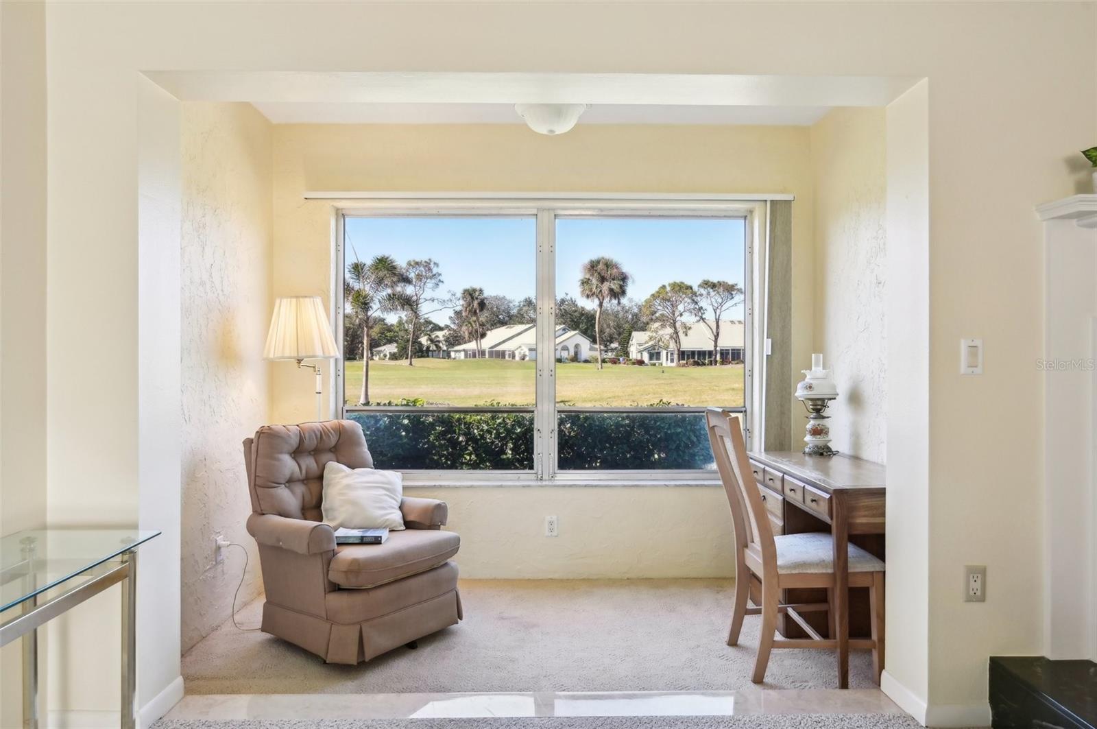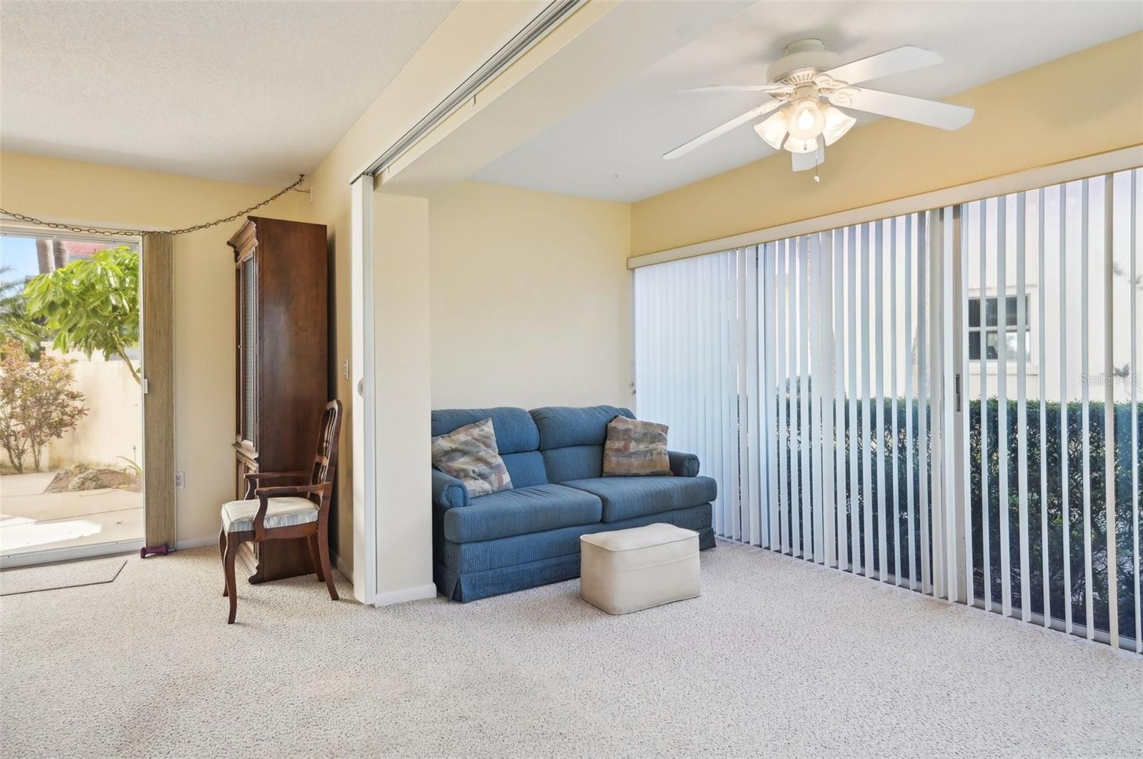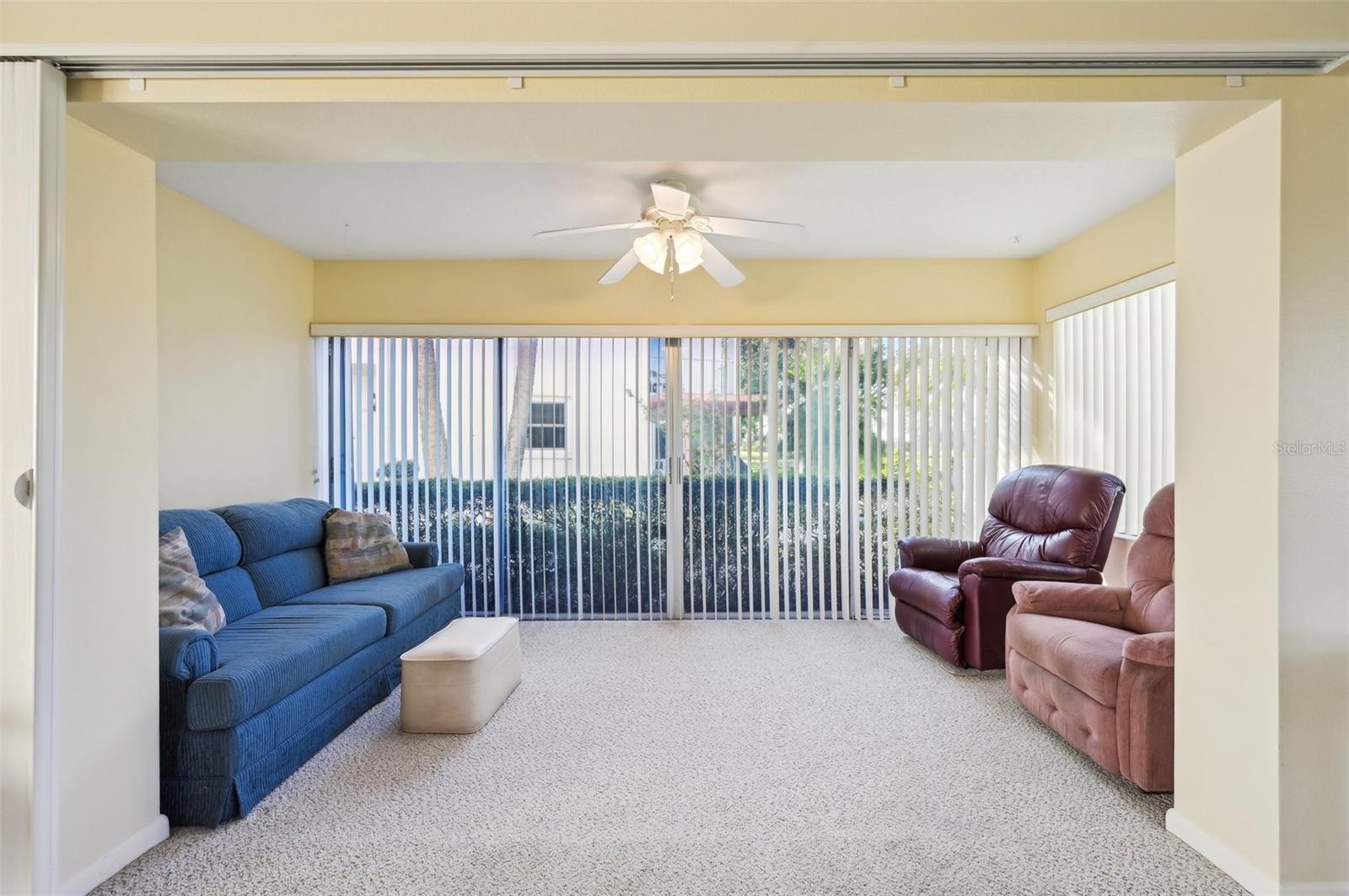 Corner units like this rarely become available! This spacious 2-bedroom, 2-bathroom condo is one of the largest floor plans in Capri West, offering incredible views of the 9th hole of Capri Isles Golf Club. Step into the large kitchen, featuring custom cabinets for extra storage and newer appliances. Both bedrooms have walk-in closets, with the primary suite boasting an ensuite bathroom with walk-in shower for added privacy. The expansive living room, complete with a cozy fireplace, flows seamlessly into a versatile sitting area with accordion doors—perfect for hosting extra guests or creating a quiet reading nook. Another additional space off of the living room offers a perfect spot for an office or den. Enjoy breathtaking sunsets and wildlife from the enclosed lanai overlooking the golf course or relax on the outdoor terrace just off the dining area. There’s no shortage of storage options, with a spacious closet on the lanai and another conveniently located just outside the front door. With hurricane-impact windows, shutters, a newer A/C, and water heater, this home is as practical as it is charming. Capri West offers great amenities, including two pools (one heated), a clubhouse with a vibrant social scene, and golf-cart-friendly streets. The Capri Isles Golf Course, complete with a pro shop and restaurant, is just a short stroll away. Located minutes from downtown Venice, stunning beaches, Wellen Park, and I-75, this condo combines the best of convenience and leisure. Don't miss your chance to call this one-of-a-kind condo home—schedule your private showing today!