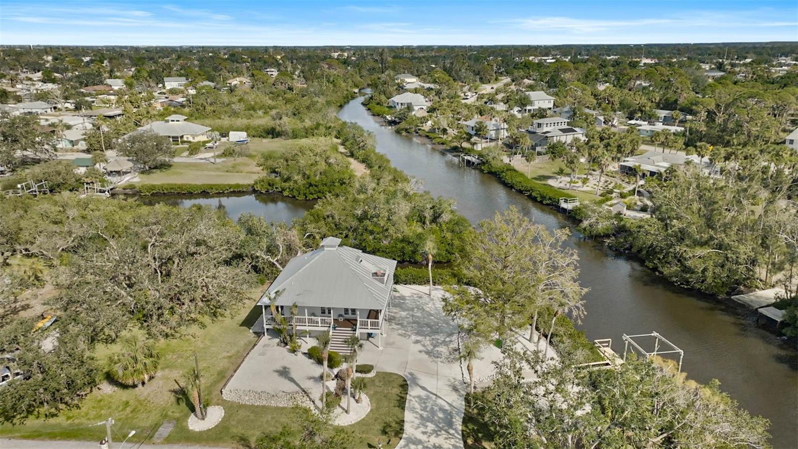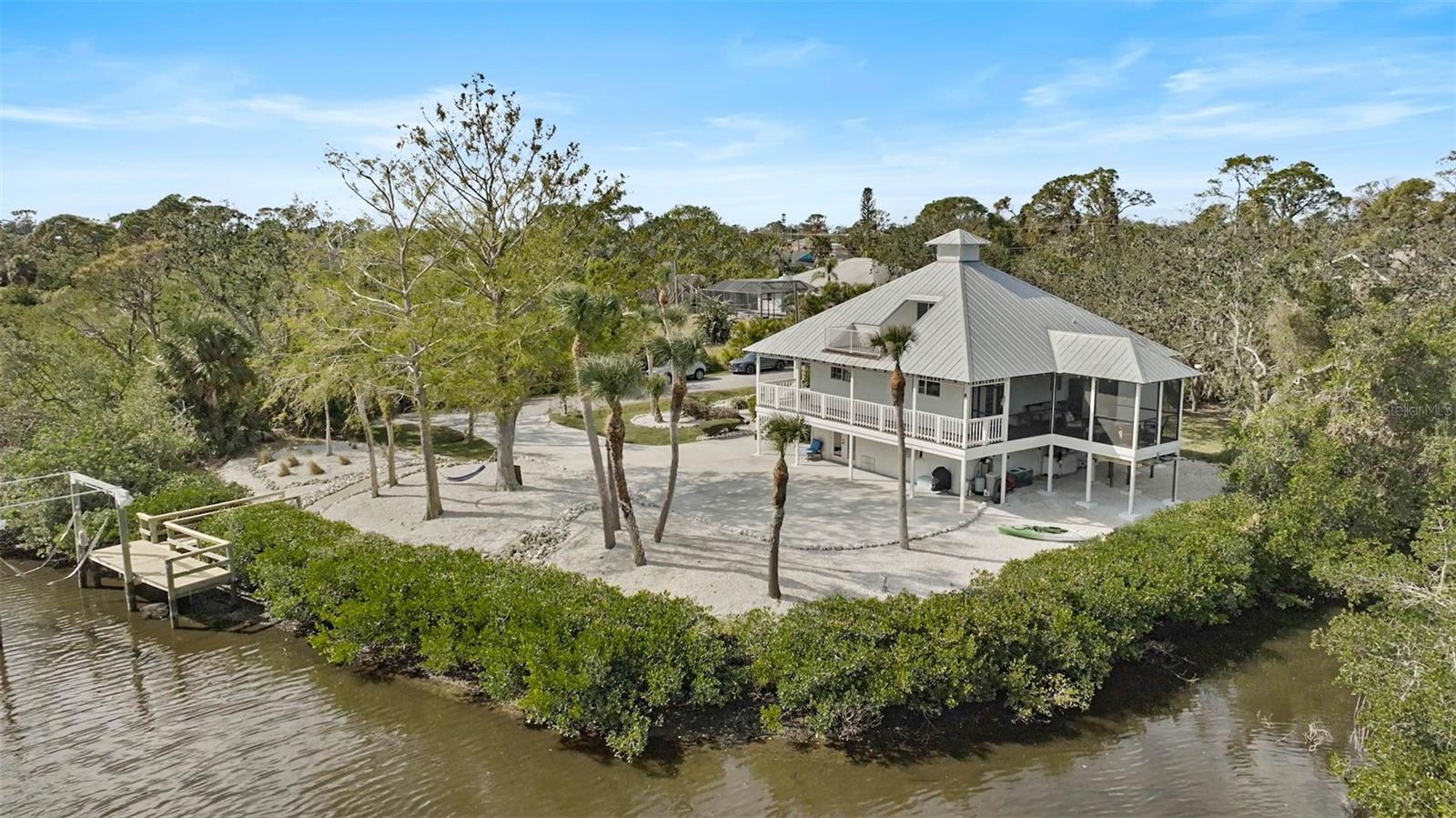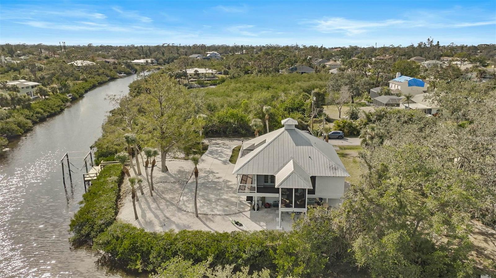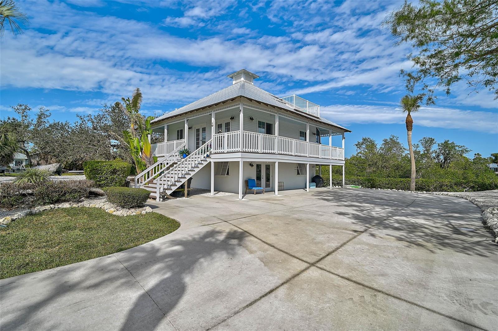 **BOATER’S DREAM! WATERFRONT, ONE OF A KIND, COMPLETELY RENOVATED, FURNISHED – KEY WEST STYLE “PRIVATE OASIS” is a MUST SEE!** Immerse yourself in the Natural Beauty of this “private peninsula” located at the End of the street and surrounded by water on multiple sides. This 4-Bed, 3 Full Bath, Move-In Ready, UPDATED residence offers Quick Access to Intracoastal Waterway and Open Water (Gulf of Mexico) and includes a Boat Dock and 5000lb Lift. The NEW, Stunning Chef’s Kitchen boasts Quartz countertops, premium appliances including SubZero, Bosch and GE Cafe. Travel down the iron, spiral staircase to the Newly updated lower level living room, additional Bedrooms and Full Bath. The third level features a wonderful, open loft area with full bath and a walkout to an elevated terrace. Preserved characteristics include hardwood flooring, wooden beams, wrap around balcony … with incredible Charm throughout! Enjoy Serene Preserve views in this very Private and natural setting. NEW HURRICANE IMPACTS WINDOWS/DOORS (2022), METAL ROOF (2018), HVAC, HOT WATER HEATER, DOCK, LANAI CAGE, LANDSCAPING, FRESHLY PAINTED, METICULOUSLY MAINTAINED. NO HOA. Please note there is an adjacent 0.18 acre parcel of land that is optionally available for purchase. **Enjoy the 3D Virtual Tour and Aerial Video.**