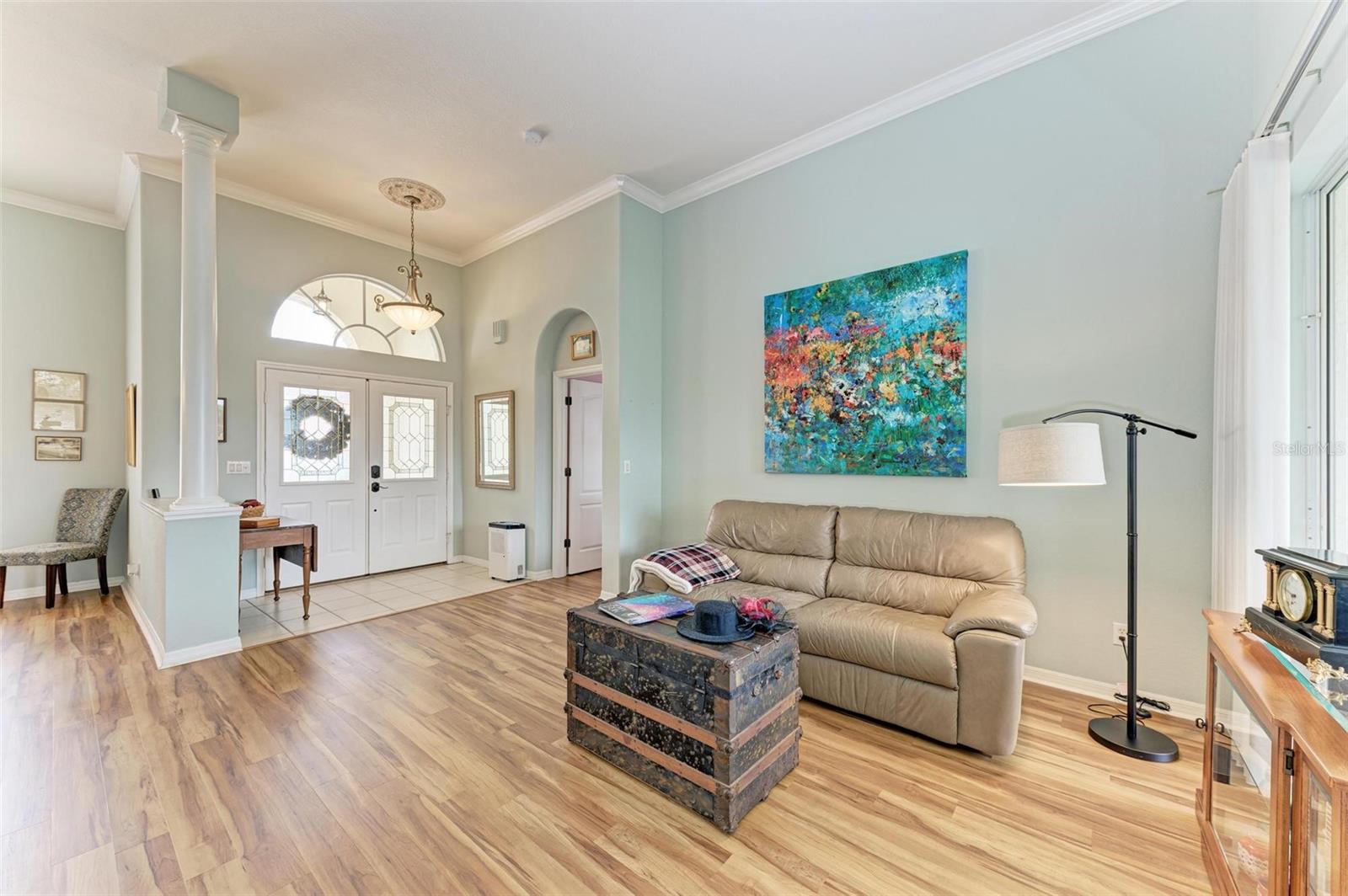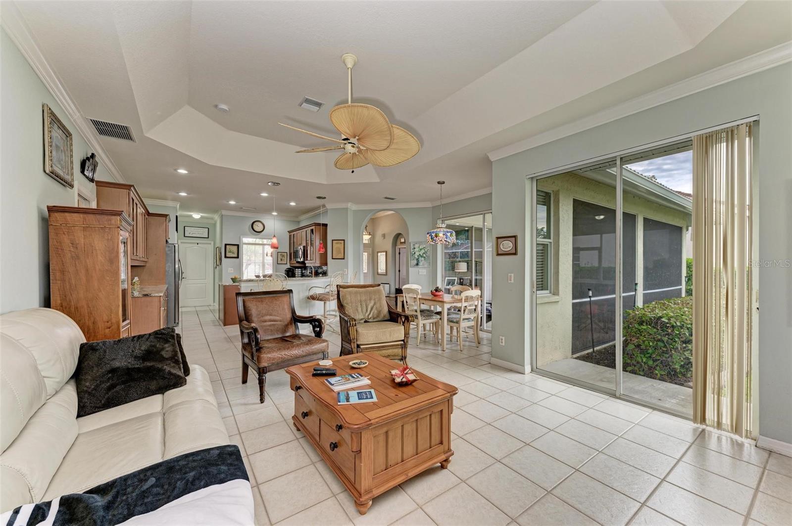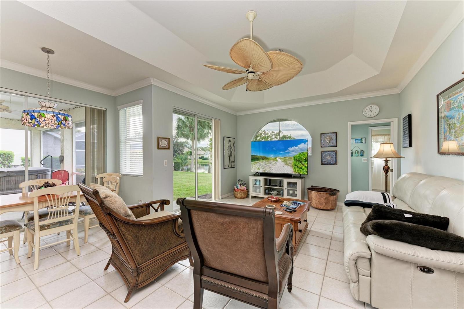 Welcome to 115 Grand Oak Circle, an entirely newly painted (2024) stunning 3-bedroom, 3-bathroom home with a den and NEW roof (2024), nestled in the desirable Hidden Lake Club of Venice, FL. This modern retreat offers 2,365 square feet of luxurious living space with OVER $80,000 in upgrades. As you enter through the elegant French doors, you're greeted by a formal dining room and sitting area. The sliding doors in this space draw your eyes beyond, offering captivating water views of the serene lake. The home features high ceilings and elegant tile flooring throughout, with NEWER luxury vinyl flooring (2019) adding a touch of warmth to the dining and sitting rooms, as well as the bedrooms. The open-concept FULLY RENOVATED kitchen (2021) and living room are a chef's dream, featuring new granite countertops, new oak cabinets, and crown molding that add a touch of sophistication to the space. The master suite is a true sanctuary, located on the left wing of the home. It boasts dual sinks, a walk-in shower, a soaking tub, and two generous closet spaces. On the right side of the home, just off the family room, you'll find two additional bedrooms and a shared bathroom, providing privacy and convenience for family or guests. Beyond the family room, discover a cozy den and a full bathroom, perfect for a home office or guest suite. The pocket doors throughout the home offer privacy without compromising the open feel of the space. Step outside to the newly screened-in lanai (2019), where you can relax and enjoy breathtaking views of the lake and lush greenery. This outdoor oasis features a hot tub (2017), perfect for unwinding after a long day, and a newly added nonskid flooring (2022). The expansive 9,150 square foot lot provides plenty of space for outdoor activities and entertaining. Additional upgrades include a NEWER AC and water heater (2021) and a Culligan water softener. Living in Hidden Lake Club means enjoying a year-round heated pool and spa, a fitness center, a library, and a clubhouse with a usable area for private parties. The community also offers bocce ball, shuffleboard, basketball, and tennis/pickleball courts. Conveniently located, this home provides easy access to local amenities, shopping, dining, and the beautiful beaches of Venice. Don't miss your chance to make 115 Grand Oak Circle your new home! SELLER WILL ENTERTAIN PURCHASING A RATE BUY-DOWN.