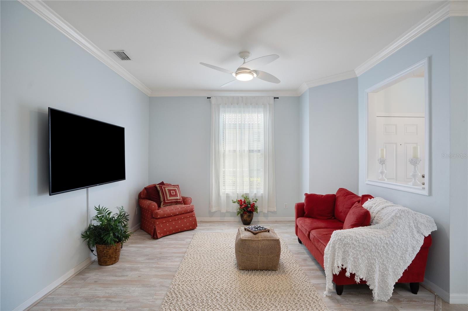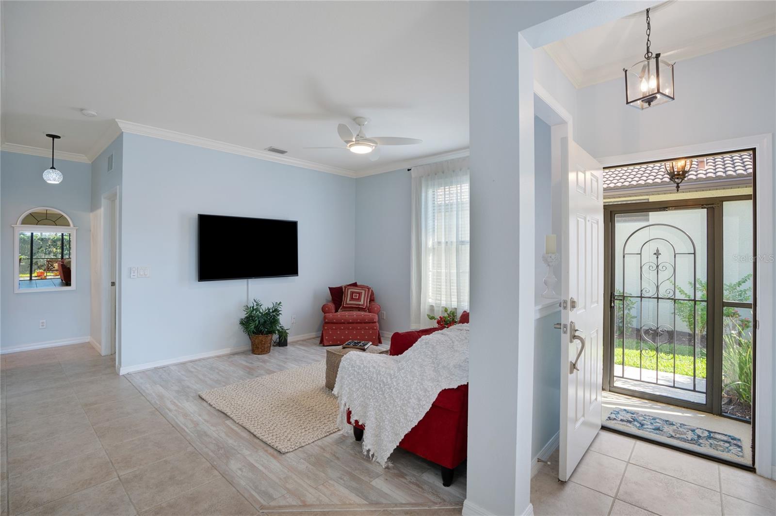 The rarely available Michelangelo model by Centex Homes in the 55+ community of Venetian Falls is truly crafted for the Florida lifestyle. This updated decorated villa has aesthetically pleasing wall colors, contemporary custom light fixtures and fans, crown molding, remote controlled blinds. This style of villa has been created for space and privacy emphasizing expansive layouts and bedrooms located at each end of the home. The primary suite is so spacious you could create a lounging area within the bedroom. Another creative masterpiece of this home…two family rooms! A large kitchen with an eat-in dining area and bar creates the perfect blend of functionality and style. You also have a dining room for the special entertaining nights. Stepping outside onto your extended lanai you will experience your own personal oasis. Vibrant greenery, with flowering plants and aged oaks is the view from the screened lanai. There is plenty of room for you to enjoy the craft of gardening. Venetian Falls is close to the Gulf beaches and the quaint main street of Venice on the Island. Amenities of the community include a resort style clubhouse with heated lap pool and spa, resistance walking pool, state of the art exercise facility, billiard room, bocce courts and a full-time activities director. Included in your HOA fee is lawn maintenance, irrigation, roof pressure washing, exterior paint, and basic cable plus internet. Enjoy the Florida style lifestyle at Venetian Falls today!