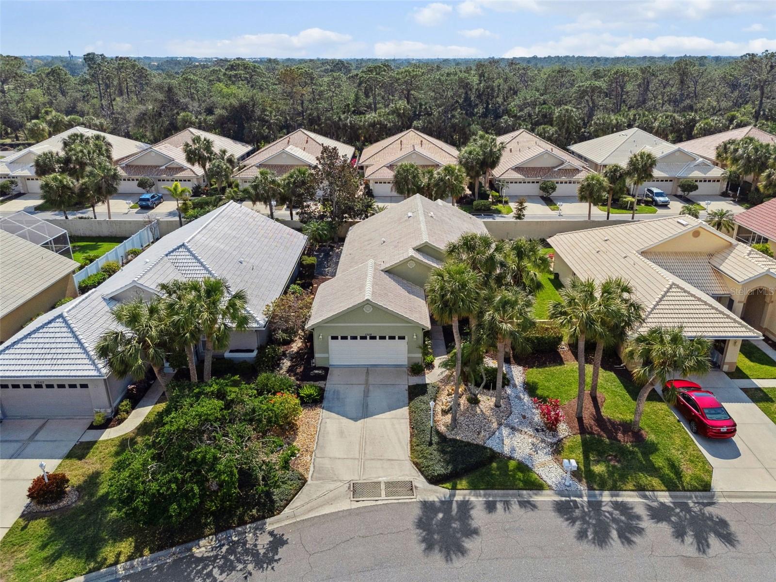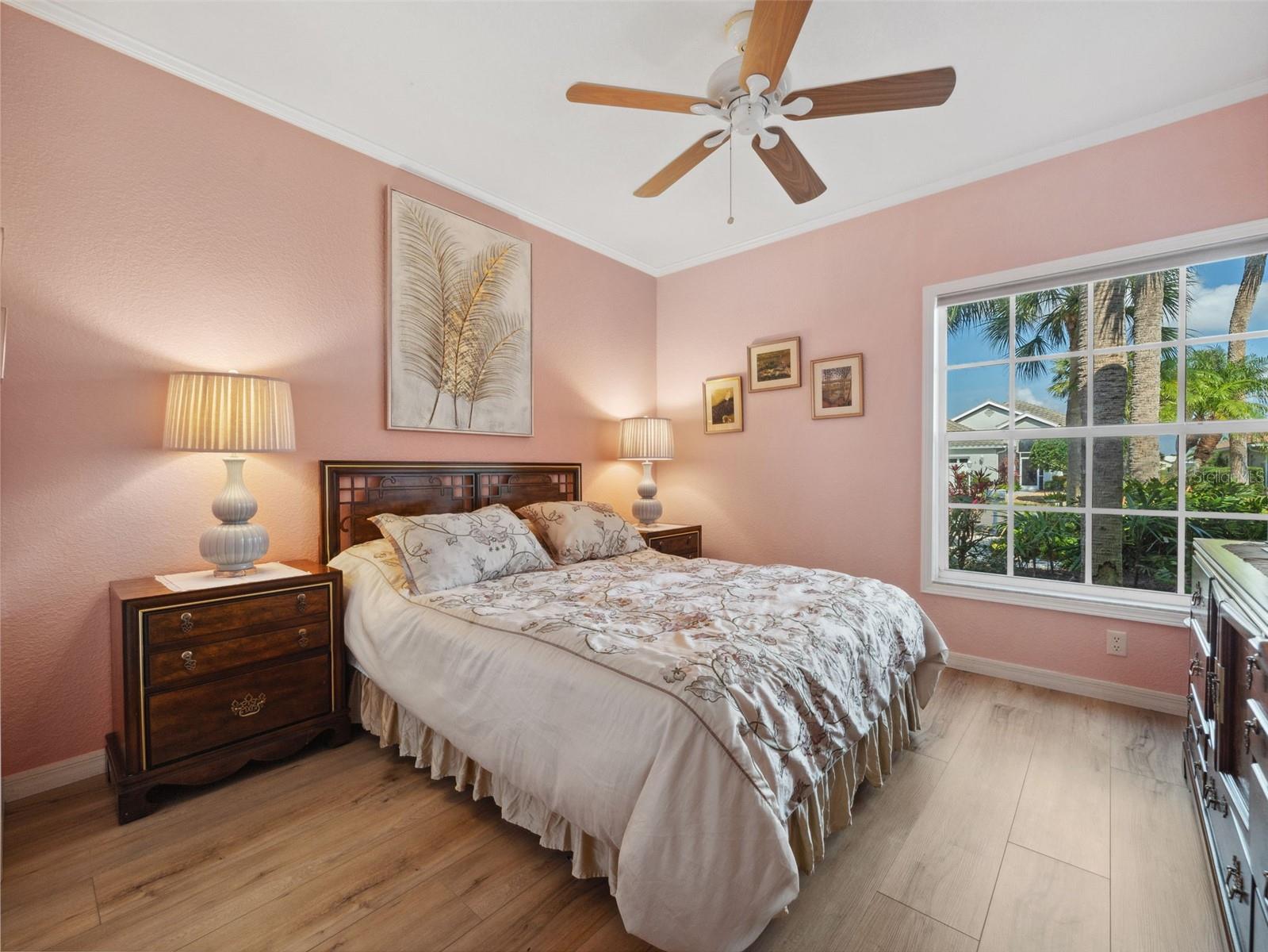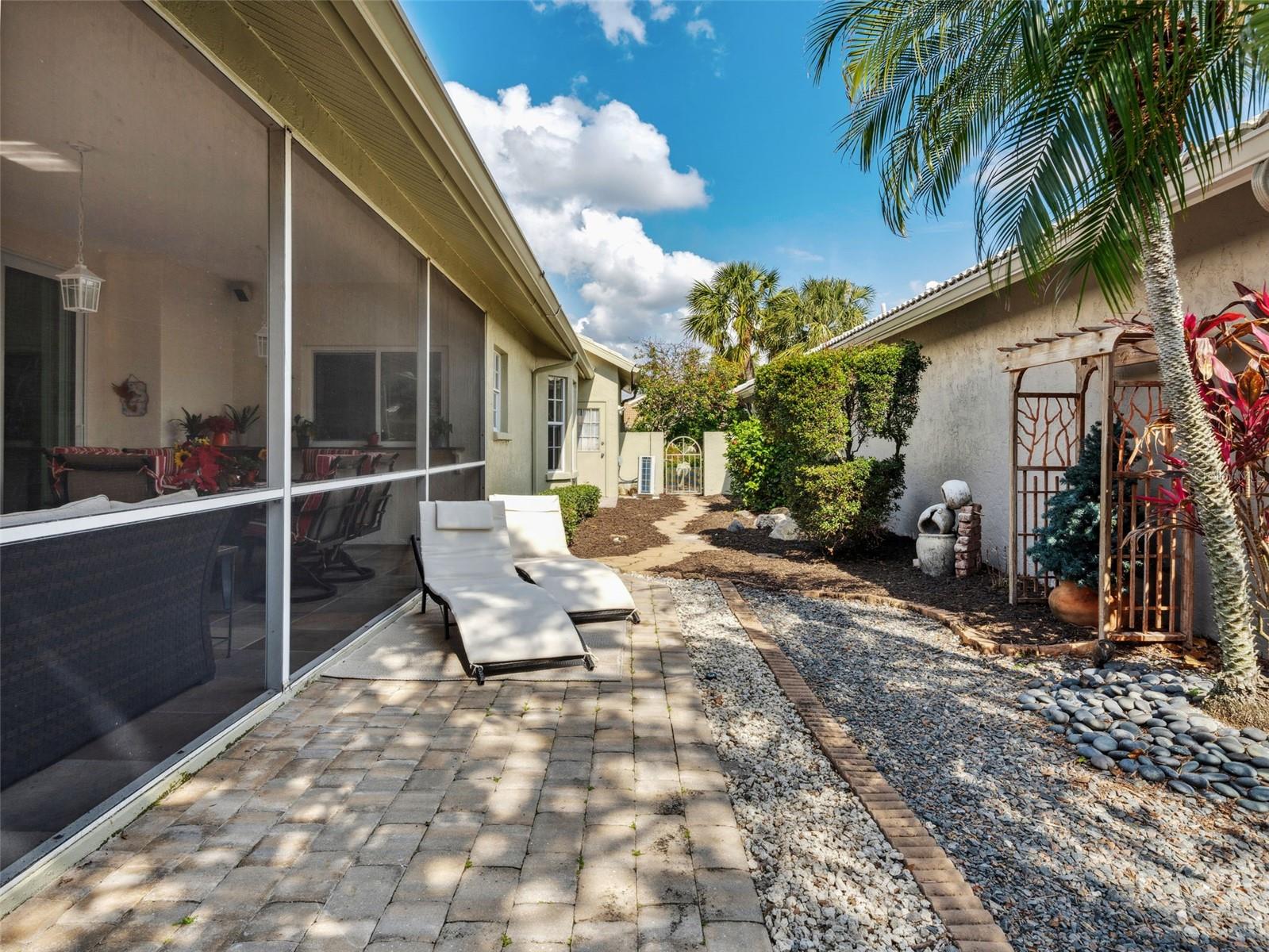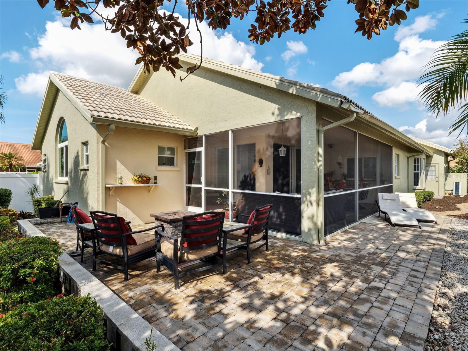 This well-built and meticulously cared-for Waterford Carina model offers spacious living, abundant natural light, and exceptional outdoor space in a quiet, gated community of just 39 homes. Located in maintenance-free Berkshire Place, this 1,796 sq. ft. home features 2 bedrooms, 2 baths, and a versatile den—ideal for a home office or guest space. Designed for comfort and functionality, the open floor plan showcases cathedral ceilings, pocket doors, and a seamless mix of engineered hardwood, tile, and laminate flooring. The kitchen offers quartz countertops, a tile backsplash, refinished cabinetry, a stainless-steel double sink, and a large pantry. A pass-through window connects to the lanai, making entertaining effortless. The primary suite is a private retreat with a custom walk-in closet and impact-resistant sliding doors to the lanai. The en-suite bath features granite countertops, a walk-in shower with seamless glass doors, a garden tub, and cathedral ceilings. A well-appointed guest bedroom and bath provide comfortable accommodations for visitors. Outdoor living is a highlight, with a spacious covered lanai and wraparound stone patio, extending the outdoor space to 2,100 sq. ft. Enjoy ceiling fans, tile flooring, ambient lighting, and an extended quartz counter with cabinetry—perfect for relaxing or entertaining. Impact windows and doors provide peace of mind and energy efficiency. Low HOA fees cover lawn care, tree trimming, irrigation, and access to Waterford’s exclusive amenities, including a Jr. Olympic-sized pool, Har-Tru tennis courts, fitness center, clubhouse, and social activities. With no CDD fees or capital contribution at closing, this home is an excellent value. Centrally located near Venice’s beaches, Wellen Park, I-75, Legacy Trail, Sarasota Memorial Hospital, shopping, dining, and golf, this move-in-ready home is perfect as a primary residence or seasonal retreat.