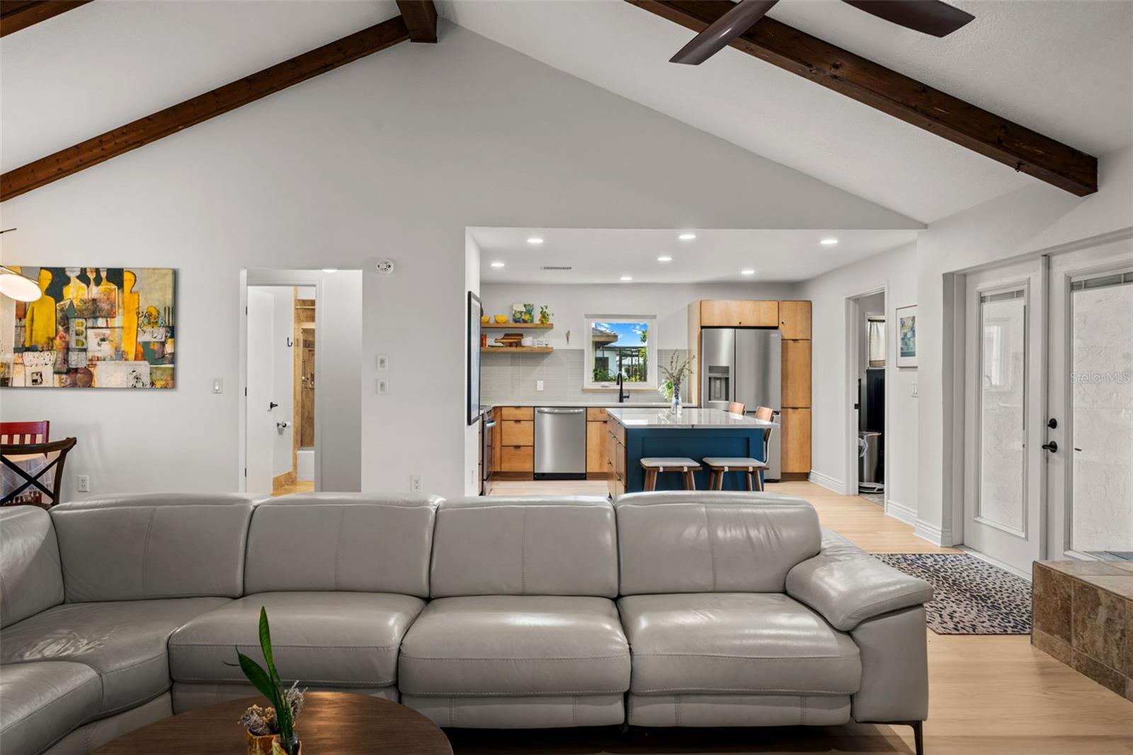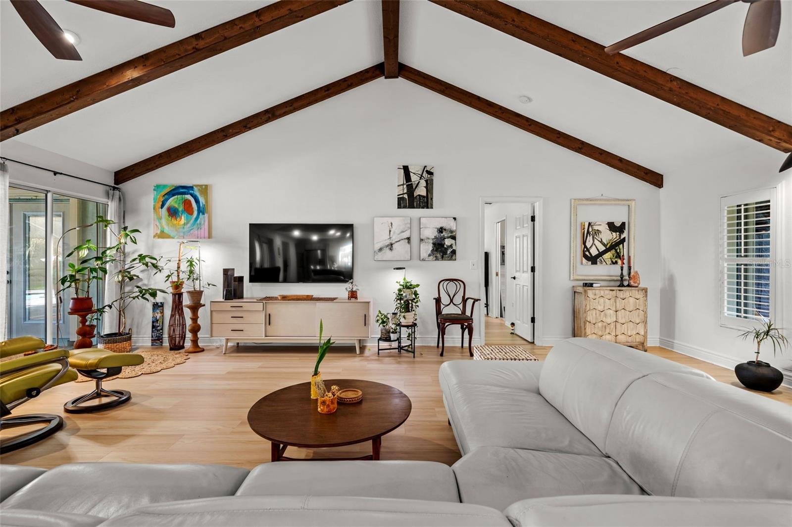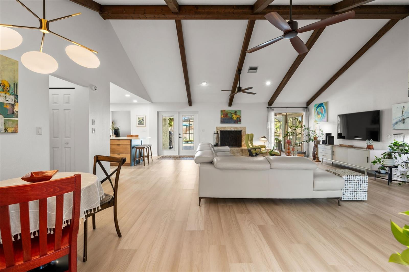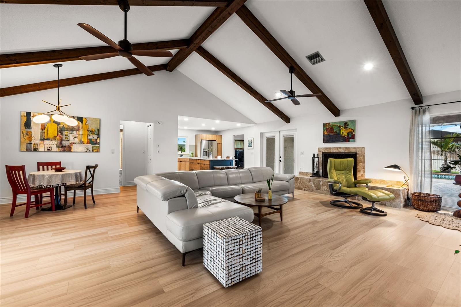 Discover your dream home in the highly sought-after Pinebrook South community, just minutes from Venice and Nokomis beaches, Venice Island, shopping, dining, I-75, and nature preserves. This beautifully updated 2-bedroom, 2-bath home with a bonus room, perfect for a home office or den, offers the ultimate Florida lifestyle! Step inside to an elegant open-concept living space with soaring cathedral ceilings and a wood-burning fireplace in pristine condition. The custom Craftsmaid kitchen is a chef's dream, boasting soft-close cabinetry, pull-out drawer organizers, a spacious island with Quartzite countertops offering additional seating, and all-new appliances. The adjacent walk-in pantry/laundry room features updated tile and a stylish coffee bar, making mornings effortless. Luxury flows throughout with new flooring, abundant recessed lighting, and upgraded hardware on every door. The spacious primary and guest bedrooms both offer walk-in closets, while the bonus room provides endless possibilities. Outdoor living is just as spectacular! The expansive pool lanai, extended in 2021, is partially covered featuring a beautiful yellow pine ceiling and a new pool cage, perfect for year-round relaxation. The resurfaced solar-heated pool with a new pump & filter in 2022 is your private retreat, while the front porch with a charming wood ceiling and new screens offers another inviting space to unwind. Additional key upgrades include a new roof, fresh interior and exterior paint, new landscaping, and a full privacy fence. Enjoy countless community amenities including a boat ramp, kayak and canoe launch and storage, fishing dock, sprawling community pool, and a spacious clubhouse featuring pool tables, games, a full kitchen and entertainment areas. Canal access leads you straight to Donna Bay, the Jetties, and the Gulf of Mexico! Bring your canoe or kayak and start exploring all of what Florida living has to offer. This home is a rare find. Schedule your private showing today!