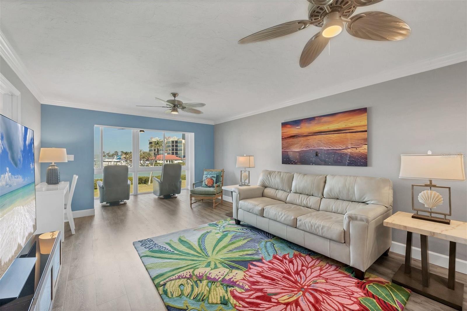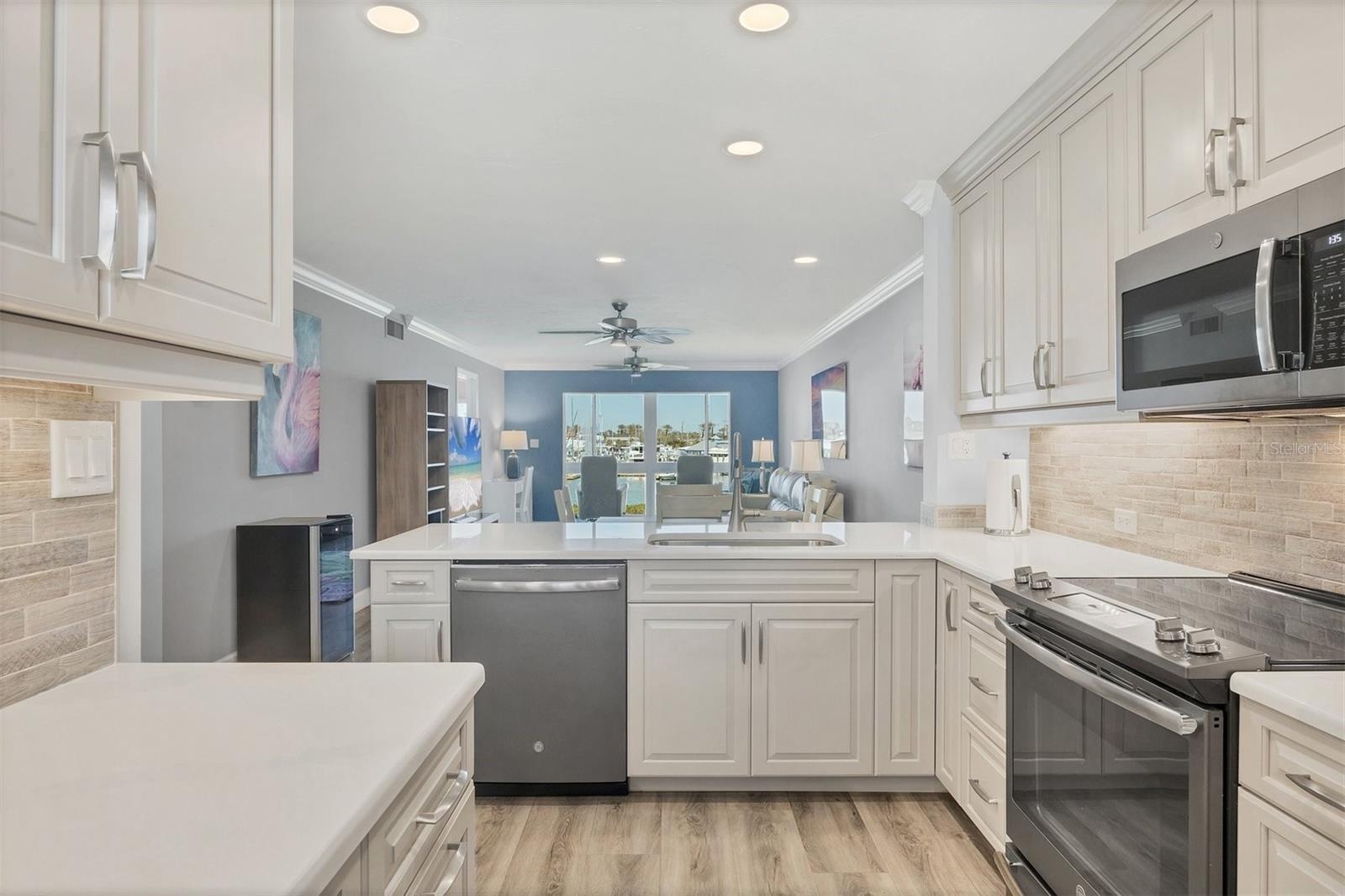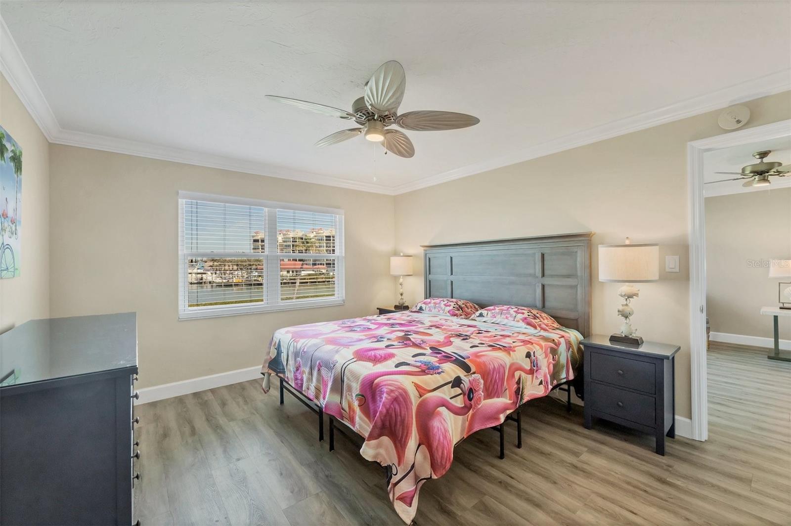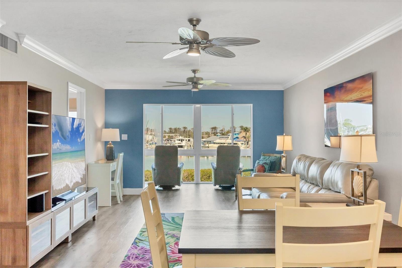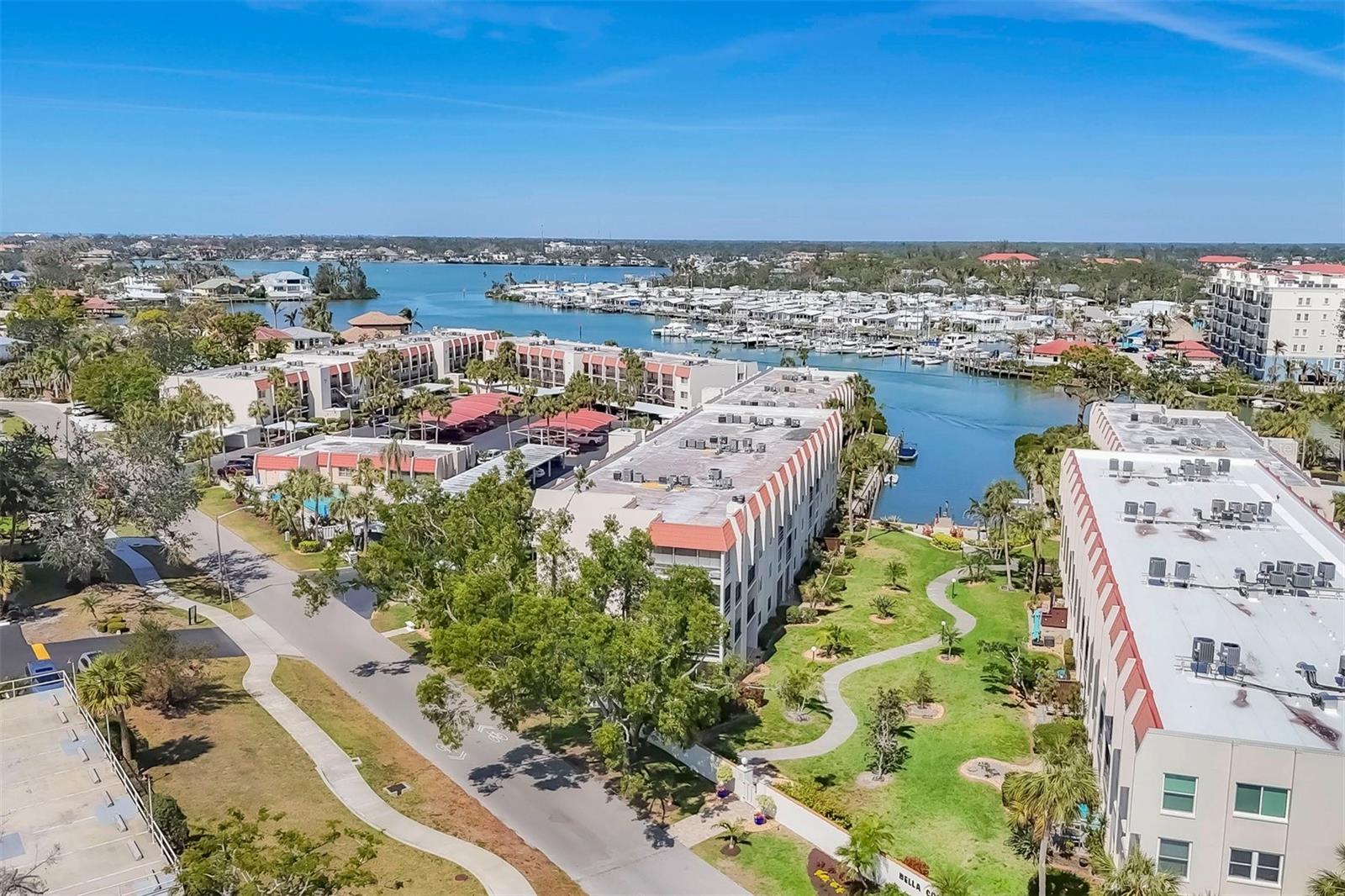 MAJOR PRICE IMPROVEMENT!!! Discover coastal living at its finest in this beautifully updated turnkey 2-bedroom, 2-bath home with unobstructed views of the Intercoastal and Roberts Bay. From the moment you step inside, you'll be captivated by the breathtaking scenery, and you might even spot dolphins from your lanai! This home is designed for peace of mind with hurricane windows, a hurricane impact entry door, and a storm door with a retractable screen. The beautiful kitchen features custom color soft-close wood cabinets, a lazy Susan for pots and pans, quartz countertops, and tile backsplash. The open floor plan is adorned with luxury vinyl floors, crown molding, wide baseboards, and window treatments. Wake up to stunning views from the primary bedroom, complete with a gorgeous en-suite bathroom that includes tile floors, quartz countertops, tiled showers, glass doors, and a multi-function showerhead. The second bedroom offers a convenient and beautiful en-suite bathroom for guests, also featuring quartz countertops, tiled showers, glass doors, and a multi-function showerhead. Enjoy the community amenities, including a pool, clubhouse, game room, fitness room, and library. Perfect Location! You're just steps away from Historical Downtown Venice, where you'll find an array of shops, restaurants, and theater. Venice Beach is less than 1.5 miles! Claim your slice of paradise and embrace the unparalleled Venice lifestyle today.