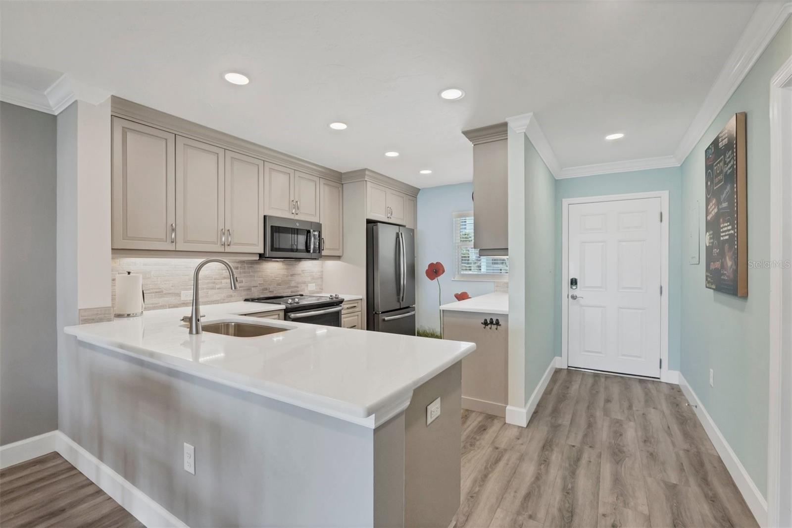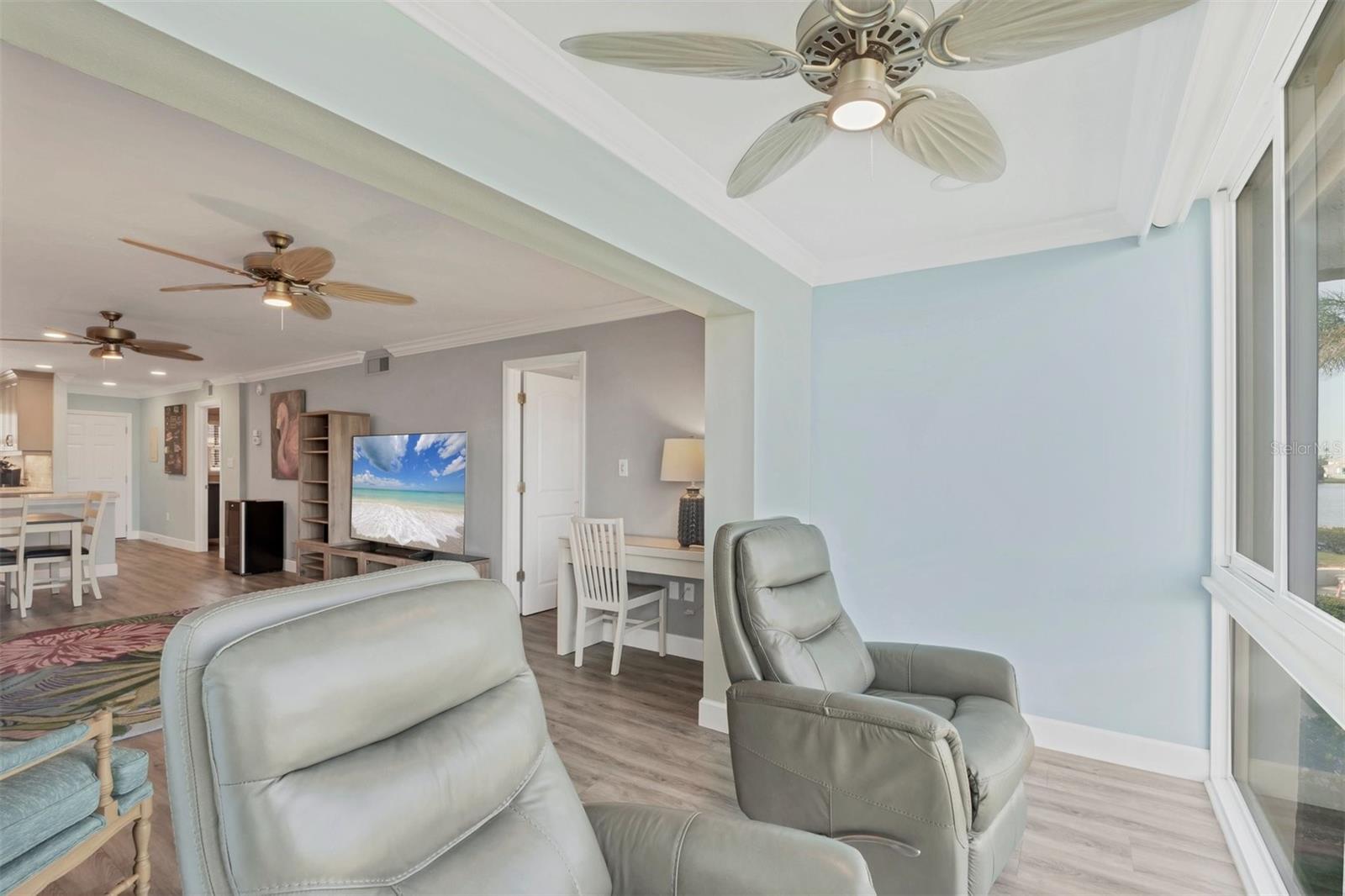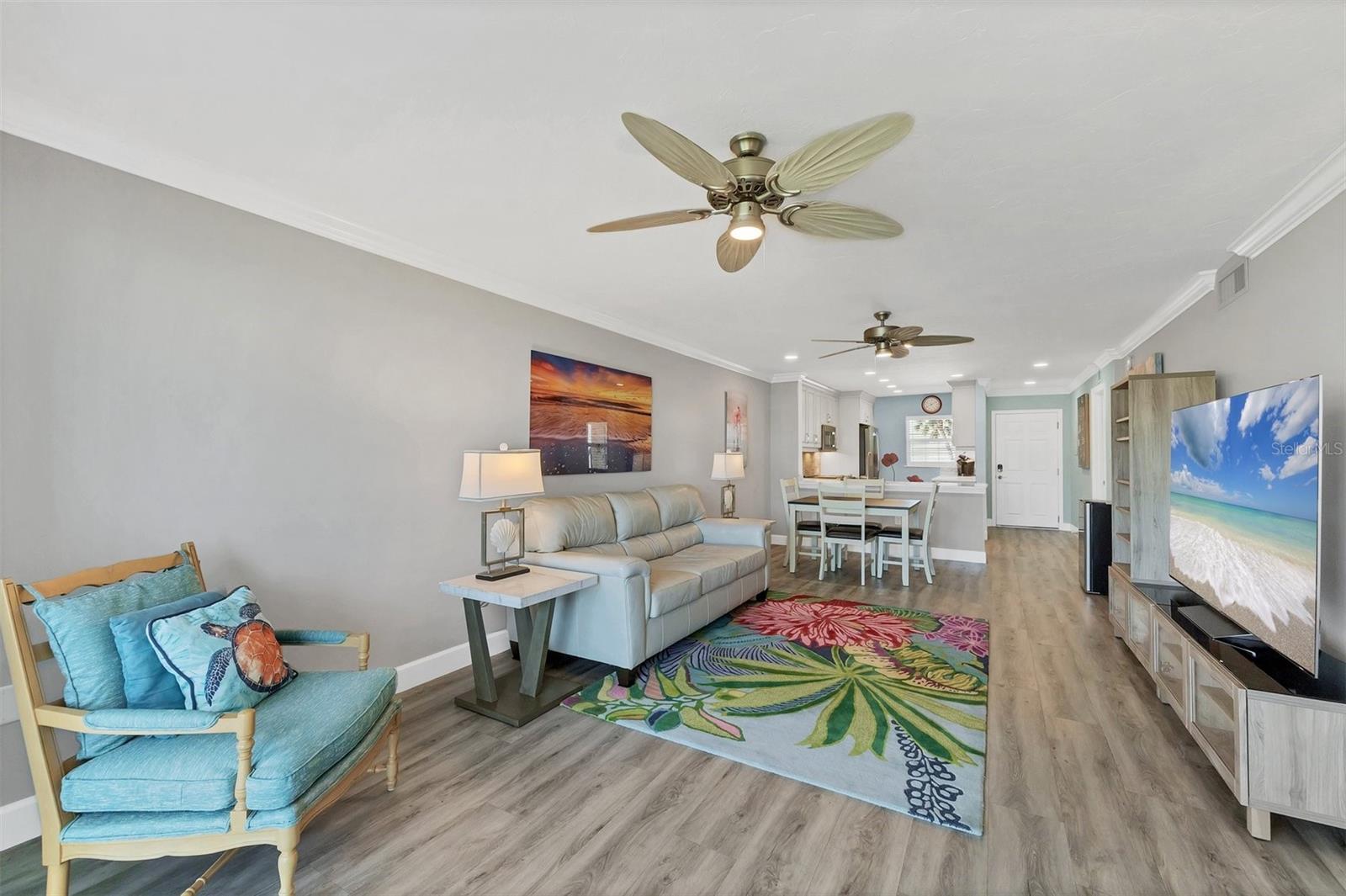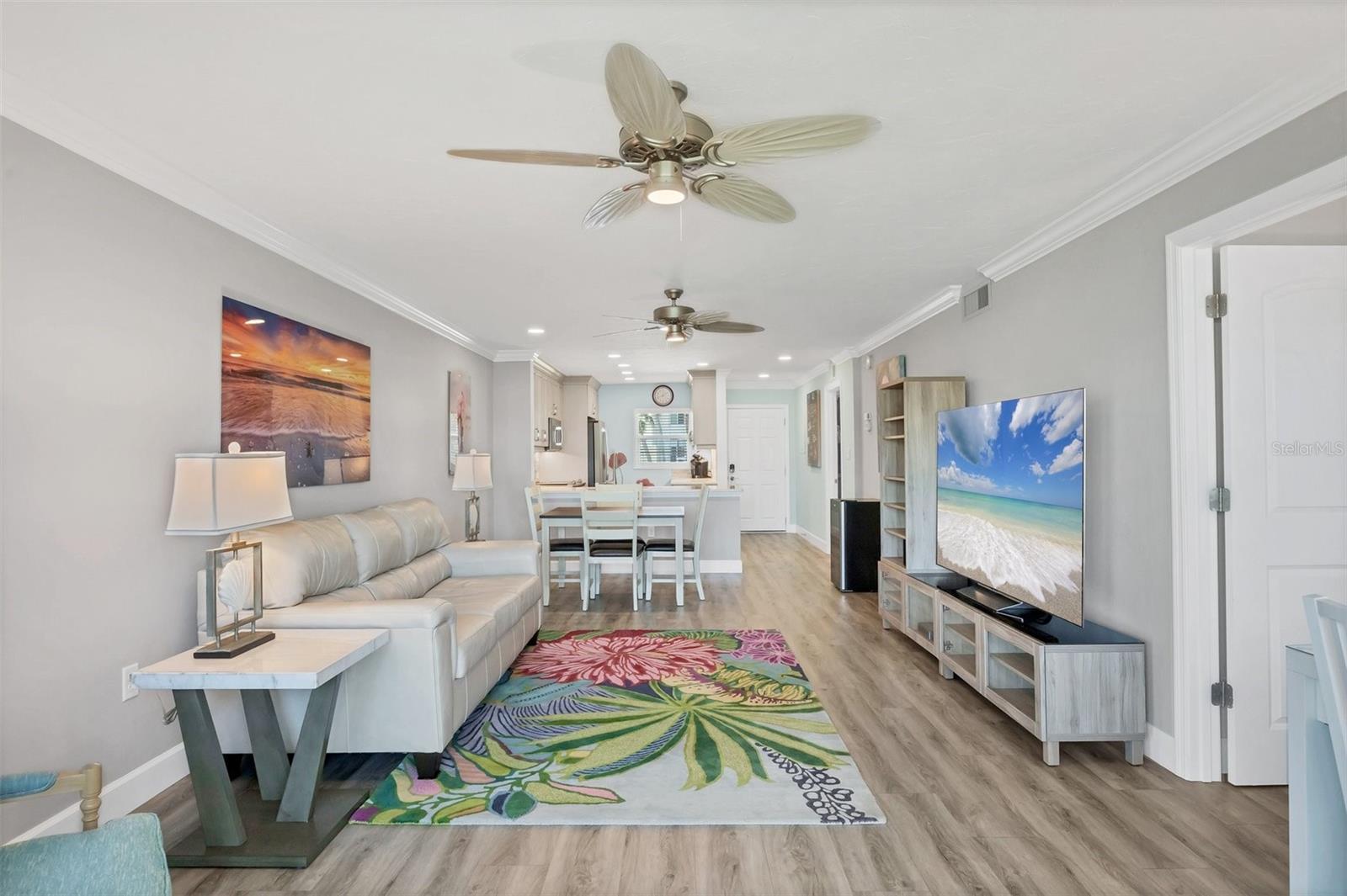 MAJOR PRICE IMPROVEMENT!!! Discover coastal living at its finest in this beautifully updated turnkey 2-bedroom, 2-bath home with unobstructed views of the Intercoastal and Roberts Bay. From the moment you step inside, you'll be captivated by the breathtaking scenery, and you might even spot dolphins from your lanai! This home is designed for peace of mind with hurricane windows, a hurricane impact entry door, and a storm door with a retractable screen. The beautiful kitchen features custom color soft-close wood cabinets, a lazy Susan for pots and pans, quartz countertops, and tile backsplash. The open floor plan is adorned with luxury vinyl floors, crown molding, wide baseboards, and window treatments. Wake up to stunning views from the primary bedroom, complete with a gorgeous en-suite bathroom that includes tile floors, quartz countertops, tiled showers, glass doors, and a multi-function showerhead. The second bedroom offers a convenient and beautiful en-suite bathroom for guests, also featuring quartz countertops, tiled showers, glass doors, and a multi-function showerhead. Enjoy the community amenities, including a pool, clubhouse, game room, fitness room, and library. Perfect Location! You're just steps away from Historical Downtown Venice, where you'll find an array of shops, restaurants, and theater. Venice Beach is less than 1.5 miles! Claim your slice of paradise and embrace the unparalleled Venice lifestyle today.