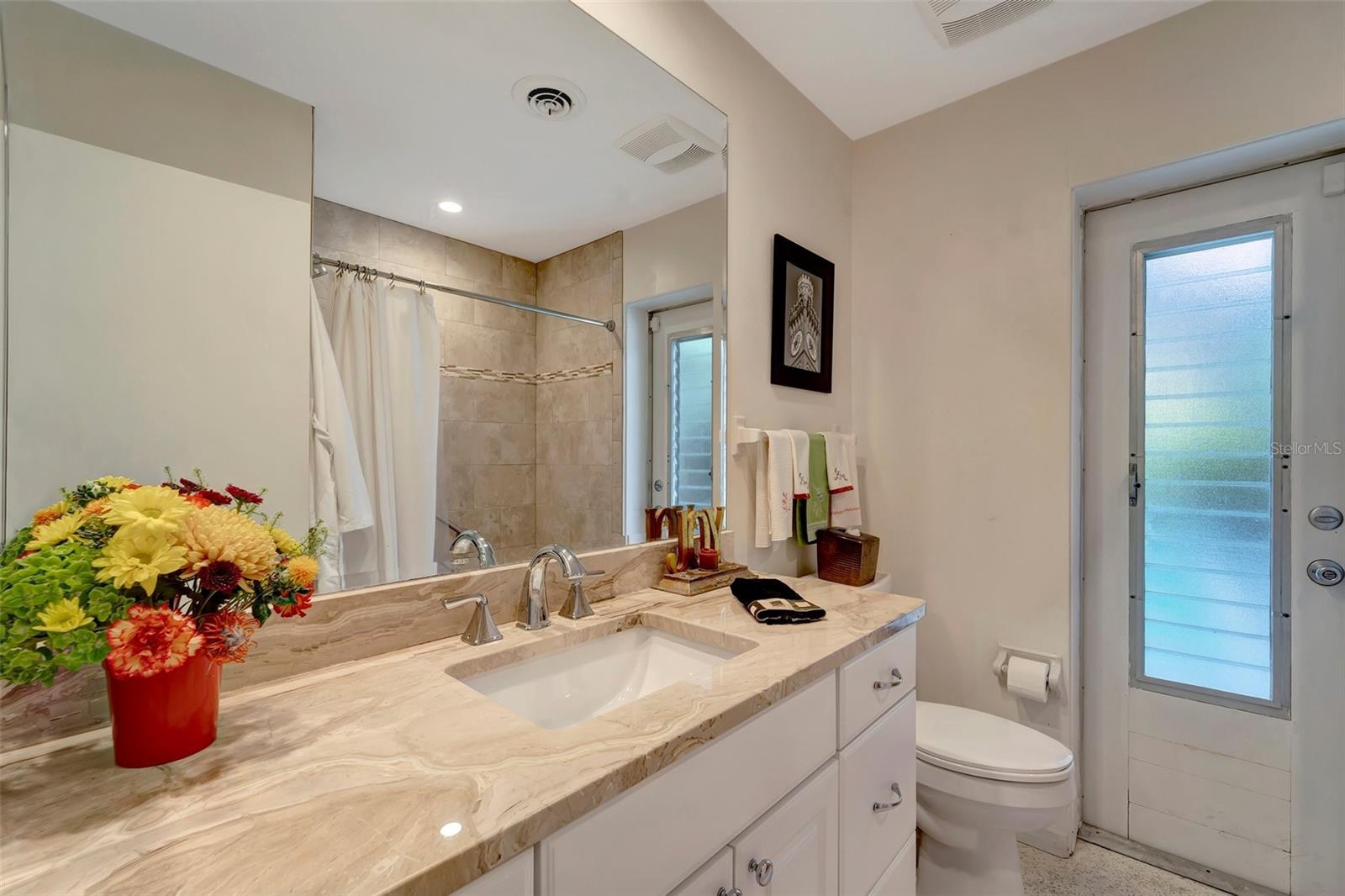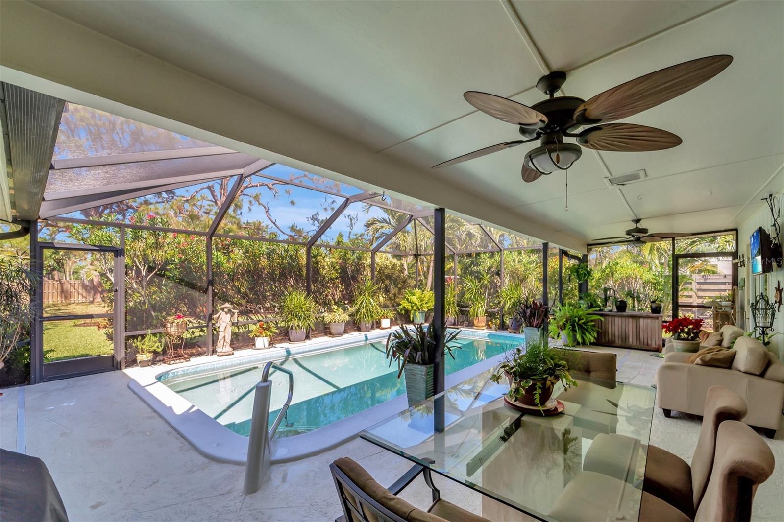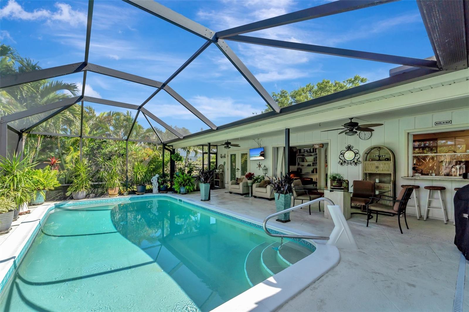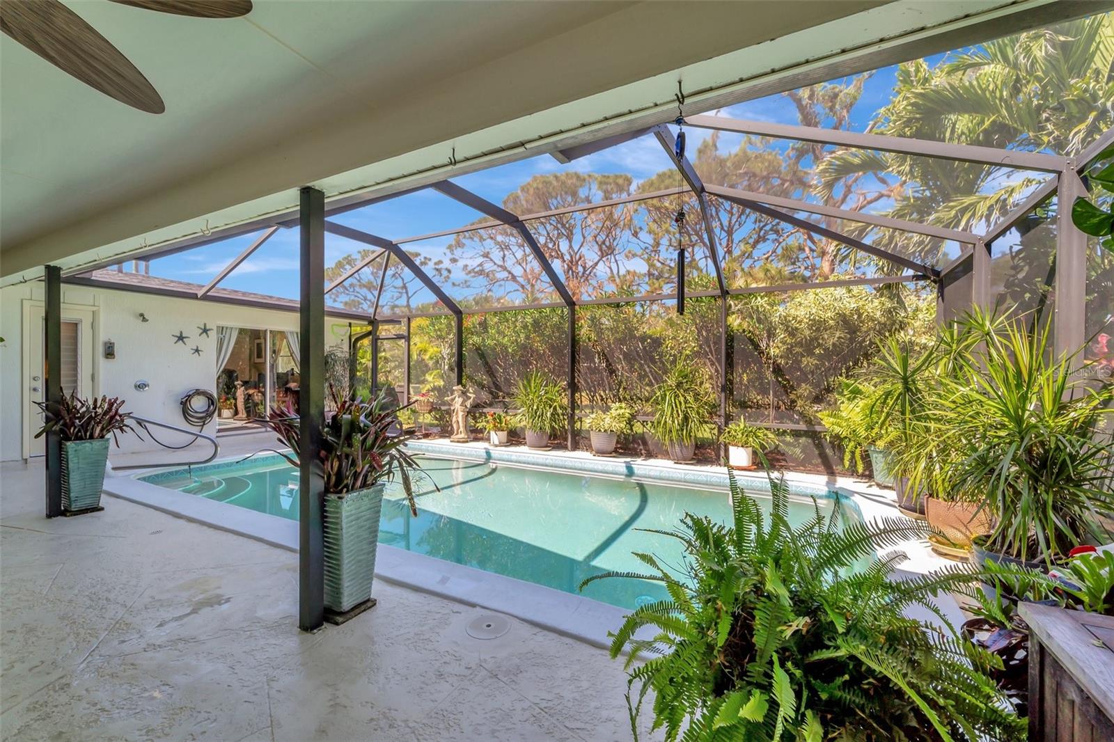 OVER $100,000 PRICE REDUCTION Live on beautiful Venice Island. This Pool Home has a rare 3-Car Garage! This 4-bed, 2-bath home is a blended design of Florida style with lush outdoor paradise. From the moment you arrive, the curb appeal is captivating, featuring meticulously manicured landscaping, a paver driveway, charming louvered window shutters, and elegant lighting. Vibrant plant beds filled with flowers and greenery enhance the garden-like ambiance, inviting you home. When Outdoor space and living is important this home checks all the boxes. Inside, the spacious living room with an arched passageway, plantation shutters, is a sleek mid-century modern feeling, with recessed lighting that highlights the natural brightness of the room. The heart of the home is the renovated kitchen, showcasing white shaker-style cabinets, Cambria quartz countertops, and high-end stainless steel appliances, including a Thermador 6-burner gas stove with range hood, GE refrigerator, dishwasher, & Silhouette dual-temperature wine cooler. Other features such as Shelf Genie shelving in both the cabinets & converted pantry closet make organization effortless. The kitchen flows seamlessly to the dining room, where extra cabinetry, countertop space, and a second wine fridge create the perfect spot for a beverage bar. The home’s desirable split floor plan offers privacy and comfort. The main bedroom is a retreat, featuring hurricane rated French doors that lead directly to the pool The en-suite bathroom has dual sinks, marble countertops, mirrored medicine cabinets, a walk-in shower with a built-in bench. The three additional bedrooms, are bright and airy, with built-in closets and plenty of natural light. One bedroom is currently used as office with sliding glass doors to the Pool. One bedrooms has been professionally fitted for an incredible closet but easily removed if desired. The 2nd bath has marble countertops, a walk-in shower, a linen closet, and serves as the pool bath. There is also an outdoor shower for the pool with both hot and cold settings. You will be drawn outside to the ultimate Florida lifestyle. The expansive pool area is surrounded by tropical landscaping, creating a private oasis for relaxation and entertainment. The pool deck and lanai offer plenty of room for seating, dining and relaxing.. The space includes window pass thru from the kitchen, covered lanai, an outdoor shower, and an updated pool cage. Dense hedges and 20-foot Areca trees provide natural privacy, making this backyard a true retreat. For garden enthusiasts, the backyard is a dream, featuring beautiful plant beds with native flowering plants, grasses, and trees. Discover the hidden sitting areas amongst the foliage for a true tranquil relaxation get away. Additional highlights of this home include a 12x10 Tuff Shed with windows and shelving, a recently added interior bonus room (in addition to the third garage bay), terrazzo flooring throughout, and with these recent updates: a NEW ROOF (Sept. 2024), 2022 HVAC, 2022 Kohler 20 kW generator with a 500-gallon LP tank, a 2021 well and pump, NEW pool pump and filter (2024), and updated PVC plumbing for both water and sewer lines. Located less than 1 mile from Venice Beach and Historic Downtown Venice, this home is in close proximity to shops, restaurants, theaters, parks, golf courses, the Legacy Trail, and more, offering the ideal Florida lifestyle. Don’t miss the opportunity to make this your dream home!