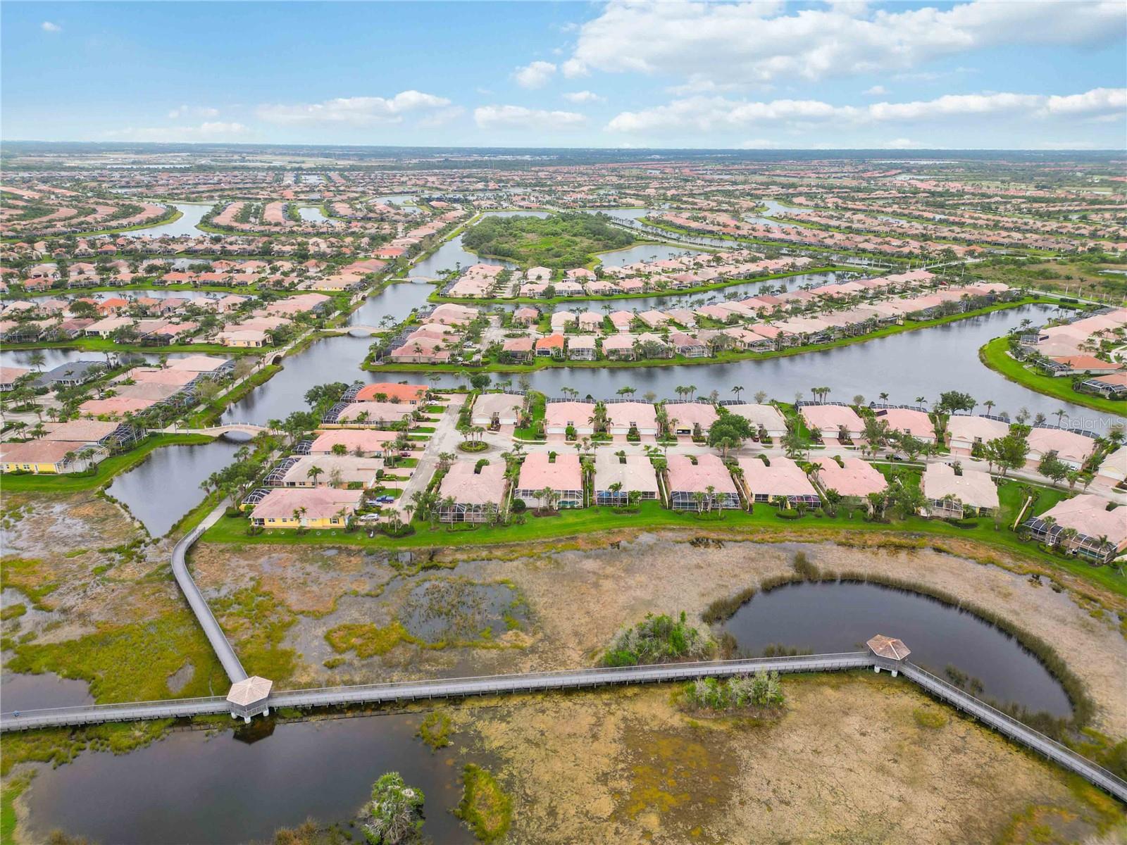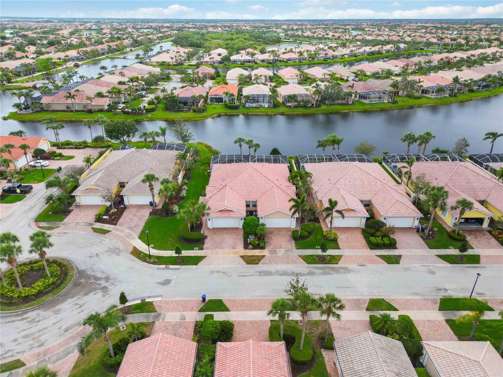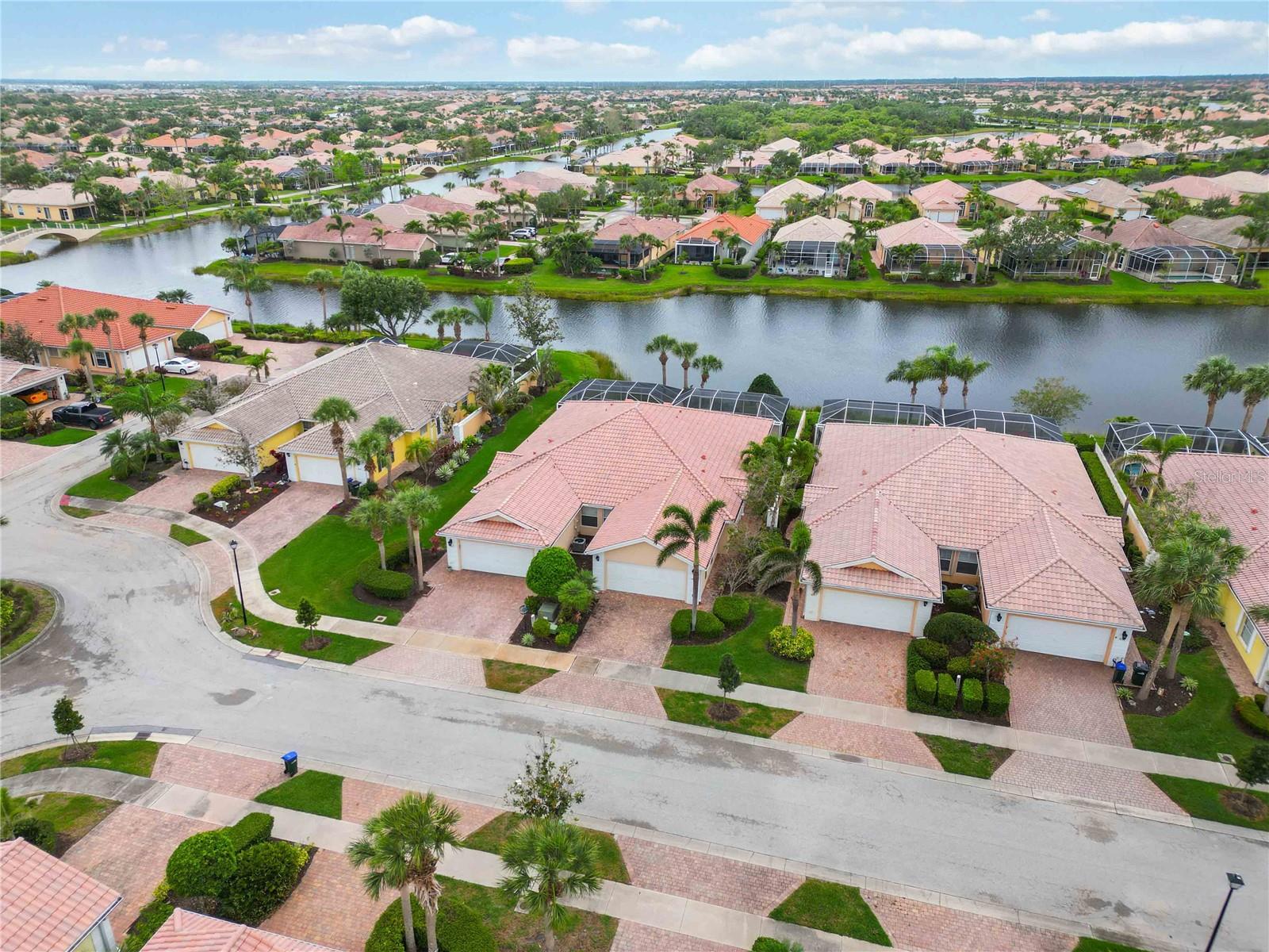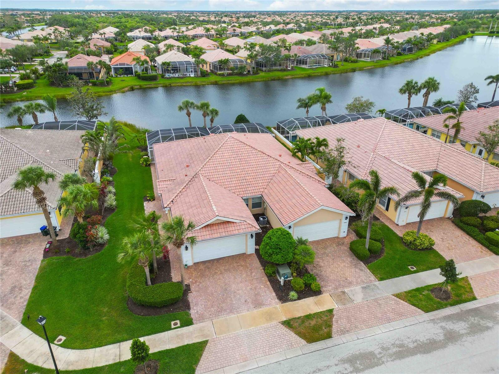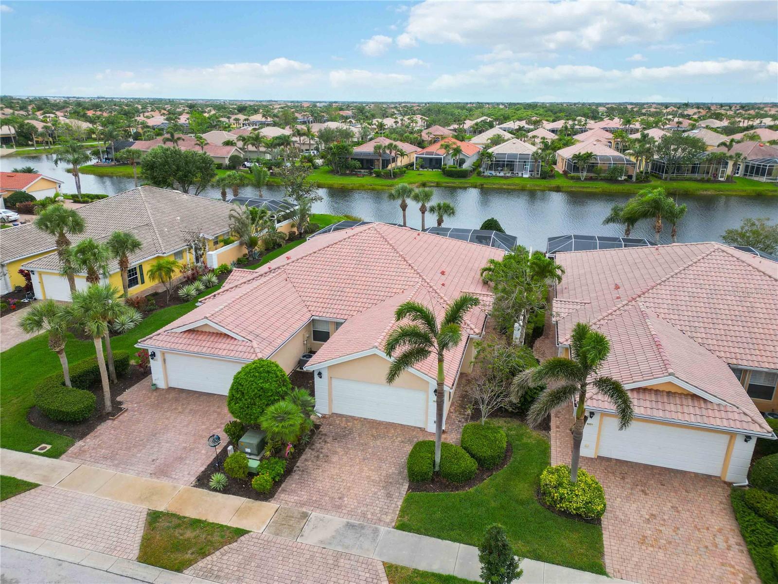 Waterfront in IslandWalk that comes completely TURNKEY, including the golf cart! Located on a quiet cut de sac. The eye catching curb appeal starts with the paver driveway leading to the private side entrance. The HUGE lanai has plenty of room for relaxing, entertaining and possibly adding a pool. This bright and airy villa has an open floor plan.There are two ensuite bedrooms. The primary suite is split from the guest suite for extra privacy. The primary has a gorgeous view of the water, a walk in closet, dual vanities and a walk in shower. The guest bedroom also has a walk in closet and the bathroom has a pocket door that separates the guest entrance from the rest of the home. The fresh, white kitchen has solid surface counters, a breakfast bar and plenty of cabinetry. The separate dining area overlooks the living room and the lanai and has brand new LVP flooring. Large living room w/vaulted ceiling. Main floor laundry has glass block window bringing in natural light, a utility sink, plenty of storage and room for folding. This home boasts a central vacuum system, making cleaning so much easier! Island Walk offers so many amenities for you to enjoy. There are 2 resort centers, including 3 community clubhouses. There are a total of 27 sport courts and 2 resort style pools with separate spas, in addition to a 3 lane lap pool. One of the newest amenities is the expansive community garden! There are 2 fitness studios with state of the art equipment and separate movement studios for group fitness classes. Don’t forget the dog parks and the library! Island Walk has a full time activities director who coordinates a full monthly calendar of events, year round. Enjoy the fire-pit areas, the outdoor pavilion and an event lawn for concerts, etc. The Venetian Style bridges throughout the community, in addition to the picturesque boardwalk, make this a unique and accessible place to call home. In addition to all of these amenities, your HOA fee covers cable, internet and lawn maintenance. Wellen Park is just minutes away. Experience the restaurants, shopping, concerts, events that downtown has to offer. Catch a baseball game at Cool Today Park or just visit their in stadium Tiki Bar. IslandWalk is only about 9 miles away from historic downtown Venice and Venice Beach. Your tropical lifestyle begins here!