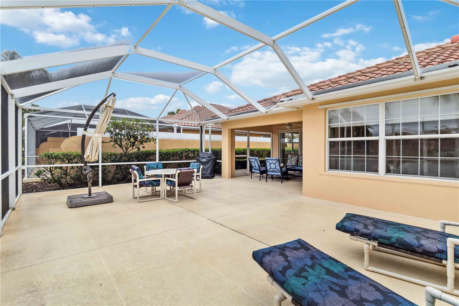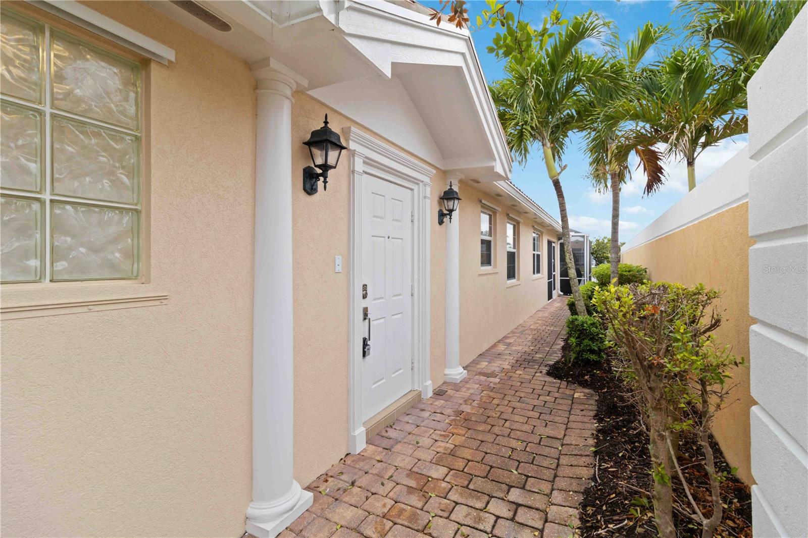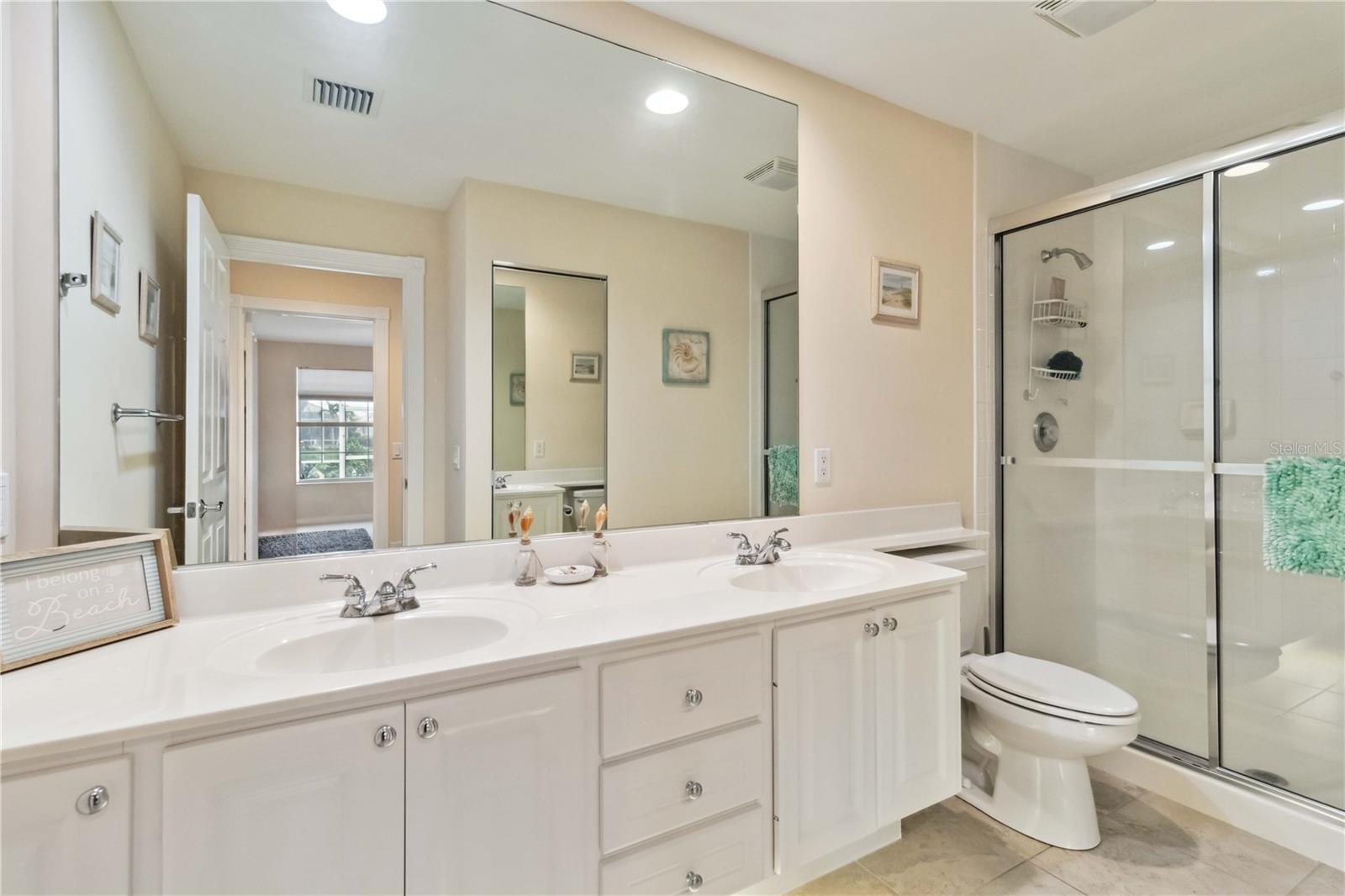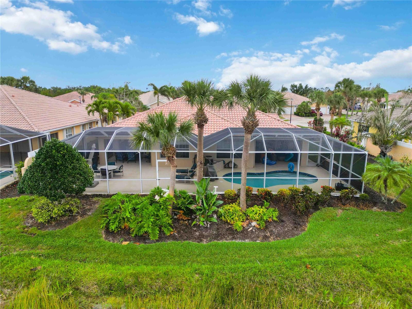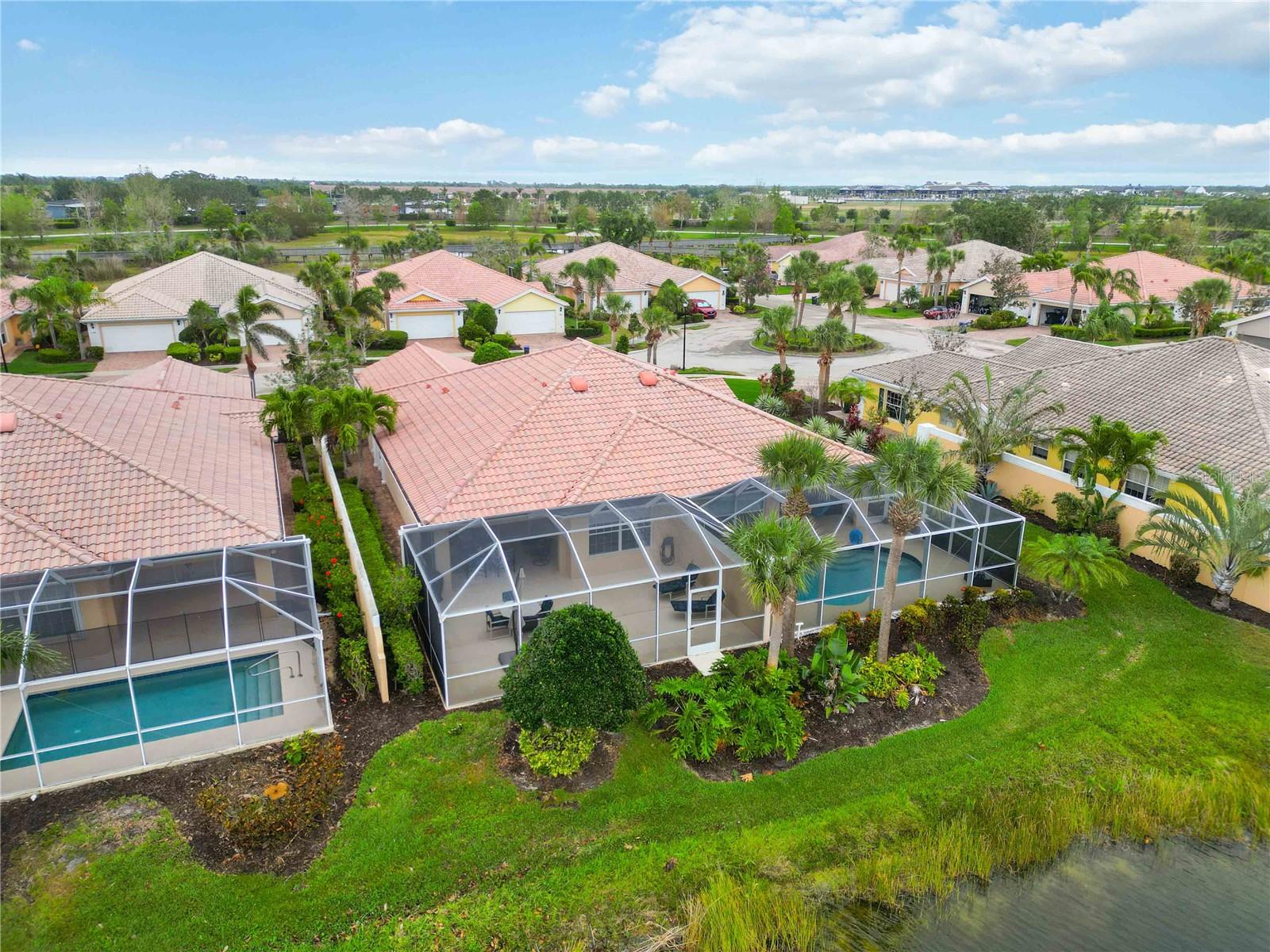 Waterfront in IslandWalk that comes completely TURNKEY, including the golf cart! Located on a quiet cut de sac. The eye catching curb appeal starts with the paver driveway leading to the private side entrance. The HUGE lanai has plenty of room for relaxing, entertaining and possibly adding a pool. This bright and airy villa has an open floor plan.There are two ensuite bedrooms. The primary suite is split from the guest suite for extra privacy. The primary has a gorgeous view of the water, a walk in closet, dual vanities and a walk in shower. The guest bedroom also has a walk in closet and the bathroom has a pocket door that separates the guest entrance from the rest of the home. The fresh, white kitchen has solid surface counters, a breakfast bar and plenty of cabinetry. The separate dining area overlooks the living room and the lanai and has brand new LVP flooring. Large living room w/vaulted ceiling. Main floor laundry has glass block window bringing in natural light, a utility sink, plenty of storage and room for folding. This home boasts a central vacuum system, making cleaning so much easier! Island Walk offers so many amenities for you to enjoy. There are 2 resort centers, including 3 community clubhouses. There are a total of 27 sport courts and 2 resort style pools with separate spas, in addition to a 3 lane lap pool. One of the newest amenities is the expansive community garden! There are 2 fitness studios with state of the art equipment and separate movement studios for group fitness classes. Don’t forget the dog parks and the library! Island Walk has a full time activities director who coordinates a full monthly calendar of events, year round. Enjoy the fire-pit areas, the outdoor pavilion and an event lawn for concerts, etc. The Venetian Style bridges throughout the community, in addition to the picturesque boardwalk, make this a unique and accessible place to call home. In addition to all of these amenities, your HOA fee covers cable, internet and lawn maintenance. Wellen Park is just minutes away. Experience the restaurants, shopping, concerts, events that downtown has to offer. Catch a baseball game at Cool Today Park or just visit their in stadium Tiki Bar. IslandWalk is only about 9 miles away from historic downtown Venice and Venice Beach. Your tropical lifestyle begins here!