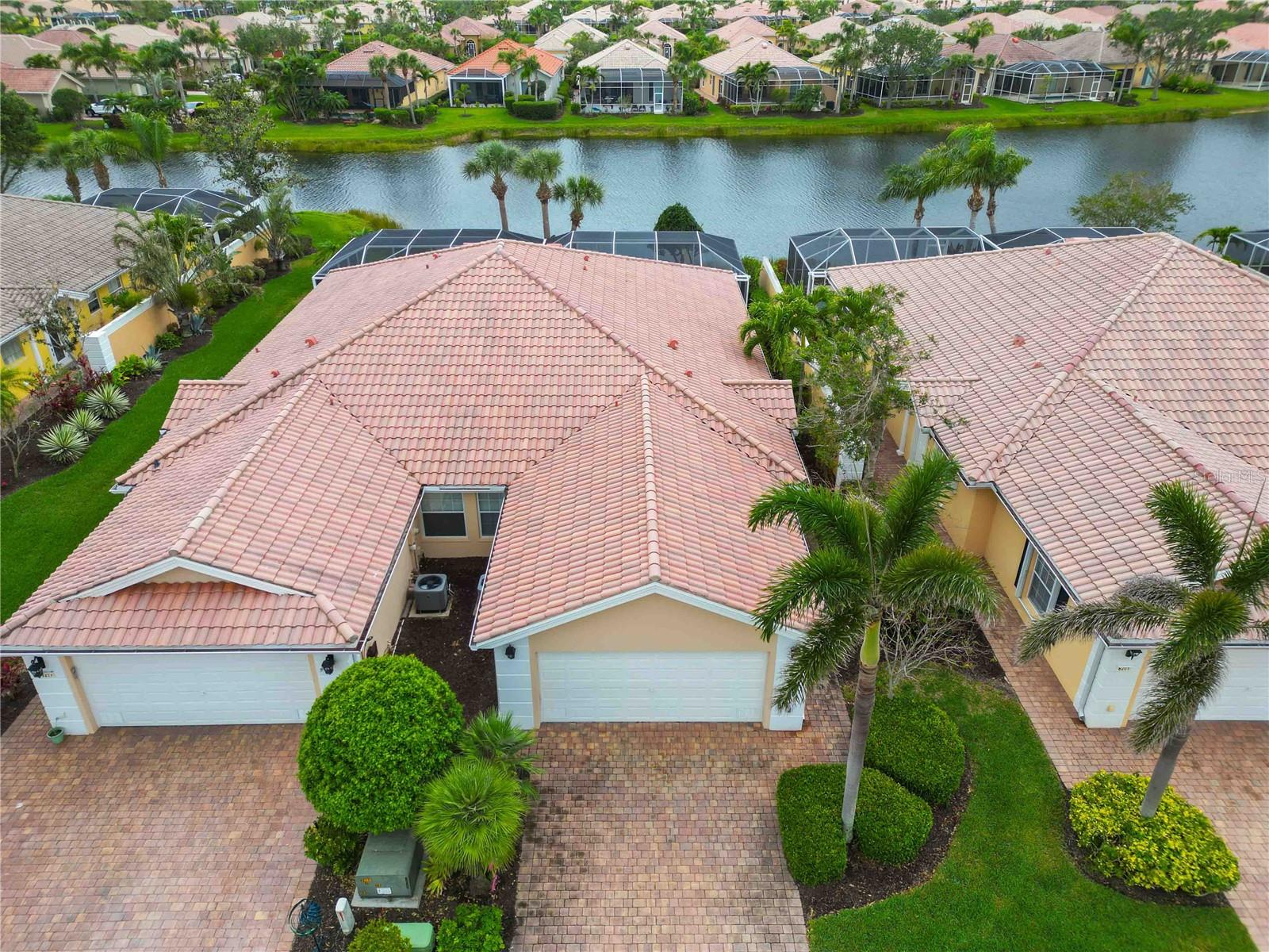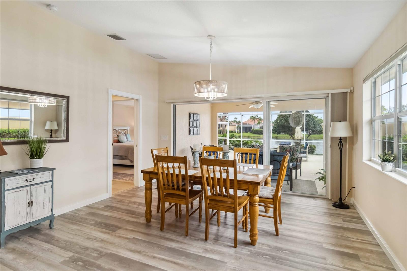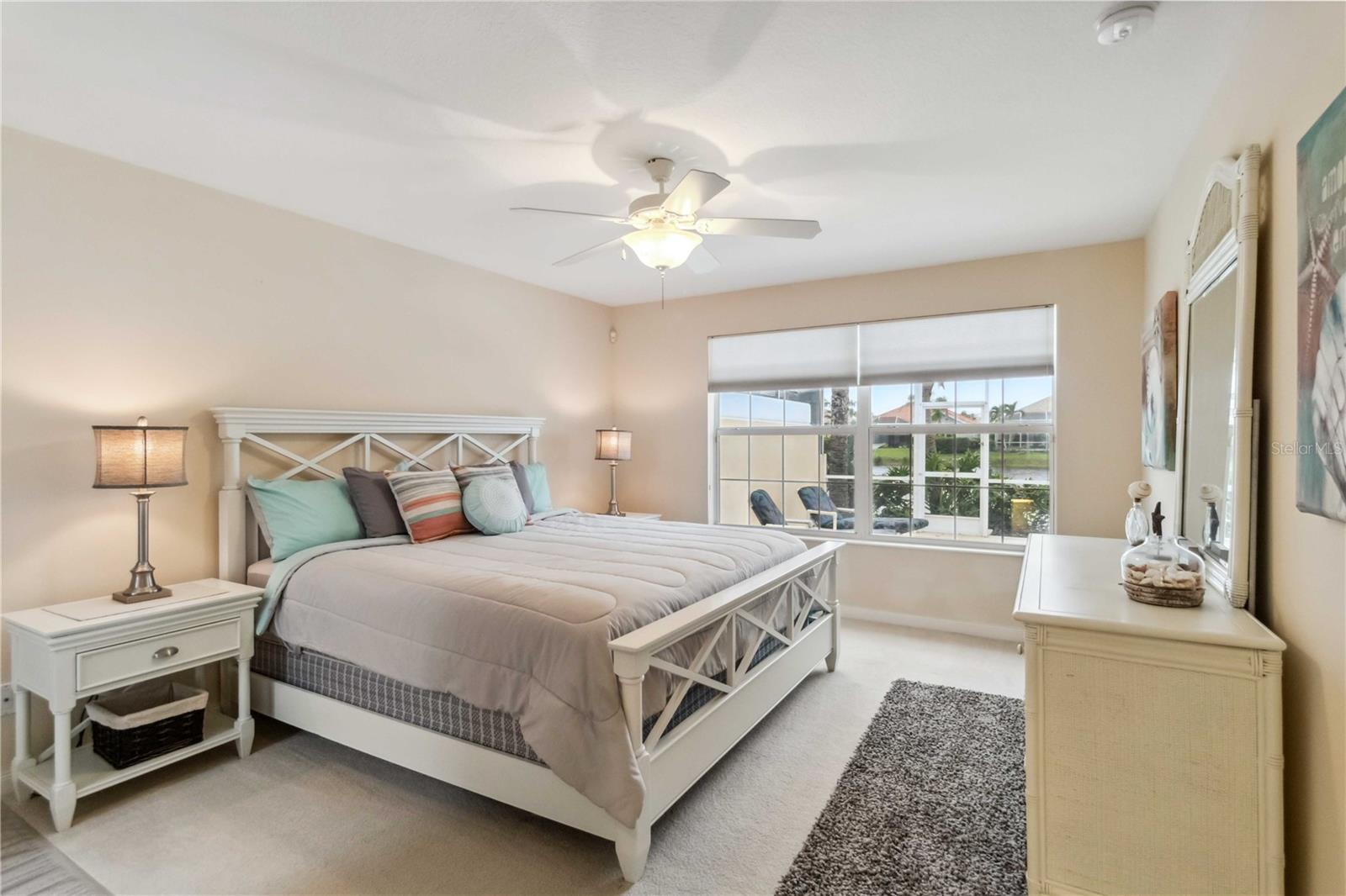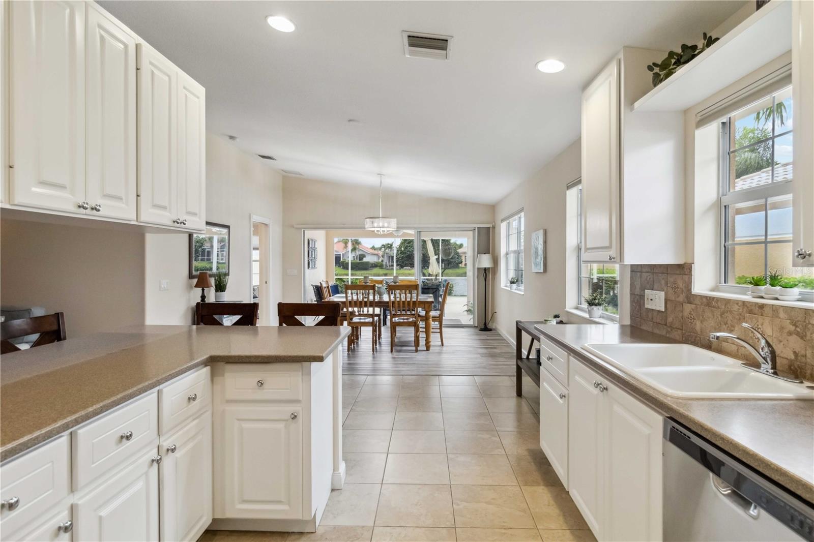 Waterfront in IslandWalk that comes completely TURNKEY, including the golf cart! Located on a quiet cut de sac. The eye catching curb appeal starts with the paver driveway leading to the private side entrance. The HUGE lanai has plenty of room for relaxing, entertaining and possibly adding a pool. This bright and airy villa has an open floor plan.There are two ensuite bedrooms. The primary suite is split from the guest suite for extra privacy. The primary has a gorgeous view of the water, a walk in closet, dual vanities and a walk in shower. The guest bedroom also has a walk in closet and the bathroom has a pocket door that separates the guest entrance from the rest of the home. The fresh, white kitchen has solid surface counters, a breakfast bar and plenty of cabinetry. The separate dining area overlooks the living room and the lanai and has brand new LVP flooring. Large living room w/vaulted ceiling. Main floor laundry has glass block window bringing in natural light, a utility sink, plenty of storage and room for folding. This home boasts a central vacuum system, making cleaning so much easier! Island Walk offers so many amenities for you to enjoy. There are 2 resort centers, including 3 community clubhouses. There are a total of 27 sport courts and 2 resort style pools with separate spas, in addition to a 3 lane lap pool. One of the newest amenities is the expansive community garden! There are 2 fitness studios with state of the art equipment and separate movement studios for group fitness classes. Don’t forget the dog parks and the library! Island Walk has a full time activities director who coordinates a full monthly calendar of events, year round. Enjoy the fire-pit areas, the outdoor pavilion and an event lawn for concerts, etc. The Venetian Style bridges throughout the community, in addition to the picturesque boardwalk, make this a unique and accessible place to call home. In addition to all of these amenities, your HOA fee covers cable, internet and lawn maintenance. Wellen Park is just minutes away. Experience the restaurants, shopping, concerts, events that downtown has to offer. Catch a baseball game at Cool Today Park or just visit their in stadium Tiki Bar. IslandWalk is only about 9 miles away from historic downtown Venice and Venice Beach. Your tropical lifestyle begins here!