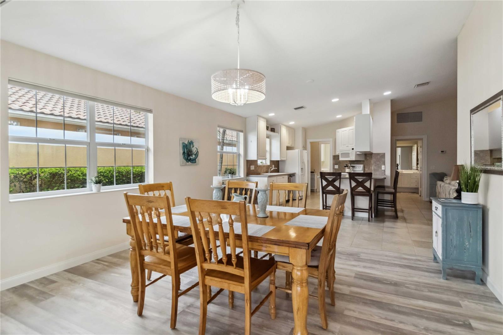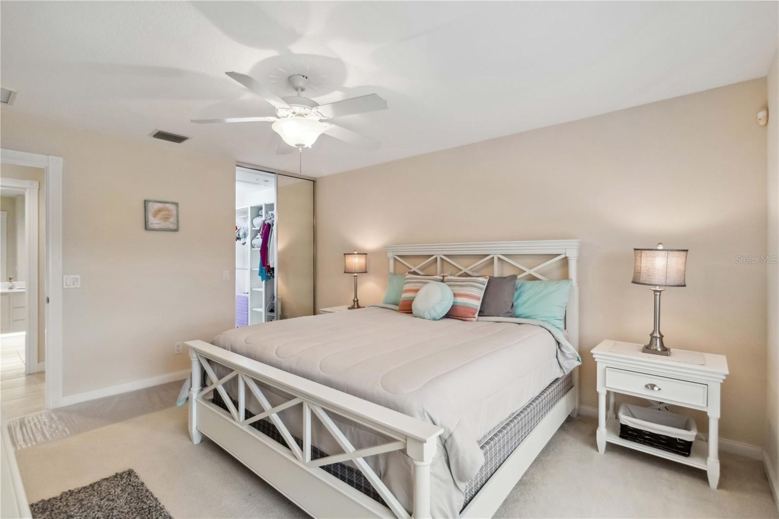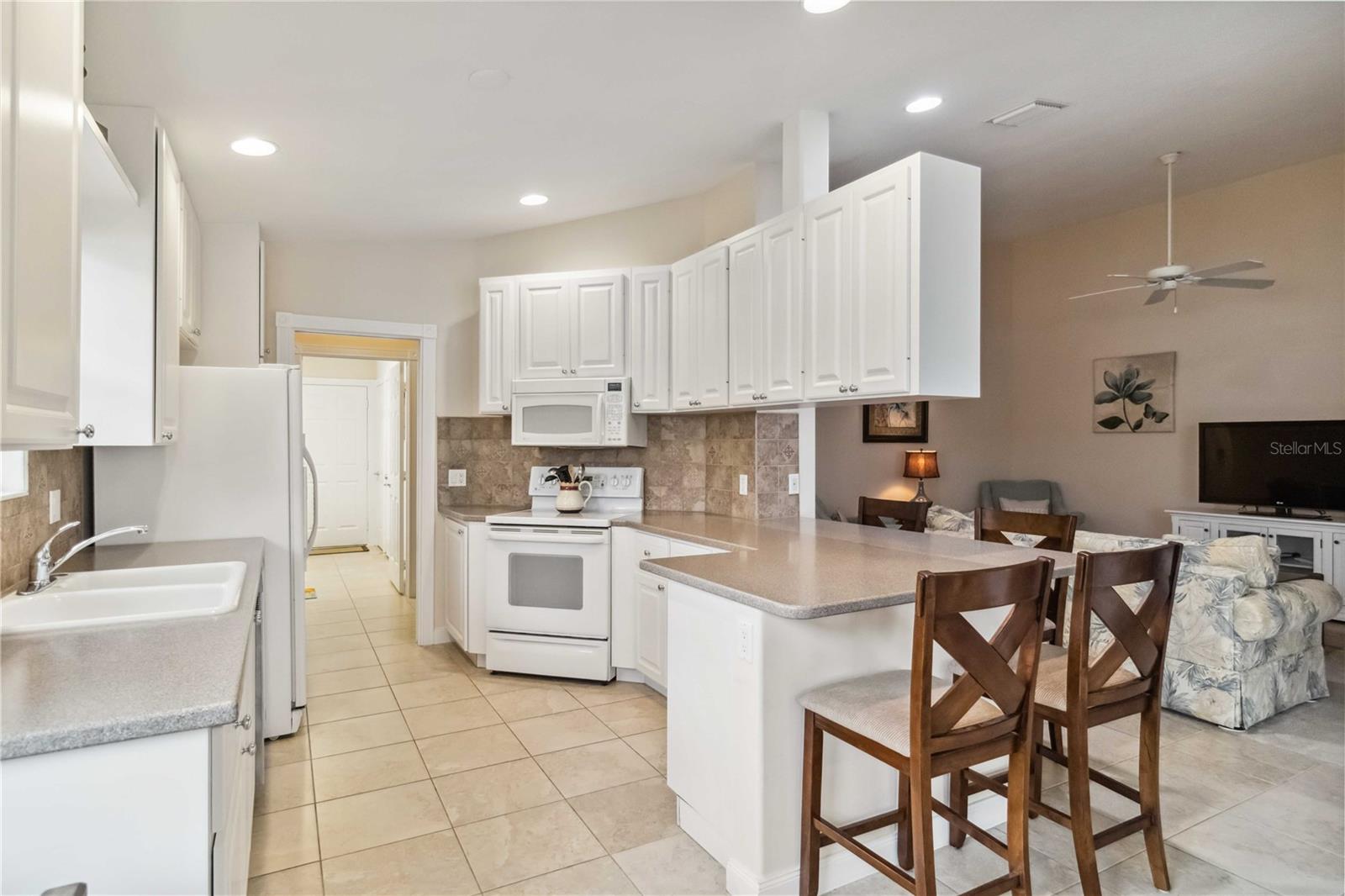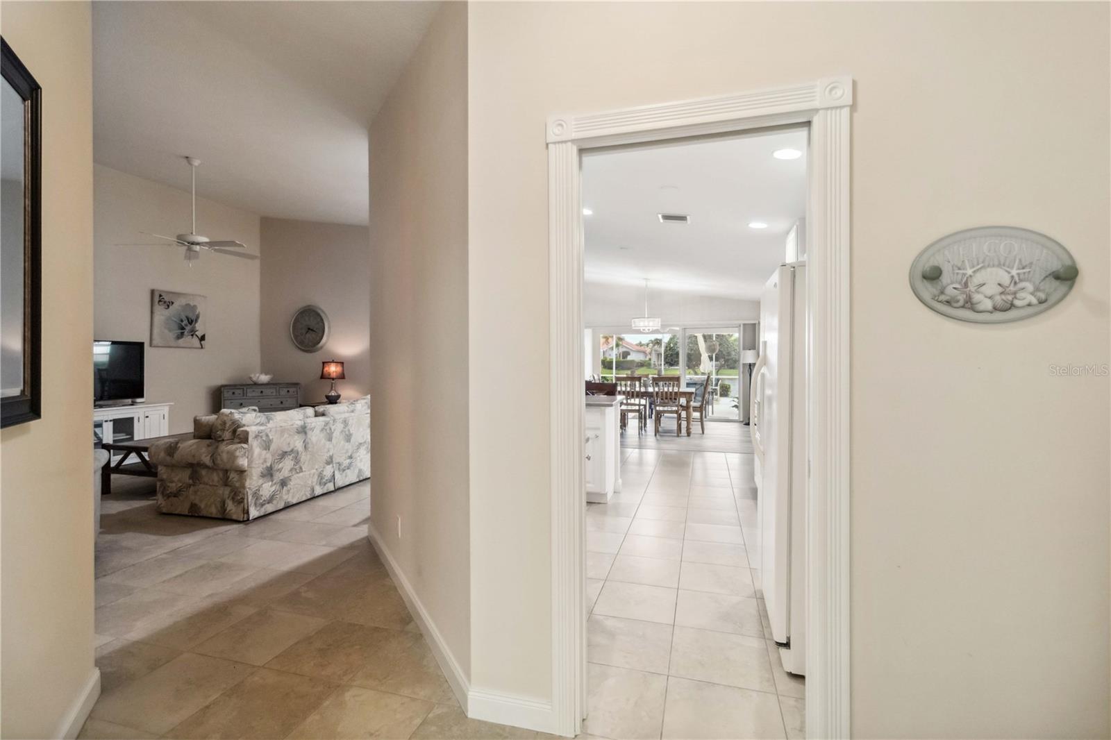 Waterfront in IslandWalk that comes completely TURNKEY, including the golf cart! Located on a quiet cut de sac. The eye catching curb appeal starts with the paver driveway leading to the private side entrance. The HUGE lanai has plenty of room for relaxing, entertaining and possibly adding a pool. This bright and airy villa has an open floor plan.There are two ensuite bedrooms. The primary suite is split from the guest suite for extra privacy. The primary has a gorgeous view of the water, a walk in closet, dual vanities and a walk in shower. The guest bedroom also has a walk in closet and the bathroom has a pocket door that separates the guest entrance from the rest of the home. The fresh, white kitchen has solid surface counters, a breakfast bar and plenty of cabinetry. The separate dining area overlooks the living room and the lanai and has brand new LVP flooring. Large living room w/vaulted ceiling. Main floor laundry has glass block window bringing in natural light, a utility sink, plenty of storage and room for folding. This home boasts a central vacuum system, making cleaning so much easier! Island Walk offers so many amenities for you to enjoy. There are 2 resort centers, including 3 community clubhouses. There are a total of 27 sport courts and 2 resort style pools with separate spas, in addition to a 3 lane lap pool. One of the newest amenities is the expansive community garden! There are 2 fitness studios with state of the art equipment and separate movement studios for group fitness classes. Don’t forget the dog parks and the library! Island Walk has a full time activities director who coordinates a full monthly calendar of events, year round. Enjoy the fire-pit areas, the outdoor pavilion and an event lawn for concerts, etc. The Venetian Style bridges throughout the community, in addition to the picturesque boardwalk, make this a unique and accessible place to call home. In addition to all of these amenities, your HOA fee covers cable, internet and lawn maintenance. Wellen Park is just minutes away. Experience the restaurants, shopping, concerts, events that downtown has to offer. Catch a baseball game at Cool Today Park or just visit their in stadium Tiki Bar. IslandWalk is only about 9 miles away from historic downtown Venice and Venice Beach. Your tropical lifestyle begins here!