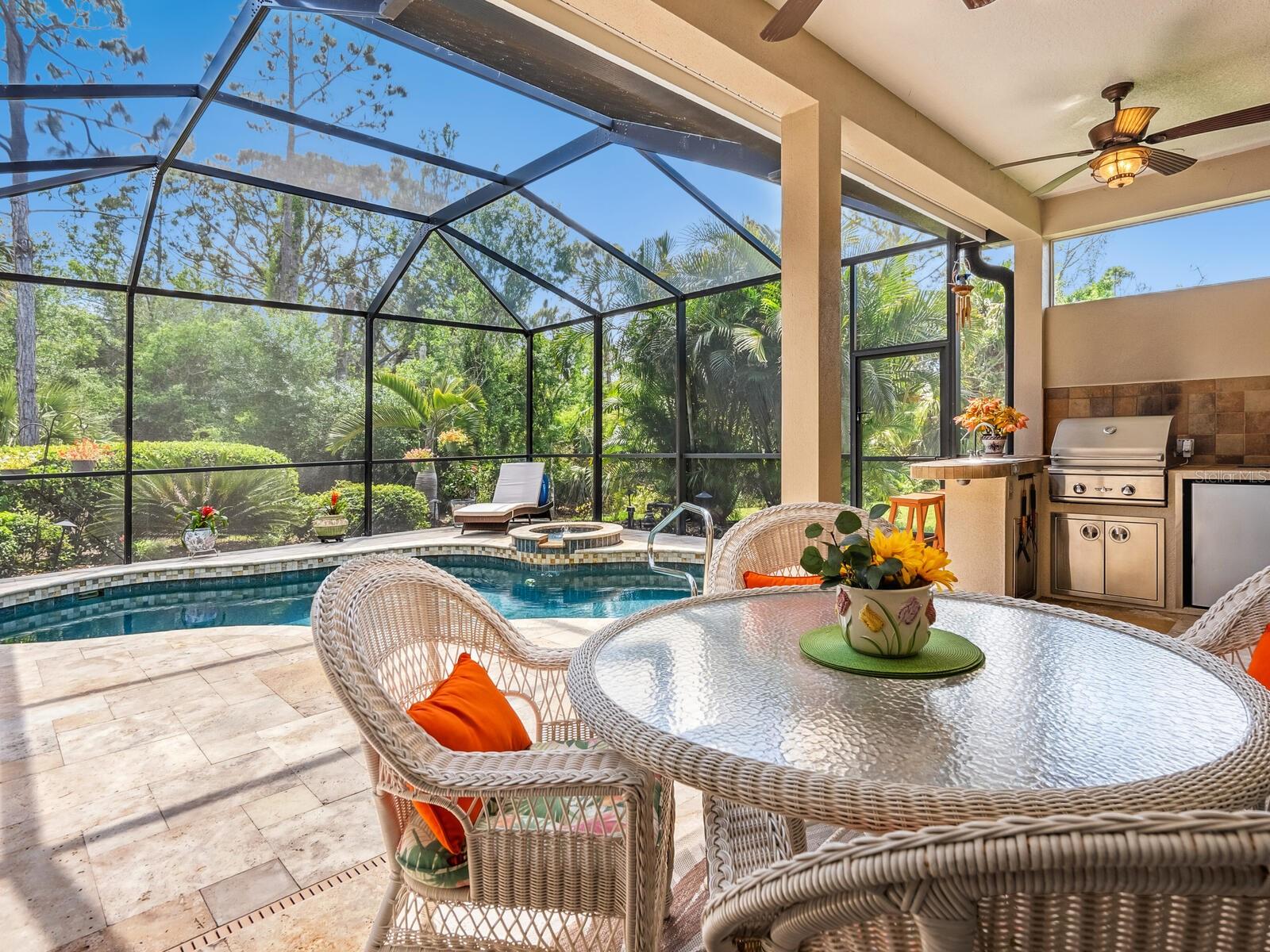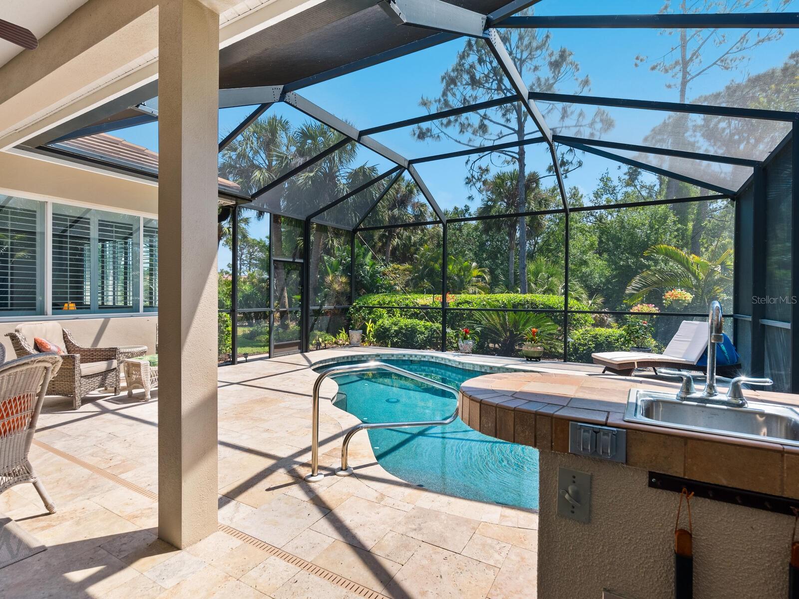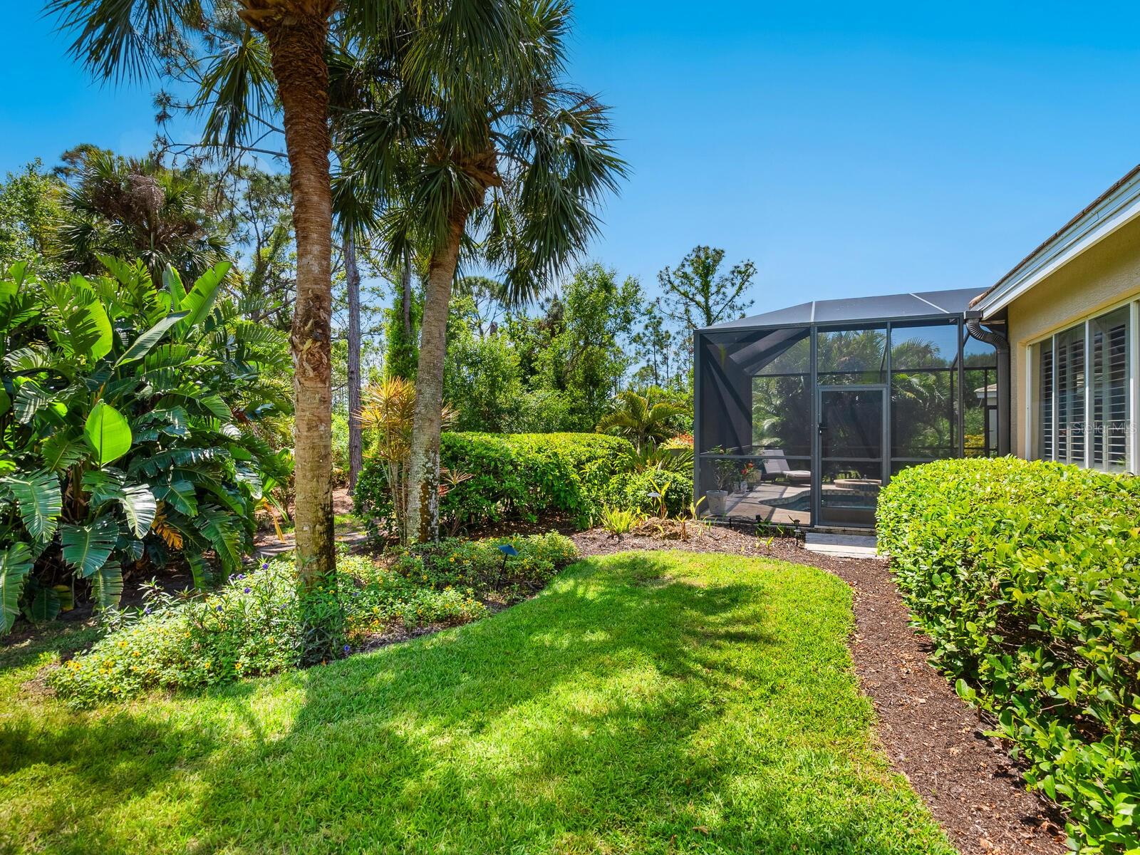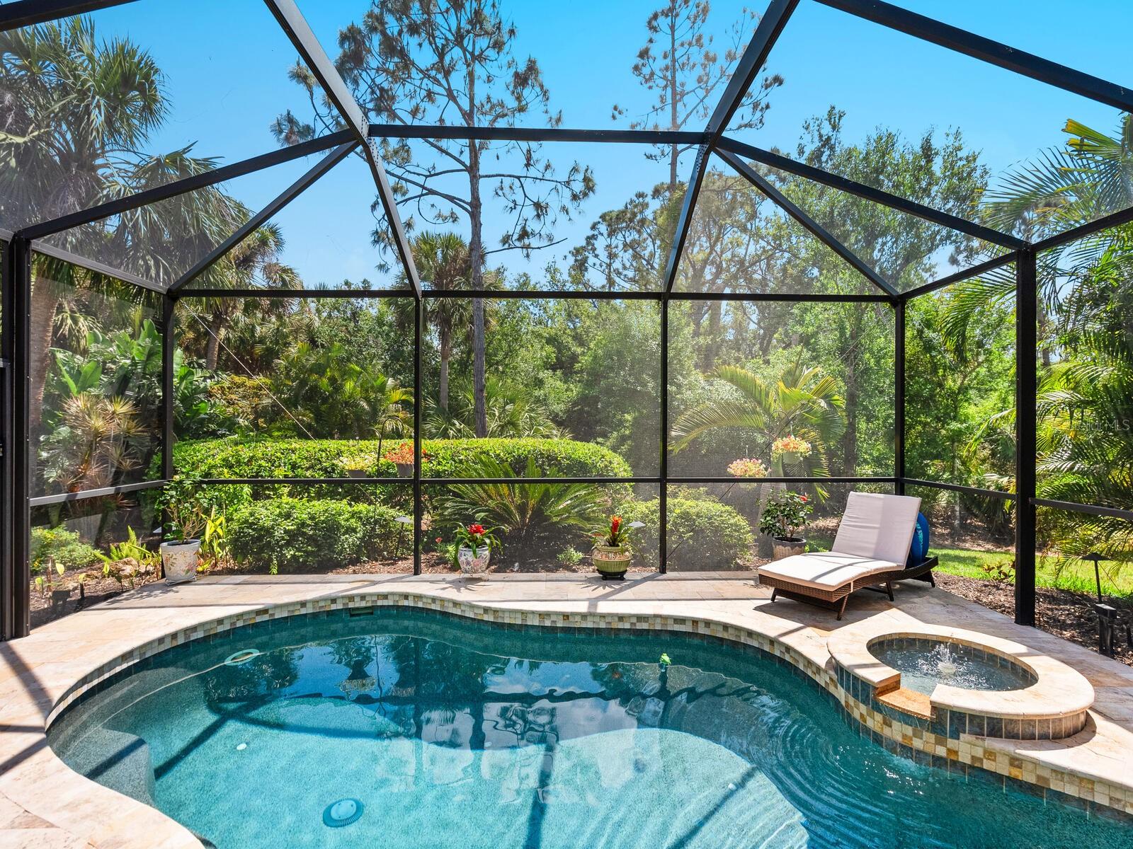 What a Sensational Pool area!! The large deck area with upscale travertine features a backdrop of gorgeous, mature trees providing privacy and beauty. A summer kitchen with bar, grill, sink, and refrigerator make alfresco dining a delight every day of the year. The generous sized pool offers a custom-in-floor cleaning system for easy maintenance. This 3 bedroom + den home is like new! Plus…it had a new roof in 2020! The spacious primary suite, with sliding glass doors, opens to the luxurious lanai and private back yard. The updated ensuite bath is stunning and features a generous walk-in shower. The kitchen has quality appliances, including an induction range and sleek microwave, with the island providing a workspace and a sit-down bar. The clean, well-organized garage has exceptional storage and work area. This home is positioned on a cul-de-sac, assuring privacy and quiet. The paver driveway and entry walk add warmth and a statement of quality as you approach this lovely home. Of special note is the wide, 114 feet rear lot dimension, creating a private, sweeping view of nature. The neighborhood provides yard maintenance and has a community pool and spa. In the gated Venice Golf and Country Club you are minutes from historic downtown Venice, beaches, I- 75, Wellen Park, dining, and shopping. The Club is private and member owned and offers a myriad of social, athletic, learning, and dining events. It has proudly earned an A+ financial rating. The clubhouse was renovated and expanded, and the wellness center is state-of-the-art. Membership is required. Please see attachments for details.