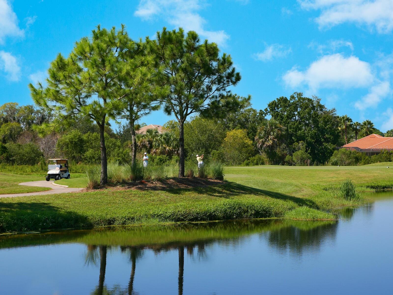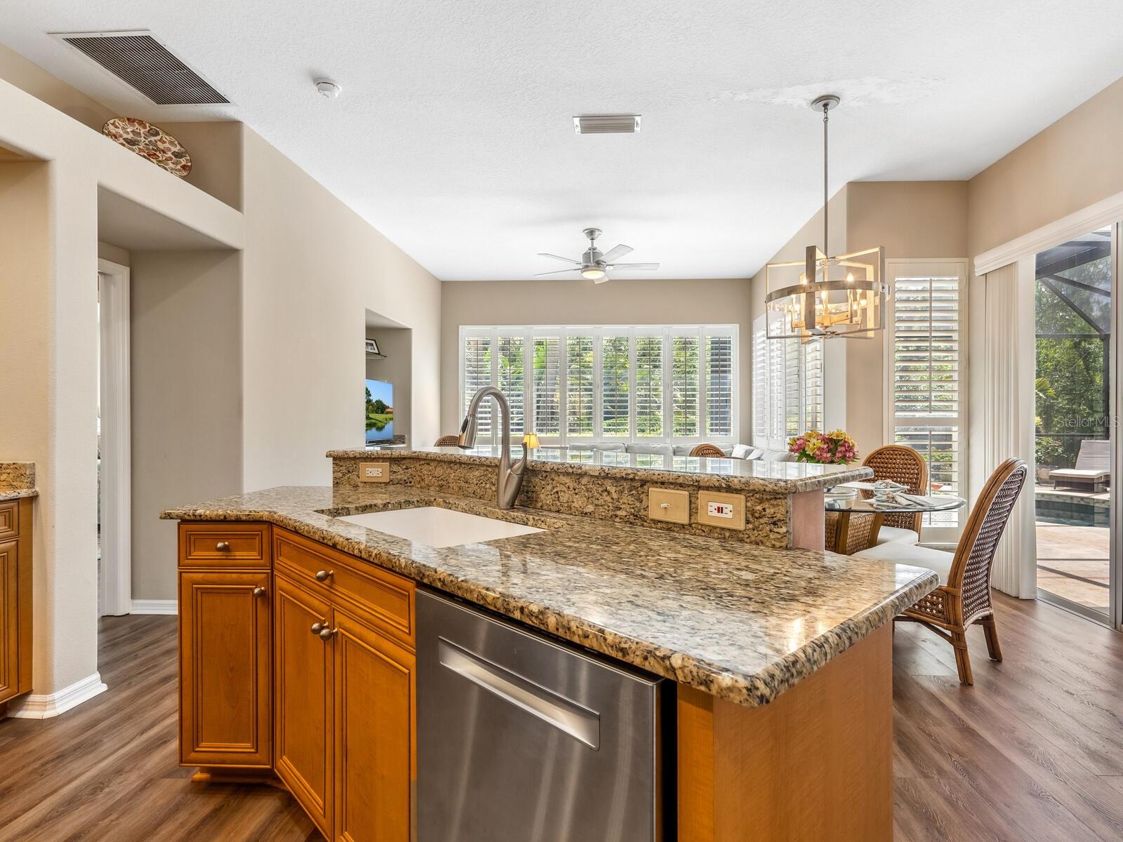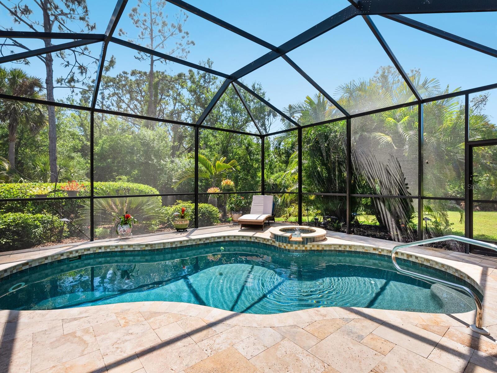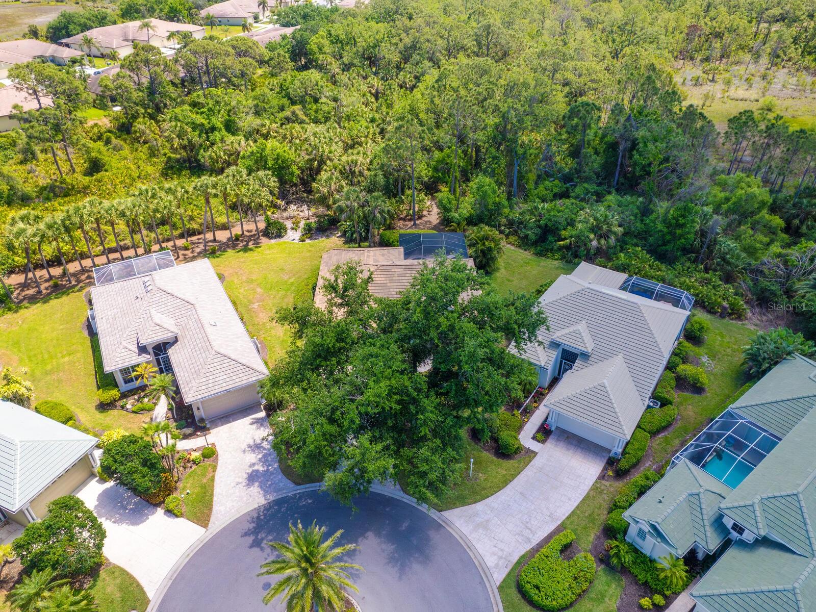 What a Sensational Pool area!! The large deck area with upscale travertine features a backdrop of gorgeous, mature trees providing privacy and beauty. A summer kitchen with bar, grill, sink, and refrigerator make alfresco dining a delight every day of the year. The generous sized pool offers a custom-in-floor cleaning system for easy maintenance. This 3 bedroom + den home is like new! Plus…it had a new roof in 2020! The spacious primary suite, with sliding glass doors, opens to the luxurious lanai and private back yard. The updated ensuite bath is stunning and features a generous walk-in shower. The kitchen has quality appliances, including an induction range and sleek microwave, with the island providing a workspace and a sit-down bar. The clean, well-organized garage has exceptional storage and work area. This home is positioned on a cul-de-sac, assuring privacy and quiet. The paver driveway and entry walk add warmth and a statement of quality as you approach this lovely home. Of special note is the wide, 114 feet rear lot dimension, creating a private, sweeping view of nature. The neighborhood provides yard maintenance and has a community pool and spa. In the gated Venice Golf and Country Club you are minutes from historic downtown Venice, beaches, I- 75, Wellen Park, dining, and shopping. The Club is private and member owned and offers a myriad of social, athletic, learning, and dining events. It has proudly earned an A+ financial rating. The clubhouse was renovated and expanded, and the wellness center is state-of-the-art. Membership is required. Please see attachments for details.