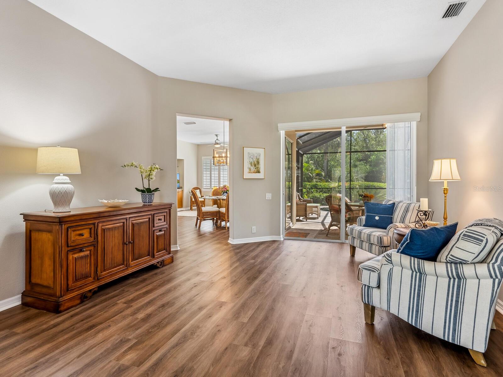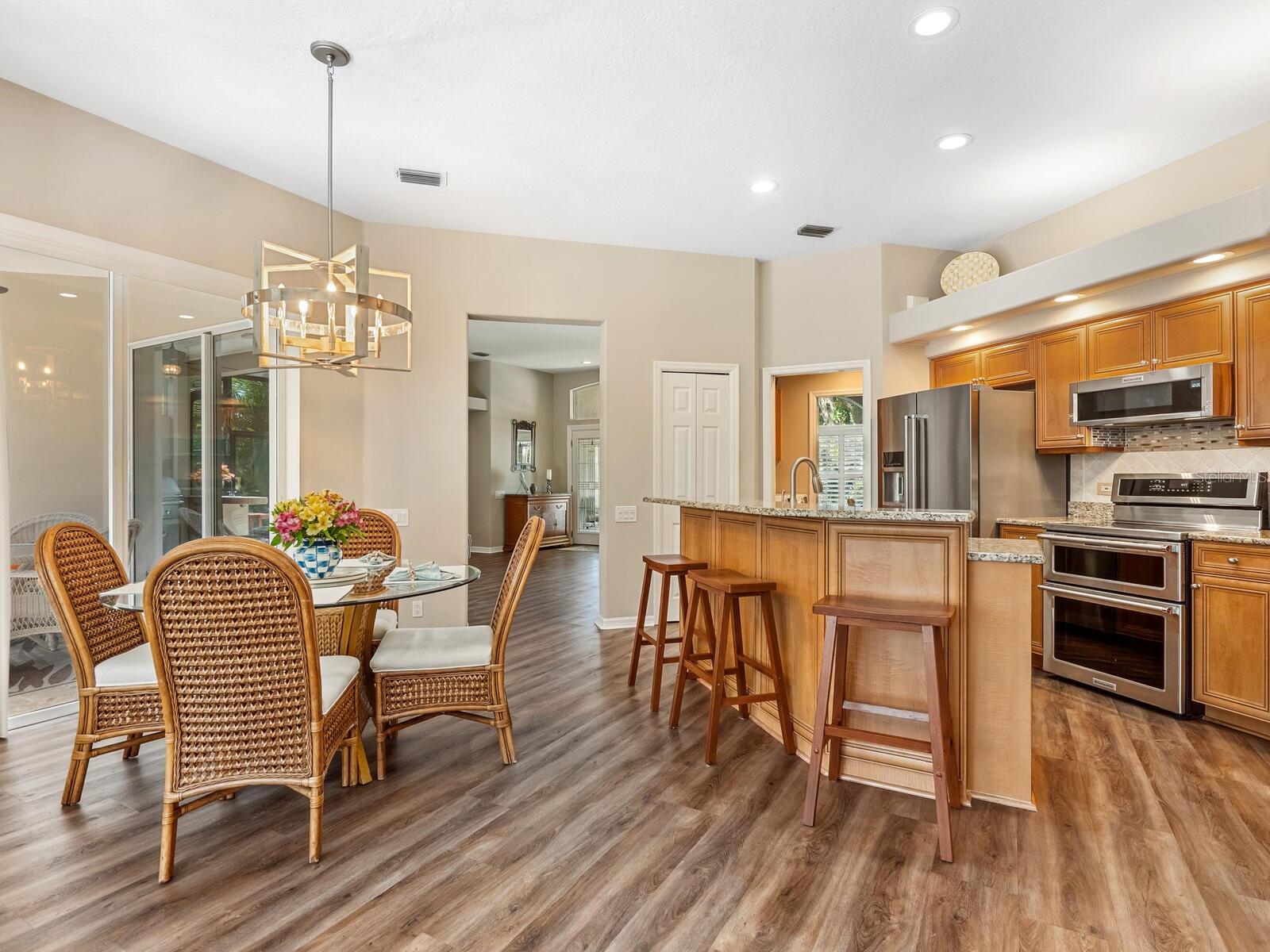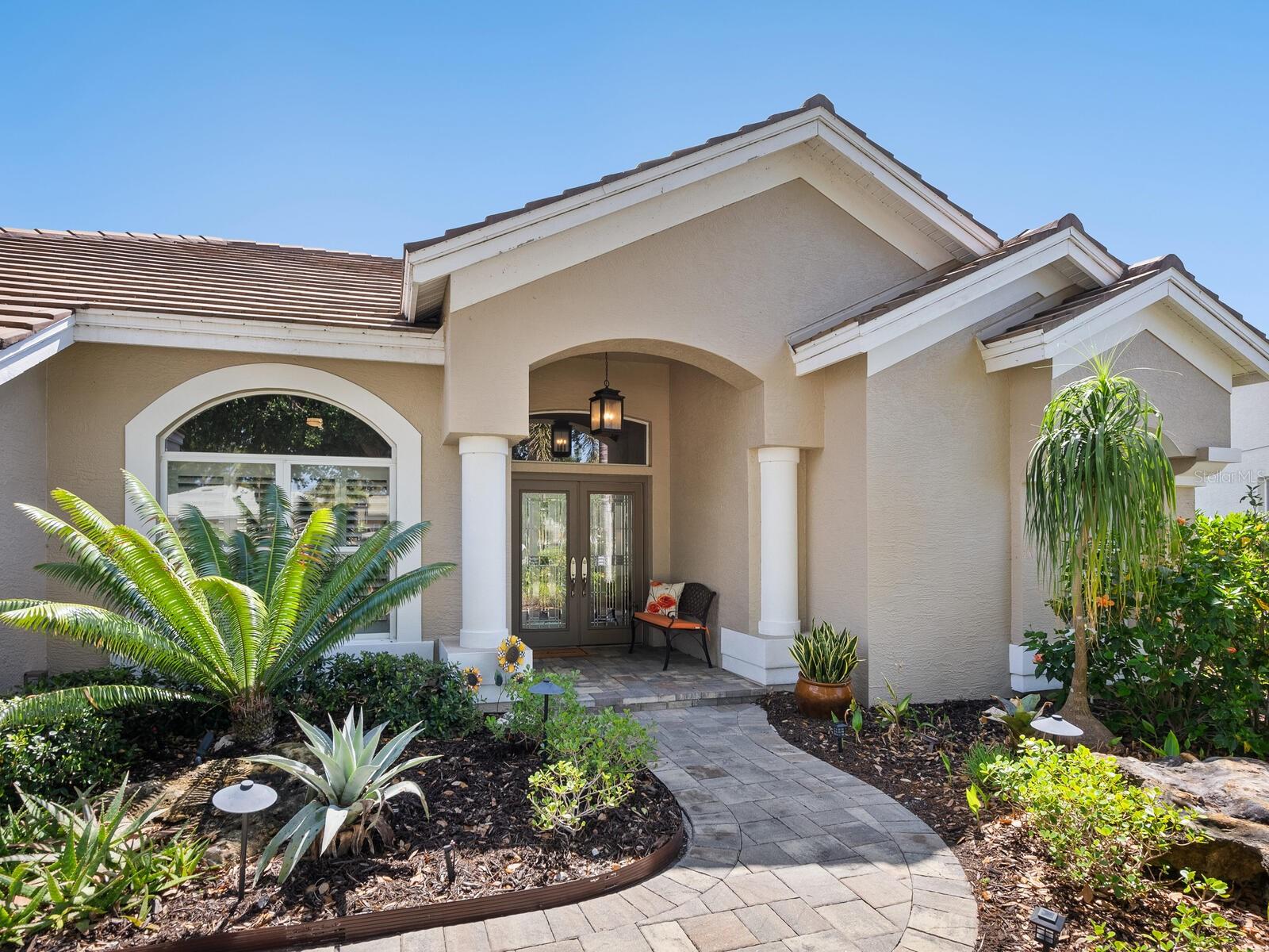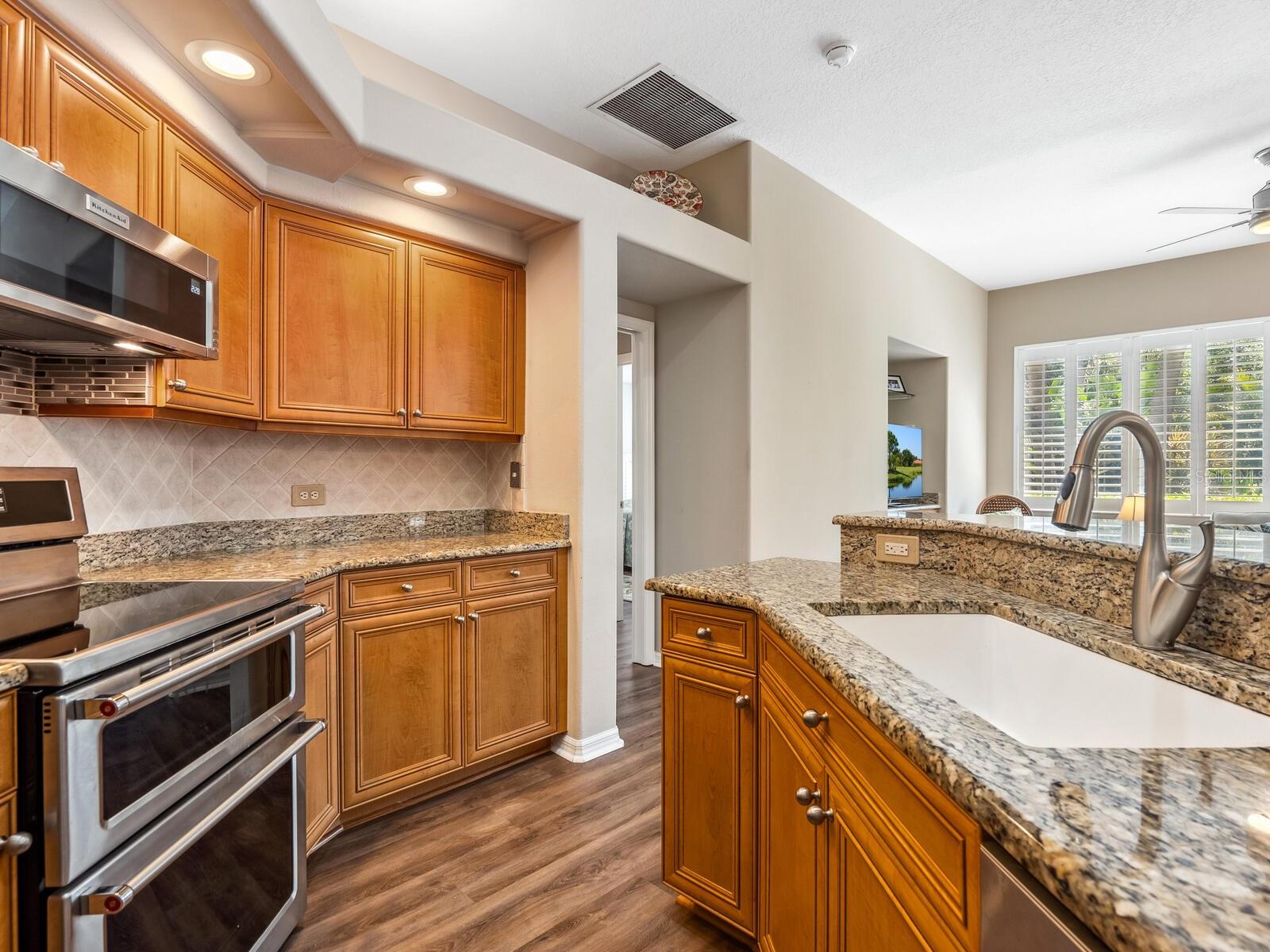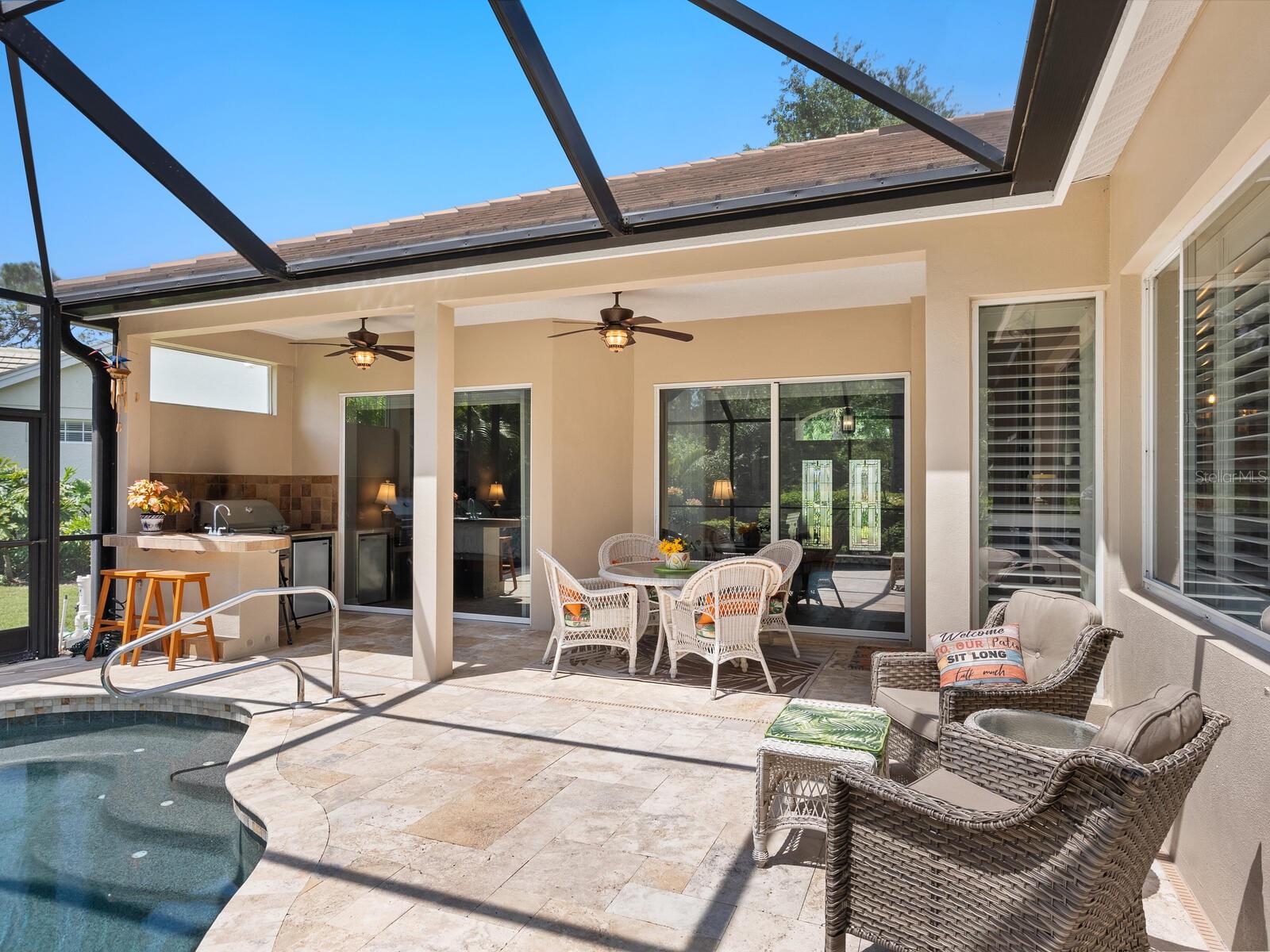 What a Sensational Pool area!! The large deck area with upscale travertine features a backdrop of gorgeous, mature trees providing privacy and beauty. A summer kitchen with bar, grill, sink, and refrigerator make alfresco dining a delight every day of the year. The generous sized pool offers a custom-in-floor cleaning system for easy maintenance. This 3 bedroom + den home is like new! Plus…it had a new roof in 2020! The spacious primary suite, with sliding glass doors, opens to the luxurious lanai and private back yard. The updated ensuite bath is stunning and features a generous walk-in shower. The kitchen has quality appliances, including an induction range and sleek microwave, with the island providing a workspace and a sit-down bar. The clean, well-organized garage has exceptional storage and work area. This home is positioned on a cul-de-sac, assuring privacy and quiet. The paver driveway and entry walk add warmth and a statement of quality as you approach this lovely home. Of special note is the wide, 114 feet rear lot dimension, creating a private, sweeping view of nature. The neighborhood provides yard maintenance and has a community pool and spa. In the gated Venice Golf and Country Club you are minutes from historic downtown Venice, beaches, I- 75, Wellen Park, dining, and shopping. The Club is private and member owned and offers a myriad of social, athletic, learning, and dining events. It has proudly earned an A+ financial rating. The clubhouse was renovated and expanded, and the wellness center is state-of-the-art. Membership is required. Please see attachments for details.