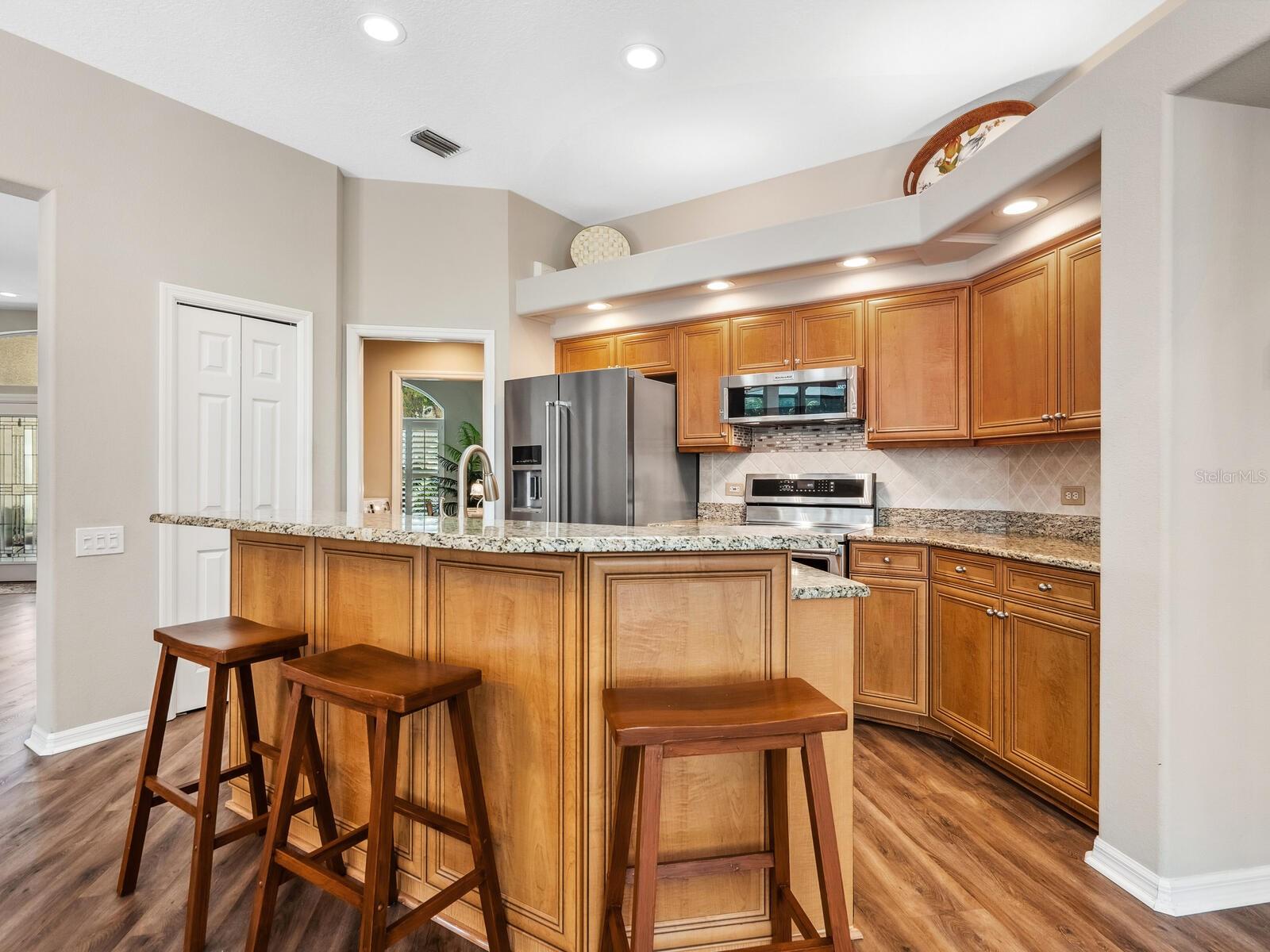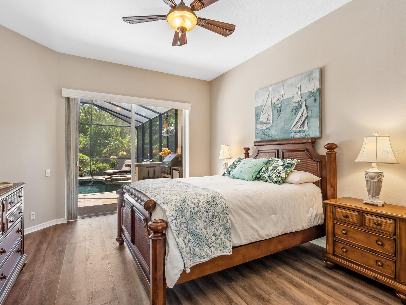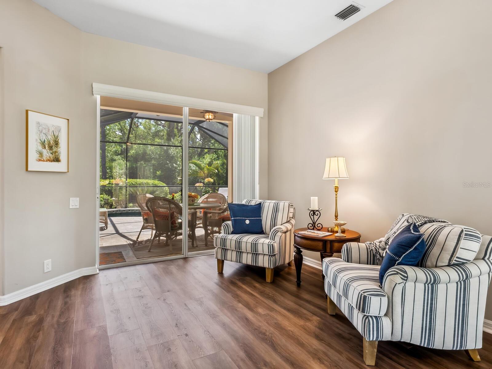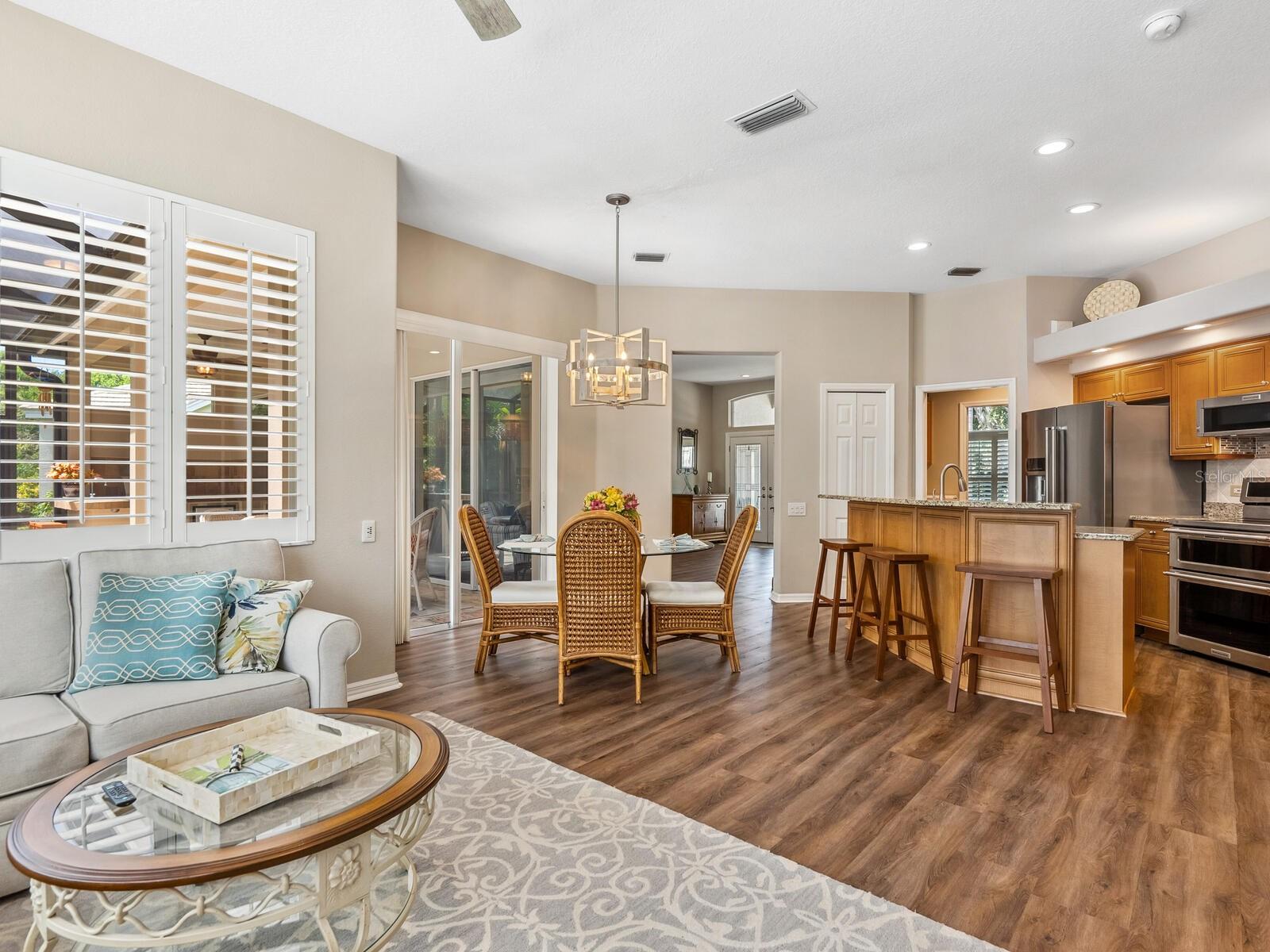 What a Sensational Pool area!! The large deck area with upscale travertine features a backdrop of gorgeous, mature trees providing privacy and beauty. A summer kitchen with bar, grill, sink, and refrigerator make alfresco dining a delight every day of the year. The generous sized pool offers a custom-in-floor cleaning system for easy maintenance. This 3 bedroom + den home is like new! Plus…it had a new roof in 2020! The spacious primary suite, with sliding glass doors, opens to the luxurious lanai and private back yard. The updated ensuite bath is stunning and features a generous walk-in shower. The kitchen has quality appliances, including an induction range and sleek microwave, with the island providing a workspace and a sit-down bar. The clean, well-organized garage has exceptional storage and work area. This home is positioned on a cul-de-sac, assuring privacy and quiet. The paver driveway and entry walk add warmth and a statement of quality as you approach this lovely home. Of special note is the wide, 114 feet rear lot dimension, creating a private, sweeping view of nature. The neighborhood provides yard maintenance and has a community pool and spa. In the gated Venice Golf and Country Club you are minutes from historic downtown Venice, beaches, I- 75, Wellen Park, dining, and shopping. The Club is private and member owned and offers a myriad of social, athletic, learning, and dining events. It has proudly earned an A+ financial rating. The clubhouse was renovated and expanded, and the wellness center is state-of-the-art. Membership is required. Please see attachments for details.