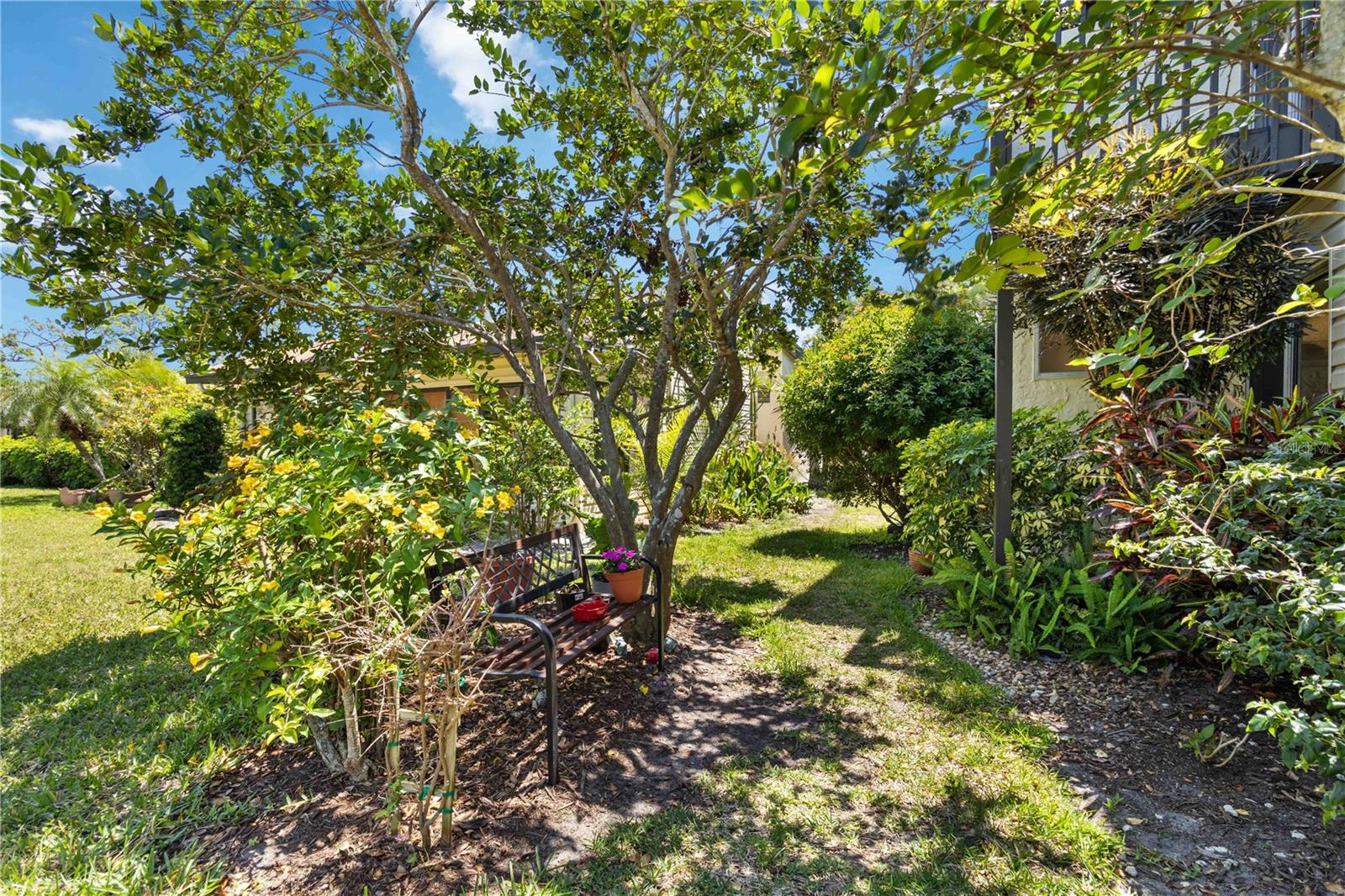 Winding tree-lined roads lead to Sea Grape Villas, where this first-floor, corner unit sits on a preferred cul-de-sac. A covered, screened-in lanai offers a private entrance with seating, access to the backyard, and a separate laundry room. Inside, you'll notice the new flooring and light fixtures. The open layout connects a white & bright kitchen with updated countertops, a large sink, and generous storage leads into the dining area. Sliding glass doors in the dining room open to a shaded garden with bench seating. Just beyond is the living room and sunroom, both filled with natural light and open views of the unobstructed backyard green space and Florida sunsets. The primary bedroom includes a walk-in closet, an updated ensuite bathroom, and sliding glass doors with plantation shutters. The guest bedroom also features sliding shutters, a private bathroom. Both bedrooms share access to a fenced-in zen courtyard, ideal for morning coffee or relaxation. Bird Bay Village is a pet-friendly & active community with access to trails, pickleball, tennis, a lap pool, multiple gyms, shuffleboard, and a clubhouse with activities and events. The legacy Trail is just a block away and is a neighborhood favorite. Major shopping like HomeGoods & PetSupermarket, award-winning restaurants, beauty boutiques, banking, and more are located just outside of the neighborhood entrances. Venice Island is conveniently located less than two miles away, providing the Venice Theater, Art Center, Venice Beach, Marina, golfing, Yacht Club, Jetty, Dog Beach, Fishing Pier, airport, parks, playgrounds, and cultural venues. The Bird Bay Village community is welcoming and has something for everyone! This unit is priced competitively, contact your Realtor® for more information and to schedule your private tour today!