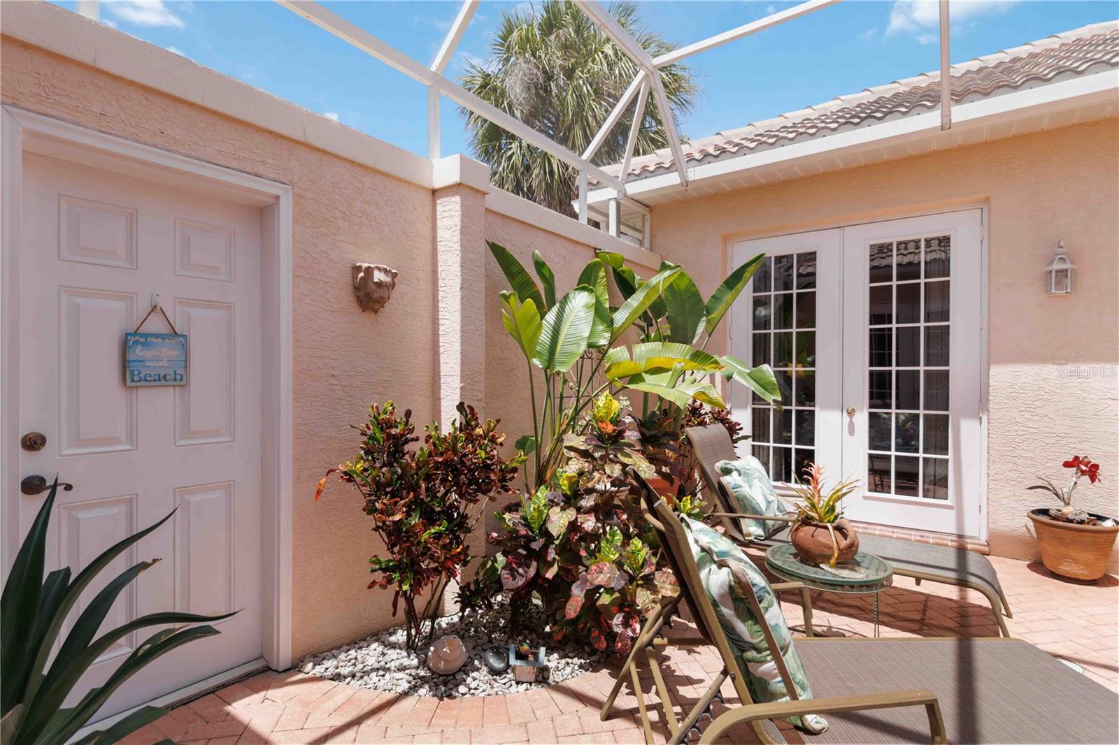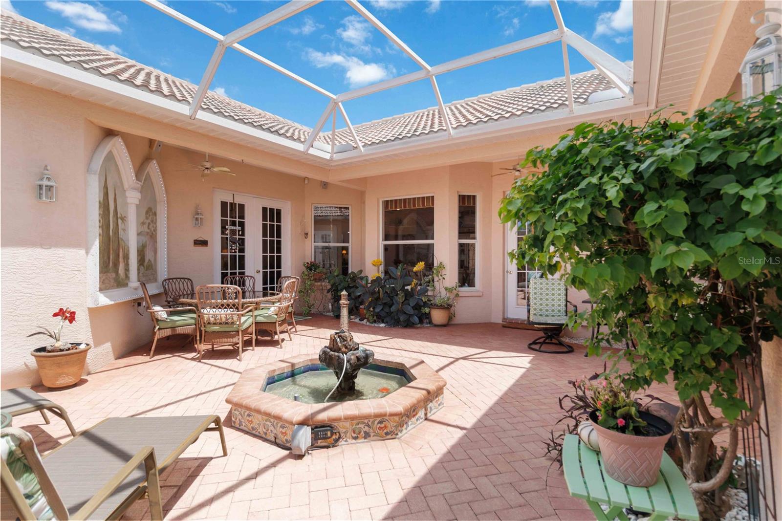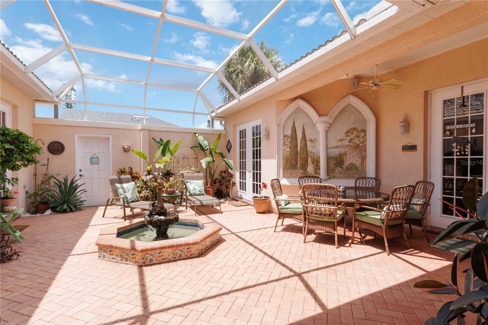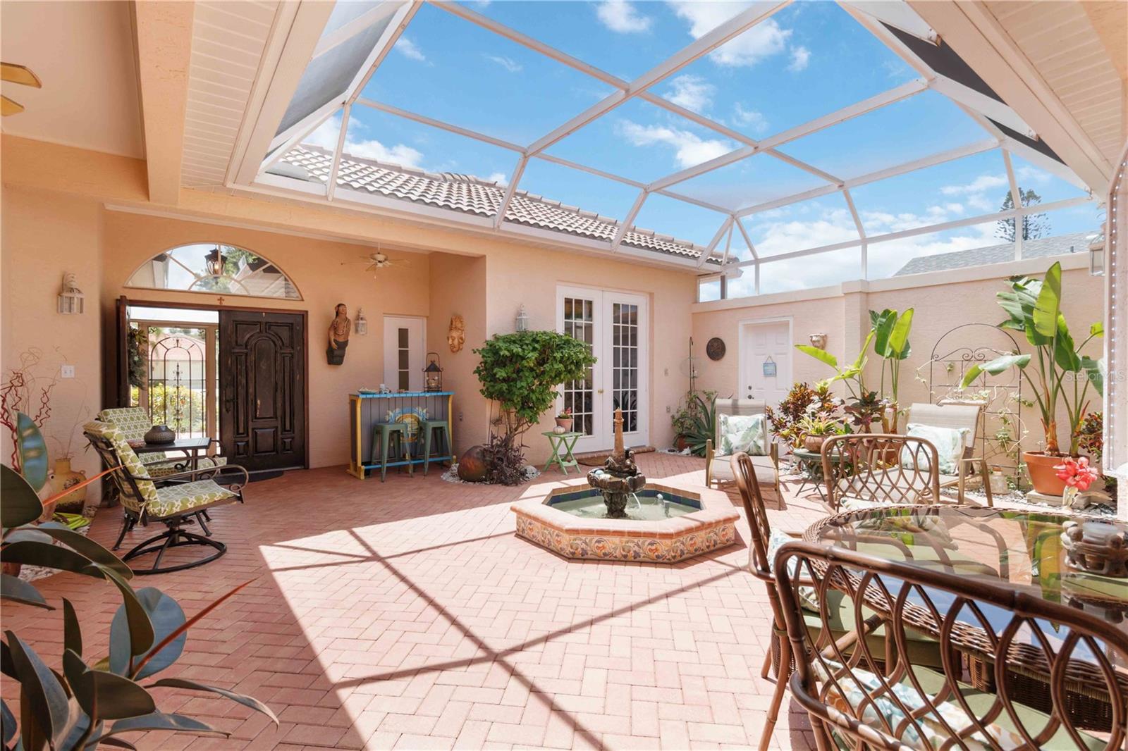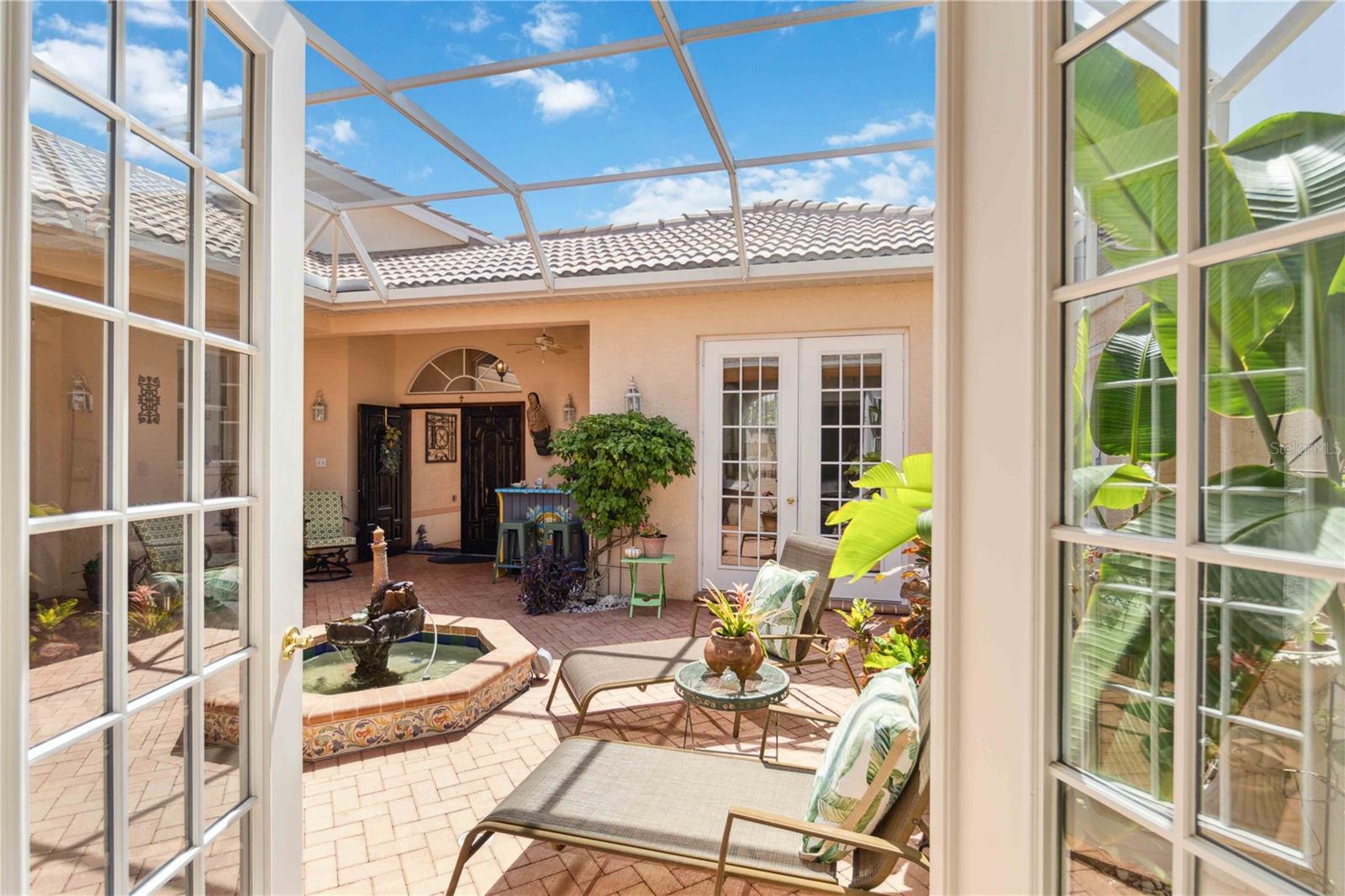 LOCATION! 3.8 miles to Manasota Key Beach! AND NEW ROOF 2024! TURNKEY HOME WITH GUEST SUITE WITH KITCHENETTE!– FULLY FURNISHED & Move-In Ready! And you will not believe what's included! Located in the quiet and desirable community of JACARANDA Heights, this beautifully maintained home comes FULLY FURNISHED! and includes EVERYTHING you need—just bring your suitcase! Enjoy peace and privacy on a corner lot in a cul-de-sac, just minutes from historic downtown VENICE and MANASOTA KEY BEACHES. Step through elegant cherry wood DOUBLE DOORS into a private, SCREENED COURTYARD featuring a THREE-TIER FOUNTAIN, brick pavers, and a TUSCAN-style mural—perfect for relaxing or outdoor dining. Inside, you'll find high-end finishes throughout, including CROWN MOLDING, engineered HARDWOOD floors, cherry wood cabinets, and GRANITE countertops. The kitchen offers stainless steel appliances, a breakfast bar, and a spacious dining area. The large primary suite includes a walk-in closet, French doors to the courtyard, and a private bathroom with double sinks and a walk-in shower. A SEPARATE GUEST HOUSE offers its own entrance, kitchenette, and full bathroom—great for guests, in-laws, or a home office. Additional features: ALL Kitchen matching Frigidaire Gallery appliances included, Washer & Dryer, Hurricane shutters, Fenced backyard with side patio, LOW HOA, NO CDD fees FULLY furnished – TURNKEY sale! This rare opportunity won’t last long—homes in Jacaranda Heights rarely hit the market! BRING ALL OFFERS!