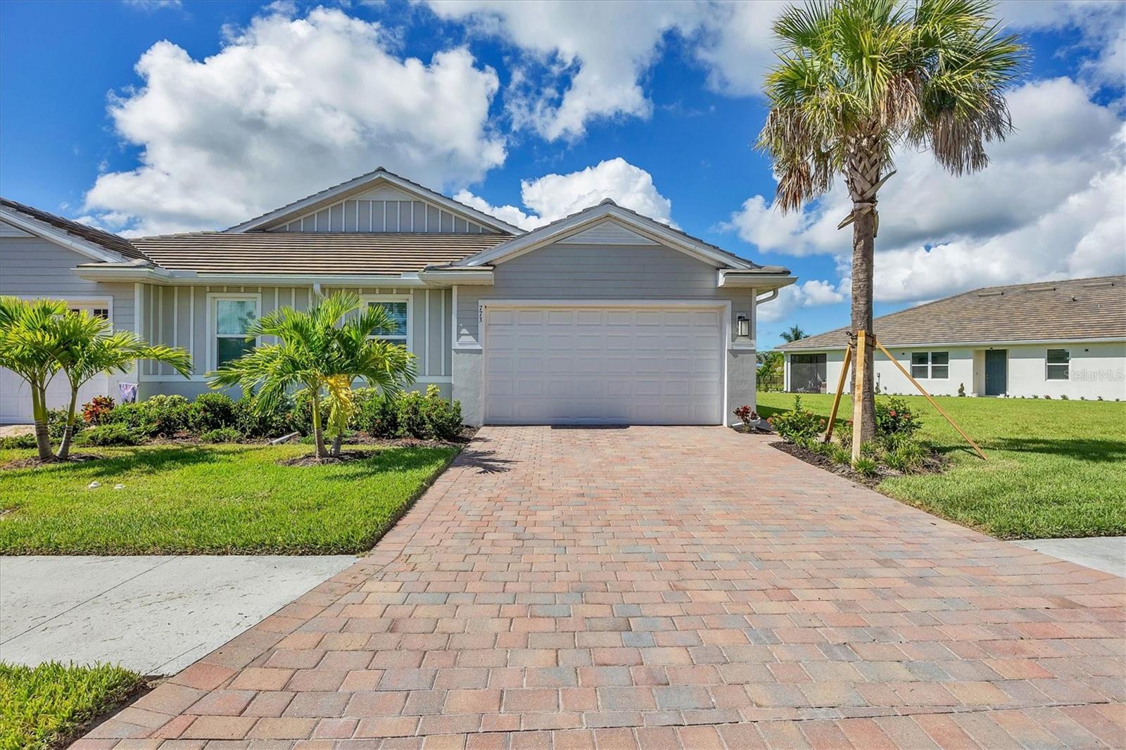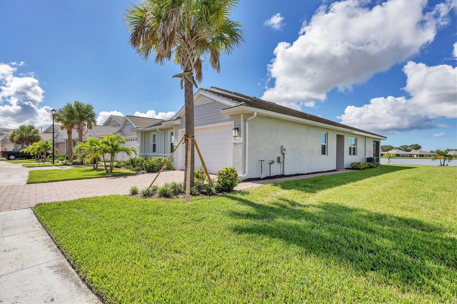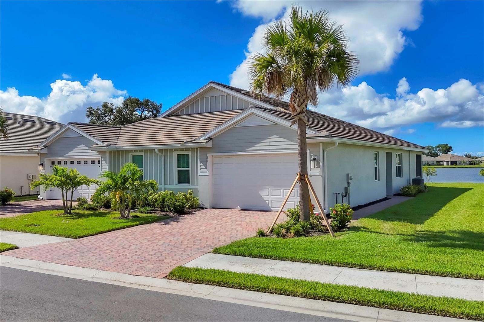 Beautiful villa with relaxing broad views of water and green space. Newly built on a premium lot in 2022 and features 2 BR, plus a den, 2 full baths, 2 car garage, and 1,500 square feet of living space. The home has an open floor plan enhanced with 9 foot ceilings and 8 foot doors. Adding to your comfort are split bedrooms and a large den/office/library that can easily become a 3rd bedroom. There is carpet in both bedrooms, and easily cared for tile in the remainder of the home. The clubhouse, community mailbox, and pool are a very short walking distance away. There are sidewalks and walking trails for outdoor exercise, and a fitness area in the clubhouse. The Palencia location is convenient to historic downtown Venice, Publix shopping centers in 2 directions, and the new Sarasota Memorial Hospital is less than 10 minutes away. The Gulf beaches and the Gulf waterfront dog park are a short drive away. There are more beaches and interesting waterfront locations in nearby Nokomis and Englewood. The hotspots in and around Sarasota are easily accessible via I-75 or Tamiami Trail. There are several golf courses within a 10 minute drive and over 40 courses within 30 minutes. Come and see all that the Gulf Coast has to offer for your heart, for your family, and for your best lifestyle.