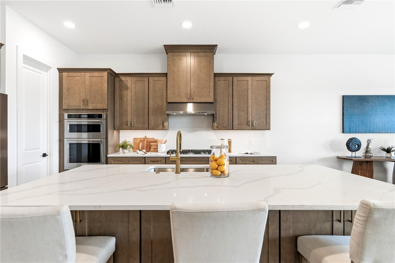 This beautifully crafted home features a pool, extended covered lanai with a privacy wall, and an outdoor kitchen prep area—providing the perfect setting to design your dream outdoor kitchen and craft a personalized backyard oasis. The gourmet kitchen boasts upgraded KitchenAid appliances, quartz countertops, perimeter cabinetry, a contrasting buckskin island, and a premium Kohler stainless steel sink. Tray ceilings in the great room and primary bedroom add a touch of luxury while enhancing the open, airy feel of these key living spaces. Upgraded luxury vinyl flooring throughout, along with hurricane impact windows and doors, combines style with lasting peace of mind. Come experience your dream home by scheduling a tour.