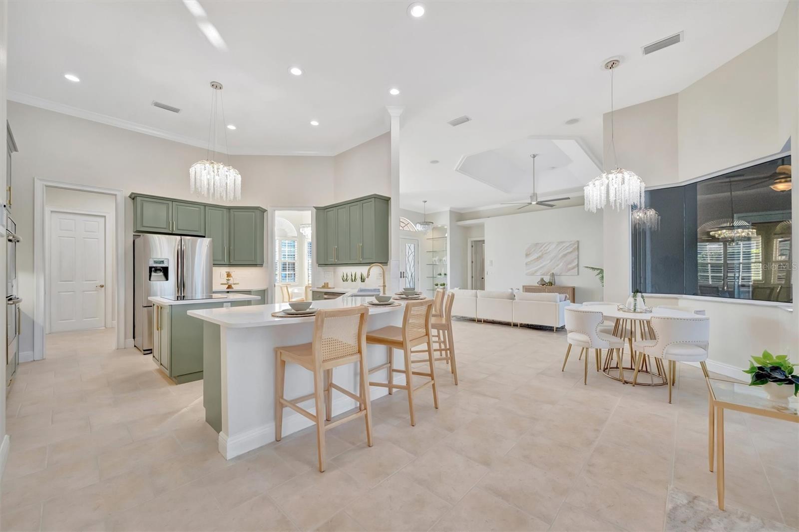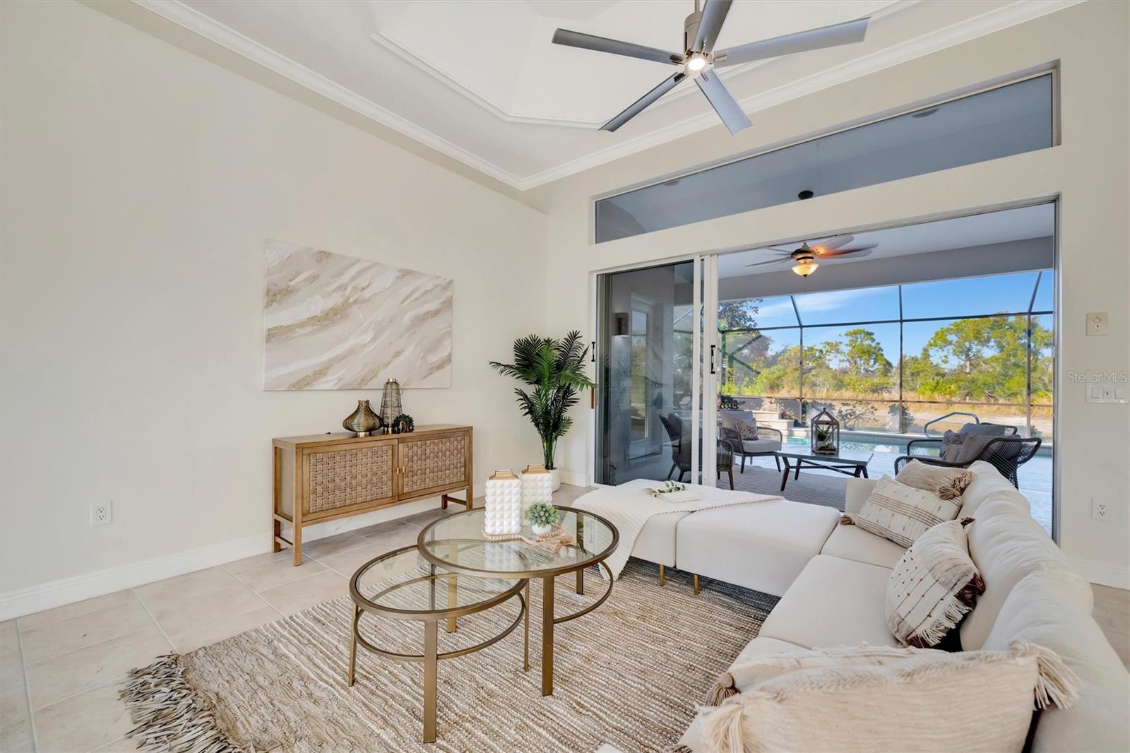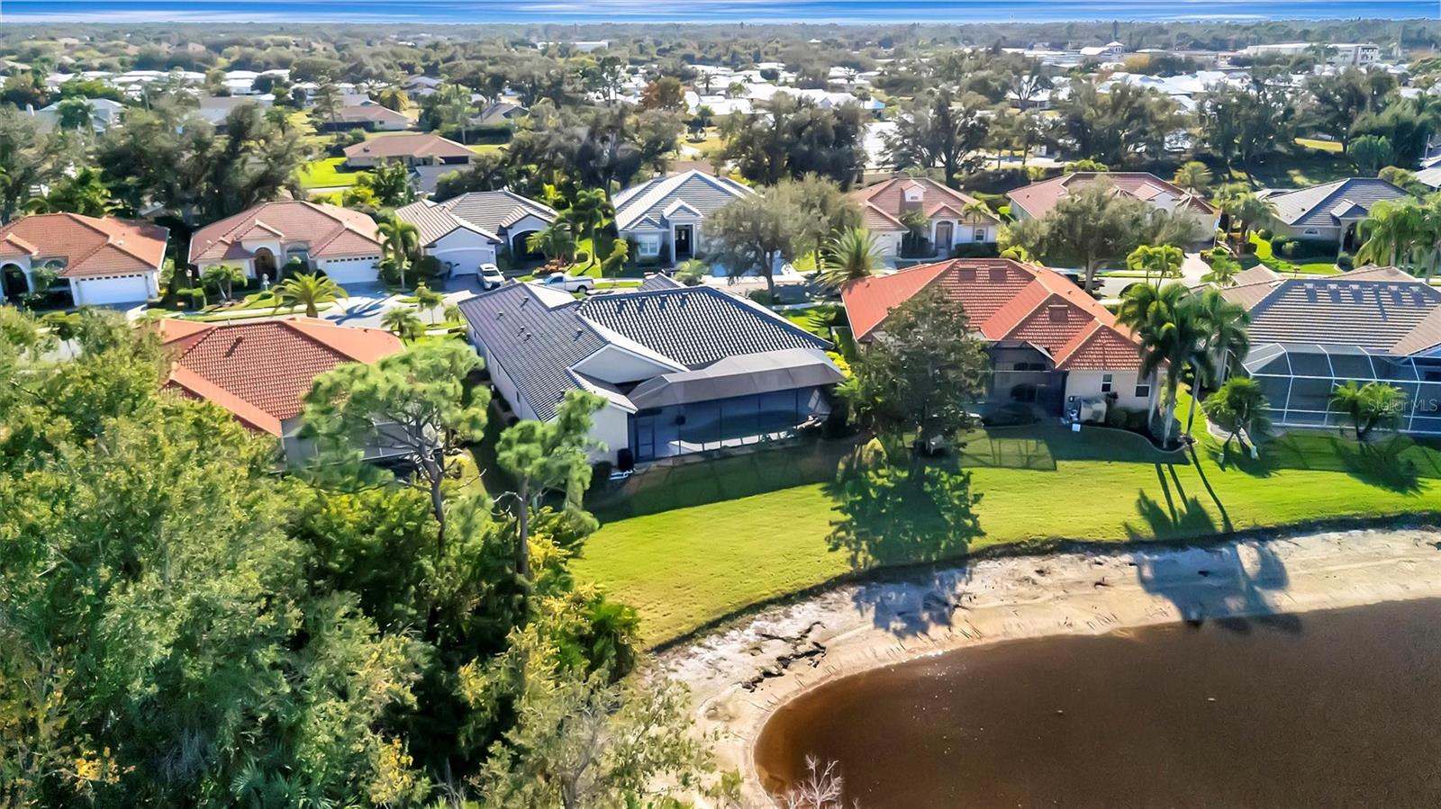 Lake and preserve view. Heated saltwater pool. 12- and 10-ft ceilings throughout. New roof (2024). Tile flooring throughout. Two A/C systems (2023, 2020). Spa-like primary bath with Jacuzzi tub. Kitchen: Built-in double oven. Induction cooktop. New dishwasher, washer, and dryer. Ample storage throughout. Screened no-see-um lanai with outdoor living space. Oversized garage with extra storage and workspace. Under 4.5 miles to the nearest beach. Resort-style gated community with pool, gym, clubhouse, tennis courts, and mature trees. Low HOA fees; no CDD. Nearly half, 300 acres, of Venetia community is protected preserve with abundant wildlife.