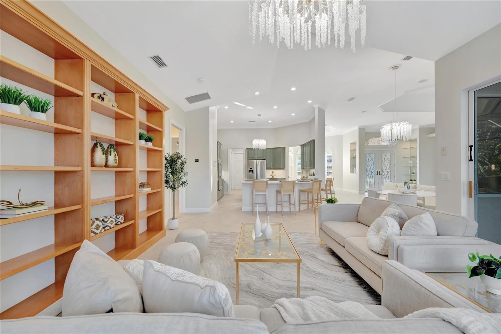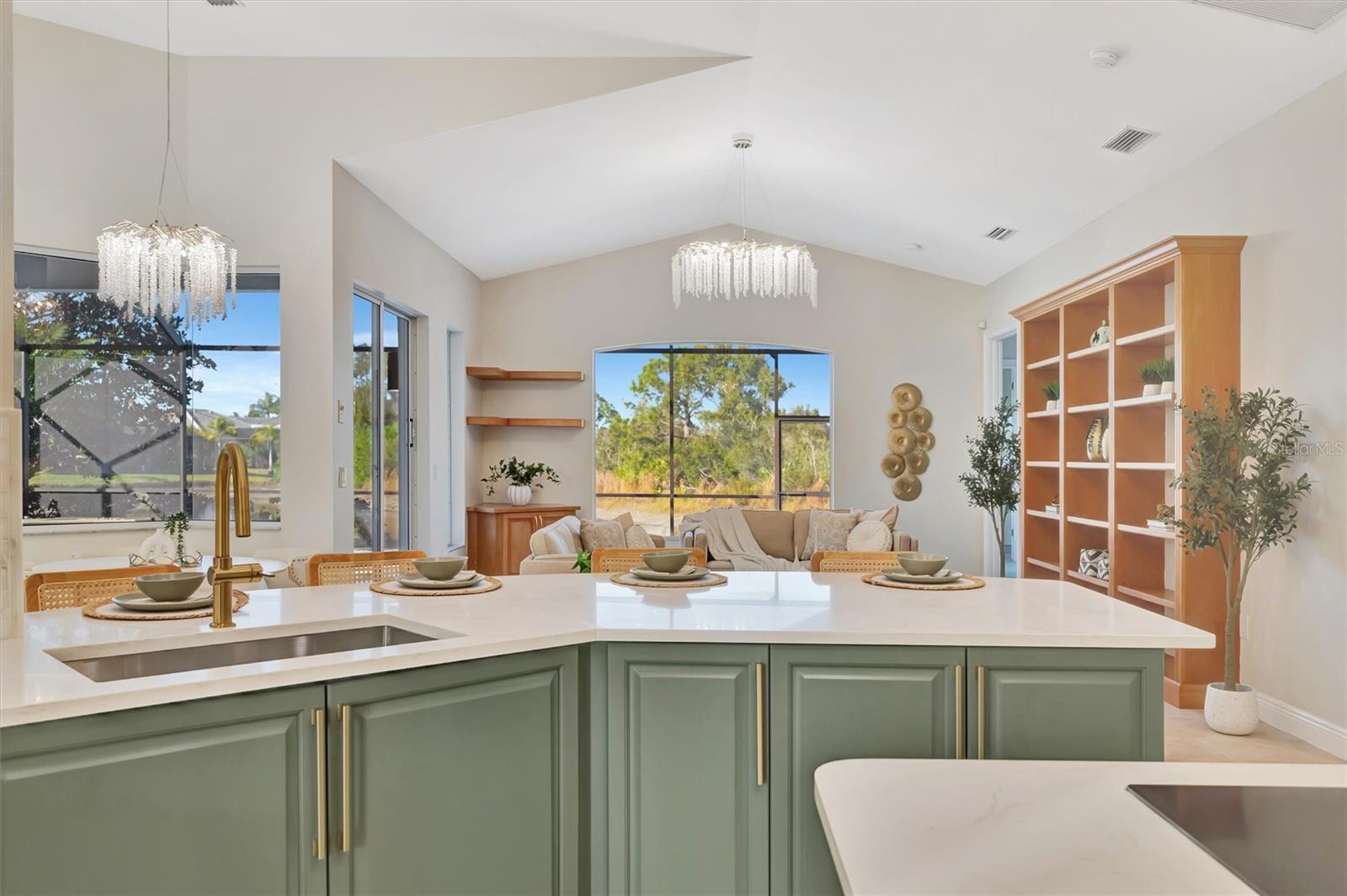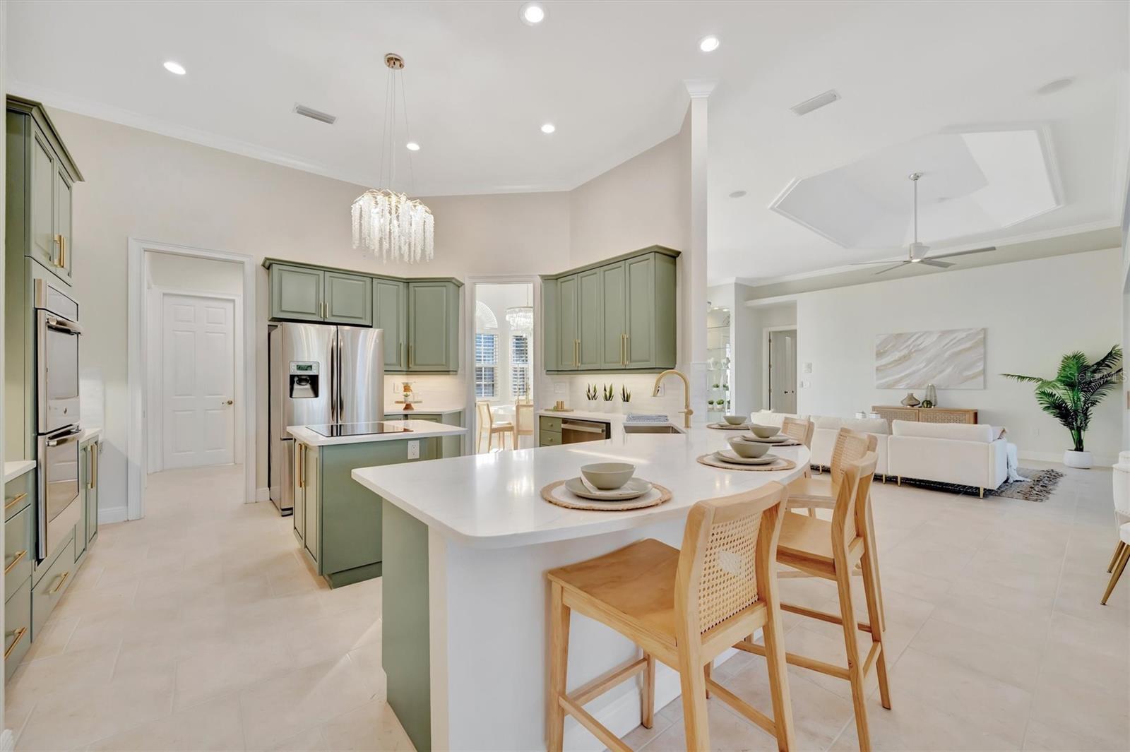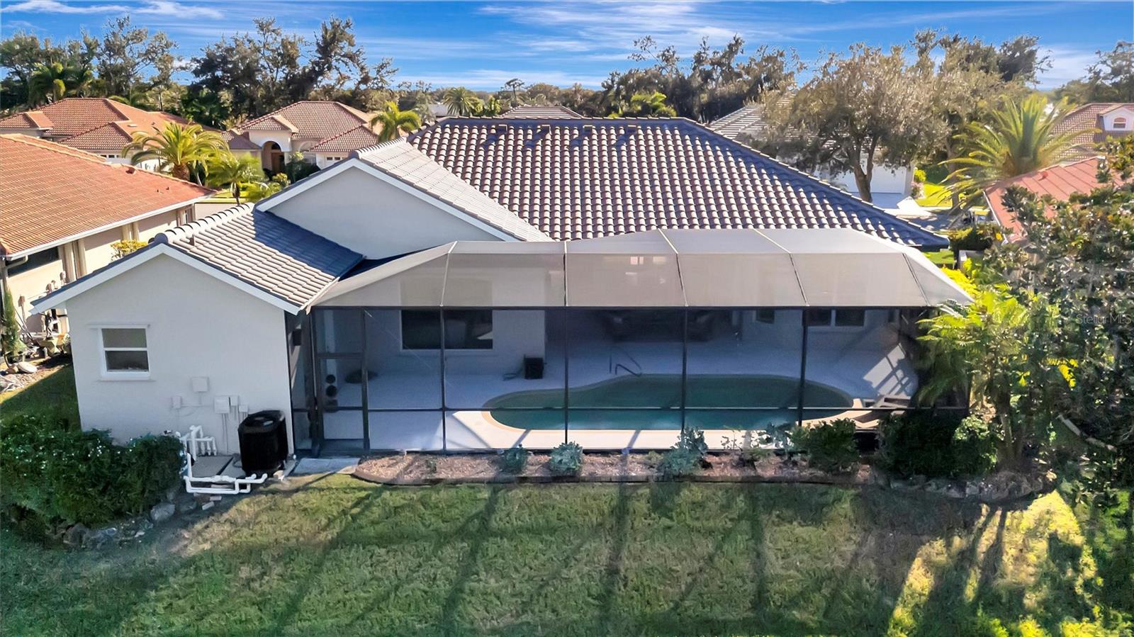 Lake and preserve view. Heated saltwater pool. 12- and 10-ft ceilings throughout. New roof (2024). Tile flooring throughout. Two A/C systems (2023, 2020). Spa-like primary bath with Jacuzzi tub. Kitchen: Built-in double oven. Induction cooktop. New dishwasher, washer, and dryer. Ample storage throughout. Screened no-see-um lanai with outdoor living space. Oversized garage with extra storage and workspace. Under 4.5 miles to the nearest beach. Resort-style gated community with pool, gym, clubhouse, tennis courts, and mature trees. Low HOA fees; no CDD. Nearly half, 300 acres, of Venetia community is protected preserve with abundant wildlife.