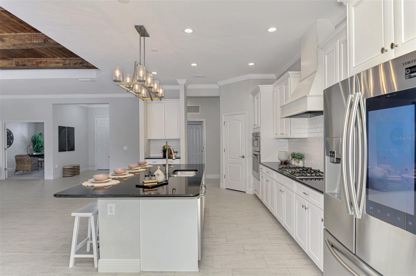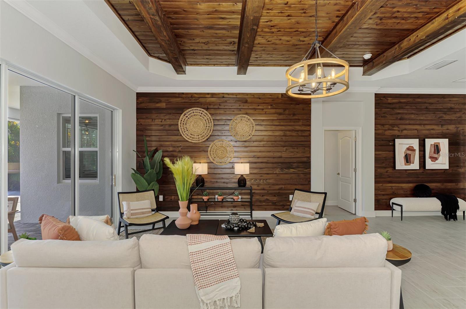 Welcome home to your own piece of paradise in the highly sought-after community of Grand Palm. Tucked away at the end of a private cul-de-sac within the gated Coastal enclave, this exceptional Santa Catalina home offers lush tropical landscaping, tranquil pond views, and a desirable south-facing backyard, creating the perfect setting for both everyday living and unforgettable entertaining. From the moment you arrive, you’ll appreciate the incredible privacy and curb appeal, with abundant palm trees and mature landscaping surrounding the home. A deep, covered front entry with a sitting area sets a warm and welcoming tone, creating an inviting first impression. Inside, the open-concept floor plan immediately impresses with beautiful sightlines, abundant natural light, and thoughtful architectural details throughout. The expansive great room draws your eye straight to the stunning outdoor living space and is accented by custom ceiling treatments, wood detailing, and beam accents that bring warmth and character to the home. The kitchen is both functional and inviting, featuring a large center island, ample cabinetry, generous prep space, stainless-steel appliances, and a gas cooktop, ideal for casual meals or entertaining. The dining area flows seamlessly from the kitchen, creating a comfortable and connected living space. A flexible office or den with glass French doors is conveniently located near the main living area, perfect for working from home or a quiet retreat. The primary suite is thoughtfully positioned on the main level and offers a peaceful escape with architectural ceiling detail, serene pond views, and a calming ambiance. The spa-like primary bathroom includes dual vanities, a soaking tub, a large walk-in shower, abundant storage, and a dream walk-in closet customized with built-ins. Additional main-level bedrooms are well-appointed, including Bedroom #2 with a custom closet with built-ins, and access to a Jack-and-Jill bathroom with dual sinks and a private shower and toilet area. Bedroom #3 features a charming barn door leading to a custom built-in closet. A spacious laundry room with custom shelving and a functional drop zone with built-ins just off the garage add everyday convenience. Upstairs, you’ll find a large bonus room offering a blank canvas for your own design, complete with recessed lighting and crown molding. Bedroom #5 enjoys abundant natural light, crown molding, and peaceful pond views, while an additional upstairs bathroom includes ample storage and a private shower and toilet area. Outdoor living is truly a highlight of this home. The expansive screened-in lanai features an oversized covered area with a built-in outdoor kitchen, bar seating, and stone countertops, perfectly paired with a private pool and expansive deck, all surrounded by lush tropical views. Perfectly located within this amenity-rich community, enjoy a short bike ride to Exploration Park, The Social Club with a full-time lifestyle director, state-of-the-art fitness center, three heated pools, splash park, tennis, bocce, volleyball, and a private island with fishing piers and scenic walking trails and so much more. This is more than a home, it’s a lifestyle. Schedule your private showing today.