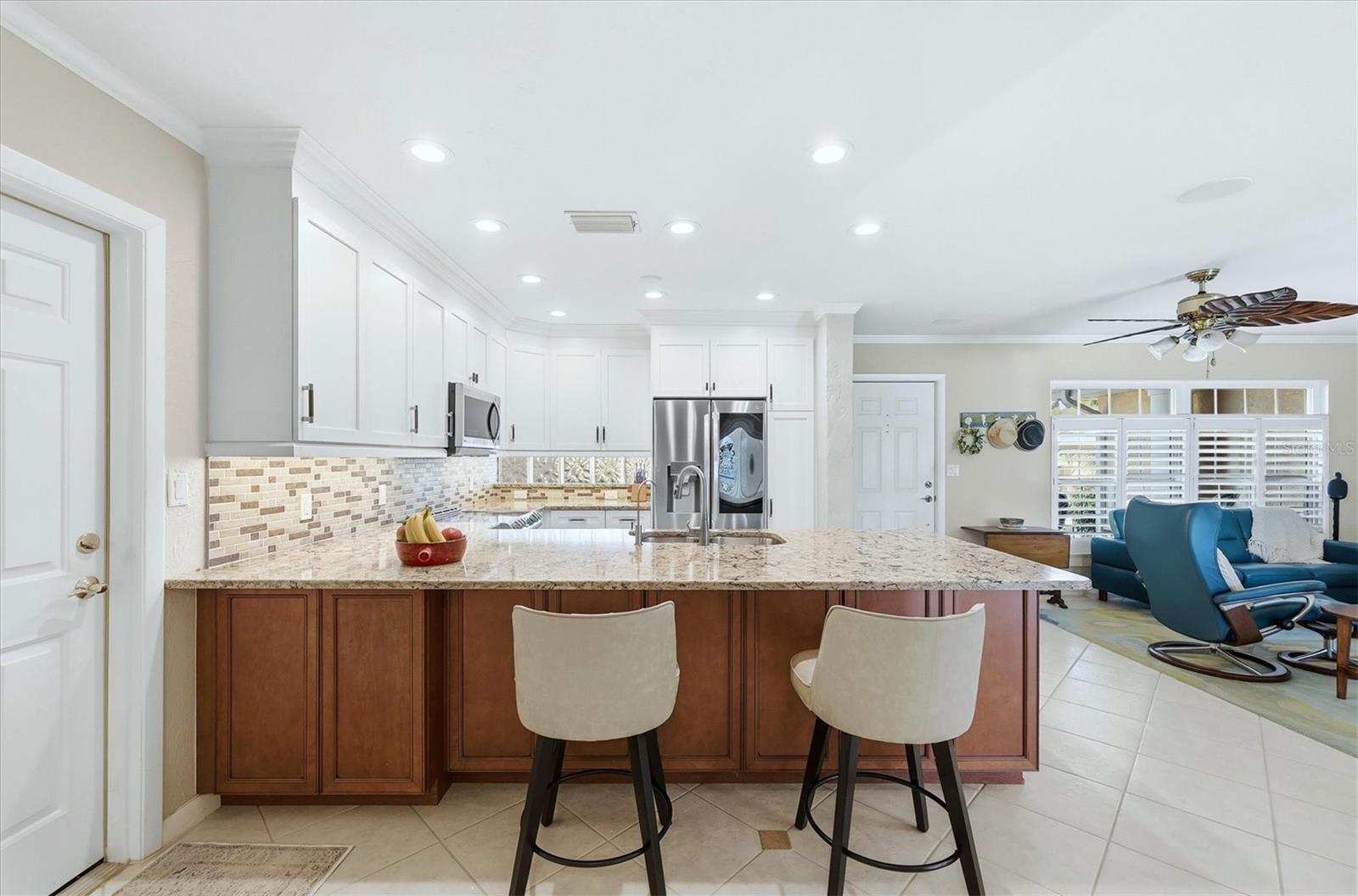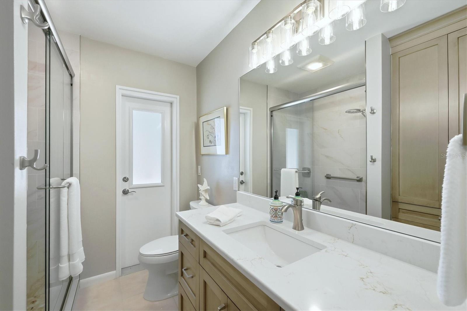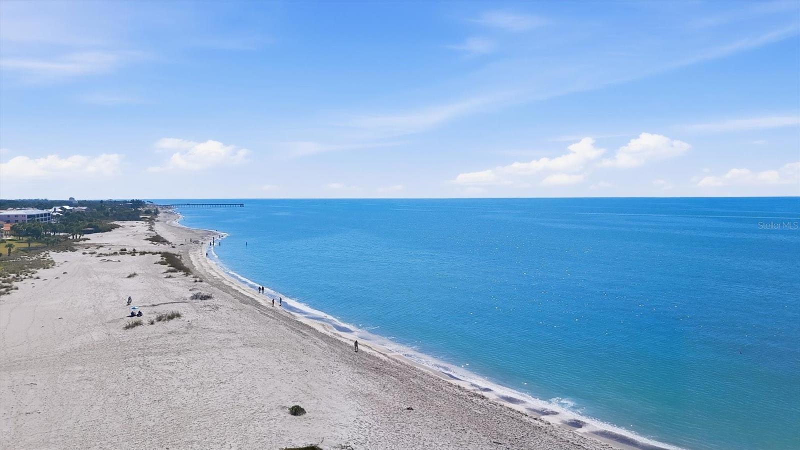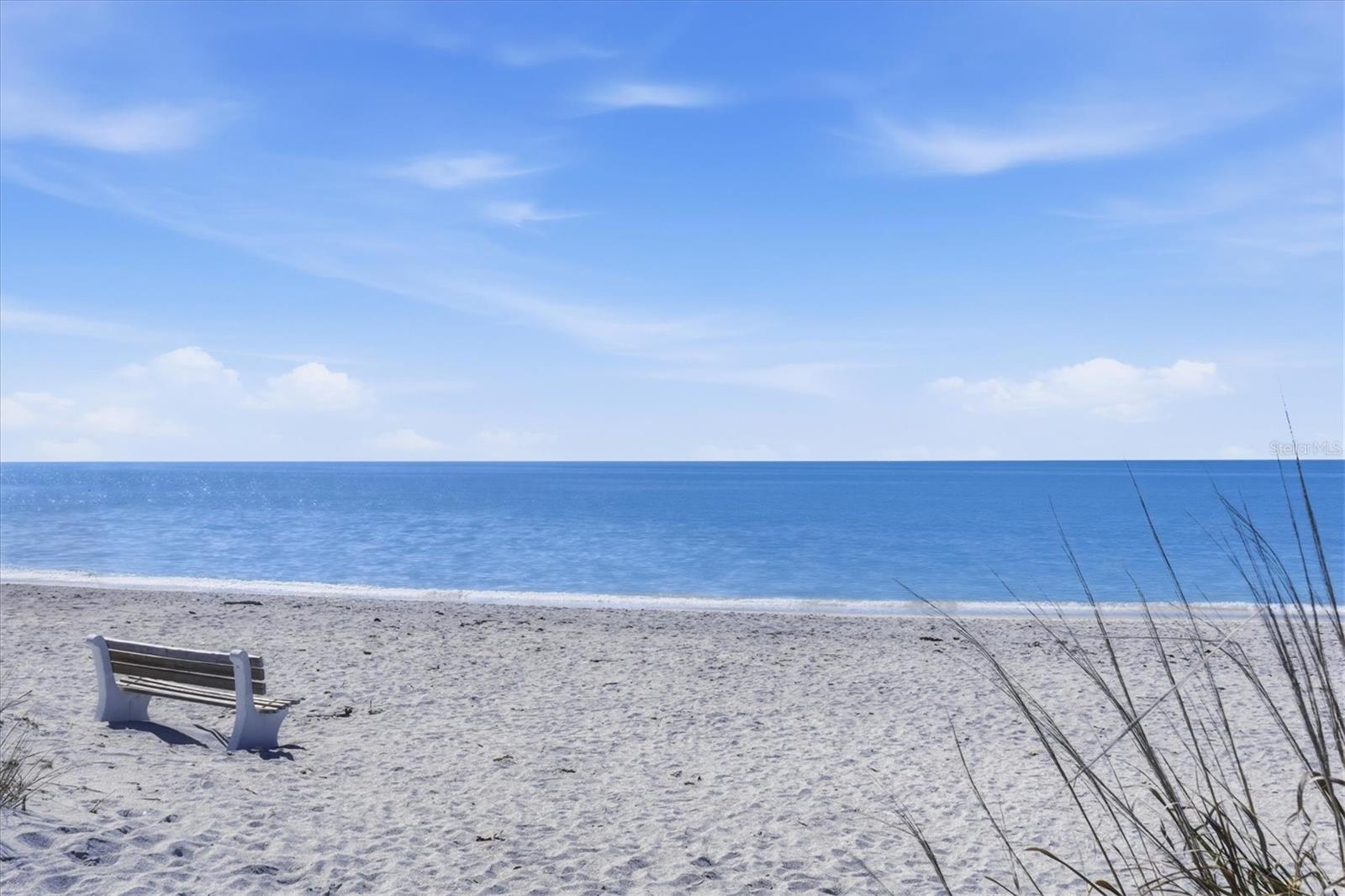 Striking gold in Golden Beach—and move-in ready for the new owner! Impeccable curb appeal is highlighted by lush, custom landscaping and a gracefully curved paver driveway, welcoming you into this refined mid-century, seaside-chic retreat. Modernized with a coastal flair, this distinctive pool home offers approximately 2,000 square feet of character-filled living in the highly sought-after Golden Beach community on Venice Island—just one block from the beach. Tucked into this exceptional neighborhood yet minutes from shopping, dining, and local theater, the location strikes the perfect balance between peaceful island living and everyday convenience. Beyond its short stroll to the shoreline, the home also enjoys private, deeded beach access complete with parking, a gazebo, BBQ area, benches, and an outdoor shower—ideal for unwinding after sun-soaked days by the water. Association membership is optional; for just $50 per year, residents gain access to beach parking, social gatherings, potluck dinners, Mardi Gras celebrations, and an annual membership directory. Adding to the appeal is easy access to the Intracoastal Trail, which connects to the Legacy Trail and provides a scenic biking route to downtown Sarasota. Inside, three generously sized bedrooms and two well-appointed bathrooms are unified by tile flooring throughout, creating a clean, cohesive aesthetic. A beautifully designed custom kitchen by Kitchen and Bath on the Isle anchors the home, while plantation shutters bring in that classic coastal feel. The home has been lovingly maintained and is in splendid condition. Impact-resistant doors (pocket sliders) and windows offer durability for coastal living, complemented by thoughtful, quality upgrades including additional attic insulation, a whole-house water conditioning system, a Lennox Pulse HVAC, and a Generac generator—making everyday life comfortable, easy, and worry-free. Designed for relaxed indoor-outdoor living, the screened lanai features a heated, in-ground saltwater pool with an integrated spa, enhanced by a lighted pergola that creates a resort-style ambiance. Built-in speakers set the tone for entertaining or unwinding, while an enclosed outdoor shower adds a touch of everyday luxury. A custom half wall cleverly conceals the pool equipment and doubles as a striking mural feature. The rear property is fully enclosed with clean white vinyl fencing and gates, offering both privacy and polish. Completing the property is an oversized 1+ garage AND a fabulous detached 20’ x 12.5’ garage/workshop/storage building with cabinetry, electricity, a garage door opener, and a roof that matches the main home—blending functionality with thoughtful design. And for more good news, this home is in Zone X and there has been no flooding.