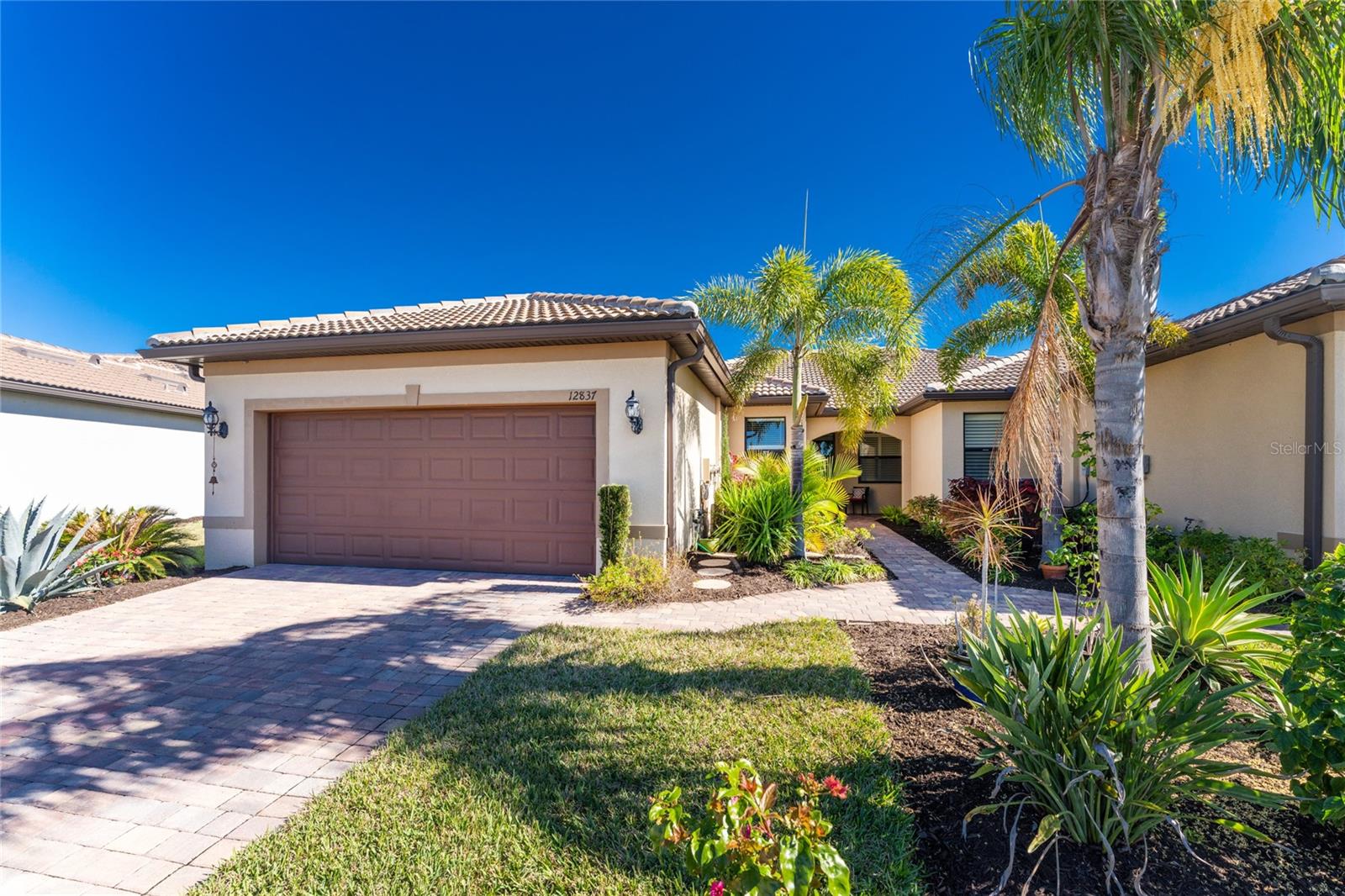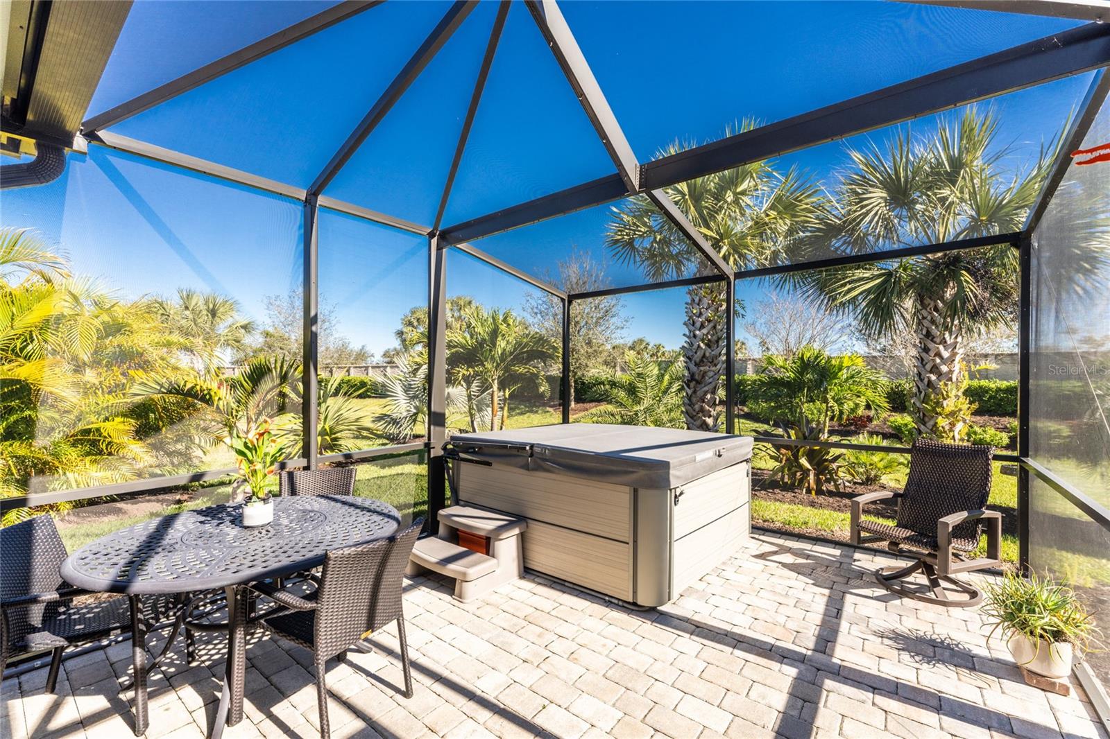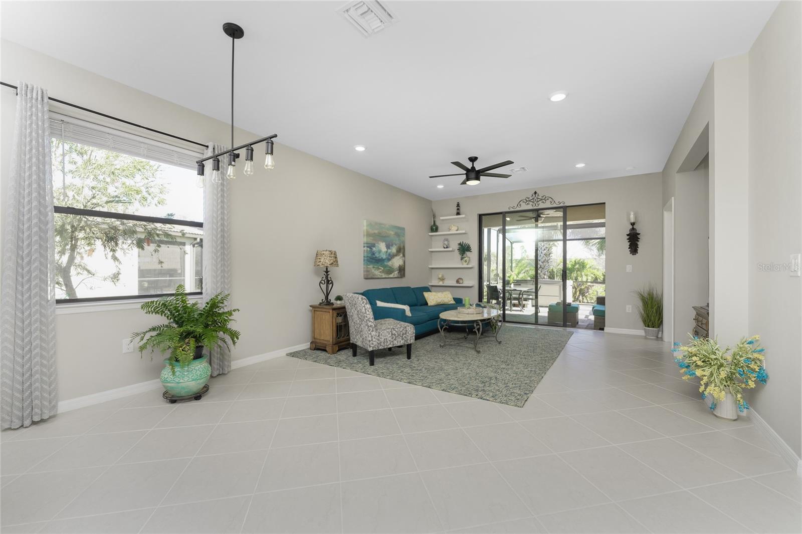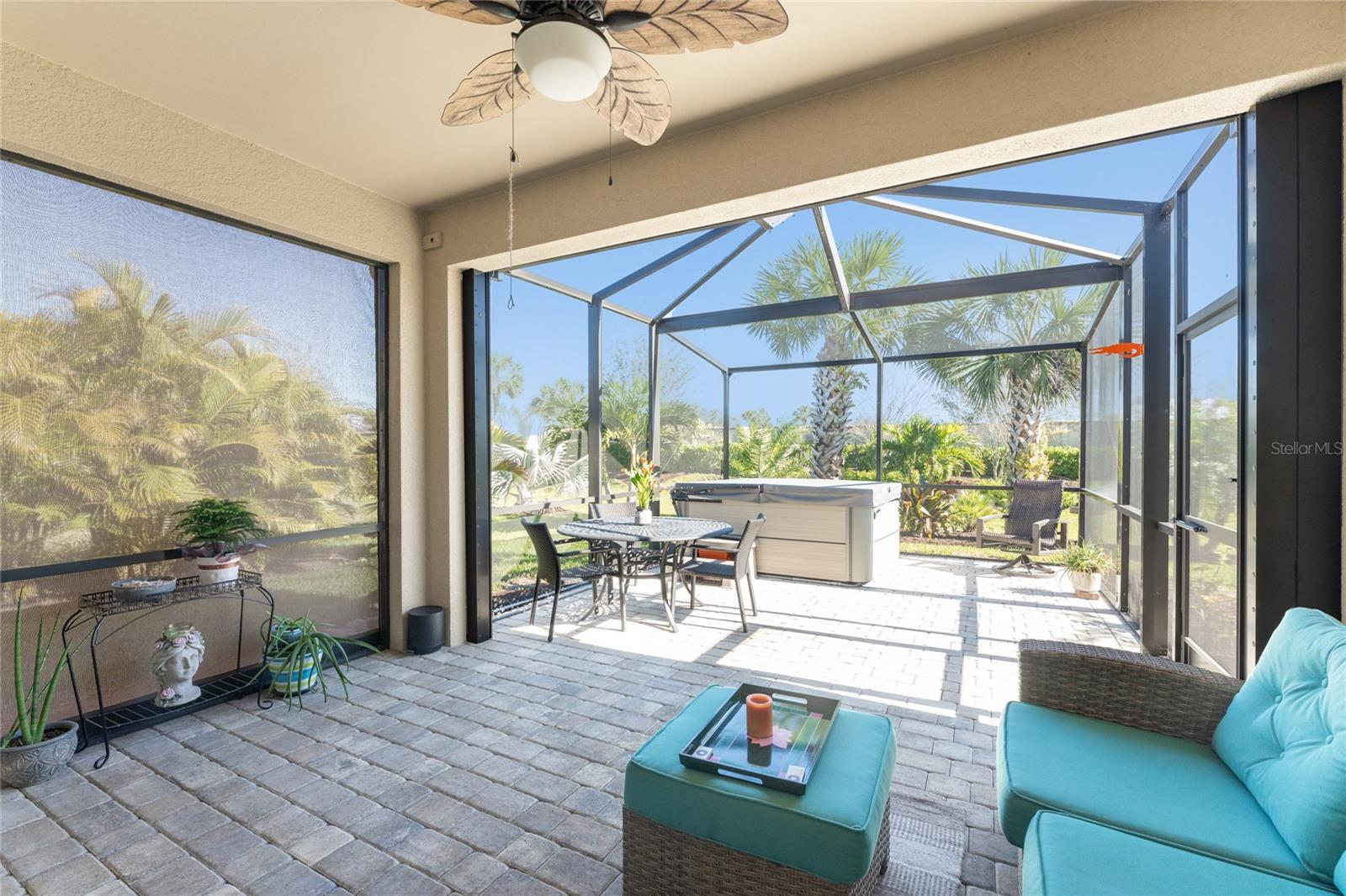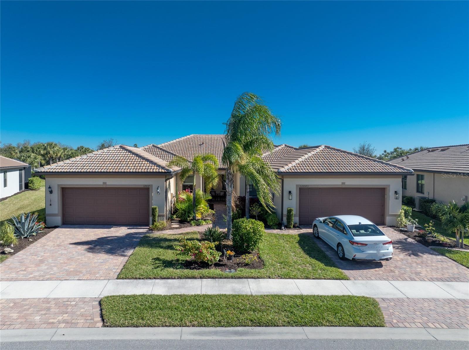 Welcome to Island Walk, an active, resort-style, maintenance-free community, located in the new town development, Wellen Park. Large rooms, boasting 1,611 square feet in this spacious villa. Split 2 bedroom, 2 bath, plus den/studio/bedroom. This home boasts a tile roof, brick paved driveway, and a front patio entrance with a lake view. Walk through the stunning front door designed with leaded glass and be greeted by a luxurious feel with the 9-foot ceiling giving way to a spacious layout. The extra wide 2-car garage with gray speckled epoxy flooring features a Rain Soft water filtration system, workbench, ceiling storage, storage racks and cupboards. Upon entry from the garage into the laundry room where you will find full-length shelf & cupboards along with the Smart Home control panel. Continuing into the home you will find a full bathroom to the left & bedroom to the right. Tiled bathtub shower & stone top vanity in the guest bath. A pantry supply closet can be found in the hallway. Farther up the hallway to the left, is a versatile den/guest/studio flex room with window & French doors add architectural interest. The kitchen boasts a two-tone modern kitchen twist with a suite of Whirlpool stainless steel appliances, Reverse Osmosis 3 filter water treatment, Quartz countertops with matching backsplash, 42” light gray upper & lower soft close cabinets, breakfast bar with pendant lighting, and pantry closet. The breakfast nook has been transformed with 42” white cabinets, mosaic tile backsplash, quartz snack bar/buffet seating. The kitchen is open to a spacious dining area and a great room with a recessed area for the entertainment center. Beautiful views with full wall-size sliding doors. Enter the primary bedroom suite with his & her closets (one walk-in with dresser). The bathroom features an elegant spa-like feel that showcases a walk-in shower with a frameless glass door, granite countertop vanity with dual sinks, and ample storage. Step out to the covered lanai, equipped with Storm Smart, remote control, hurricane-proof, rolling storm blinds. There is a double extended screened lanai looking out onto the custom-planted tree garden on this property. This exceptional front & backyard landscaping gives you your private paradise. Enjoy all this from your hot tub with privacy & serenity. An additional patio area is great for grilling. Plenty of room for the whole party. The vibrant Island Walk community provides endless opportunities for healthy lifestyle and social interaction. With three community clubhouses, fitness centers, resort style pools, lap pools, 2 full-time activity directors, newsletter with recreational/educational events. Bocce ball, pickleball, tennis, playground, dog park, community raised garden beds, boardwalk, extensive walking & biking trails & bridges. Golf cart friendly. Conveniently located near shopping, dining, and the Marketplace @ Wellen Park, this residence is just minutes away from historic downtown Venice and the beautiful beaches of Florida. Whether you're seeking a year-round residence, vacation home, or seasonal retreat, this property offers the perfect blend of luxury and convenience. Don't miss out on the opportunity to make this your new home!