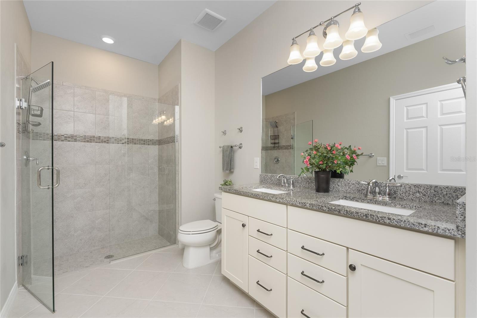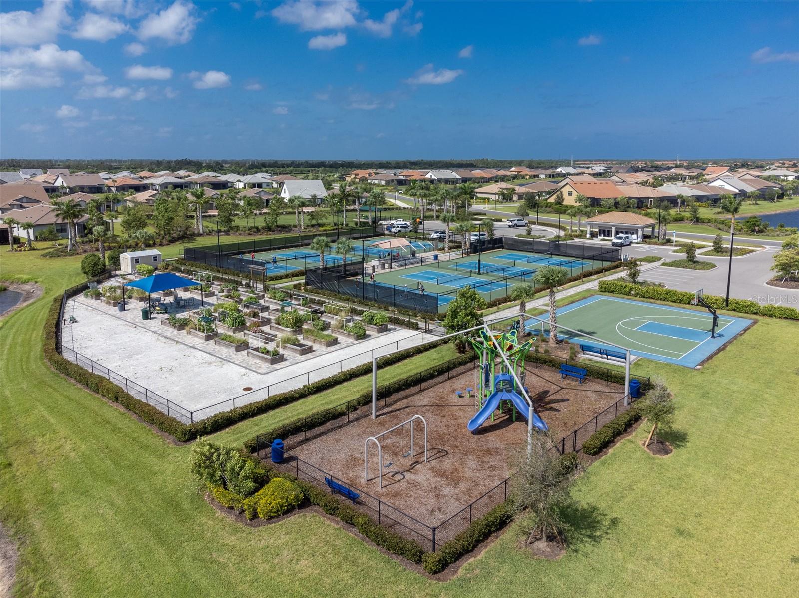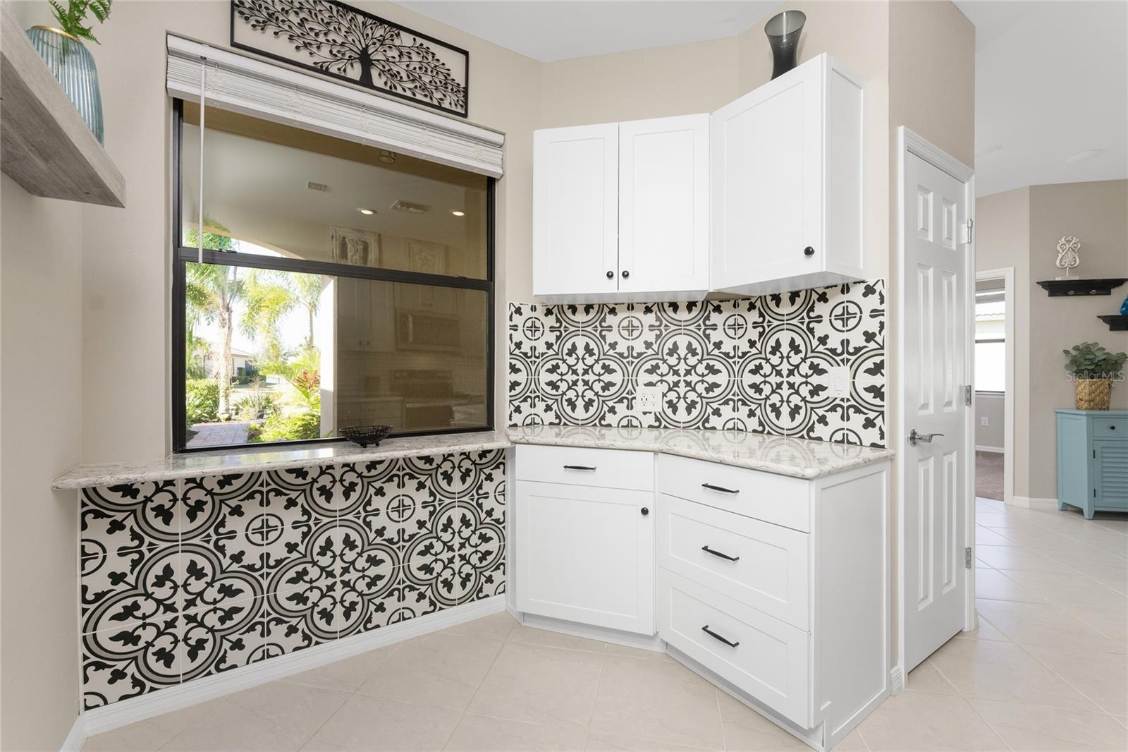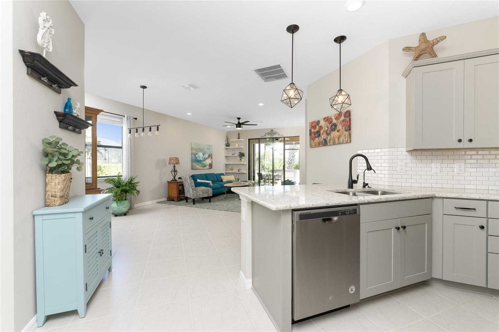 Welcome to Island Walk, an active, resort-style, maintenance-free community, located in the new town development, Wellen Park. Large rooms, boasting 1,611 square feet in this spacious villa. Split 2 bedroom, 2 bath, plus den/studio/bedroom. This home boasts a tile roof, brick paved driveway, and a front patio entrance with a lake view. Walk through the stunning front door designed with leaded glass and be greeted by a luxurious feel with the 9-foot ceiling giving way to a spacious layout. The extra wide 2-car garage with gray speckled epoxy flooring features a Rain Soft water filtration system, workbench, ceiling storage, storage racks and cupboards. Upon entry from the garage into the laundry room where you will find full-length shelf & cupboards along with the Smart Home control panel. Continuing into the home you will find a full bathroom to the left & bedroom to the right. Tiled bathtub shower & stone top vanity in the guest bath. A pantry supply closet can be found in the hallway. Farther up the hallway to the left, is a versatile den/guest/studio flex room with window & French doors add architectural interest. The kitchen boasts a two-tone modern kitchen twist with a suite of Whirlpool stainless steel appliances, Reverse Osmosis 3 filter water treatment, Quartz countertops with matching backsplash, 42” light gray upper & lower soft close cabinets, breakfast bar with pendant lighting, and pantry closet. The breakfast nook has been transformed with 42” white cabinets, mosaic tile backsplash, quartz snack bar/buffet seating. The kitchen is open to a spacious dining area and a great room with a recessed area for the entertainment center. Beautiful views with full wall-size sliding doors. Enter the primary bedroom suite with his & her closets (one walk-in with dresser). The bathroom features an elegant spa-like feel that showcases a walk-in shower with a frameless glass door, granite countertop vanity with dual sinks, and ample storage. Step out to the covered lanai, equipped with Storm Smart, remote control, hurricane-proof, rolling storm blinds. There is a double extended screened lanai looking out onto the custom-planted tree garden on this property. This exceptional front & backyard landscaping gives you your private paradise. Enjoy all this from your hot tub with privacy & serenity. An additional patio area is great for grilling. Plenty of room for the whole party. The vibrant Island Walk community provides endless opportunities for healthy lifestyle and social interaction. With three community clubhouses, fitness centers, resort style pools, lap pools, 2 full-time activity directors, newsletter with recreational/educational events. Bocce ball, pickleball, tennis, playground, dog park, community raised garden beds, boardwalk, extensive walking & biking trails & bridges. Golf cart friendly. Conveniently located near shopping, dining, and the Marketplace @ Wellen Park, this residence is just minutes away from historic downtown Venice and the beautiful beaches of Florida. Whether you're seeking a year-round residence, vacation home, or seasonal retreat, this property offers the perfect blend of luxury and convenience. Don't miss out on the opportunity to make this your new home!
