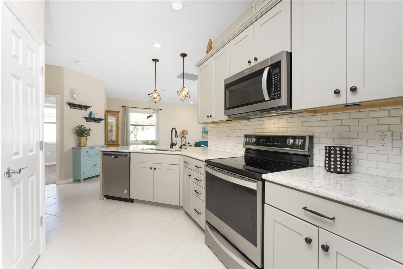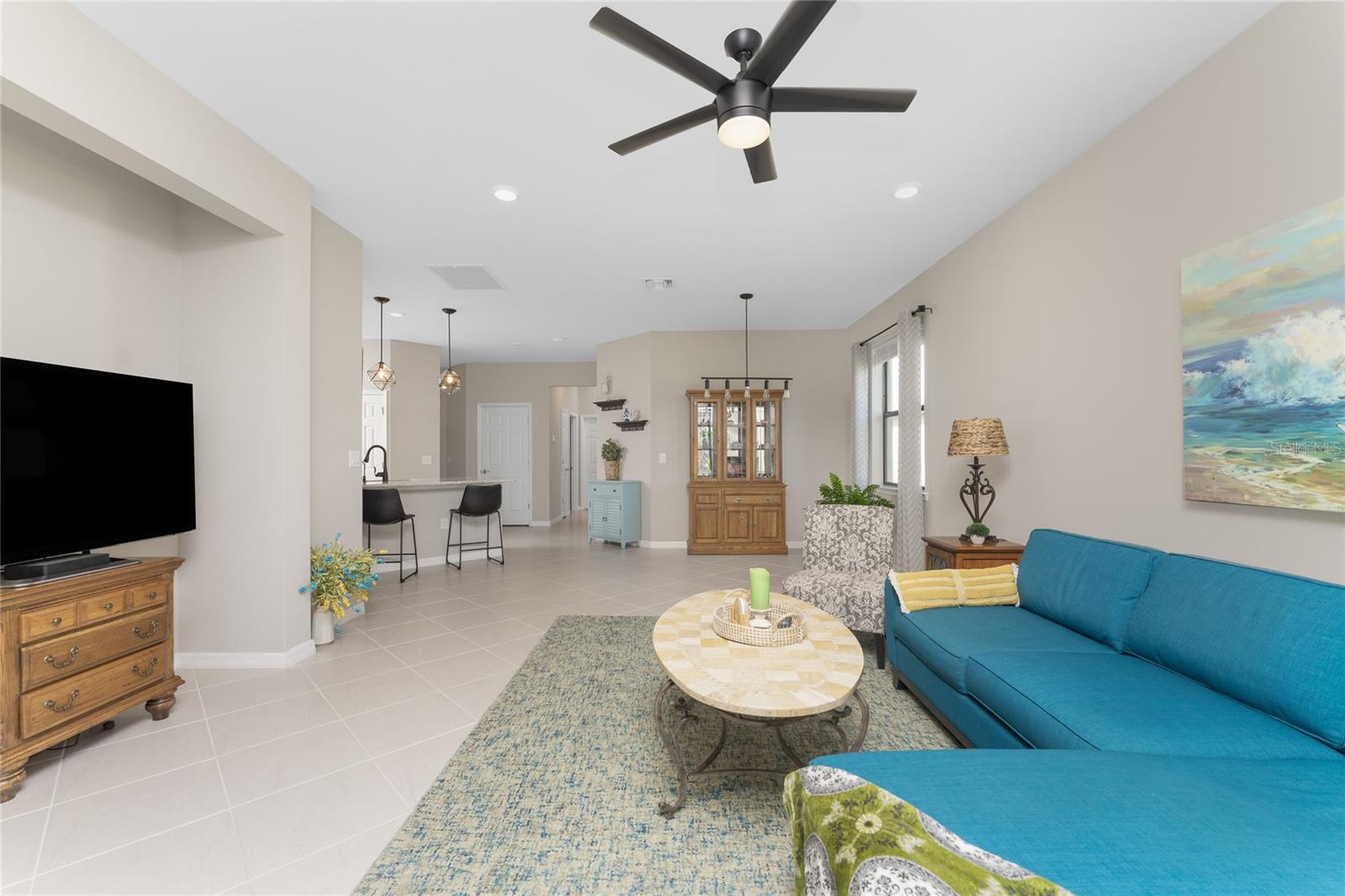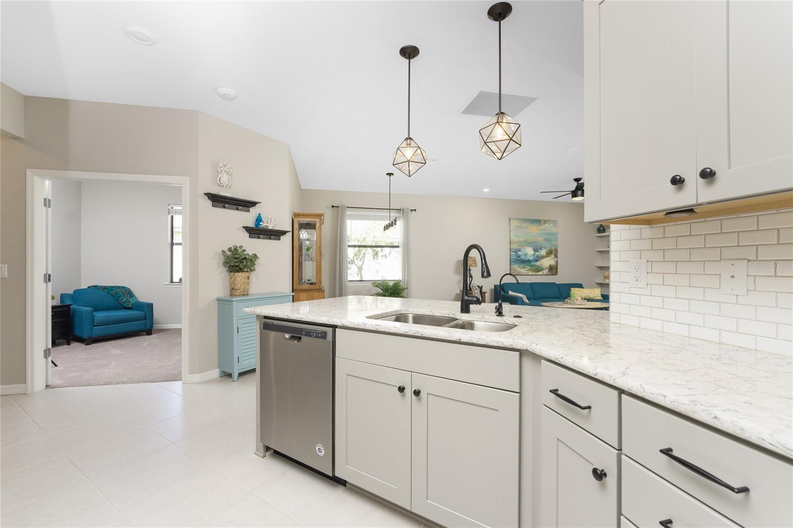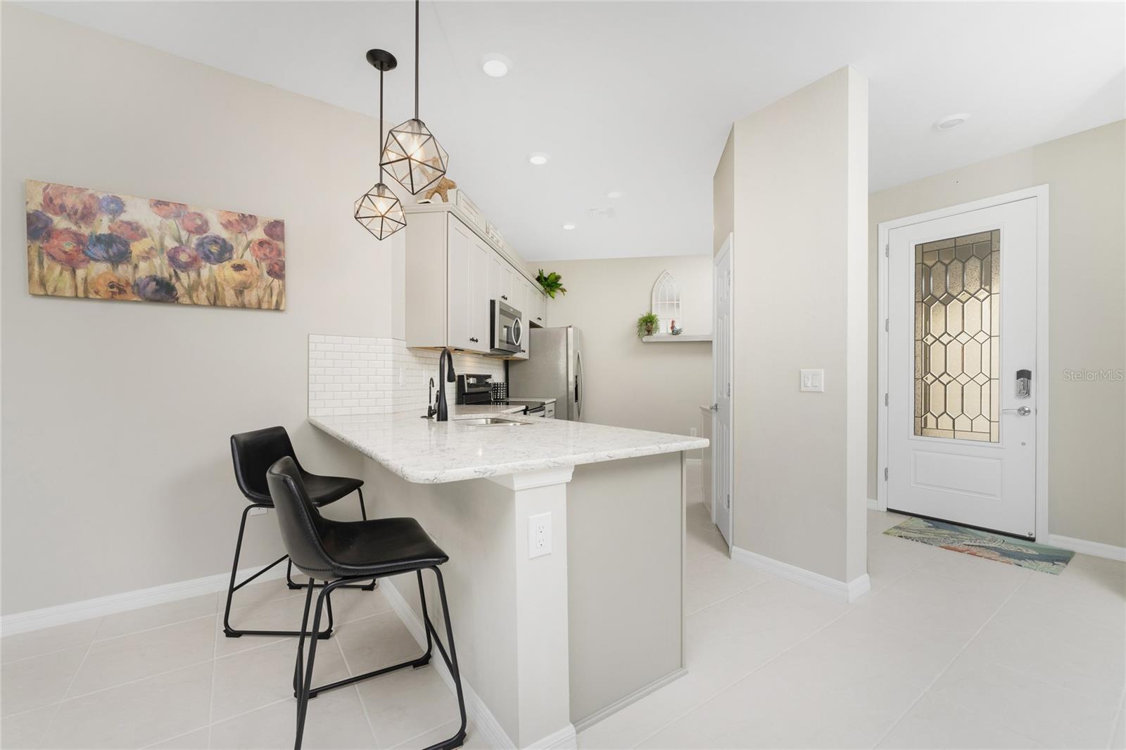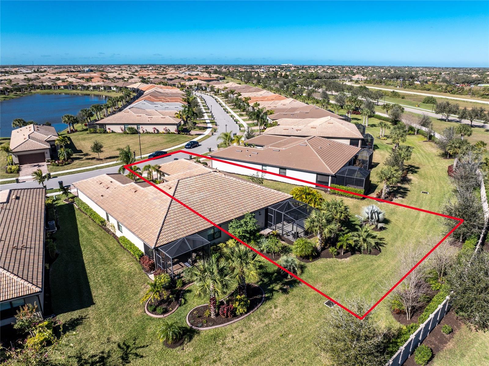 Welcome to Island Walk, an active, resort-style, maintenance-free community, located in the new town development, Wellen Park. Large rooms, boasting 1,611 square feet in this spacious villa. Split 2 bedroom, 2 bath, plus den/studio/bedroom. This home boasts a tile roof, brick paved driveway, and a front patio entrance with a lake view. Walk through the stunning front door designed with leaded glass and be greeted by a luxurious feel with the 9-foot ceiling giving way to a spacious layout. The extra wide 2-car garage with gray speckled epoxy flooring features a Rain Soft water filtration system, workbench, ceiling storage, storage racks and cupboards. Upon entry from the garage into the laundry room where you will find full-length shelf & cupboards along with the Smart Home control panel. Continuing into the home you will find a full bathroom to the left & bedroom to the right. Tiled bathtub shower & stone top vanity in the guest bath. A pantry supply closet can be found in the hallway. Farther up the hallway to the left, is a versatile den/guest/studio flex room with window & French doors add architectural interest. The kitchen boasts a two-tone modern kitchen twist with a suite of Whirlpool stainless steel appliances, Reverse Osmosis 3 filter water treatment, Quartz countertops with matching backsplash, 42” light gray upper & lower soft close cabinets, breakfast bar with pendant lighting, and pantry closet. The breakfast nook has been transformed with 42” white cabinets, mosaic tile backsplash, quartz snack bar/buffet seating. The kitchen is open to a spacious dining area and a great room with a recessed area for the entertainment center. Beautiful views with full wall-size sliding doors. Enter the primary bedroom suite with his & her closets (one walk-in with dresser). The bathroom features an elegant spa-like feel that showcases a walk-in shower with a frameless glass door, granite countertop vanity with dual sinks, and ample storage. Step out to the covered lanai, equipped with Storm Smart, remote control, hurricane-proof, rolling storm blinds. There is a double extended screened lanai looking out onto the custom-planted tree garden on this property. This exceptional front & backyard landscaping gives you your private paradise. Enjoy all this from your hot tub with privacy & serenity. An additional patio area is great for grilling. Plenty of room for the whole party. The vibrant Island Walk community provides endless opportunities for healthy lifestyle and social interaction. With three community clubhouses, fitness centers, resort style pools, lap pools, 2 full-time activity directors, newsletter with recreational/educational events. Bocce ball, pickleball, tennis, playground, dog park, community raised garden beds, boardwalk, extensive walking & biking trails & bridges. Golf cart friendly. Conveniently located near shopping, dining, and the Marketplace @ Wellen Park, this residence is just minutes away from historic downtown Venice and the beautiful beaches of Florida. Whether you're seeking a year-round residence, vacation home, or seasonal retreat, this property offers the perfect blend of luxury and convenience. Don't miss out on the opportunity to make this your new home!