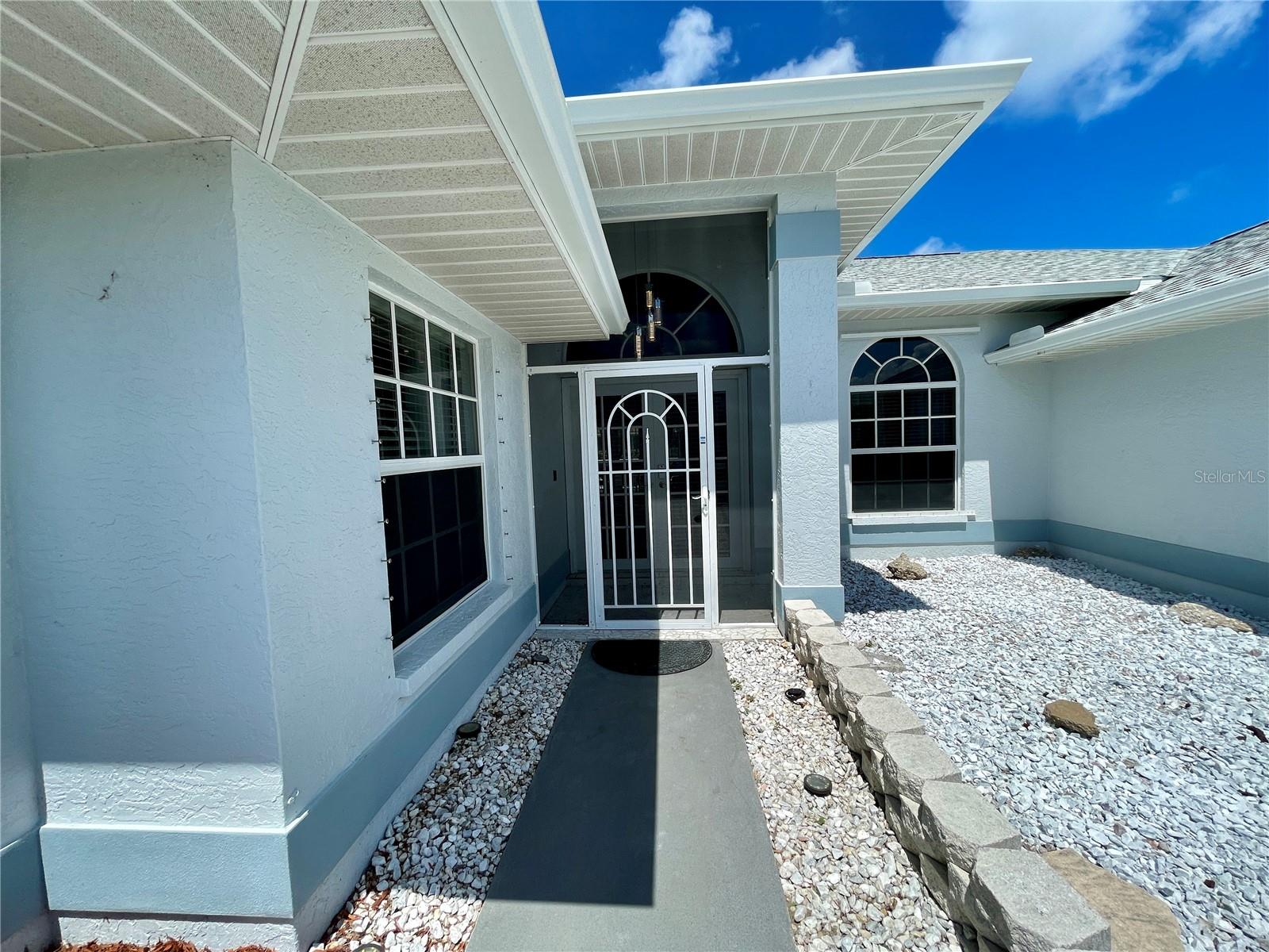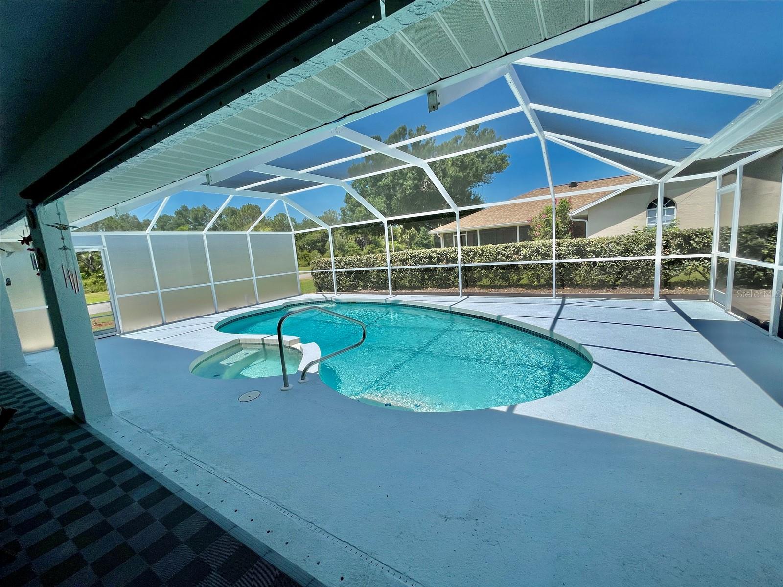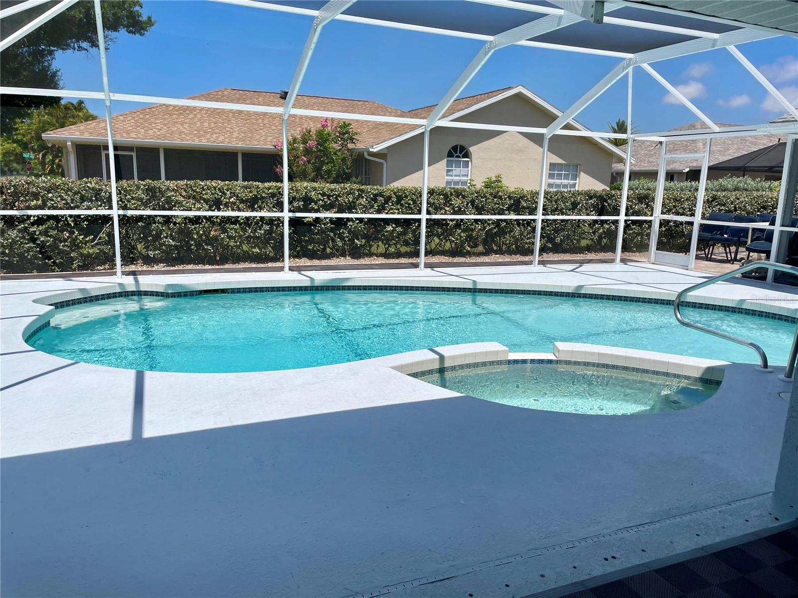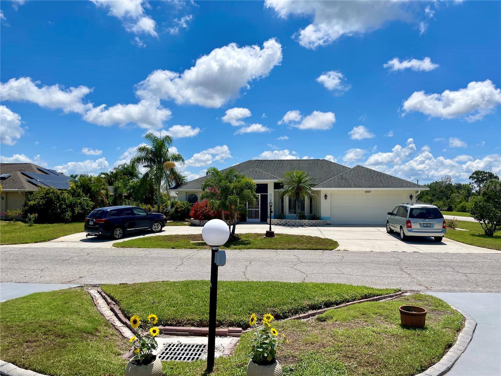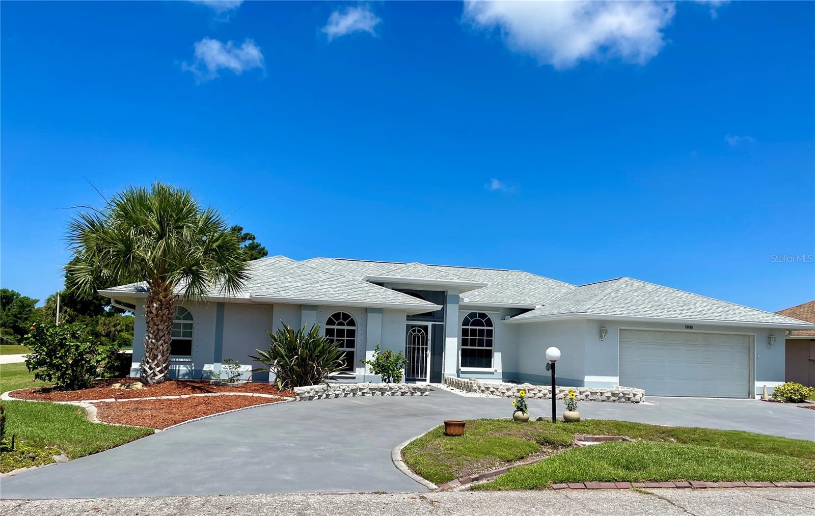Beautifully updated home located in desirable Gulf View Estates is waiting for you to take a peek and fall in love! This 4 bed, 2 1/2 bath, 2,415sf home with an oversized 2 car garage is located just 2 miles from Manasota Beach, boating, fishing, close to shopping, restaurants and quaint downtown Venice and Englewood, bike trails, parks, golf, excellent schools, and so much more! There is tile throughout, freshly painted interior and exterior, fans in almost every room, updated light fixtures, cathedral ceilings in the main living area, wired with mesh routers making this a smart home, solar panels over the storage space along the north side of the home that collects power to be used with a transfer general hookup located in the garage to keep the refrigerator running in an outage, skylights, hurricane windows and doors (also has shutters) new roof, garage door opener, and granite lock resurfaced driveway are just a few updates done to this lovely home. The front entry is screened. The living room has a 178" screen projection TV that conveys with the home, and sliders that look out to the outdoor living space. The dining room is to the right of the foyer. The 2nd bedroom has a large closet and windows that face the front yard. The Huge master bedroom occupies the south side of the home. It has sliders out to the lanai, a mini split a/c system keeps the master bedroom cool and is energy efficient. The owner states it saves them approx. $200 a month. There are 2 walk-in closets, and a linen closet. The updated master bathroom has it's own hot water heater, 2 sinks, large hidden medicine cabinet, garden tub and walk in shower. The recently updated kitchen has beautiful white and gray Corian counters, stainless appliances (dishwasher & range replaced 2024, refrigerator and microwave 2021). The dinette is part of the kitchen and sits next to the sliders out to the pool. The laundry room has plenty of room for additional storage, the washer and dryer were replaced in 2022. The Family room is open to the kitchen. It also has sliders out to the lanai. The guest side of the home has a pocket door, allowing for privacy. The 3rd and 4th bedrooms are comfortable sized rooms that are divided by the newly updated guest bathroom. There is a walk in shower and large vanity. The outdoor living space has a natural fence for privacy along the back of the lot. There is privacy screening on the street side of the cage and a patio area outside of the cage. There is a pool bath accessible on the lanai, an outside shower and sink on the pool deck. The recently resurfaced pool/spa is heated. There is lots of room under roof as well as under cage to enjoy your little piece of paradise. The pool is perfect to relax or have fun with family and friends! The bedroom TV's and garage refrigerator don't convey with the home.