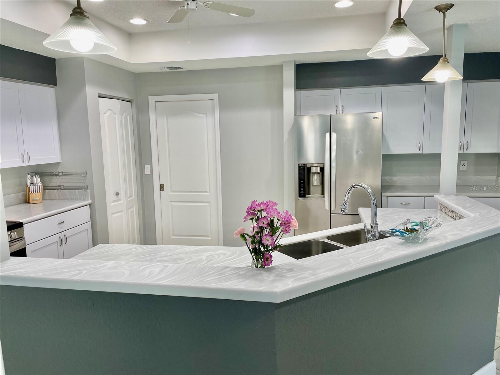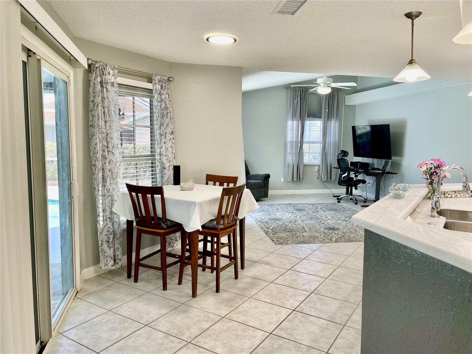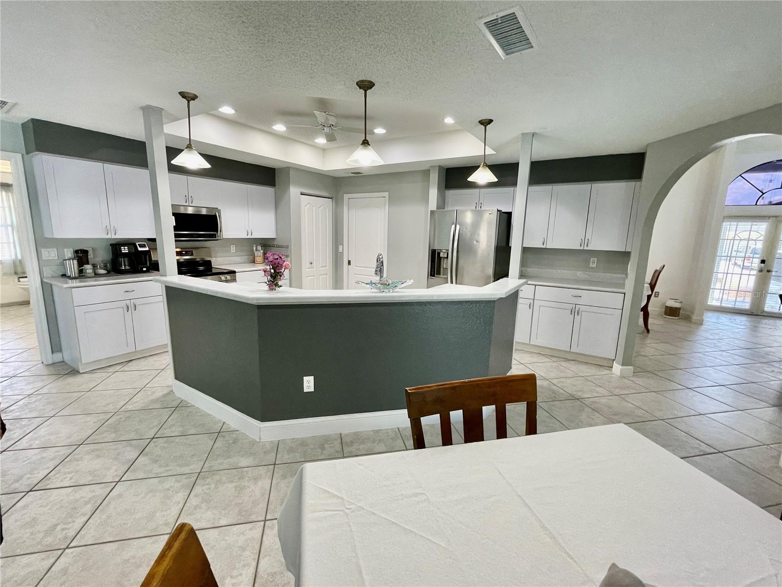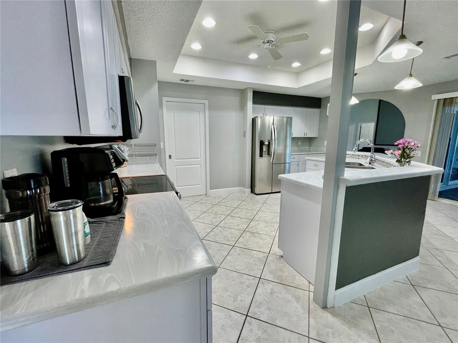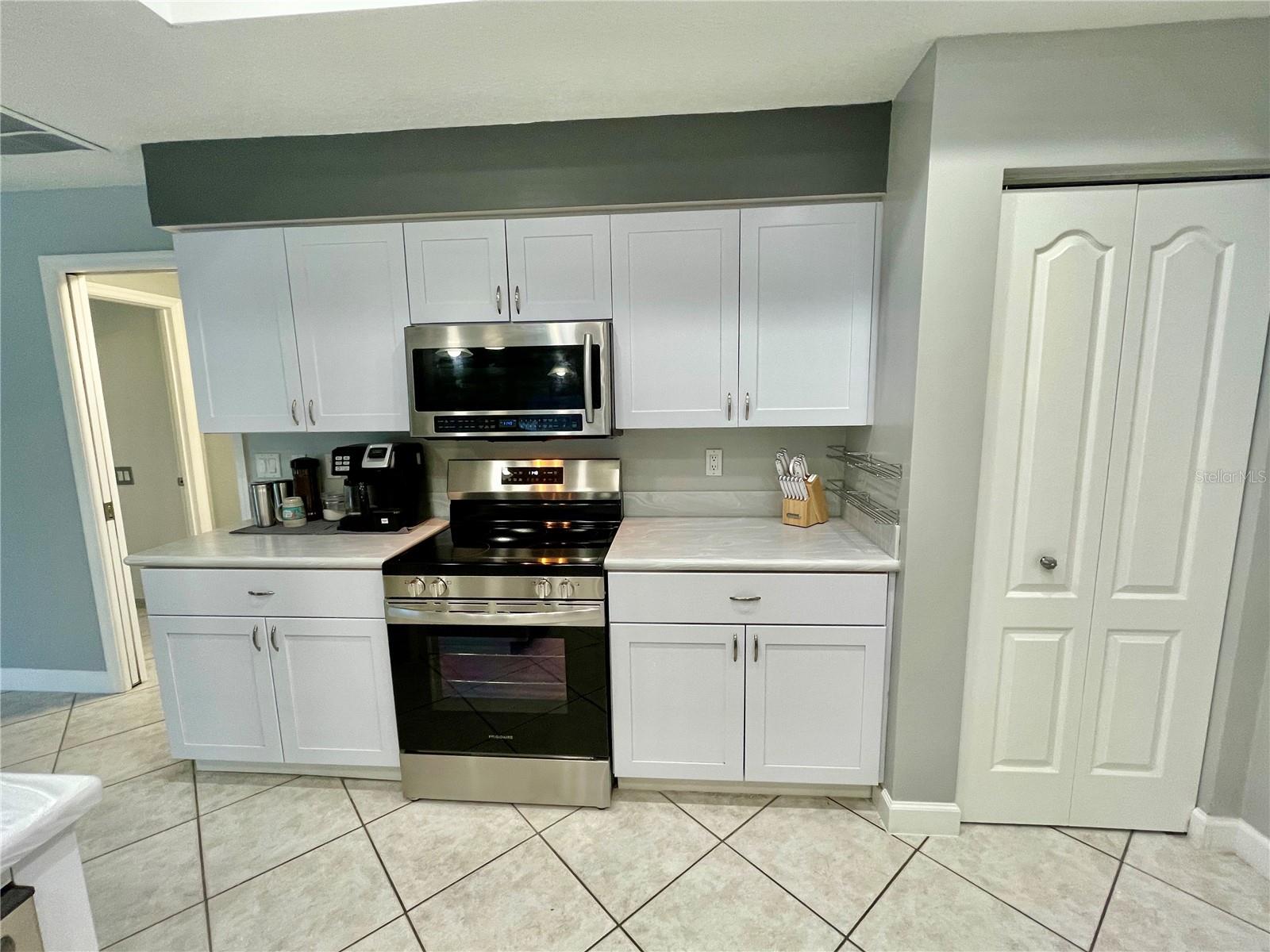 Beautifully updated home located in desirable Gulf View Estates is waiting for you to take a peek and fall in love! This 4 bed, 2 1/2 bath, 2,415sf home with an oversized 2 car garage is located just 2 miles from Manasota Beach, boating, fishing, close to shopping, restaurants and quaint downtown Venice and Englewood, bike trails, parks, golf, excellent schools, and so much more! There is tile throughout, freshly painted interior and exterior, fans in almost every room, updated light fixtures, cathedral ceilings in the main living area, wired with mesh routers making this a smart home, solar panels over the storage space along the north side of the home that collects power to be used with a transfer general hookup located in the garage to keep the refrigerator running in an outage, skylights, hurricane windows and doors (also has shutters) new roof, garage door opener, and granite lock resurfaced driveway are just a few updates done to this lovely home. The front entry is screened. The living room has a 178" screen projection TV that conveys with the home, and sliders that look out to the outdoor living space. The dining room is to the right of the foyer. The 2nd bedroom has a large closet and windows that face the front yard. The Huge master bedroom occupies the south side of the home. It has sliders out to the lanai, a mini split a/c system keeps the master bedroom cool and is energy efficient. The owner states it saves them approx. $200 a month. There are 2 walk-in closets, and a linen closet. The updated master bathroom has it's own hot water heater, 2 sinks, large hidden medicine cabinet, garden tub and walk in shower. The recently updated kitchen has beautiful white and gray Corian counters, stainless appliances (dishwasher & range replaced 2024, refrigerator and microwave 2021). The dinette is part of the kitchen and sits next to the sliders out to the pool. The laundry room has plenty of room for additional storage, the washer and dryer were replaced in 2022. The Family room is open to the kitchen. It also has sliders out to the lanai. The guest side of the home has a pocket door, allowing for privacy. The 3rd and 4th bedrooms are comfortable sized rooms that are divided by the newly updated guest bathroom. There is a walk in shower and large vanity. The outdoor living space has a natural fence for privacy along the back of the lot. There is privacy screening on the street side of the cage and a patio area outside of the cage. There is a pool bath accessible on the lanai, an outside shower and sink on the pool deck. The recently resurfaced pool/spa is heated. There is lots of room under roof as well as under cage to enjoy your little piece of paradise. The pool is perfect to relax or have fun with family and friends! The bedroom TV's and garage refrigerator don't convey with the home.