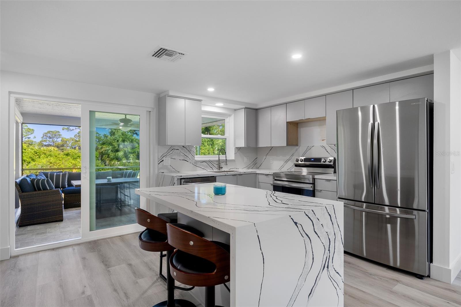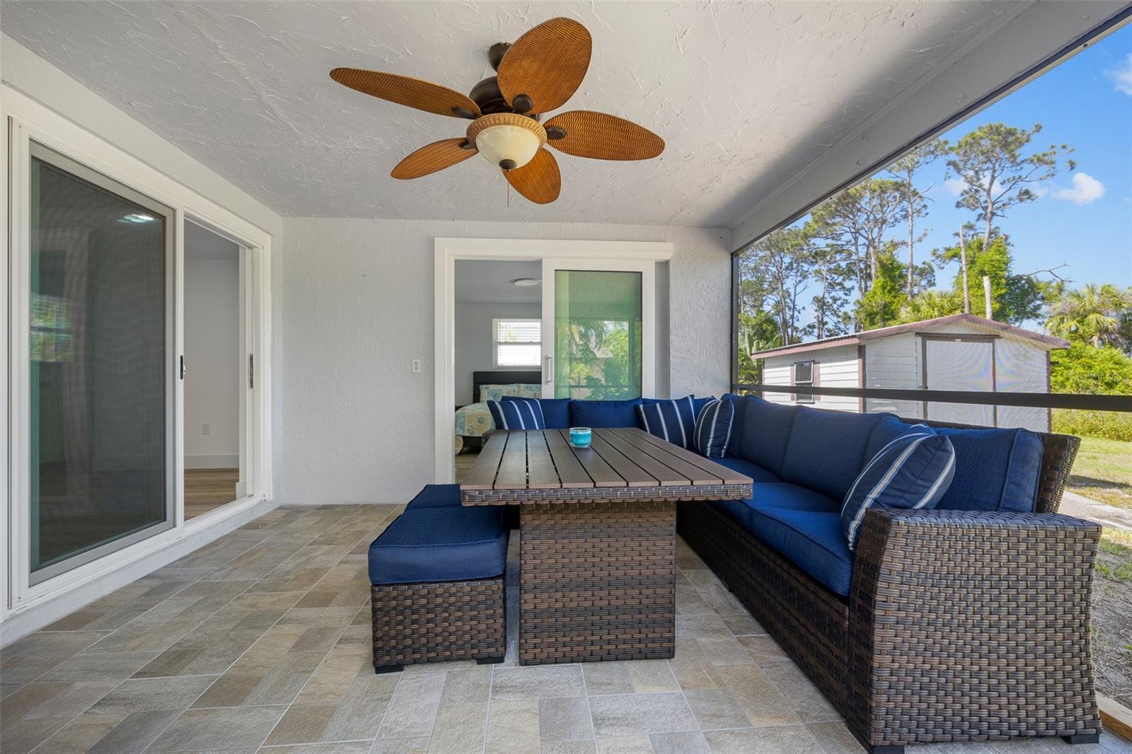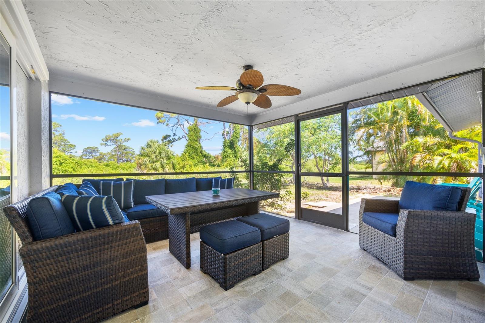 FANTASTIC LOCATION! FURNISHED! UPDATED 3 bedroom, 2 bath, 1-car garage home with back access, within walking distance, to Legacy Trail and docks on the intercoastal. Plenty of privacy provided by greenbelt and park with true western exposure to enjoy amazing sunsets. Seller upgrades include new impact windows, doors and sliders, hot water heater, HVAC, PEX repipe for entire home, well softener, luxury vinyl plank flooring, kitchen with quartz counters, waterfall kitchen island and stainless appliances, updated baths, tiled flooring and new screens on lanai plus new ceilings in living room and garage. Inviting open floor plan features living room with bay window, remodeled kitchen with breakfast bar and slider to lanai, primary bedroom with walk-in closet and access to lanai, two updated baths with new vanities and walk-in showers and nicely sized guest bedrooms. Enjoy entertaining guests on the covered screened lanai overlooking the large backyard with serene preserve views. There is also an outdoor shed with electric for workshop or additional storage, plenty of space for pets to roam and room for a pool. No building behind the property will preserve the serene nature and wildlife views. Great neighborhood within walking distance to Shamrock Park and Nature Center offering docks, kayak launch, water where dogs can play and swim, playground, tennis, basketball, bicycling and hiking along the Venetian Waterway and Legacy Trail. Close to Venice Island, restaurants, shopping and outdoor events. South Venice Beach Ferry is only 5 minutes away! Don’t miss this incredible opportunity! Schedule your private showing today!
