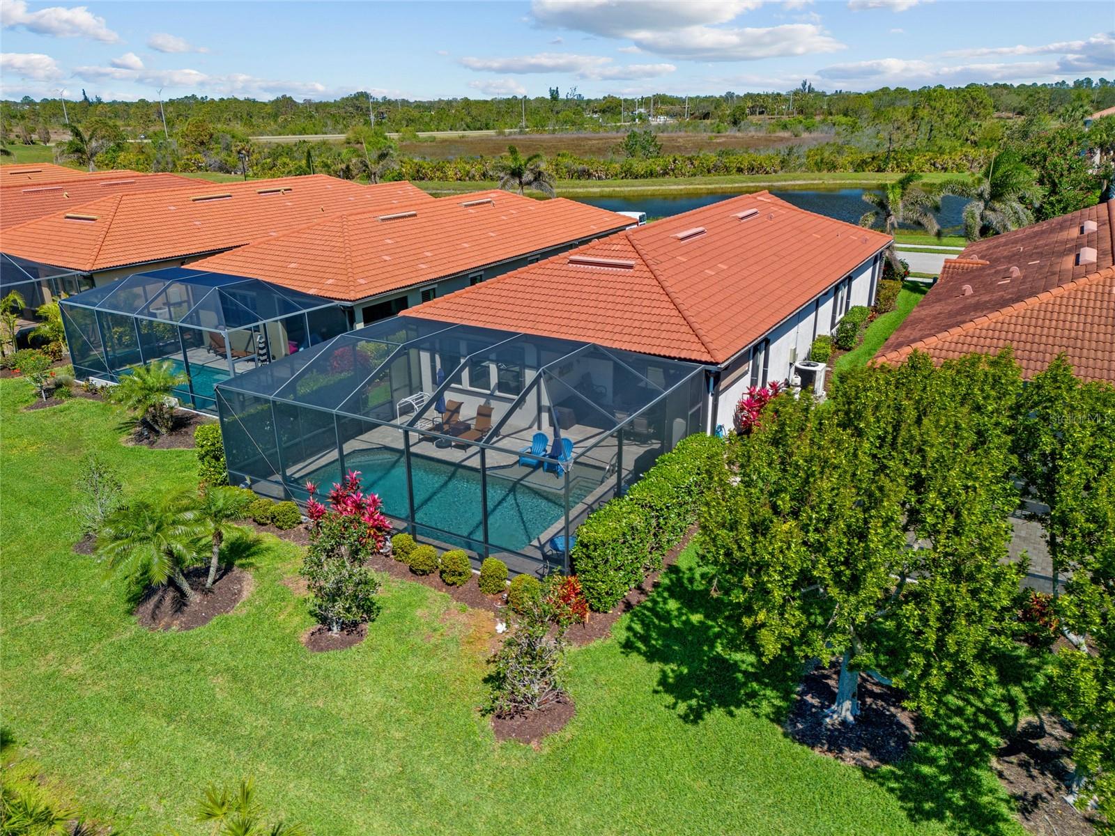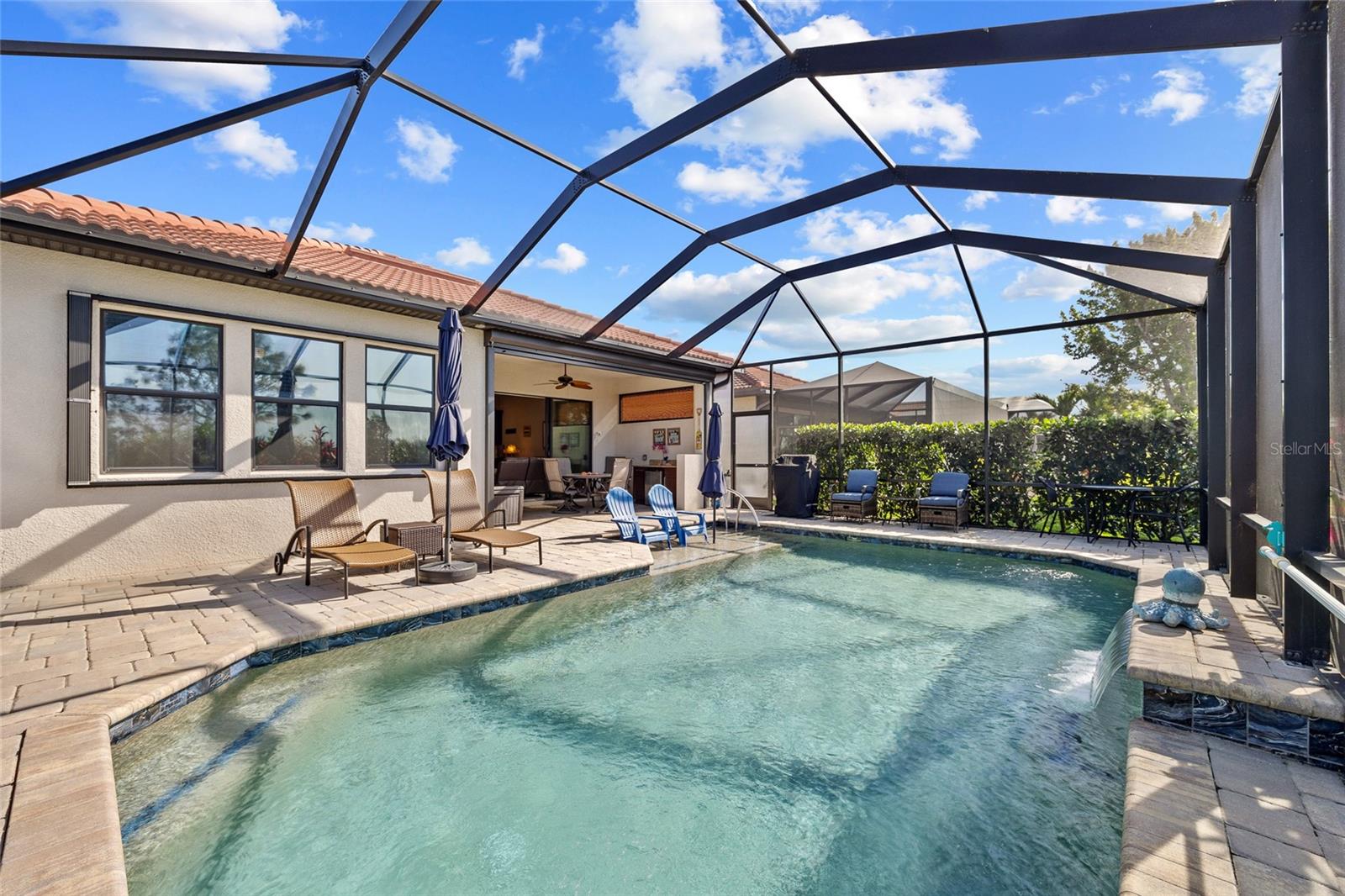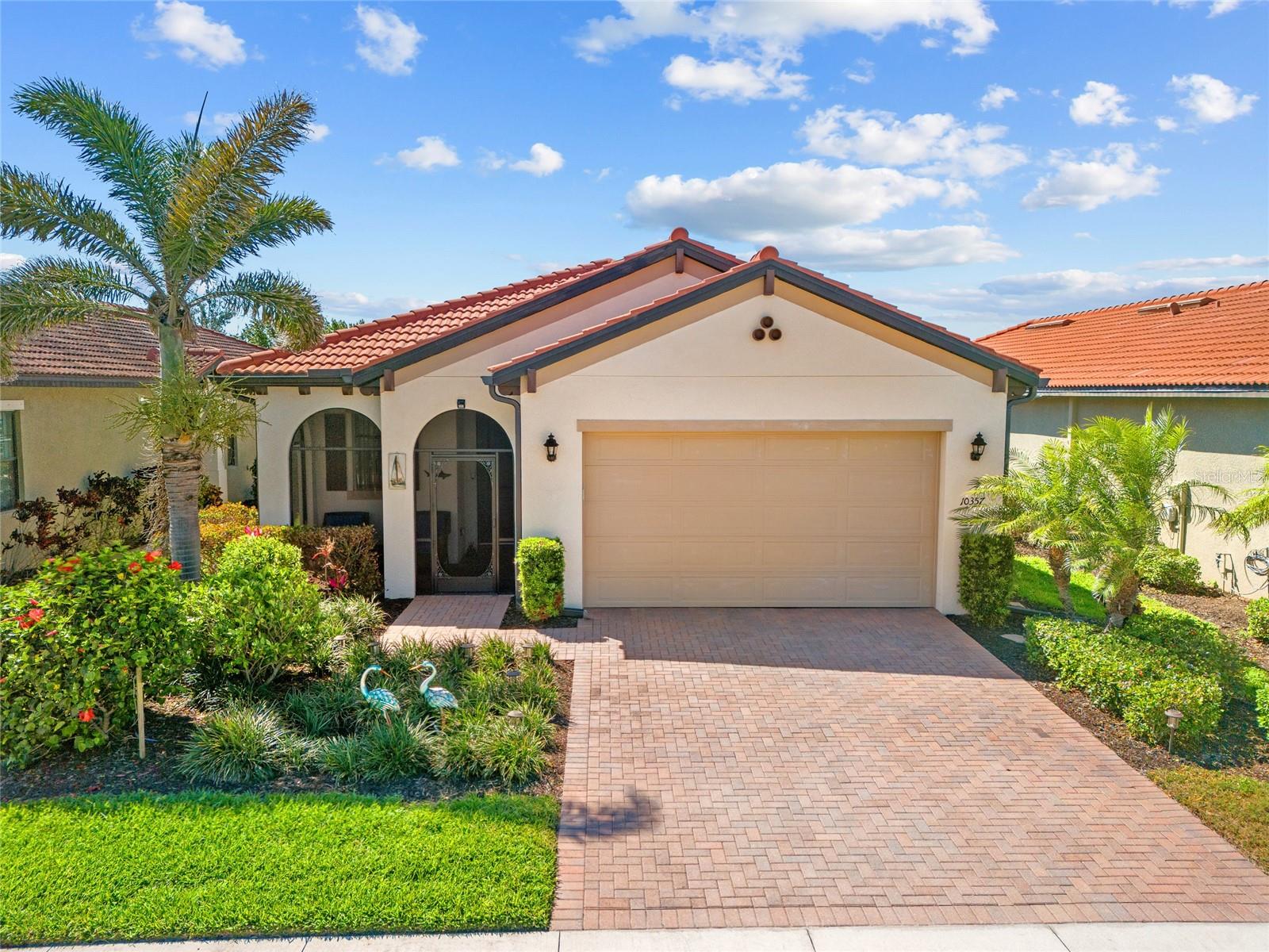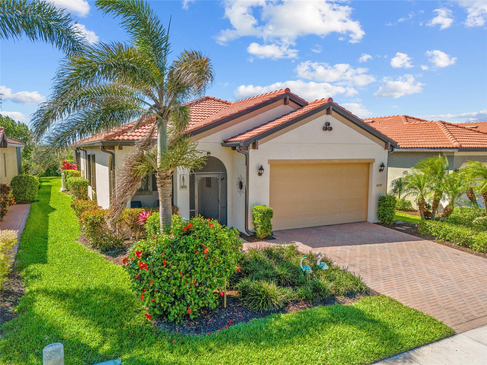 Gated golf community of Sarasota National! Just new to the market is this beautiful WCI-built home in Lake Village featuring 2 bedrooms and 2 baths with a den that can be used as a third bedroom. This home has one of the best views on Crooked Creek Dr. with an unobstructed lake view in front from the screened in Loggia, best preserve view from back lanai plus property is surrounded by upgraded landscaping. Inviting floor plan features high ceilings, arched entryway, neutral décor, an abundance of natural light, maintenance free tile flooring throughout most of home, formal living room, French door to den/dining room and open kitchen and family room with large slider to lanai. The well-equipped kitchen offers upgraded soft-close cabinetry, high-end granite, tile backsplash, stainless appliances and large center island with breakfast bar. The primary bedroom offers luxury vinyl tile, his and her closets customized by “Closets By Design” and private ensuite with dual sinks and glass walk-in shower. The outdoor entertaining area features covered lanai, screened custom saltwater pool with loads of upgrades-including sun shelf, waterfalls with bench, and upgraded pool tiles, plus an outdoor kitchen with sink and refrigerator. True southern exposure so guests from the north can enjoy plenty of Florida sunshine while relaxing by the pool. For storm protection, there is a motorized Storm Smart Shutter for lanai and accordion shutters for rest of home. Additional features include Verona stone counters in baths, guest full bath with glass shower doors, upgraded inside laundry and 2-car garage with ceiling rack storage. HOA fee includes lawn and landscape maintenance. Sarasota National features a host of fabulous amenities including resort style pool and spa, Tiki bar and restaurant, pickleball, bocce ball, tennis courts plus a host of social amenities to meet your neighbors. Great location close to US-41, restaurants, shopping, schools, parks and a short drive to fishing, boating, Manasota Key and Venice beaches. This beautiful home will not last long. Schedule your private showing today!