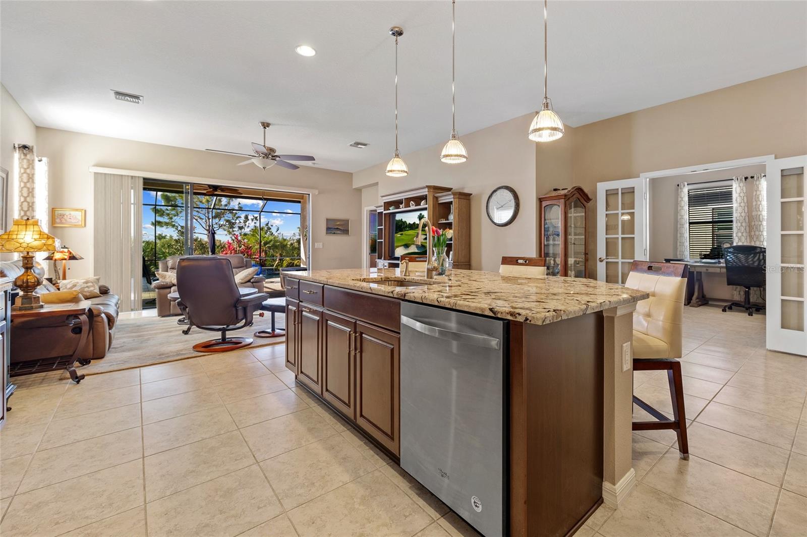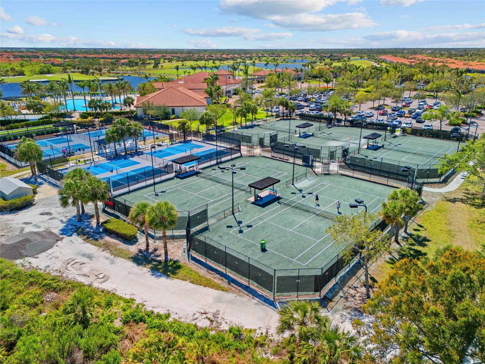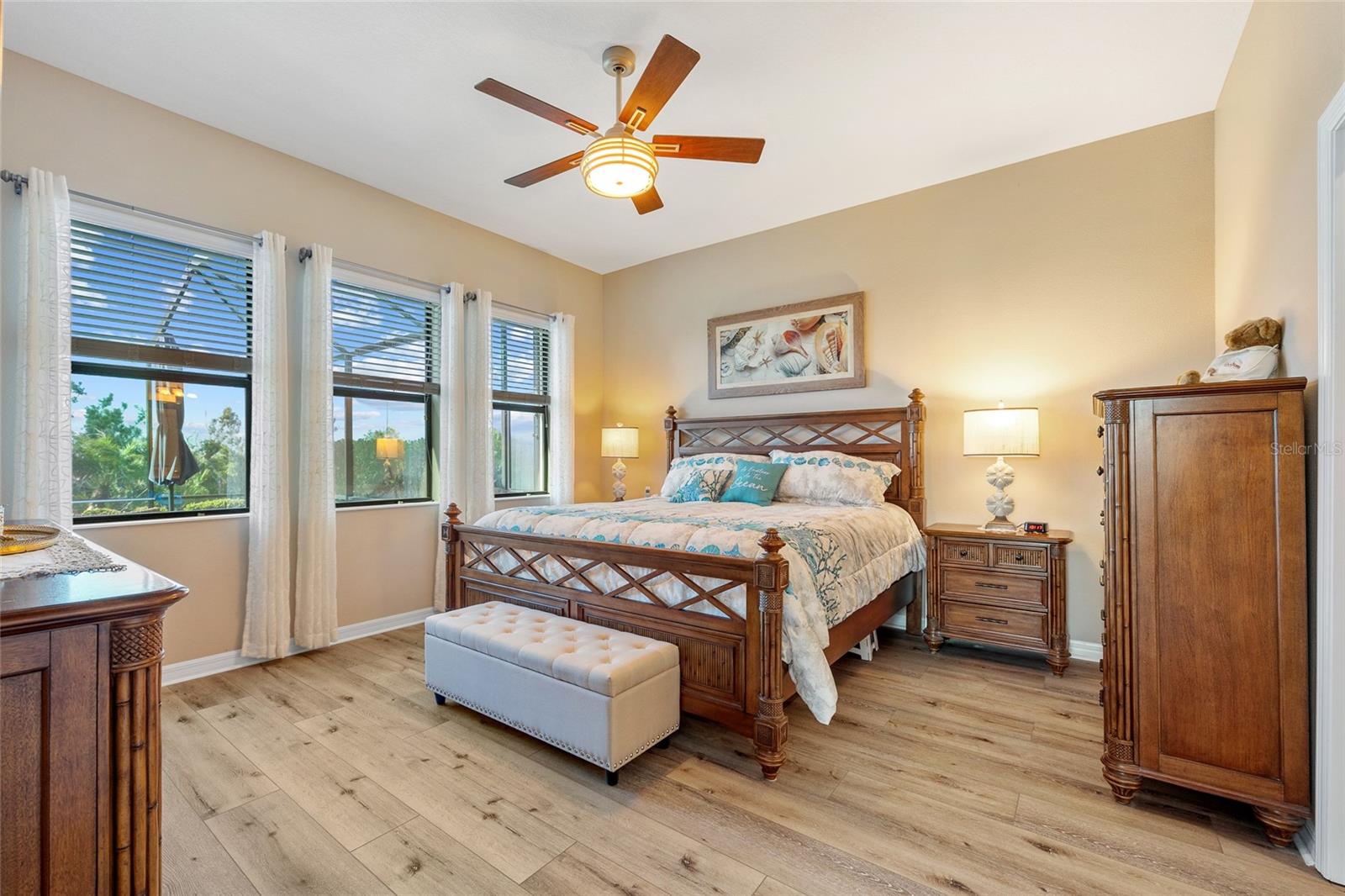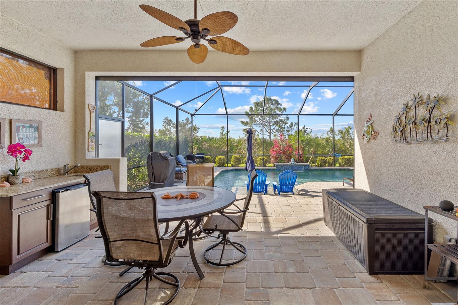 Gated golf community of Sarasota National! Just new to the market is this beautiful WCI-built home in Lake Village featuring 2 bedrooms and 2 baths with a den that can be used as a third bedroom. This home has one of the best views on Crooked Creek Dr. with an unobstructed lake view in front from the screened in Loggia, best preserve view from back lanai plus property is surrounded by upgraded landscaping. Inviting floor plan features high ceilings, arched entryway, neutral décor, an abundance of natural light, maintenance free tile flooring throughout most of home, formal living room, French door to den/dining room and open kitchen and family room with large slider to lanai. The well-equipped kitchen offers upgraded soft-close cabinetry, high-end granite, tile backsplash, stainless appliances and large center island with breakfast bar. The primary bedroom offers luxury vinyl tile, his and her closets customized by “Closets By Design” and private ensuite with dual sinks and glass walk-in shower. The outdoor entertaining area features covered lanai, screened custom saltwater pool with loads of upgrades-including sun shelf, waterfalls with bench, and upgraded pool tiles, plus an outdoor kitchen with sink and refrigerator. True southern exposure so guests from the north can enjoy plenty of Florida sunshine while relaxing by the pool. For storm protection, there is a motorized Storm Smart Shutter for lanai and accordion shutters for rest of home. Additional features include Verona stone counters in baths, guest full bath with glass shower doors, upgraded inside laundry and 2-car garage with ceiling rack storage. HOA fee includes lawn and landscape maintenance. Sarasota National features a host of fabulous amenities including resort style pool and spa, Tiki bar and restaurant, pickleball, bocce ball, tennis courts plus a host of social amenities to meet your neighbors. Great location close to US-41, restaurants, shopping, schools, parks and a short drive to fishing, boating, Manasota Key and Venice beaches. This beautiful home will not last long. Schedule your private showing today!