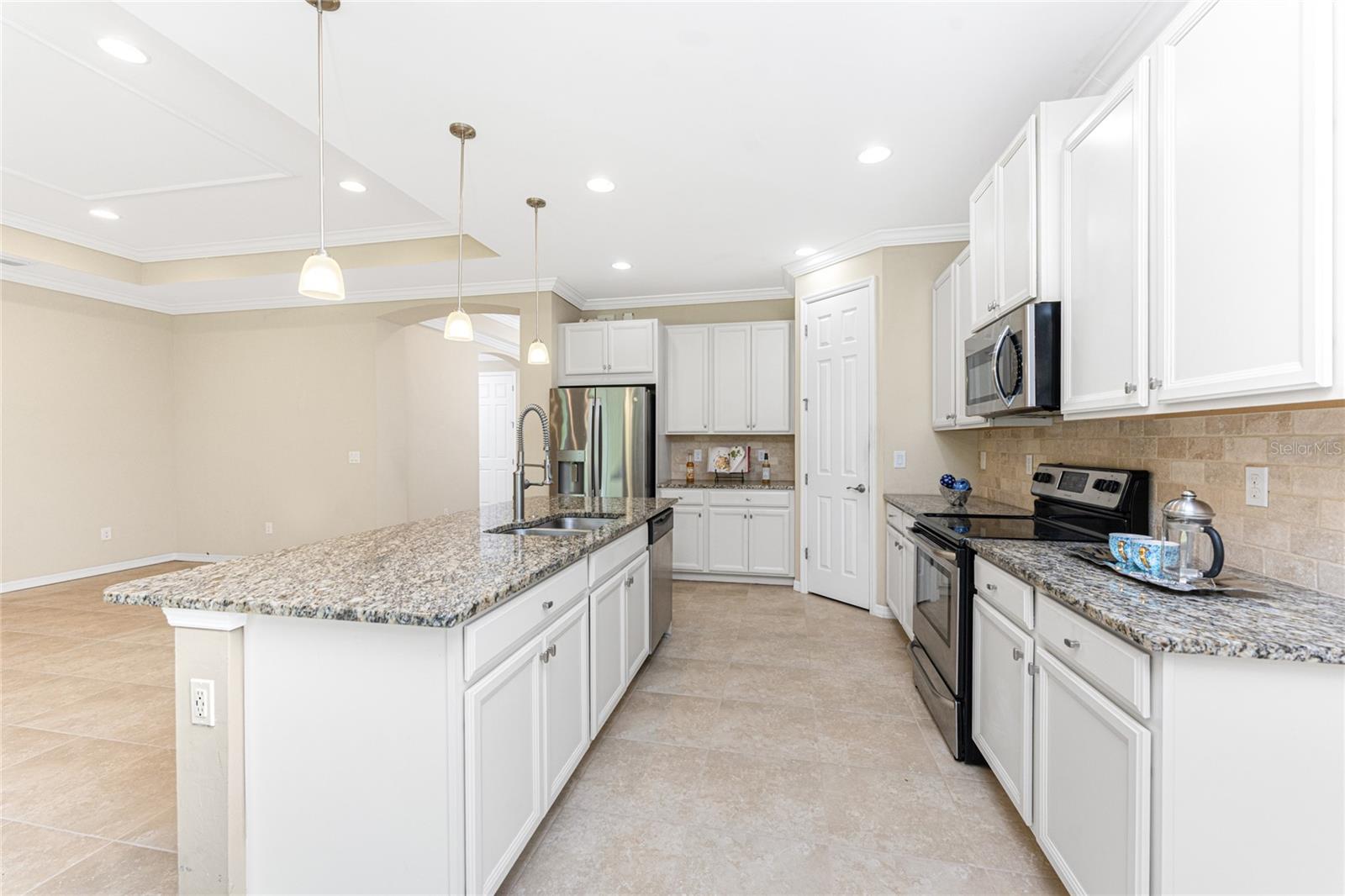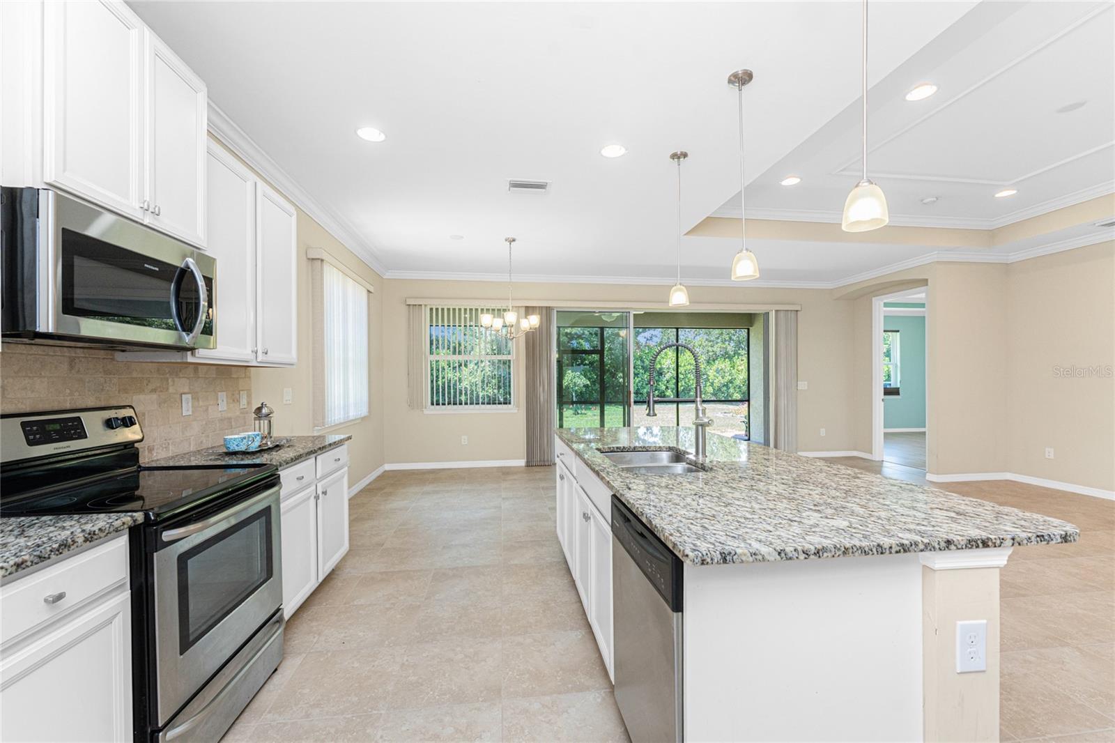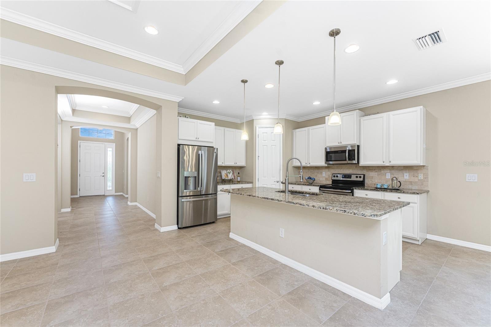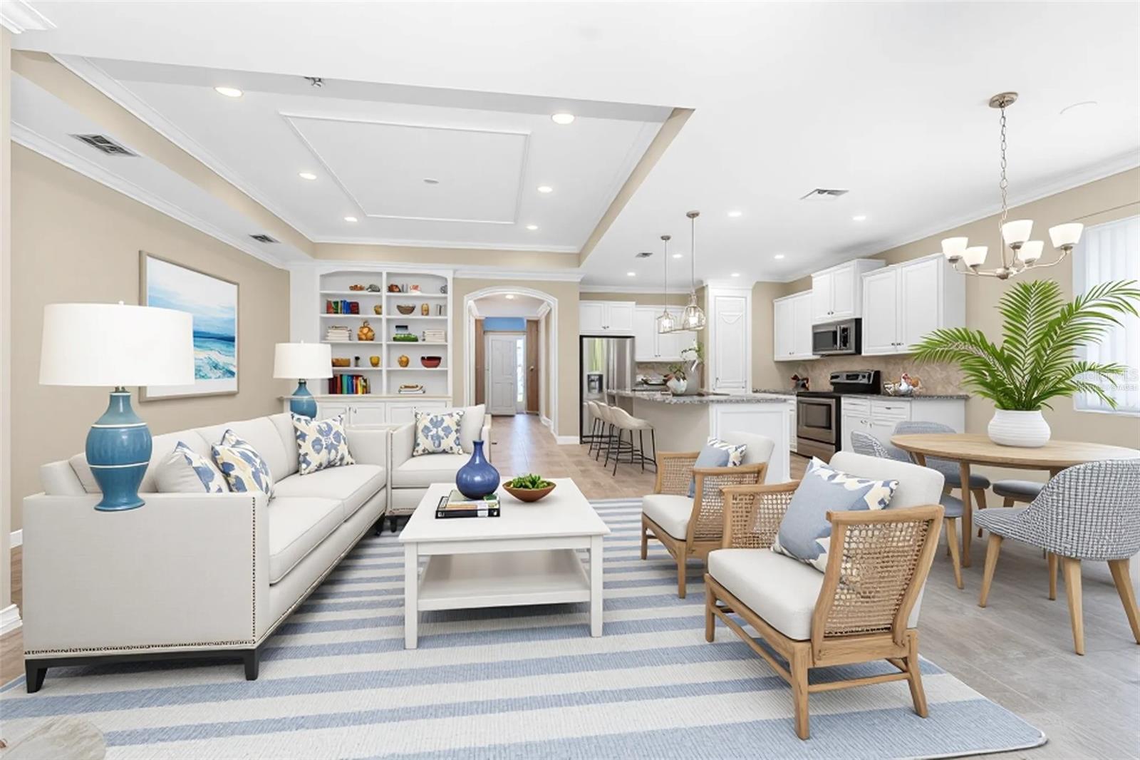 Welcome to this beautifully upgraded custom Edison model by DR Horton, offering 1,984 square feet under air with 3 spacious bedrooms, a versatile office/den, and 2 full bathrooms. Located in a highly sought-after area of Venice in the gated community of Carribbean Village - just minutes from Wellen Park, world-class beaches, and charming downtown Venice with its vibrant restaurants and boutique shops. Step through the elegant double-arched entryway into a home that exudes style and sophistication. The soaring 9'4" tray ceilings in the entry hall, great room, primary suite, and both bathrooms create an airy, open feel, further elevated by custom crown molding throughout. Every detail has been carefully considered—from the brick-pavered driveway and front entry to the lovely brick-pavered lanai, perfect for relaxing with a serene private garden view. The home features tile flooring throughout, with laminate floors in the primary and guest bedrooms for added comfort and style. The spacious kitchen is a chef’s dream with wood cabinetry, granite countertops, tiled backsplash, and stainless steel appliances—including a 2023 refrigerator and 2024 microwave. The primary ensuite is a true retreat, featuring a double sink wood vanity, a luxurious garden tub, and a fabulous walk-in tiled shower. Enjoy year-round peace of mind with accordion hurricane protection on all windows and doors, providing both security and convenience. Additional upgrades and highlights include: 2024 Air Conditioner 2023 Washer & Dryer 2-Car Garage with 2025 Polyaspartic Epoxy Flooring. Situated near I-75 for convenient travel to Sarasota to the north and Naples to the south, this meticulously maintained home combines luxury, location, and lifestyle. A truly beautiful custom home—ready for you to move in and make it your own! JUST REDUCED ON 9/5/25 TO SELL - LOWEST AND BEST PRICED HOME IN CARIBBEAN VILLAGE!