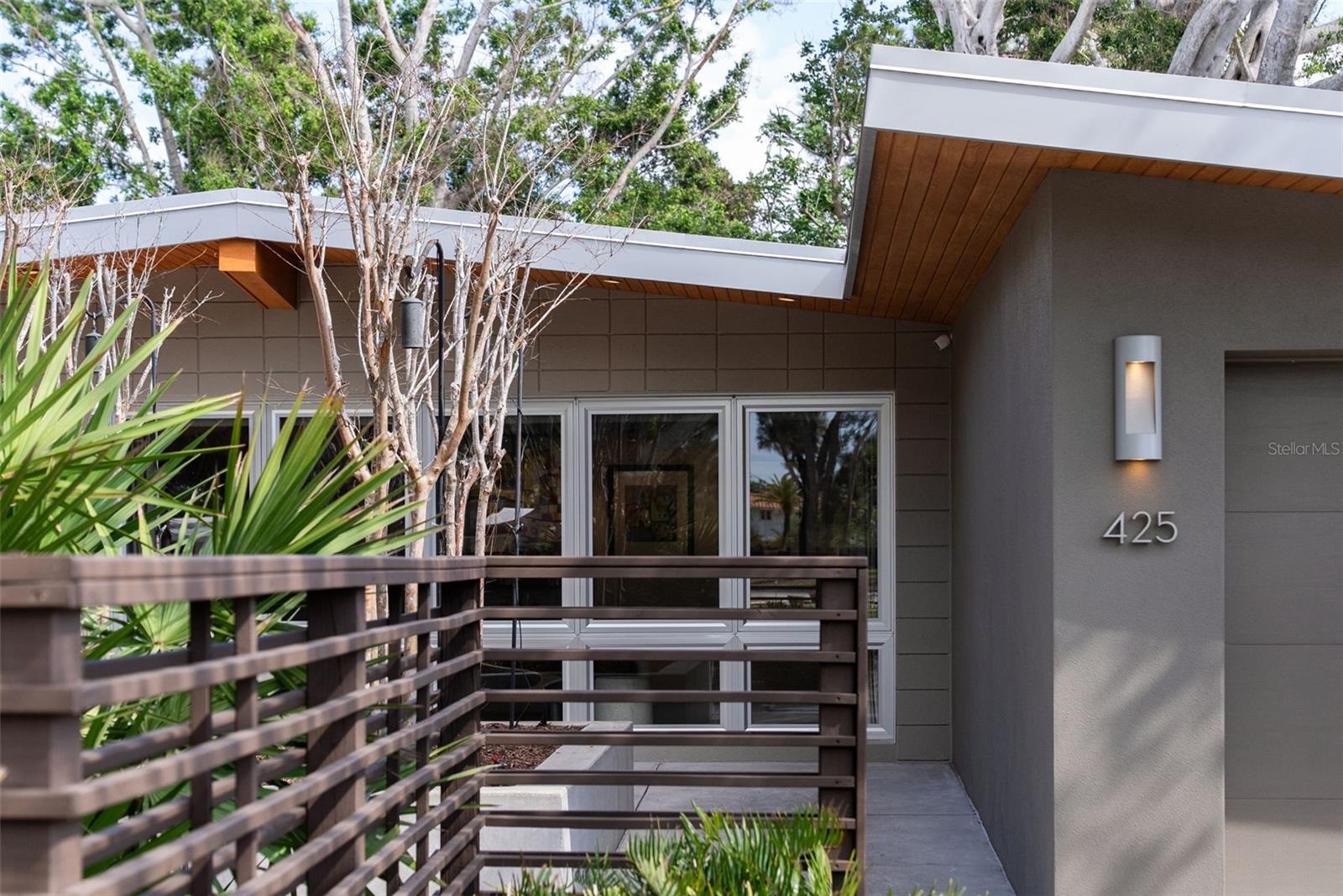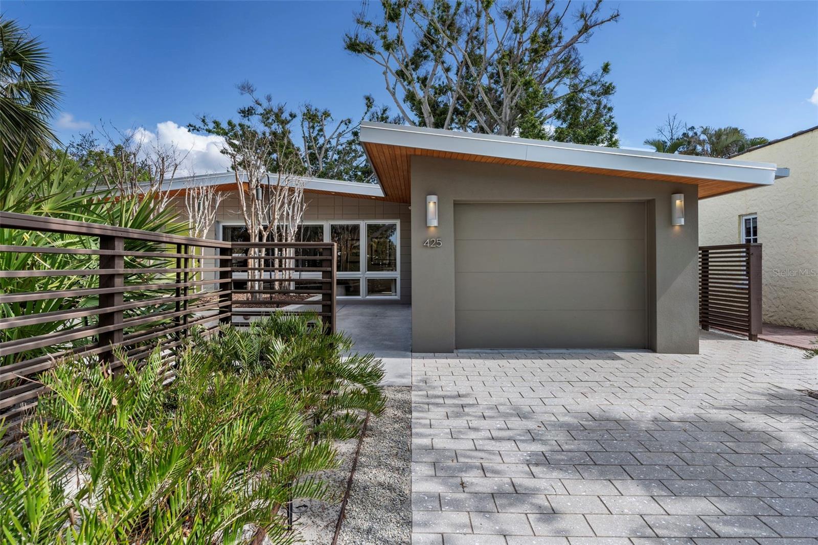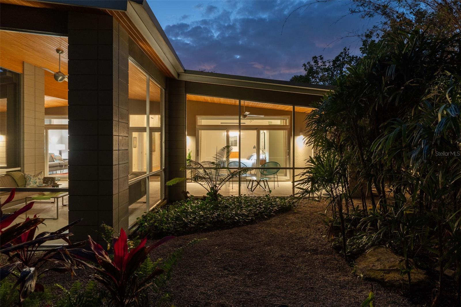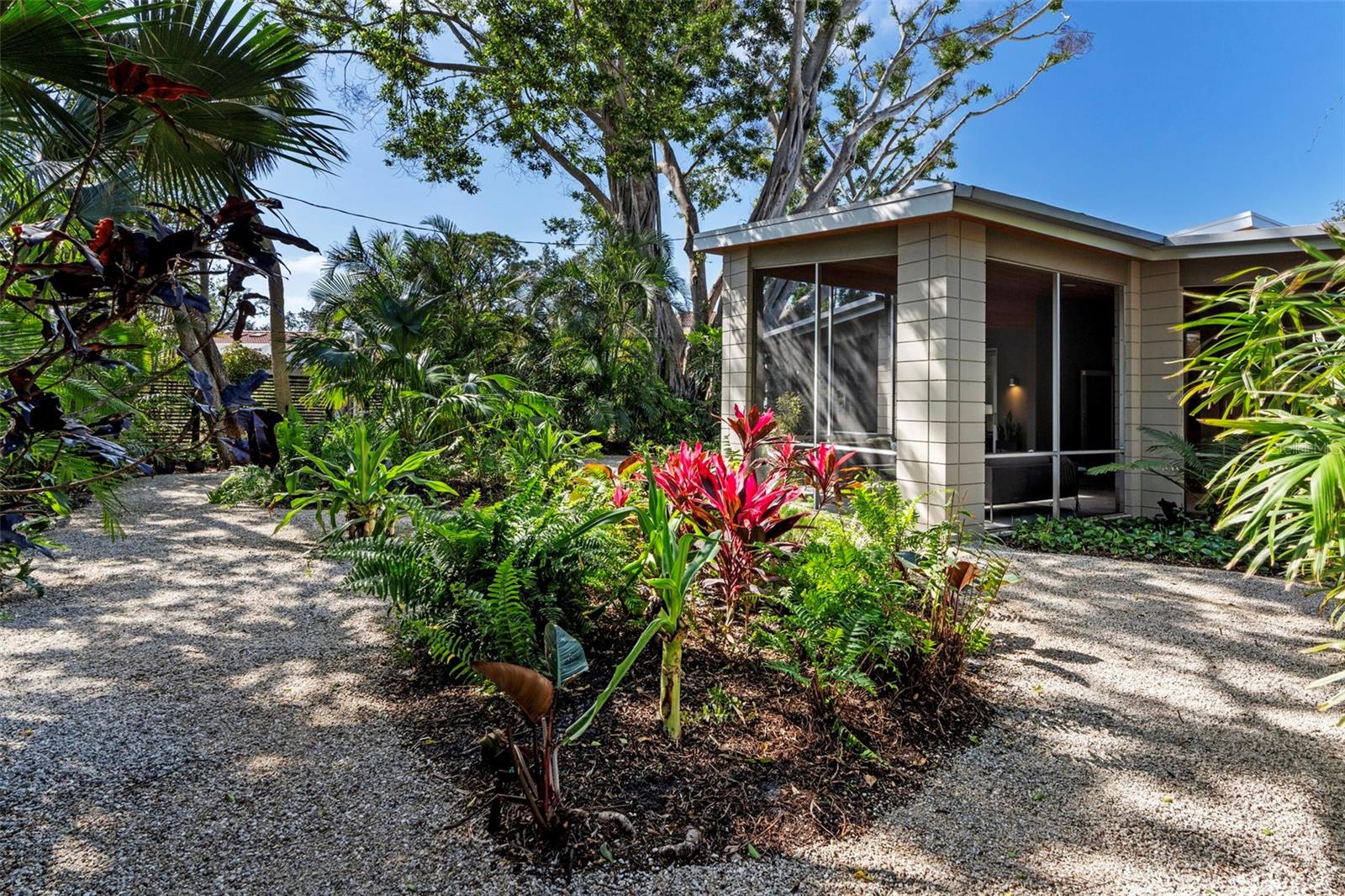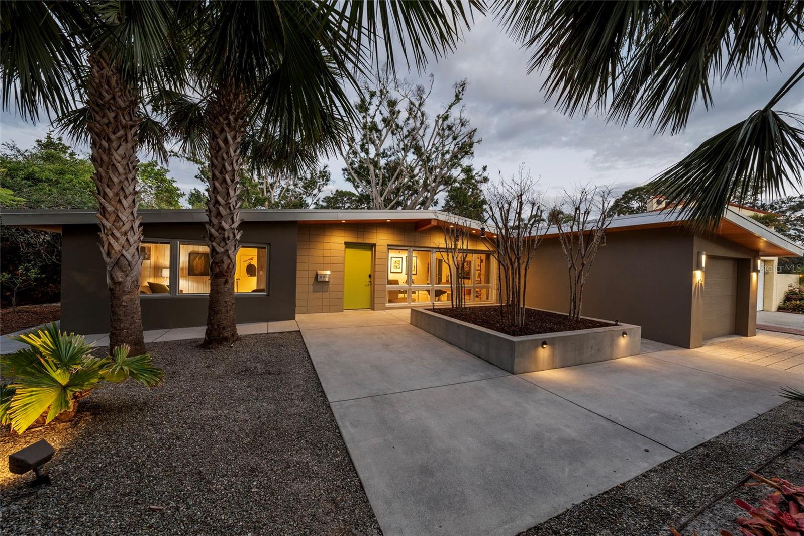 An inspirational property that epitomizes sophistication with a tranquil yet contemporary vibe. Expect to be wowed by this Venice Island gem. Originally a small 1959 structure, the property was dramatically expanded and completely renovated in 2014. This 2,285 square foot, 3 bedroom, 3.5 bath home hits a chord with those who understand what Florida mid-century homes can still aspire to be. The meticulously designed renovation, transformed a mid-century tract house into a beautiful Sarasota School of Architecture inspired home. Numerous honors for the renovation include winner of the 2016 American Institute of Architects Spirit of Sarasota Award to local architect Jon Barrick, SRQ Magazine Platinum Renovation Award and a feature article in Atomic Ranch Magazine. Located in the heart of Venezia Park Historic District, the home flows seamlessly, with windows & doors providing lush garden views from every room while maintaining privacy. There's a spacious living room, dining area, a timeless Florida Room, office, and a large open kitchen that includes rift cut white oak custom cabinets and floating ceiling, accentuated by the white quartz island and terrazzo floors. Adjacent to the art gallery-like hallway with clerestory windows and vaulted ceilings, are the three ensuite bedrooms with built-in cabinetry. The primary suite boasts a walk-in closet, soaker tub and a private outdoor shower. Two of the bedrooms have sliders out to the dramatic 700 square foot lanai with a soaring cypress tongue & groove ceiling. A brilliantly designed exterior by landscape architect Dane Spencer, includes a dramatic yet modest entry courtyard, stone paths that meander around stunning lush foliage that connects with secluded side patios. The pristine landscaping includes a bounty of tropical species including ferns, palms, crapes, oak and Cuban laurel trees. The garage is 1.5 car size, with workshop and built-in cabinets. The home is equipped with a Nuvo sound system, ADT alarm, art lighting, Rainbird sprinkler system, NEST temperature controls, Hunter Douglas window treatments, and an Ecowater filtration system in the kitchen. This home is being sold furnished with interesting contemporary and vintage pieces, and includes some art and personal items. An inventory list is available for review. This home is not in a flood zone - 16.75 elevation. Situated in Venice Island's most walkable neighborhood, everything one would desire, is within one mile of the home. Located between Venezia Park across the street and Blalock Park a half block north, the Cultural, Art & Library campus is around the corner and it is four blocks to downtown Venice where dining, entertainment, shopping, pickleball, and the weekly farmers market await you. You will find daily yoga, shark tooth hunting and the Sunday Drum circle less than a mile away at Venice Public Beach. Venice boasts excellent schools and the home is conveniently located near numerous medical facilities and the new Sarasota Memorial Hospital. Also, on Island is The Venice Municipal Airport, Freedom Boat and Venice Yacht Clubs, The Venice Golf Course and driving range (15 additional courses w/in 10 miles) and access to the 18-mile Legacy bike trail. This is the house you've been practicing for .