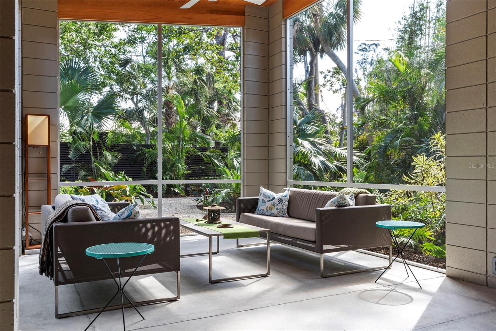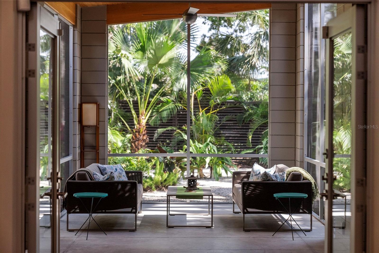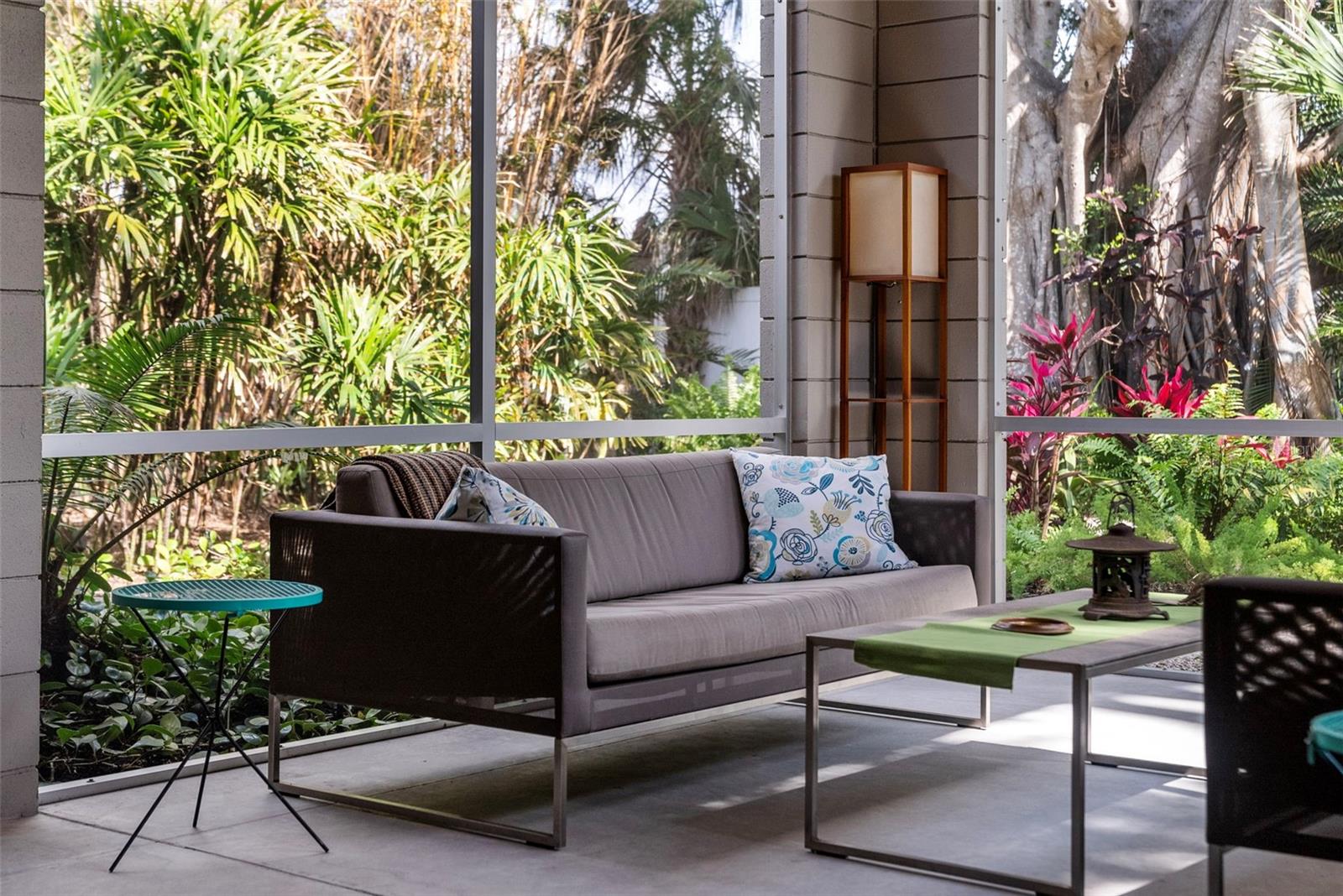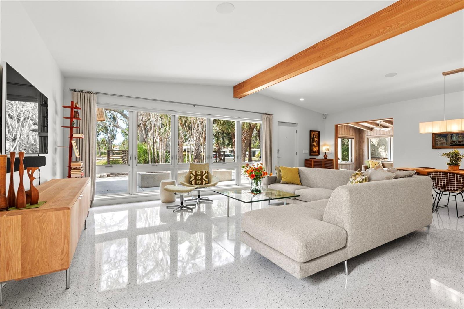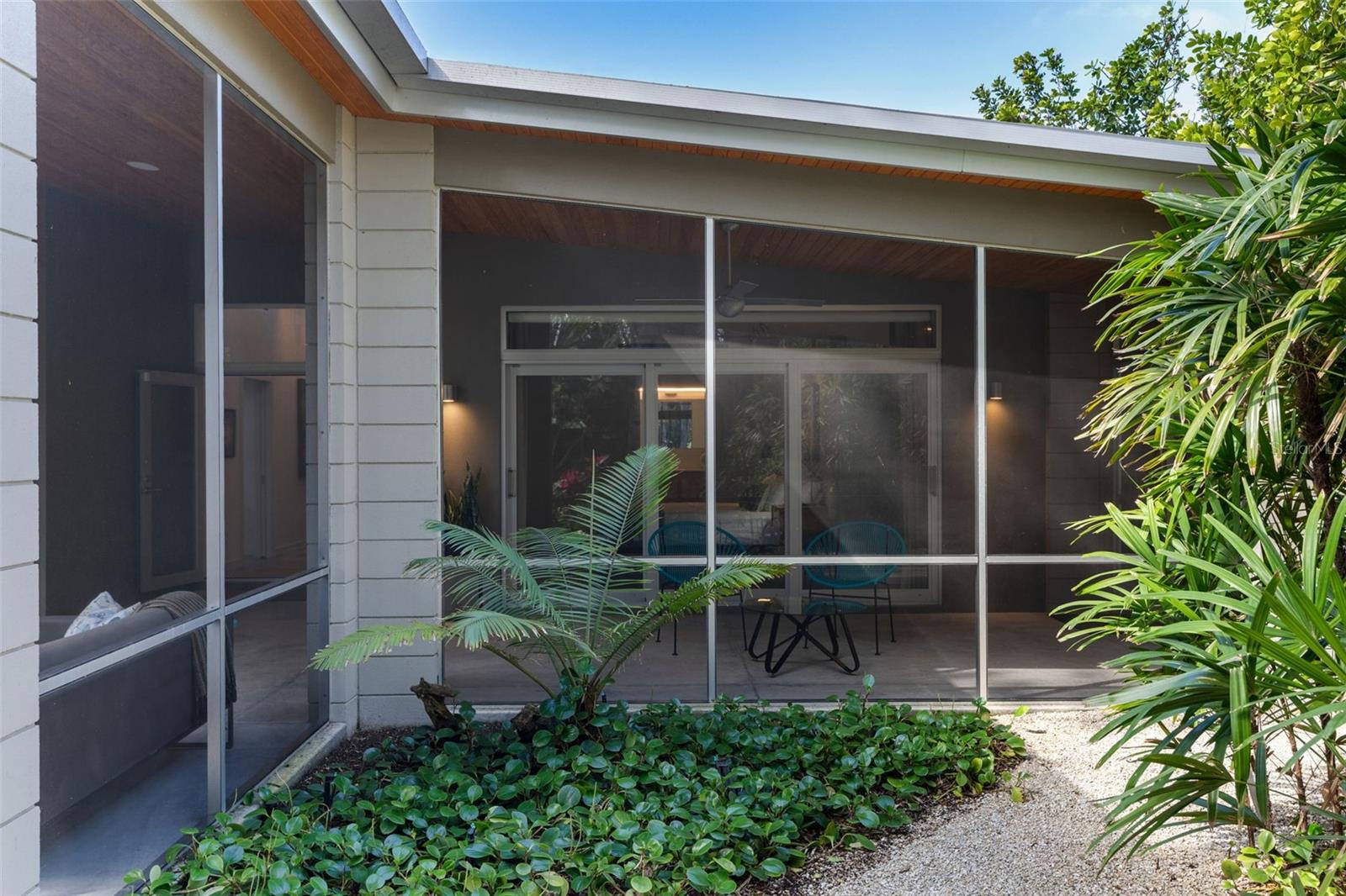 An inspirational property that epitomizes sophistication with a tranquil yet contemporary vibe. Expect to be wowed by this Venice Island gem. Originally a small 1959 structure, the property was dramatically expanded and completely renovated in 2014. This 2,285 square foot, 3 bedroom, 3.5 bath home hits a chord with those who understand what Florida mid-century homes can still aspire to be. The meticulously designed renovation, transformed a mid-century tract house into a beautiful Sarasota School of Architecture inspired home. Numerous honors for the renovation include winner of the 2016 American Institute of Architects Spirit of Sarasota Award to local architect Jon Barrick, SRQ Magazine Platinum Renovation Award and a feature article in Atomic Ranch Magazine. Located in the heart of Venezia Park Historic District, the home flows seamlessly, with windows & doors providing lush garden views from every room while maintaining privacy. There's a spacious living room, dining area, a timeless Florida Room, office, and a large open kitchen that includes rift cut white oak custom cabinets and floating ceiling, accentuated by the white quartz island and terrazzo floors. Adjacent to the art gallery-like hallway with clerestory windows and vaulted ceilings, are the three ensuite bedrooms with built-in cabinetry. The primary suite boasts a walk-in closet, soaker tub and a private outdoor shower. Two of the bedrooms have sliders out to the dramatic 700 square foot lanai with a soaring cypress tongue & groove ceiling. A brilliantly designed exterior by landscape architect Dane Spencer, includes a dramatic yet modest entry courtyard, stone paths that meander around stunning lush foliage that connects with secluded side patios. The pristine landscaping includes a bounty of tropical species including ferns, palms, crapes, oak and Cuban laurel trees. The garage is 1.5 car size, with workshop and built-in cabinets. The home is equipped with a Nuvo sound system, ADT alarm, art lighting, Rainbird sprinkler system, NEST temperature controls, Hunter Douglas window treatments, and an Ecowater filtration system in the kitchen. This home is being sold furnished with interesting contemporary and vintage pieces, and includes some art and personal items. An inventory list is available for review. This home is not in a flood zone - 16.75 elevation. Situated in Venice Island's most walkable neighborhood, everything one would desire, is within one mile of the home. Located between Venezia Park across the street and Blalock Park a half block north, the Cultural, Art & Library campus is around the corner and it is four blocks to downtown Venice where dining, entertainment, shopping, pickleball, and the weekly farmers market await you. You will find daily yoga, shark tooth hunting and the Sunday Drum circle less than a mile away at Venice Public Beach. Venice boasts excellent schools and the home is conveniently located near numerous medical facilities and the new Sarasota Memorial Hospital. Also, on Island is The Venice Municipal Airport, Freedom Boat and Venice Yacht Clubs, The Venice Golf Course and driving range (15 additional courses w/in 10 miles) and access to the 18-mile Legacy bike trail. This is the house you've been practicing for .