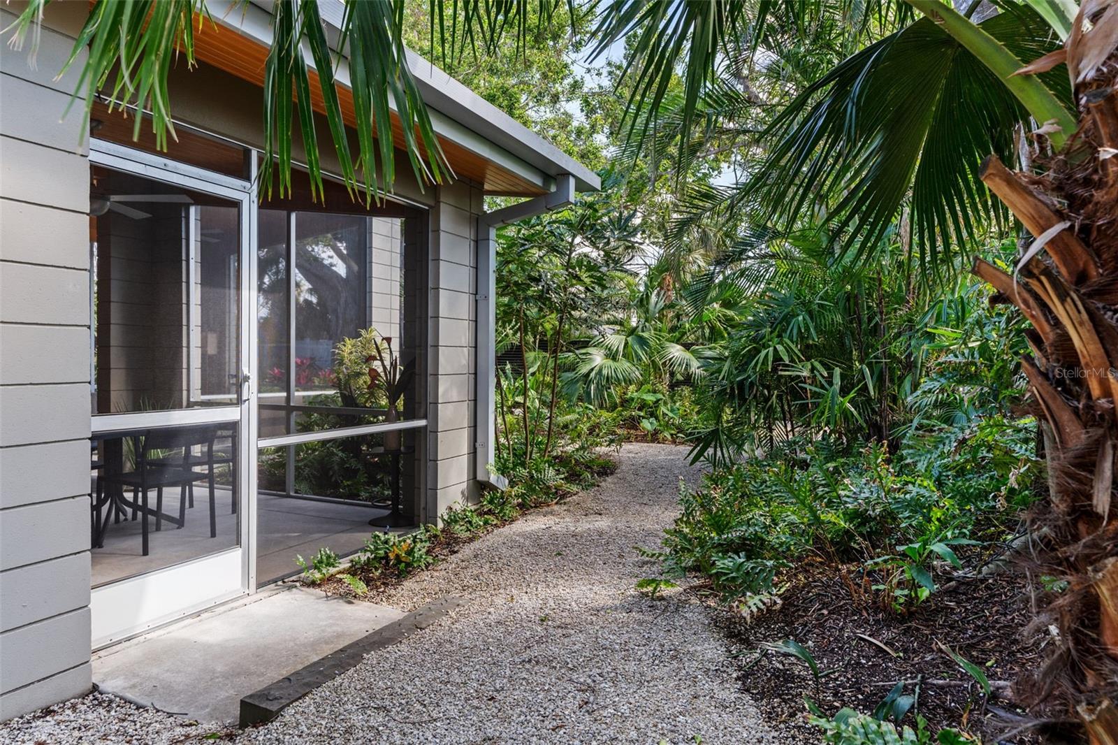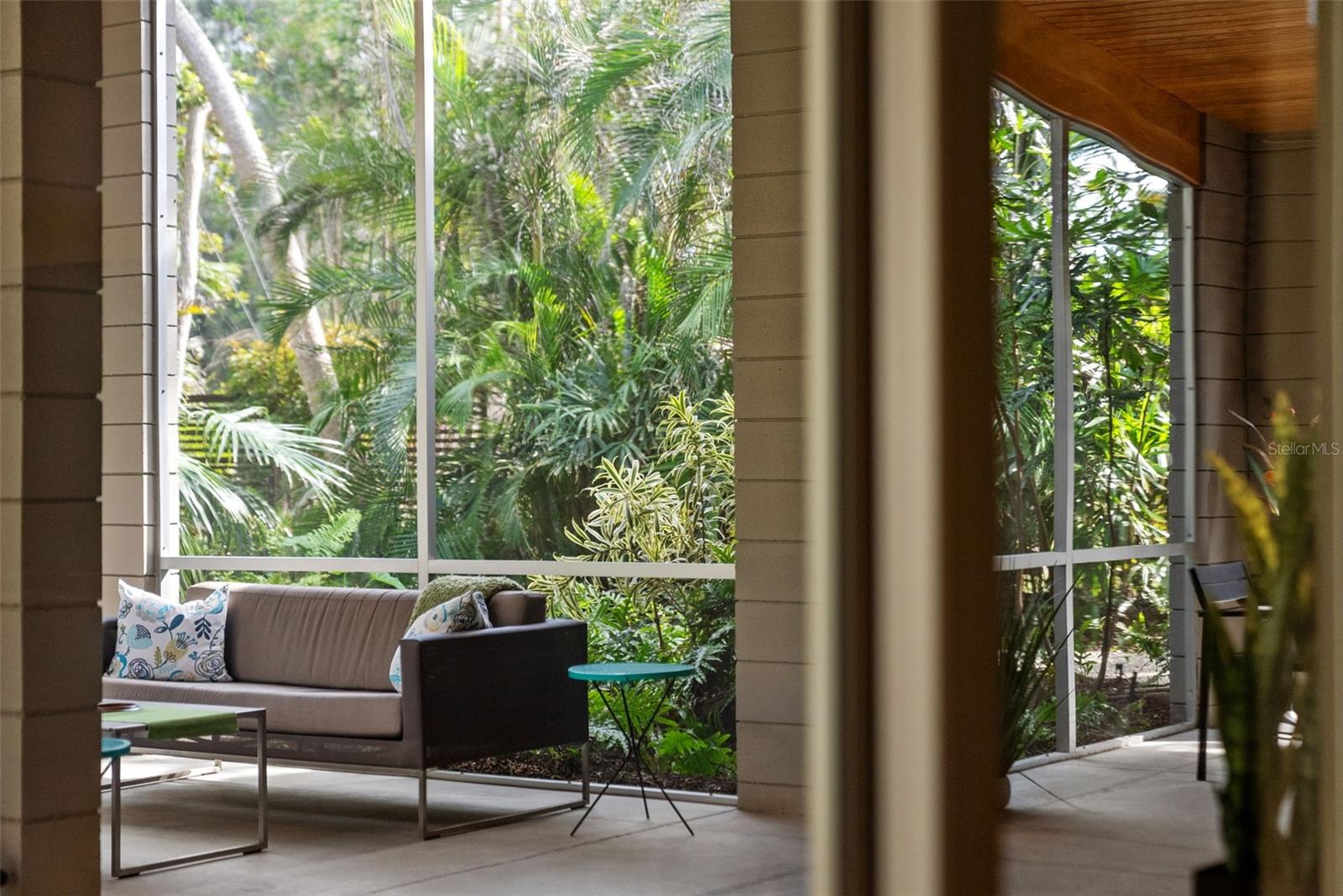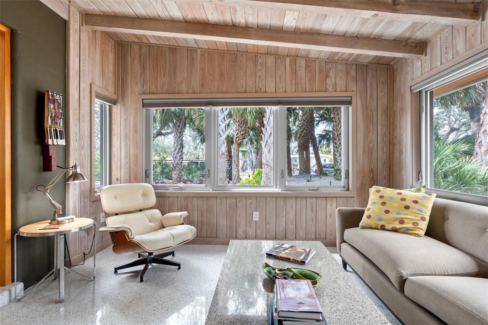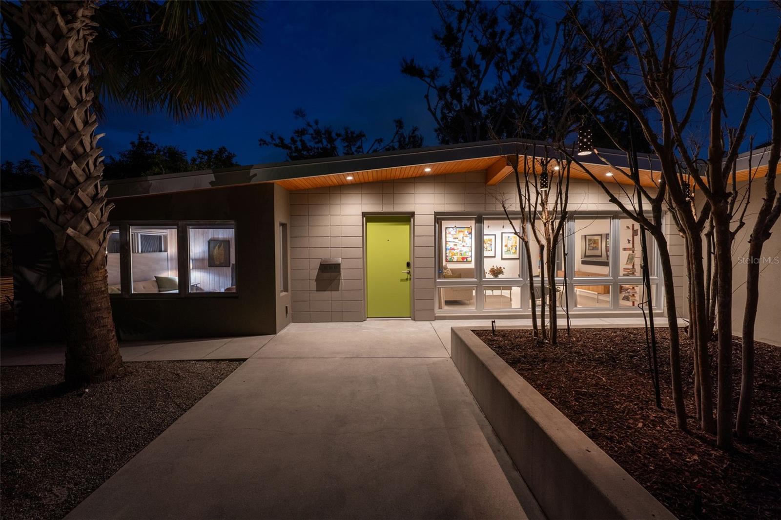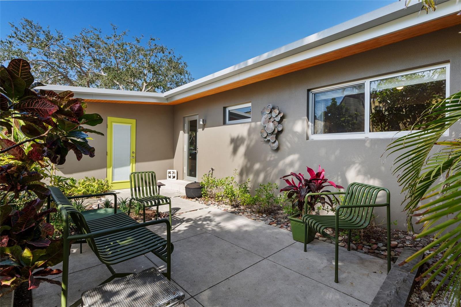 An inspirational property that epitomizes sophistication with a tranquil yet contemporary vibe. Expect to be wowed by this Venice Island gem. Originally a small 1959 structure, the property was dramatically expanded and completely renovated in 2014. This 2,285 square foot, 3 bedroom, 3.5 bath home hits a chord with those who understand what Florida mid-century homes can still aspire to be. The meticulously designed renovation, transformed a mid-century tract house into a beautiful Sarasota School of Architecture inspired home. Numerous honors for the renovation include winner of the 2016 American Institute of Architects Spirit of Sarasota Award to local architect Jon Barrick, SRQ Magazine Platinum Renovation Award and a feature article in Atomic Ranch Magazine. Located in the heart of Venezia Park Historic District, the home flows seamlessly, with windows & doors providing lush garden views from every room while maintaining privacy. There's a spacious living room, dining area, a timeless Florida Room, office, and a large open kitchen that includes rift cut white oak custom cabinets and floating ceiling, accentuated by the white quartz island and terrazzo floors. Adjacent to the art gallery-like hallway with clerestory windows and vaulted ceilings, are the three ensuite bedrooms with built-in cabinetry. The primary suite boasts a walk-in closet, soaker tub and a private outdoor shower. Two of the bedrooms have sliders out to the dramatic 700 square foot lanai with a soaring cypress tongue & groove ceiling. A brilliantly designed exterior by landscape architect Dane Spencer, includes a dramatic yet modest entry courtyard, stone paths that meander around stunning lush foliage that connects with secluded side patios. The pristine landscaping includes a bounty of tropical species including ferns, palms, crapes, oak and Cuban laurel trees. The garage is 1.5 car size, with workshop and built-in cabinets. The home is equipped with a Nuvo sound system, ADT alarm, art lighting, Rainbird sprinkler system, NEST temperature controls, Hunter Douglas window treatments, and an Ecowater filtration system in the kitchen. This home is being sold furnished with interesting contemporary and vintage pieces, and includes some art and personal items. An inventory list is available for review. This home is not in a flood zone - 16.75 elevation. Situated in Venice Island's most walkable neighborhood, everything one would desire, is within one mile of the home. Located between Venezia Park across the street and Blalock Park a half block north, the Cultural, Art & Library campus is around the corner and it is four blocks to downtown Venice where dining, entertainment, shopping, pickleball, and the weekly farmers market await you. You will find daily yoga, shark tooth hunting and the Sunday Drum circle less than a mile away at Venice Public Beach. Venice boasts excellent schools and the home is conveniently located near numerous medical facilities and the new Sarasota Memorial Hospital. Also, on Island is The Venice Municipal Airport, Freedom Boat and Venice Yacht Clubs, The Venice Golf Course and driving range (15 additional courses w/in 10 miles) and access to the 18-mile Legacy bike trail. This is the house you've been practicing for .