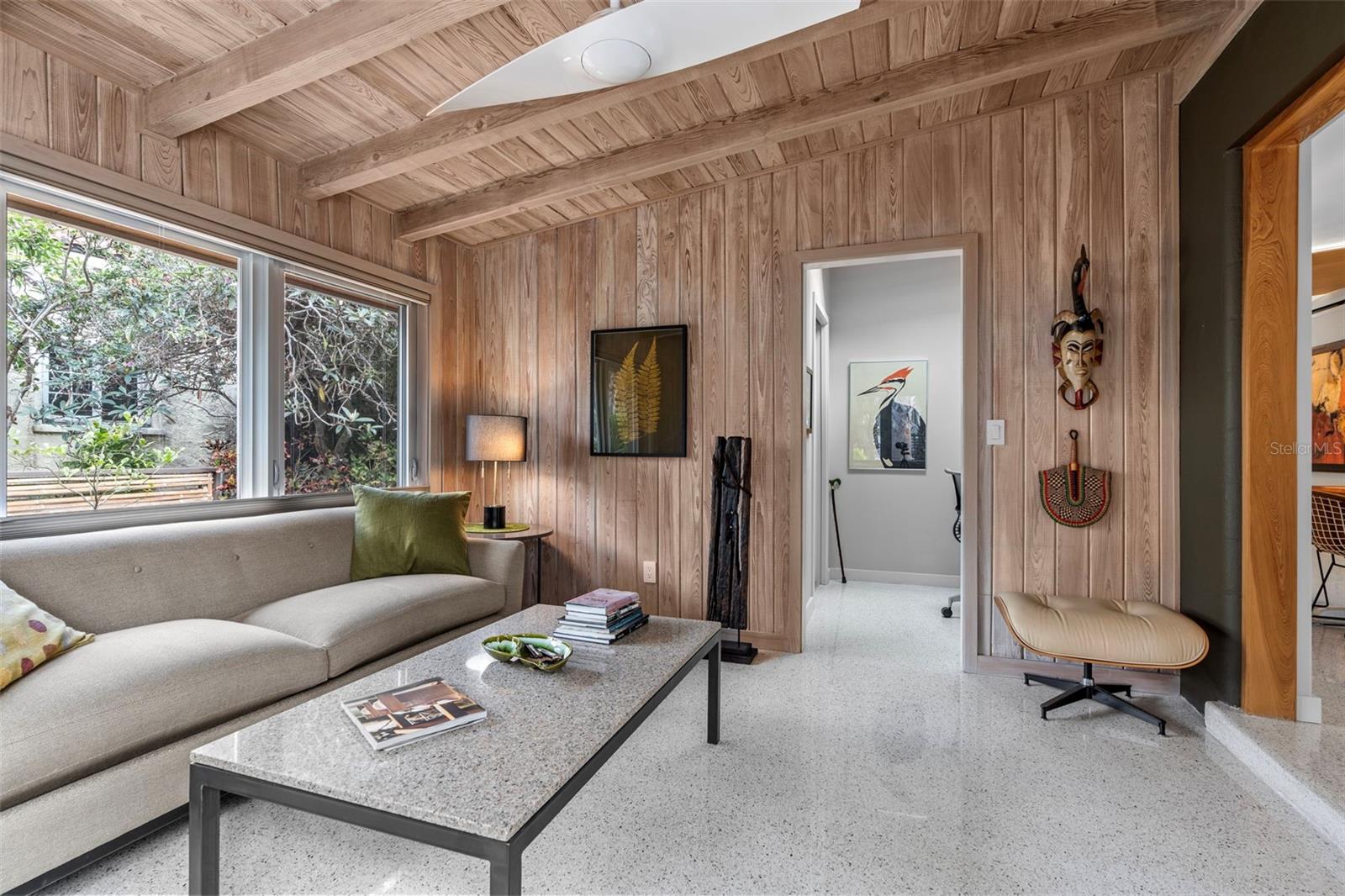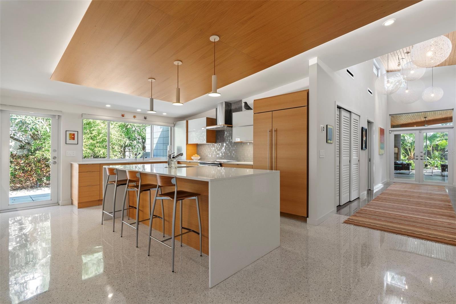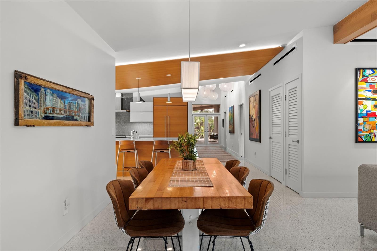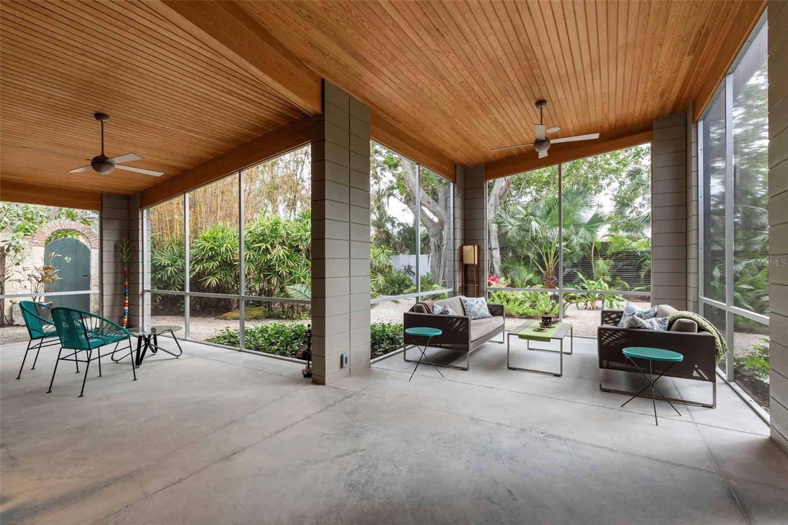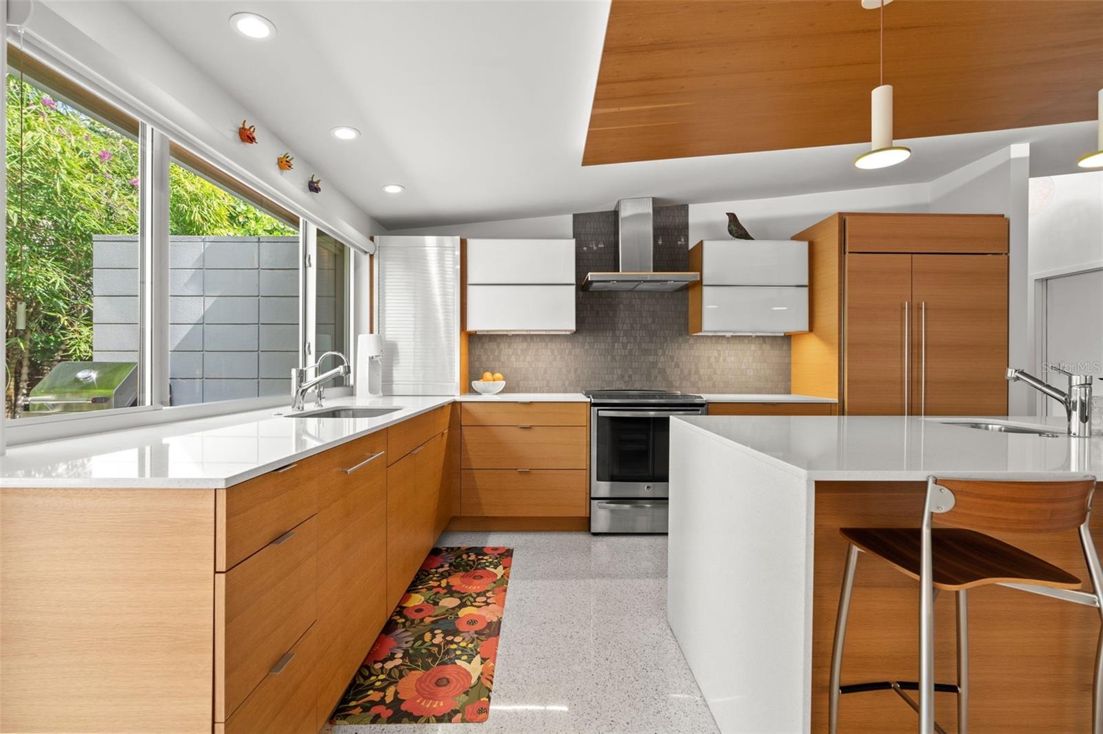 An inspirational property that epitomizes sophistication with a tranquil yet contemporary vibe. Expect to be wowed by this Venice Island gem. Originally a small 1959 structure, the property was dramatically expanded and completely renovated in 2014. This 2,285 square foot, 3 bedroom, 3.5 bath home hits a chord with those who understand what Florida mid-century homes can still aspire to be. The meticulously designed renovation, transformed a mid-century tract house into a beautiful Sarasota School of Architecture inspired home. Numerous honors for the renovation include winner of the 2016 American Institute of Architects Spirit of Sarasota Award to local architect Jon Barrick, SRQ Magazine Platinum Renovation Award and a feature article in Atomic Ranch Magazine. Located in the heart of Venezia Park Historic District, the home flows seamlessly, with windows & doors providing lush garden views from every room while maintaining privacy. There's a spacious living room, dining area, a timeless Florida Room, office, and a large open kitchen that includes rift cut white oak custom cabinets and floating ceiling, accentuated by the white quartz island and terrazzo floors. Adjacent to the art gallery-like hallway with clerestory windows and vaulted ceilings, are the three ensuite bedrooms with built-in cabinetry. The primary suite boasts a walk-in closet, soaker tub and a private outdoor shower. Two of the bedrooms have sliders out to the dramatic 700 square foot lanai with a soaring cypress tongue & groove ceiling. A brilliantly designed exterior by landscape architect Dane Spencer, includes a dramatic yet modest entry courtyard, stone paths that meander around stunning lush foliage that connects with secluded side patios. The pristine landscaping includes a bounty of tropical species including ferns, palms, crapes, oak and Cuban laurel trees. The garage is 1.5 car size, with workshop and built-in cabinets. The home is equipped with a Nuvo sound system, ADT alarm, art lighting, Rainbird sprinkler system, NEST temperature controls, Hunter Douglas window treatments, and an Ecowater filtration system in the kitchen. This home is being sold furnished with interesting contemporary and vintage pieces, and includes some art and personal items. An inventory list is available for review. This home is not in a flood zone - 16.75 elevation. Situated in Venice Island's most walkable neighborhood, everything one would desire, is within one mile of the home. Located between Venezia Park across the street and Blalock Park a half block north, the Cultural, Art & Library campus is around the corner and it is four blocks to downtown Venice where dining, entertainment, shopping, pickleball, and the weekly farmers market await you. You will find daily yoga, shark tooth hunting and the Sunday Drum circle less than a mile away at Venice Public Beach. Venice boasts excellent schools and the home is conveniently located near numerous medical facilities and the new Sarasota Memorial Hospital. Also, on Island is The Venice Municipal Airport, Freedom Boat and Venice Yacht Clubs, The Venice Golf Course and driving range (15 additional courses w/in 10 miles) and access to the 18-mile Legacy bike trail. This is the house you've been practicing for .