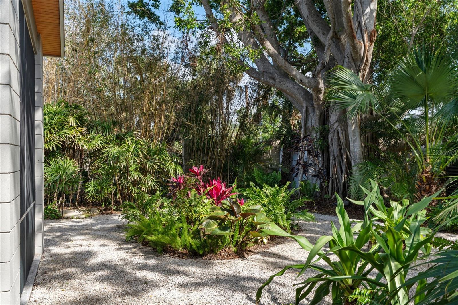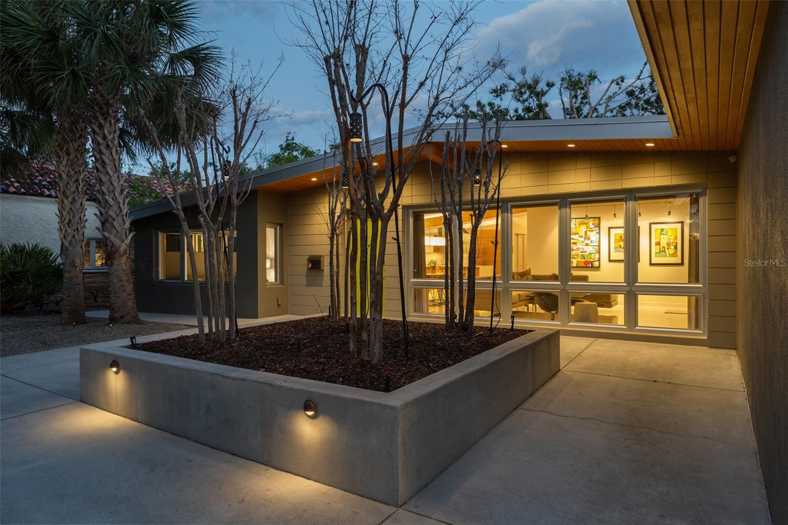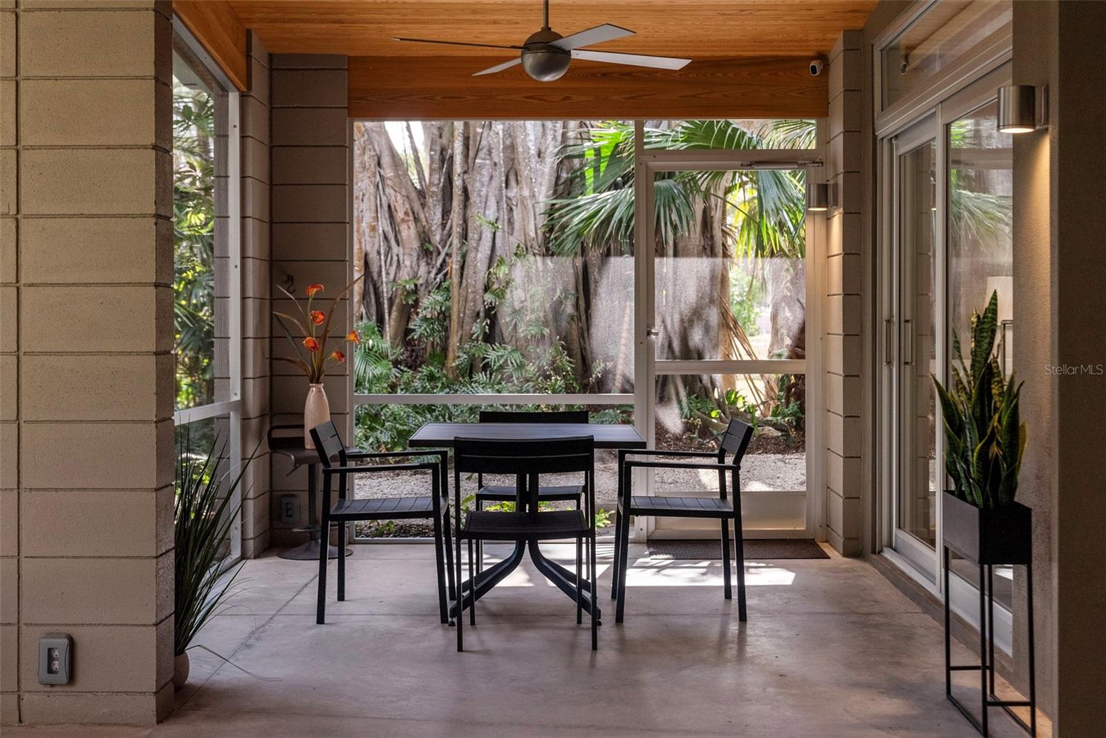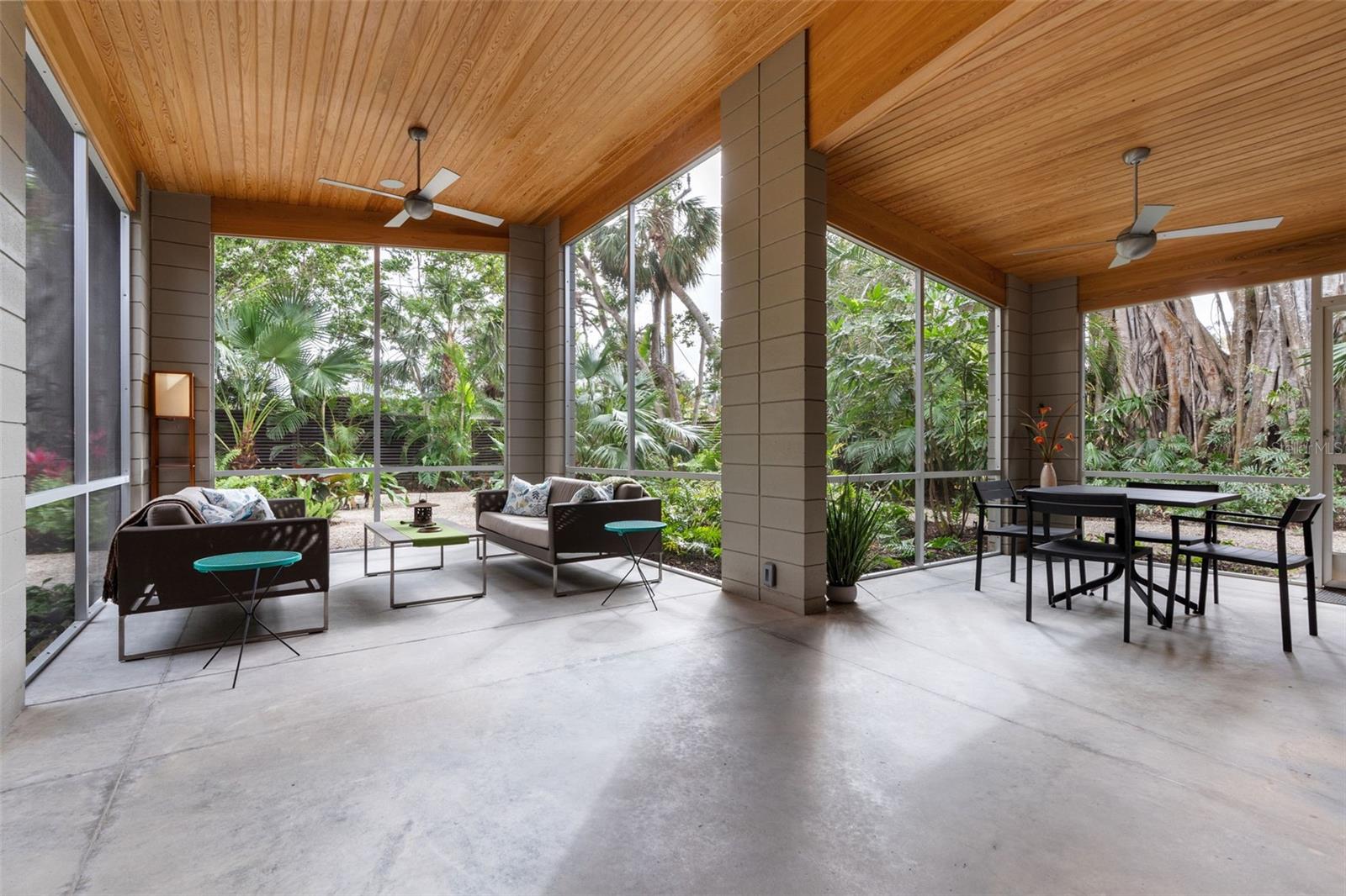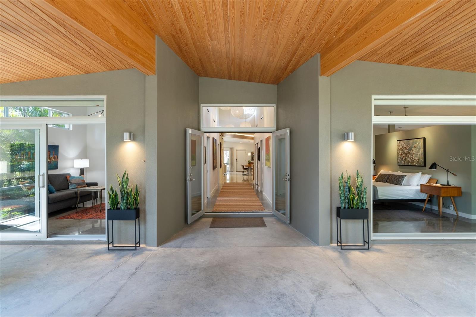 An inspirational property that epitomizes sophistication with a tranquil yet contemporary vibe. Expect to be wowed by this Venice Island gem. Originally a small 1959 structure, the property was dramatically expanded and completely renovated in 2014. This 2,285 square foot, 3 bedroom, 3.5 bath home hits a chord with those who understand what Florida mid-century homes can still aspire to be. The meticulously designed renovation, transformed a mid-century tract house into a beautiful Sarasota School of Architecture inspired home. Numerous honors for the renovation include winner of the 2016 American Institute of Architects Spirit of Sarasota Award to local architect Jon Barrick, SRQ Magazine Platinum Renovation Award and a feature article in Atomic Ranch Magazine. Located in the heart of Venezia Park Historic District, the home flows seamlessly, with windows & doors providing lush garden views from every room while maintaining privacy. There's a spacious living room, dining area, a timeless Florida Room, office, and a large open kitchen that includes rift cut white oak custom cabinets and floating ceiling, accentuated by the white quartz island and terrazzo floors. Adjacent to the art gallery-like hallway with clerestory windows and vaulted ceilings, are the three ensuite bedrooms with built-in cabinetry. The primary suite boasts a walk-in closet, soaker tub and a private outdoor shower. Two of the bedrooms have sliders out to the dramatic 700 square foot lanai with a soaring cypress tongue & groove ceiling. A brilliantly designed exterior by landscape architect Dane Spencer, includes a dramatic yet modest entry courtyard, stone paths that meander around stunning lush foliage that connects with secluded side patios. The pristine landscaping includes a bounty of tropical species including ferns, palms, crapes, oak and Cuban laurel trees. The garage is 1.5 car size, with workshop and built-in cabinets. The home is equipped with a Nuvo sound system, ADT alarm, art lighting, Rainbird sprinkler system, NEST temperature controls, Hunter Douglas window treatments, and an Ecowater filtration system in the kitchen. This home is being sold furnished with interesting contemporary and vintage pieces, and includes some art and personal items. An inventory list is available for review. This home is not in a flood zone - 16.75 elevation. Situated in Venice Island's most walkable neighborhood, everything one would desire, is within one mile of the home. Located between Venezia Park across the street and Blalock Park a half block north, the Cultural, Art & Library campus is around the corner and it is four blocks to downtown Venice where dining, entertainment, shopping, pickleball, and the weekly farmers market await you. You will find daily yoga, shark tooth hunting and the Sunday Drum circle less than a mile away at Venice Public Beach. Venice boasts excellent schools and the home is conveniently located near numerous medical facilities and the new Sarasota Memorial Hospital. Also, on Island is The Venice Municipal Airport, Freedom Boat and Venice Yacht Clubs, The Venice Golf Course and driving range (15 additional courses w/in 10 miles) and access to the 18-mile Legacy bike trail. This is the house you've been practicing for .
