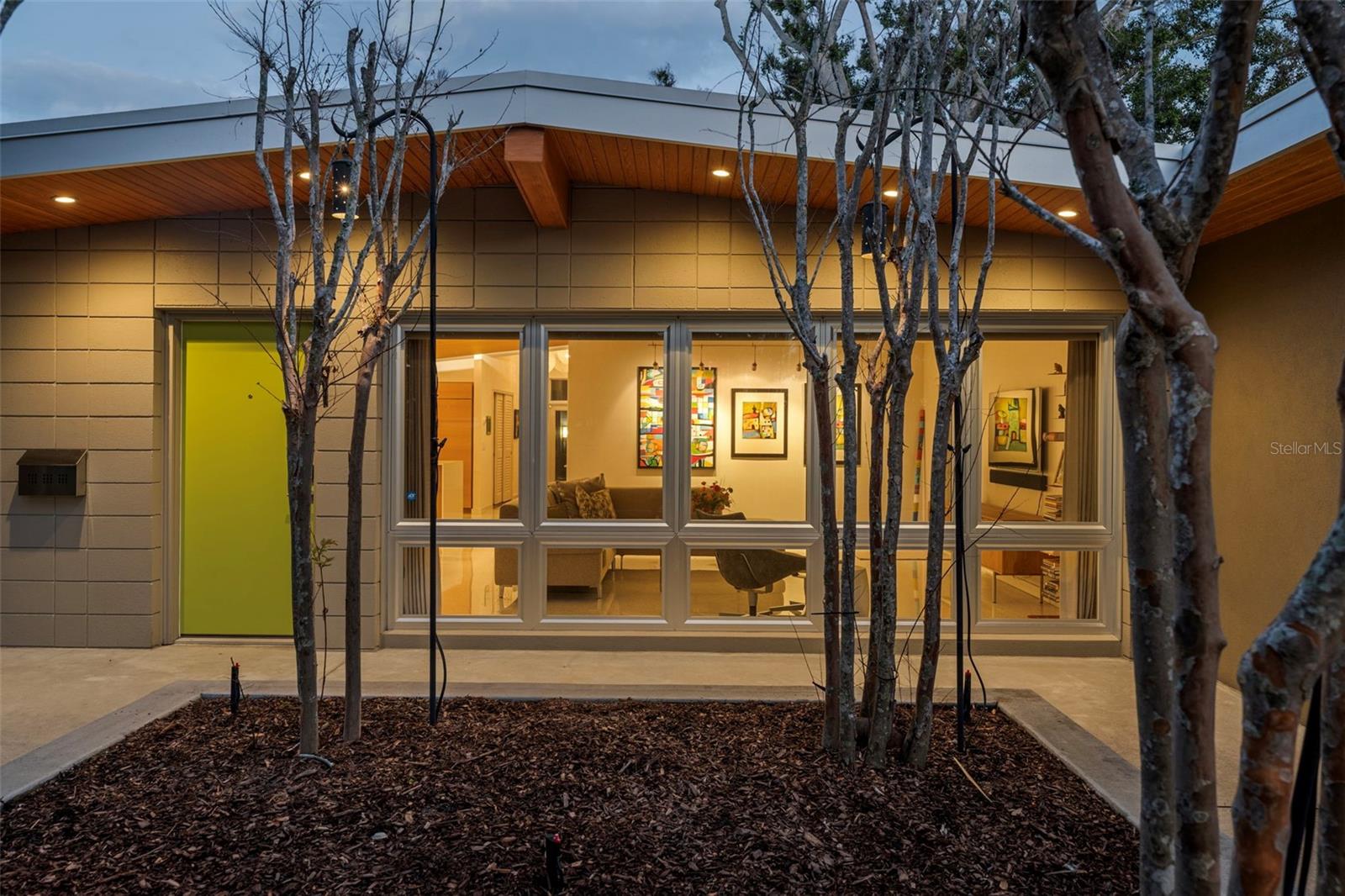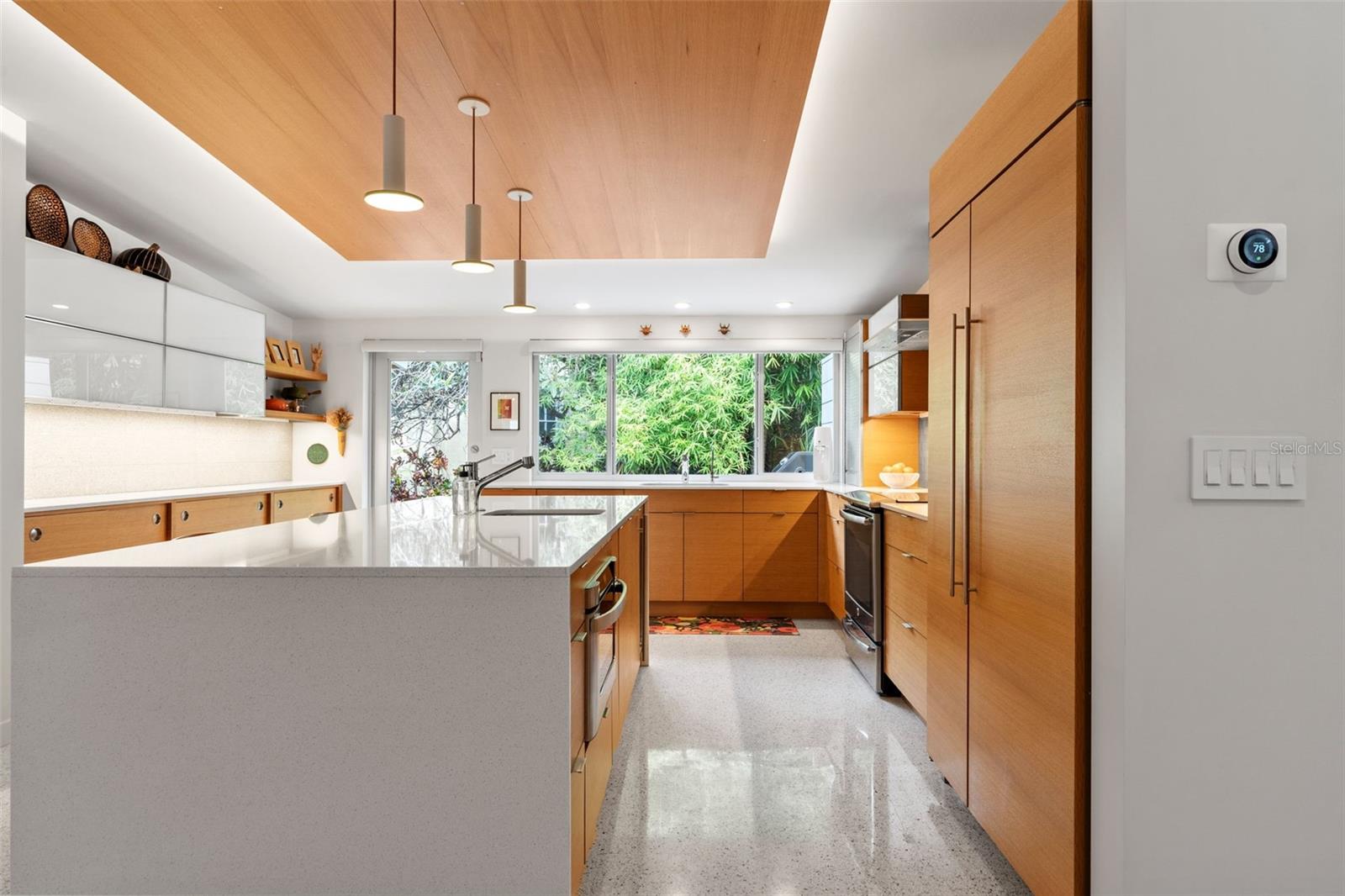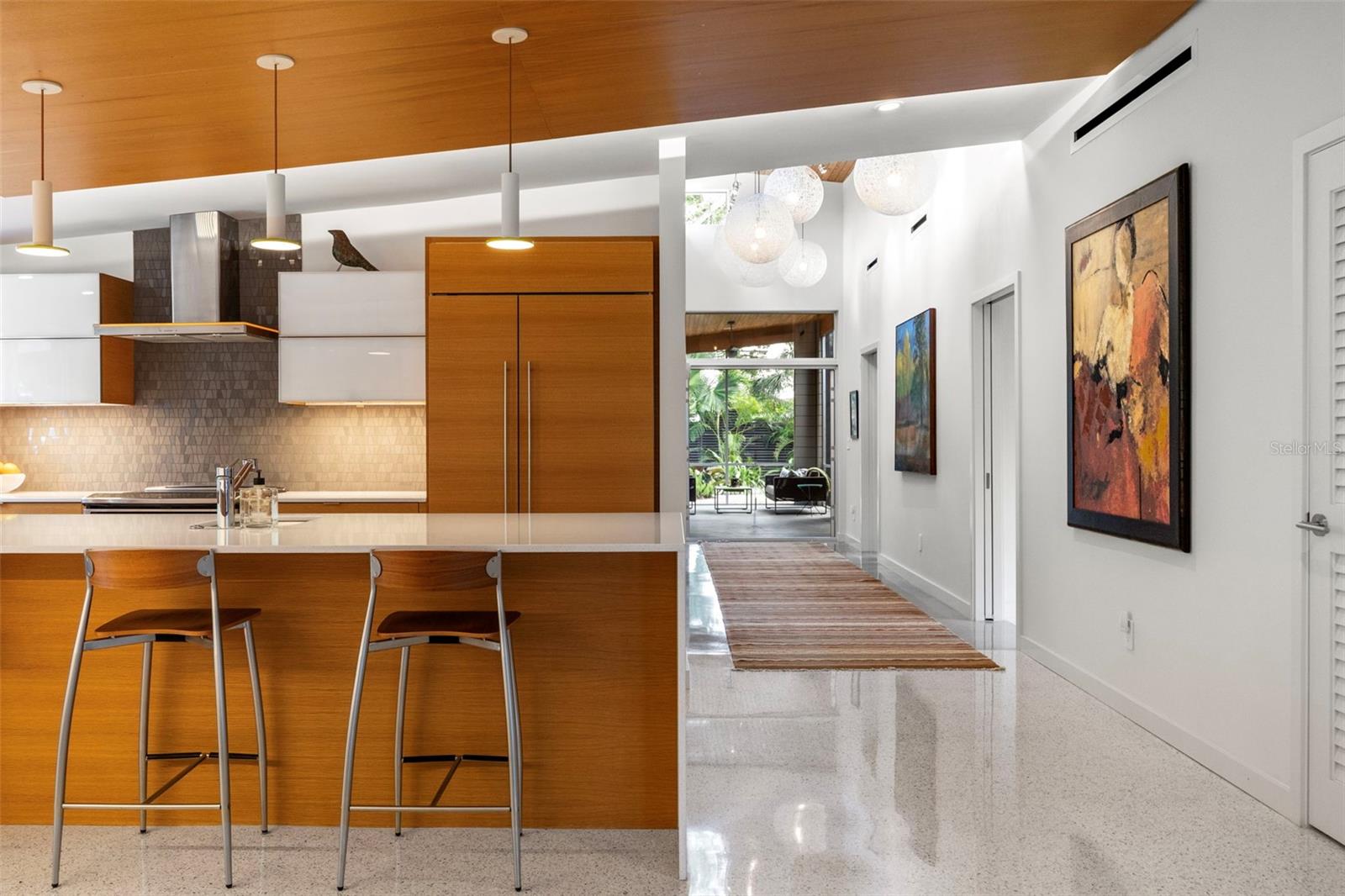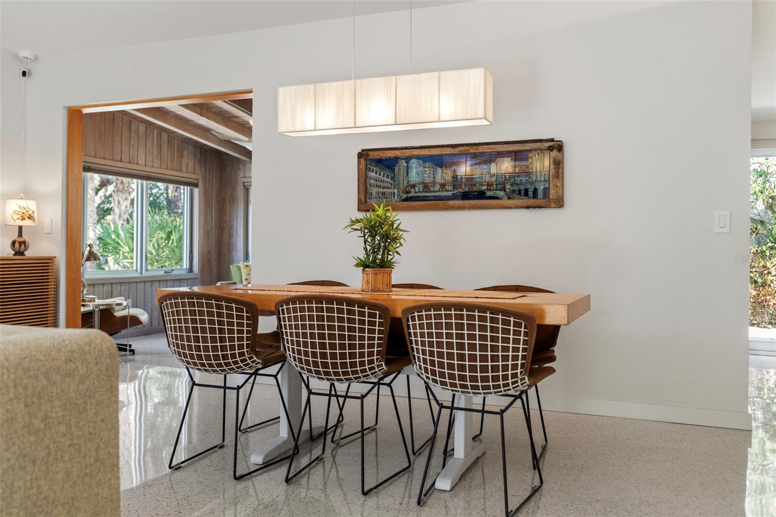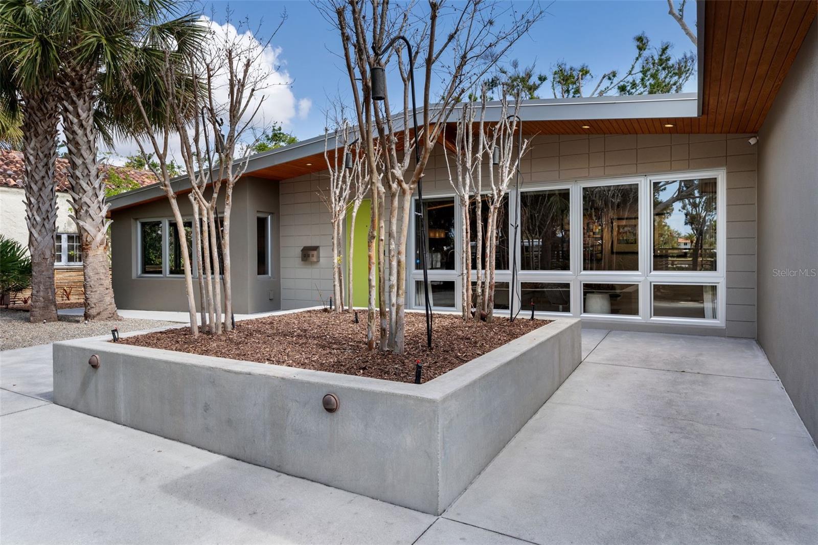 An inspirational property that epitomizes sophistication with a tranquil yet contemporary vibe. Expect to be wowed by this Venice Island gem. Originally a small 1959 structure, the property was dramatically expanded and completely renovated in 2014. This 2,285 square foot, 3 bedroom, 3.5 bath home hits a chord with those who understand what Florida mid-century homes can still aspire to be. The meticulously designed renovation, transformed a mid-century tract house into a beautiful Sarasota School of Architecture inspired home. Numerous honors for the renovation include winner of the 2016 American Institute of Architects Spirit of Sarasota Award to local architect Jon Barrick, SRQ Magazine Platinum Renovation Award and a feature article in Atomic Ranch Magazine. Located in the heart of Venezia Park Historic District, the home flows seamlessly, with windows & doors providing lush garden views from every room while maintaining privacy. There's a spacious living room, dining area, a timeless Florida Room, office, and a large open kitchen that includes rift cut white oak custom cabinets and floating ceiling, accentuated by the white quartz island and terrazzo floors. Adjacent to the art gallery-like hallway with clerestory windows and vaulted ceilings, are the three ensuite bedrooms with built-in cabinetry. The primary suite boasts a walk-in closet, soaker tub and a private outdoor shower. Two of the bedrooms have sliders out to the dramatic 700 square foot lanai with a soaring cypress tongue & groove ceiling. A brilliantly designed exterior by landscape architect Dane Spencer, includes a dramatic yet modest entry courtyard, stone paths that meander around stunning lush foliage that connects with secluded side patios. The pristine landscaping includes a bounty of tropical species including ferns, palms, crapes, oak and Cuban laurel trees. The garage is 1.5 car size, with workshop and built-in cabinets. The home is equipped with a Nuvo sound system, ADT alarm, art lighting, Rainbird sprinkler system, NEST temperature controls, Hunter Douglas window treatments, and an Ecowater filtration system in the kitchen. This home is being sold furnished with interesting contemporary and vintage pieces, and includes some art and personal items. An inventory list is available for review. This home is not in a flood zone - 16.75 elevation. Situated in Venice Island's most walkable neighborhood, everything one would desire, is within one mile of the home. Located between Venezia Park across the street and Blalock Park a half block north, the Cultural, Art & Library campus is around the corner and it is four blocks to downtown Venice where dining, entertainment, shopping, pickleball, and the weekly farmers market await you. You will find daily yoga, shark tooth hunting and the Sunday Drum circle less than a mile away at Venice Public Beach. Venice boasts excellent schools and the home is conveniently located near numerous medical facilities and the new Sarasota Memorial Hospital. Also, on Island is The Venice Municipal Airport, Freedom Boat and Venice Yacht Clubs, The Venice Golf Course and driving range (15 additional courses w/in 10 miles) and access to the 18-mile Legacy bike trail. This is the house you've been practicing for .