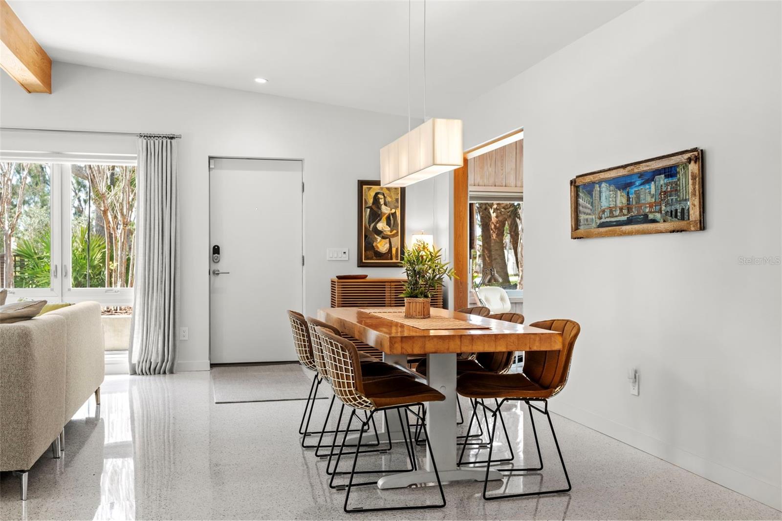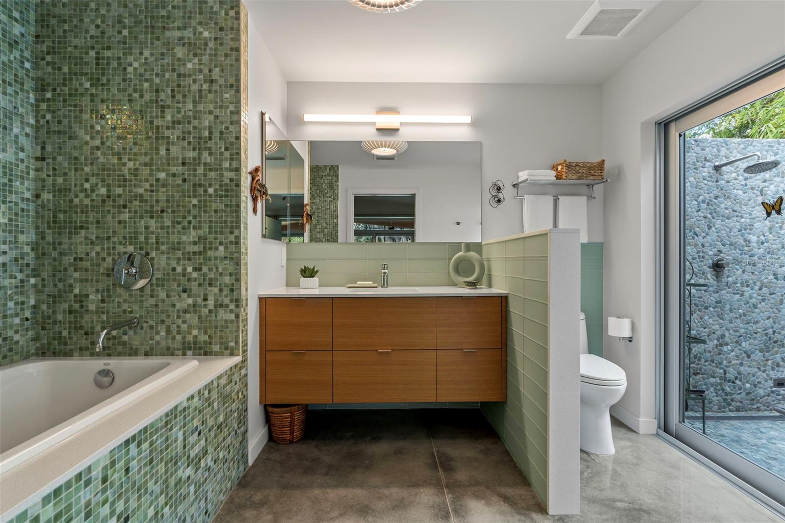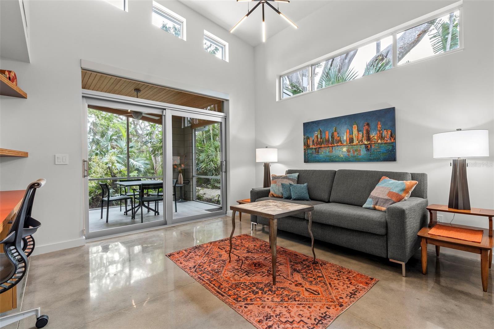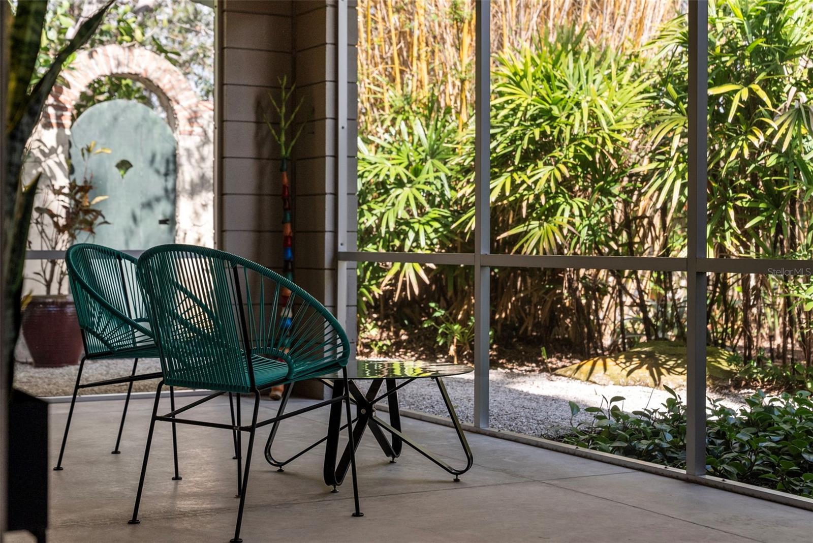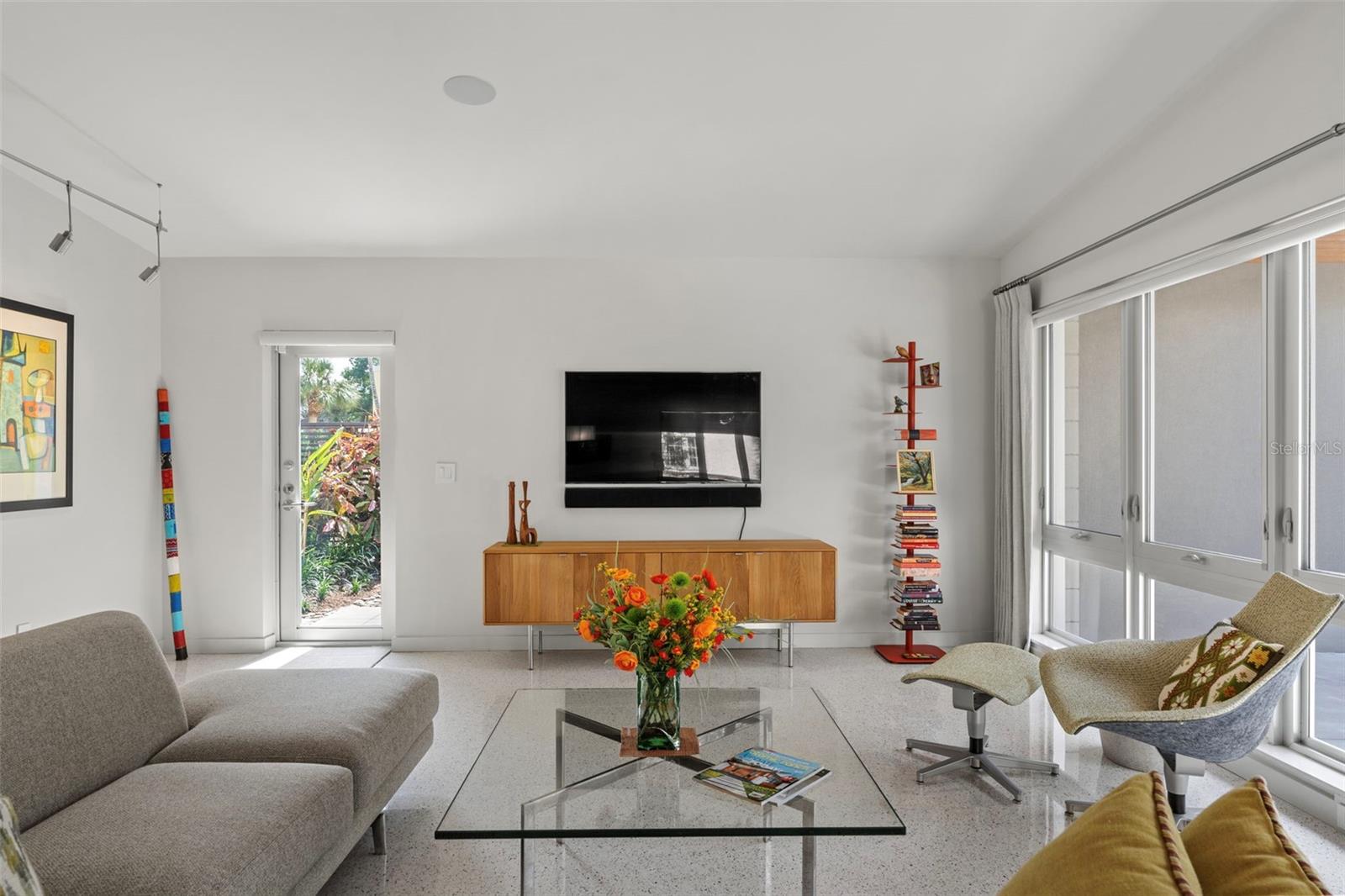 An inspirational property that epitomizes sophistication with a tranquil yet contemporary vibe. Expect to be wowed by this Venice Island gem. Originally a small 1959 structure, the property was dramatically expanded and completely renovated in 2014. This 2,285 square foot, 3 bedroom, 3.5 bath home hits a chord with those who understand what Florida mid-century homes can still aspire to be. The meticulously designed renovation, transformed a mid-century tract house into a beautiful Sarasota School of Architecture inspired home. Numerous honors for the renovation include winner of the 2016 American Institute of Architects Spirit of Sarasota Award to local architect Jon Barrick, SRQ Magazine Platinum Renovation Award and a feature article in Atomic Ranch Magazine. Located in the heart of Venezia Park Historic District, the home flows seamlessly, with windows & doors providing lush garden views from every room while maintaining privacy. There's a spacious living room, dining area, a timeless Florida Room, office, and a large open kitchen that includes rift cut white oak custom cabinets and floating ceiling, accentuated by the white quartz island and terrazzo floors. Adjacent to the art gallery-like hallway with clerestory windows and vaulted ceilings, are the three ensuite bedrooms with built-in cabinetry. The primary suite boasts a walk-in closet, soaker tub and a private outdoor shower. Two of the bedrooms have sliders out to the dramatic 700 square foot lanai with a soaring cypress tongue & groove ceiling. A brilliantly designed exterior by landscape architect Dane Spencer, includes a dramatic yet modest entry courtyard, stone paths that meander around stunning lush foliage that connects with secluded side patios. The pristine landscaping includes a bounty of tropical species including ferns, palms, crapes, oak and Cuban laurel trees. The garage is 1.5 car size, with workshop and built-in cabinets. The home is equipped with a Nuvo sound system, ADT alarm, art lighting, Rainbird sprinkler system, NEST temperature controls, Hunter Douglas window treatments, and an Ecowater filtration system in the kitchen. This home is being sold furnished with interesting contemporary and vintage pieces, and includes some art and personal items. An inventory list is available for review. This home is not in a flood zone - 16.75 elevation. Situated in Venice Island's most walkable neighborhood, everything one would desire, is within one mile of the home. Located between Venezia Park across the street and Blalock Park a half block north, the Cultural, Art & Library campus is around the corner and it is four blocks to downtown Venice where dining, entertainment, shopping, pickleball, and the weekly farmers market await you. You will find daily yoga, shark tooth hunting and the Sunday Drum circle less than a mile away at Venice Public Beach. Venice boasts excellent schools and the home is conveniently located near numerous medical facilities and the new Sarasota Memorial Hospital. Also, on Island is The Venice Municipal Airport, Freedom Boat and Venice Yacht Clubs, The Venice Golf Course and driving range (15 additional courses w/in 10 miles) and access to the 18-mile Legacy bike trail. This is the house you've been practicing for .